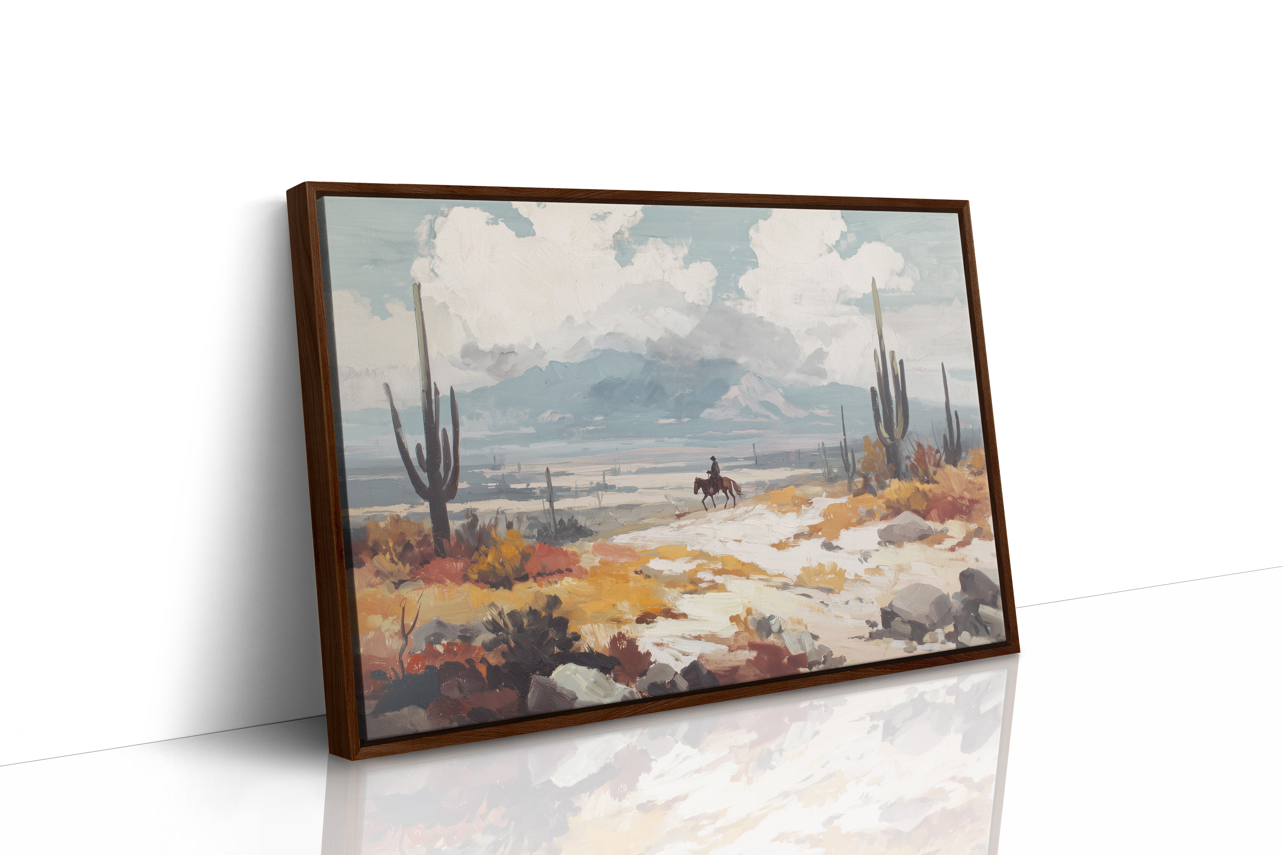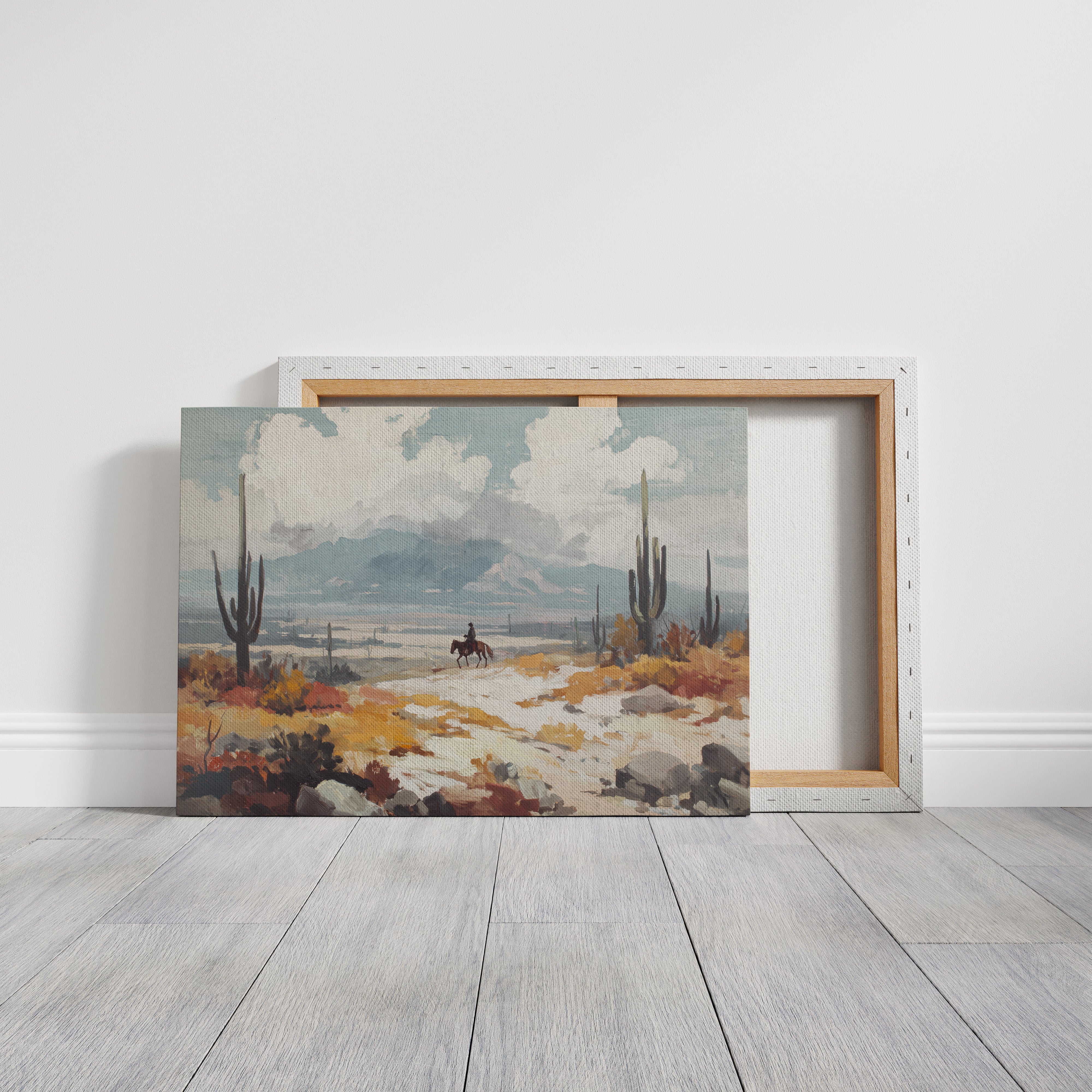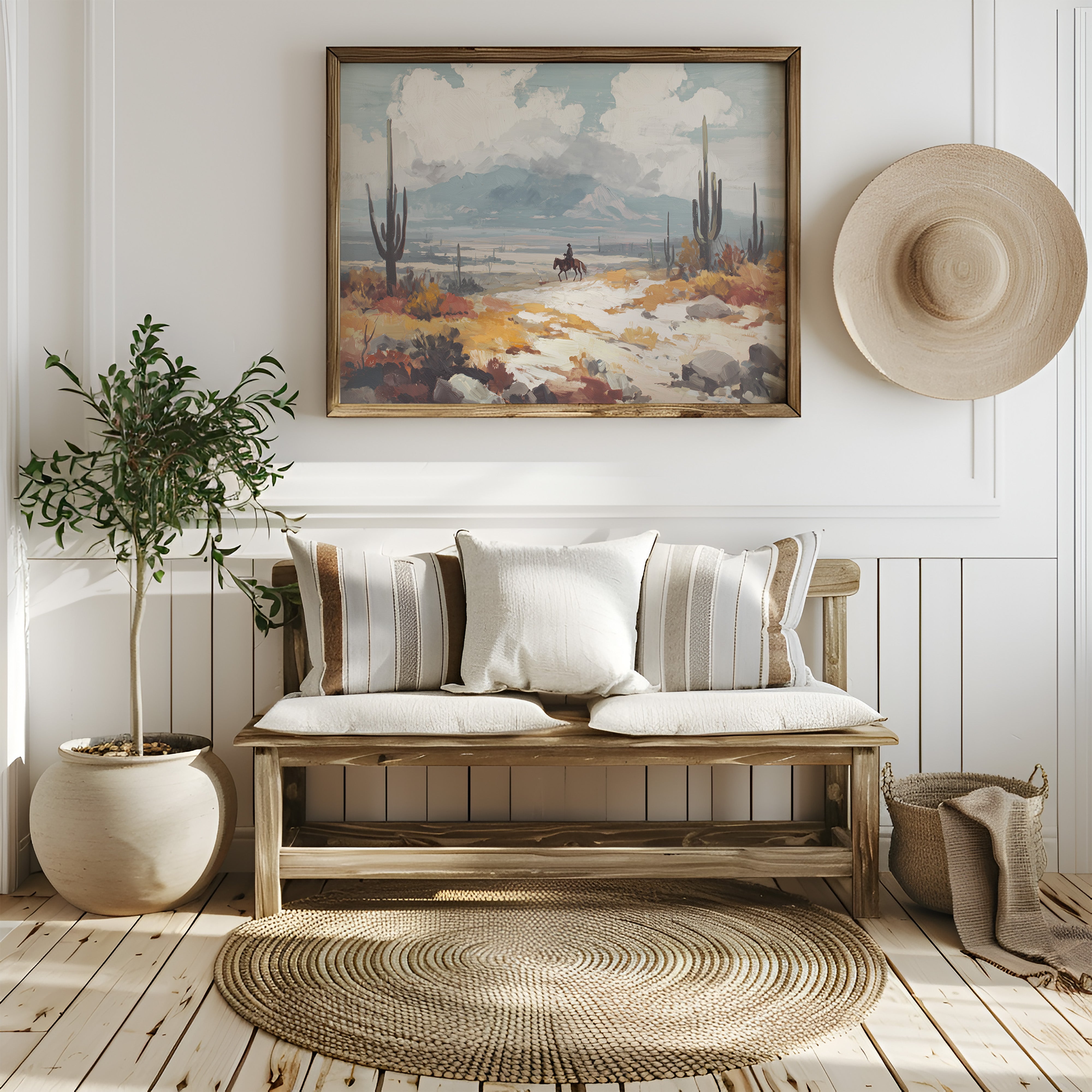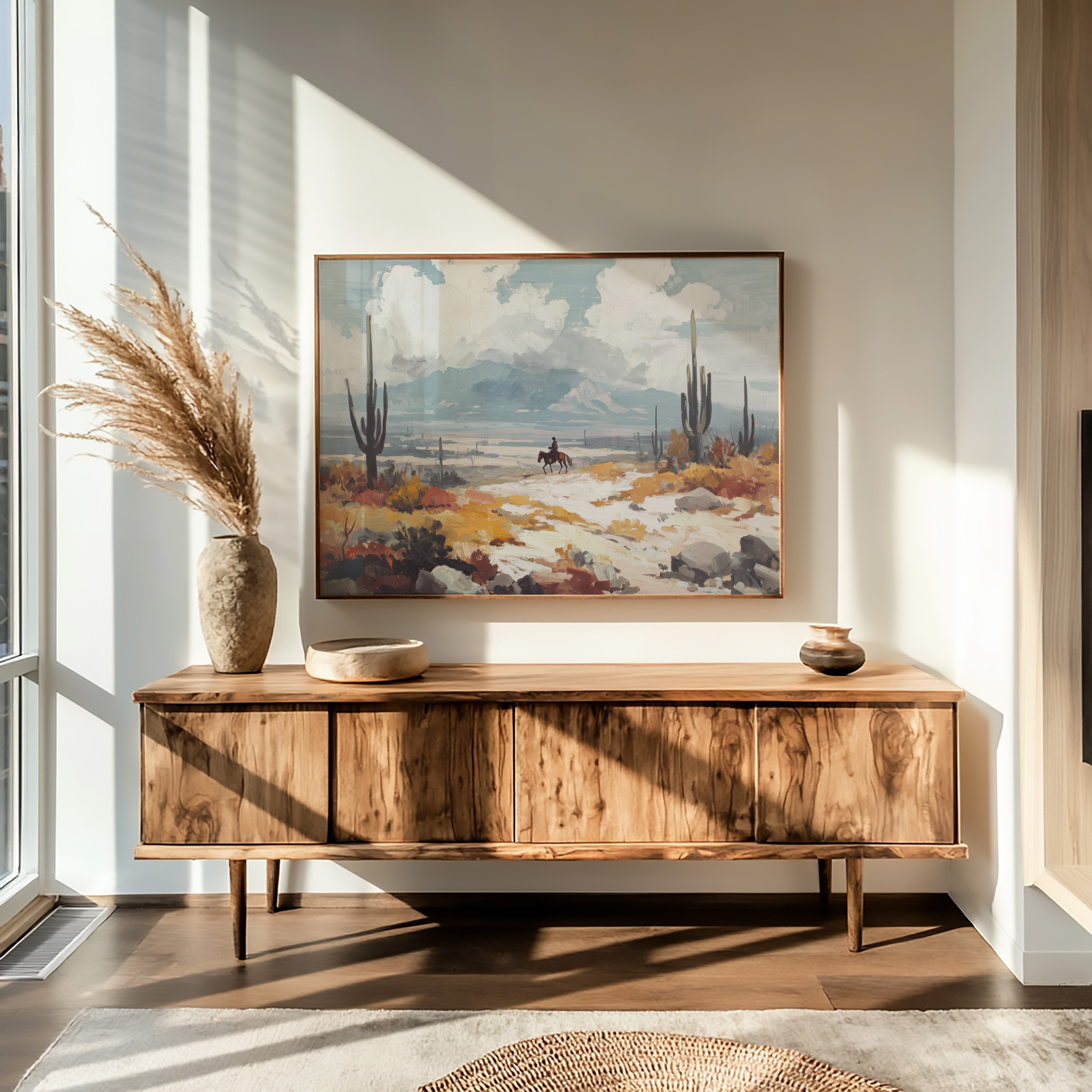 Beneath a vast sky, a lone rider traverses the arid landscape, each hoofbeat resonating with the whispers of ancient earth. This piece embodies the essence of contemporary exploration, capturing the spirit of adventure in a sun-drenched wilderness. The vibrant hues of ochre and sage mingle, creating a tapestry of nature's resilience against a backdrop of towering cacti and distant mountains, inviting contemplation of solitude and purpose. Ideal for a study or hallway, this artwork inspires dreams of open roads and uncharted paths. Let its presence evoke a sense of wanderlust and connection to the wild.