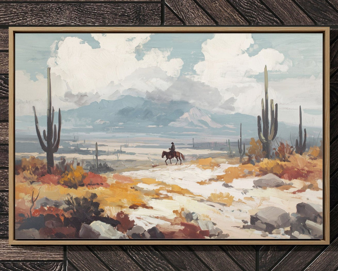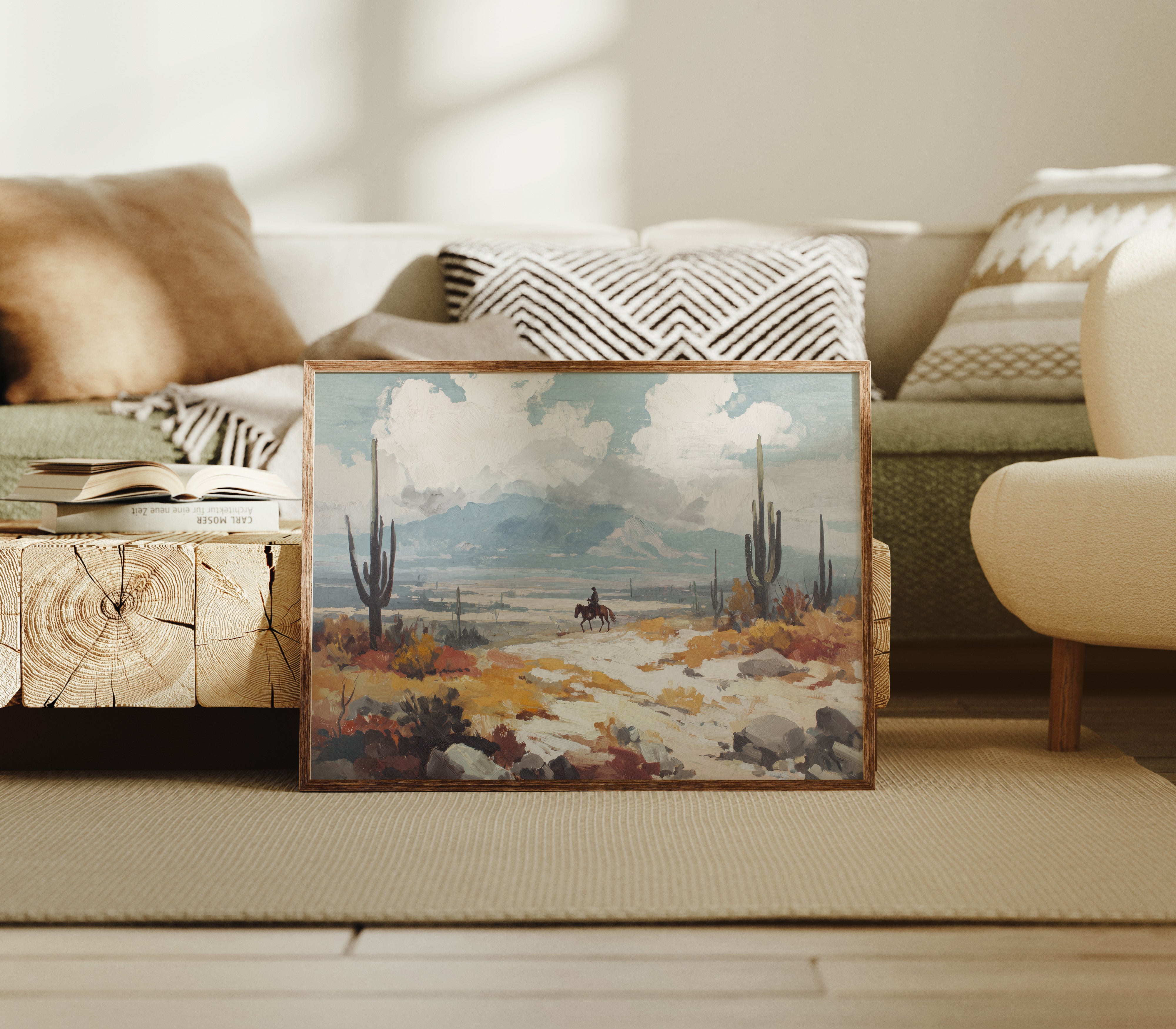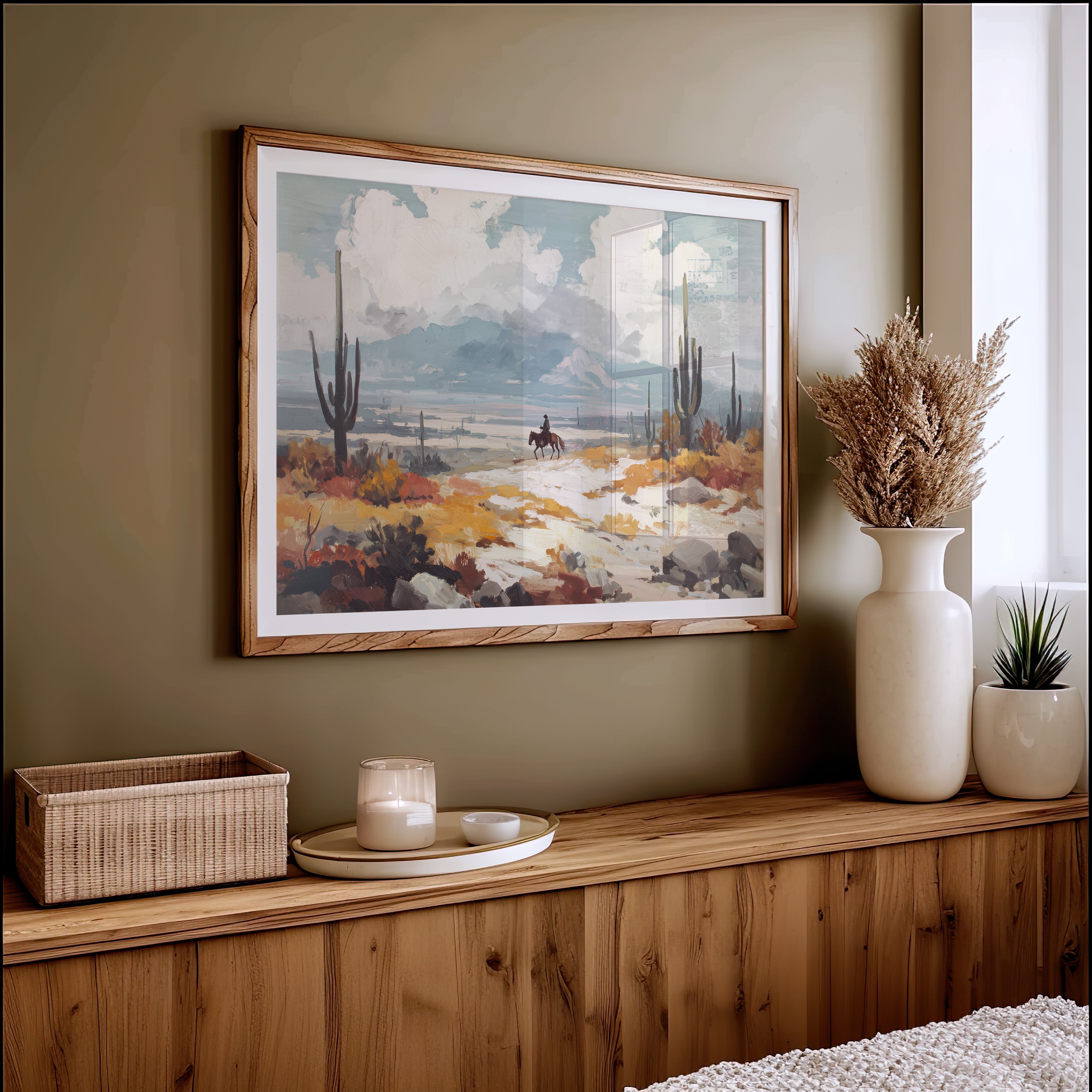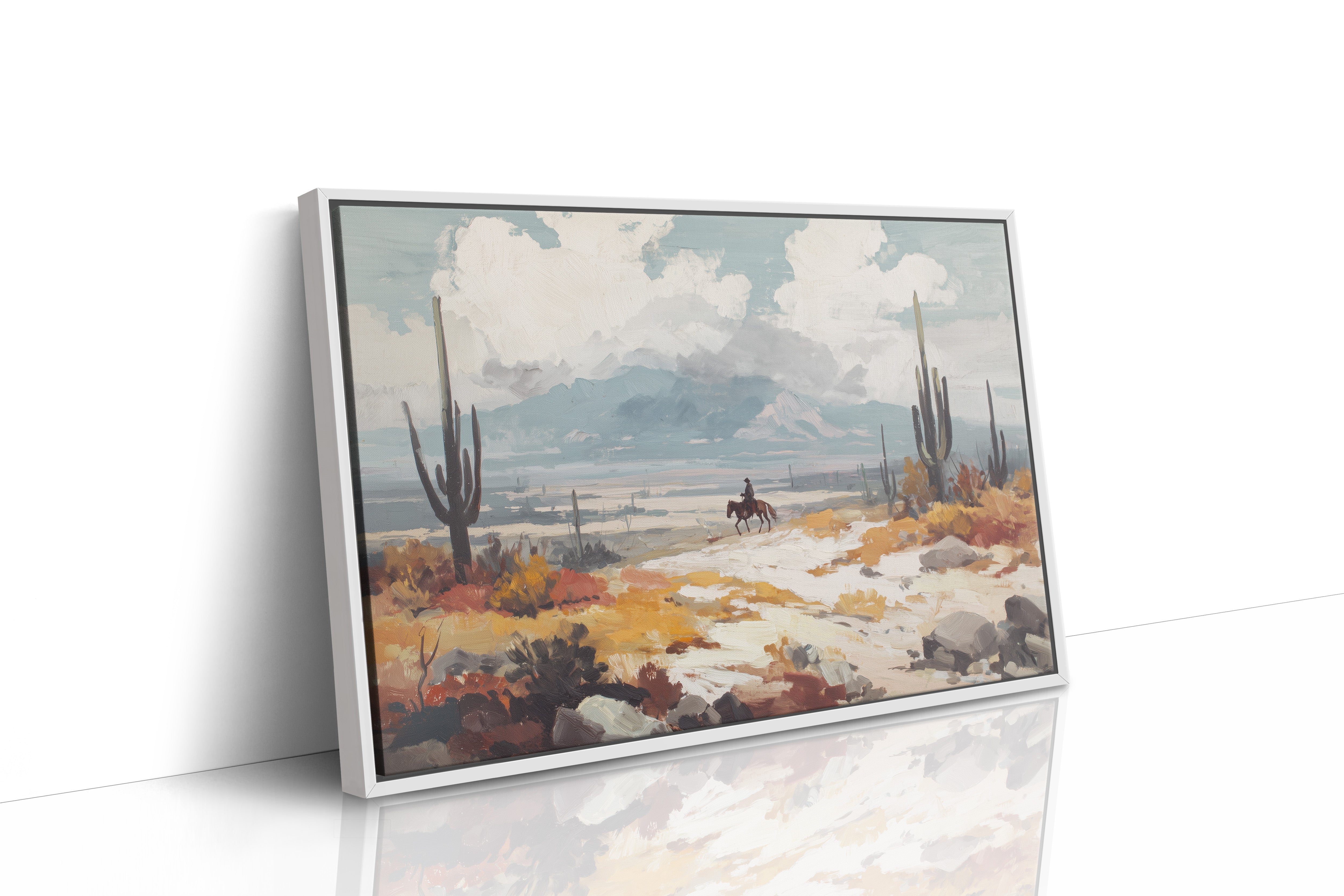 Beneath a vast sky, a lone rider traverses the arid landscape, each hoofbeat resonating with the whispers of ancient earth. This piece embodies the essence of contemporary exploration, capturing the spirit of adventure in a sun-drenched wilderness. The vibrant hues of ochre and sage mingle, creating a tapestry of nature's resilience against a backdrop of towering cacti and distant mountains, inviting contemplation of solitude and purpose. Ideal for a study or hallway, this artwork inspires dreams of open roads and uncharted paths. Let its presence evoke a sense of wanderlust and connection to the wild.