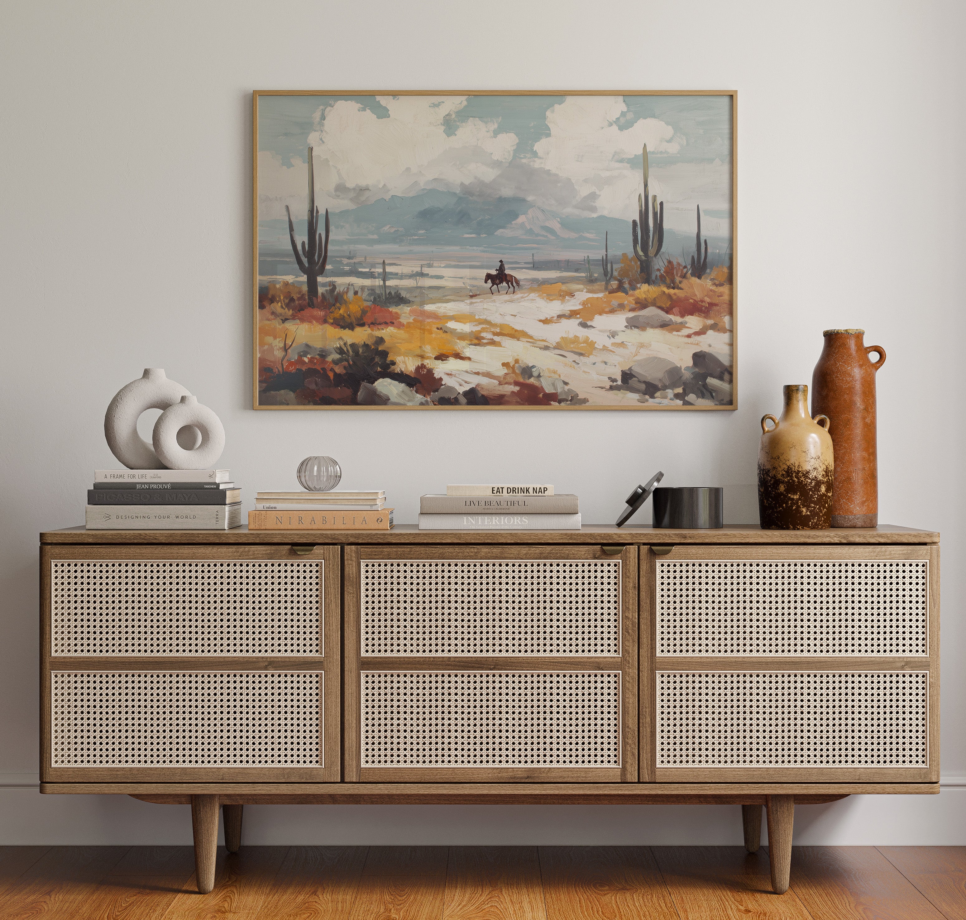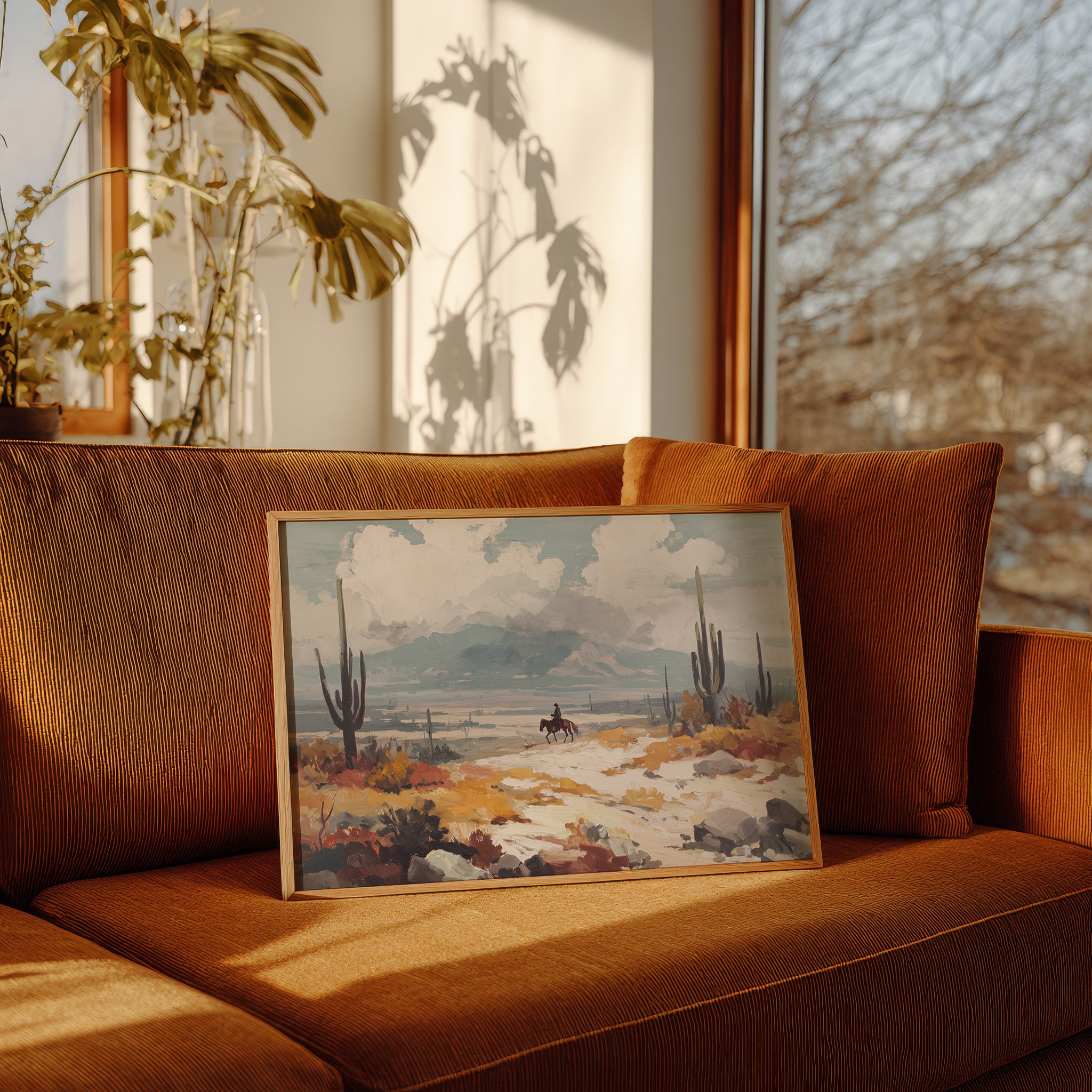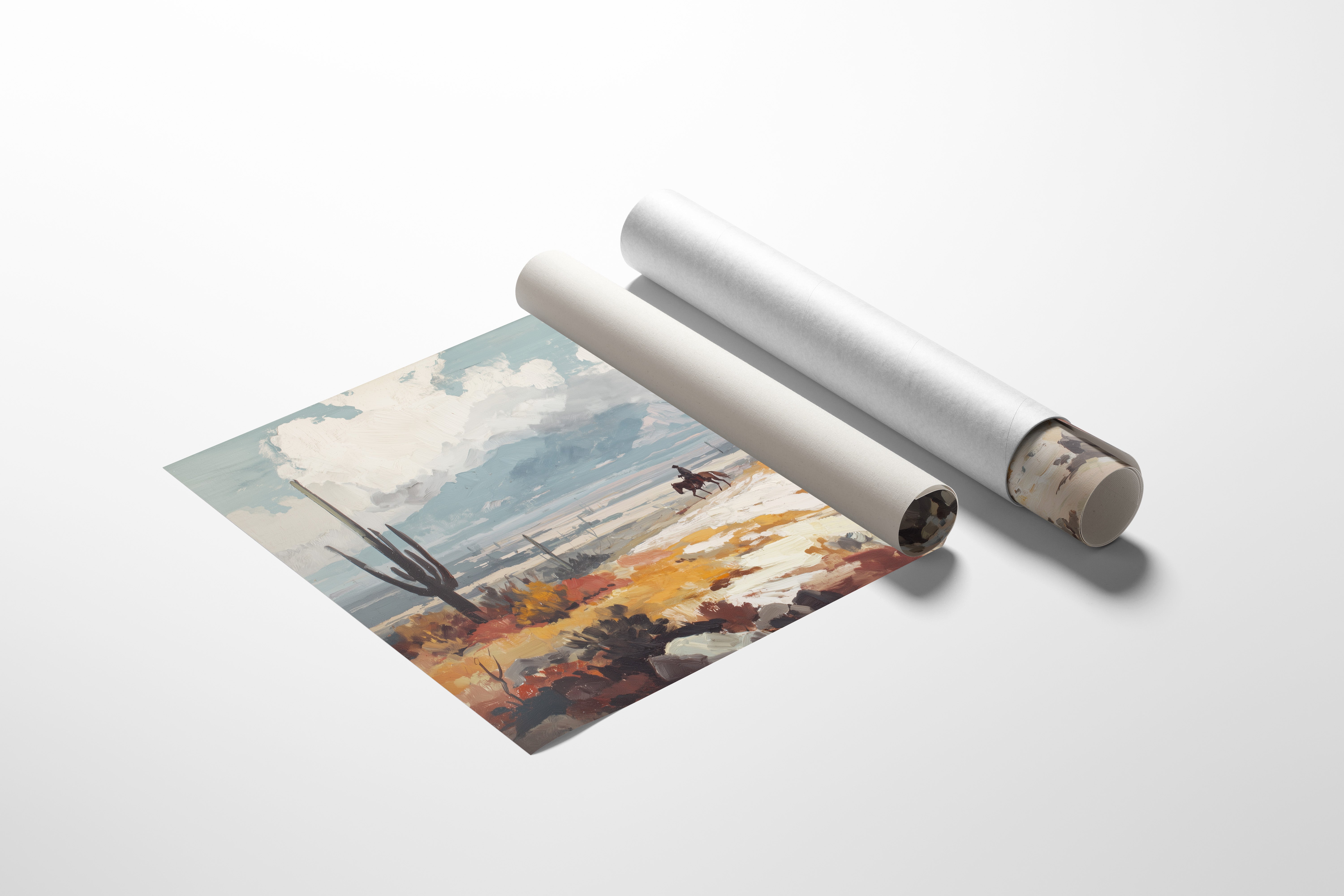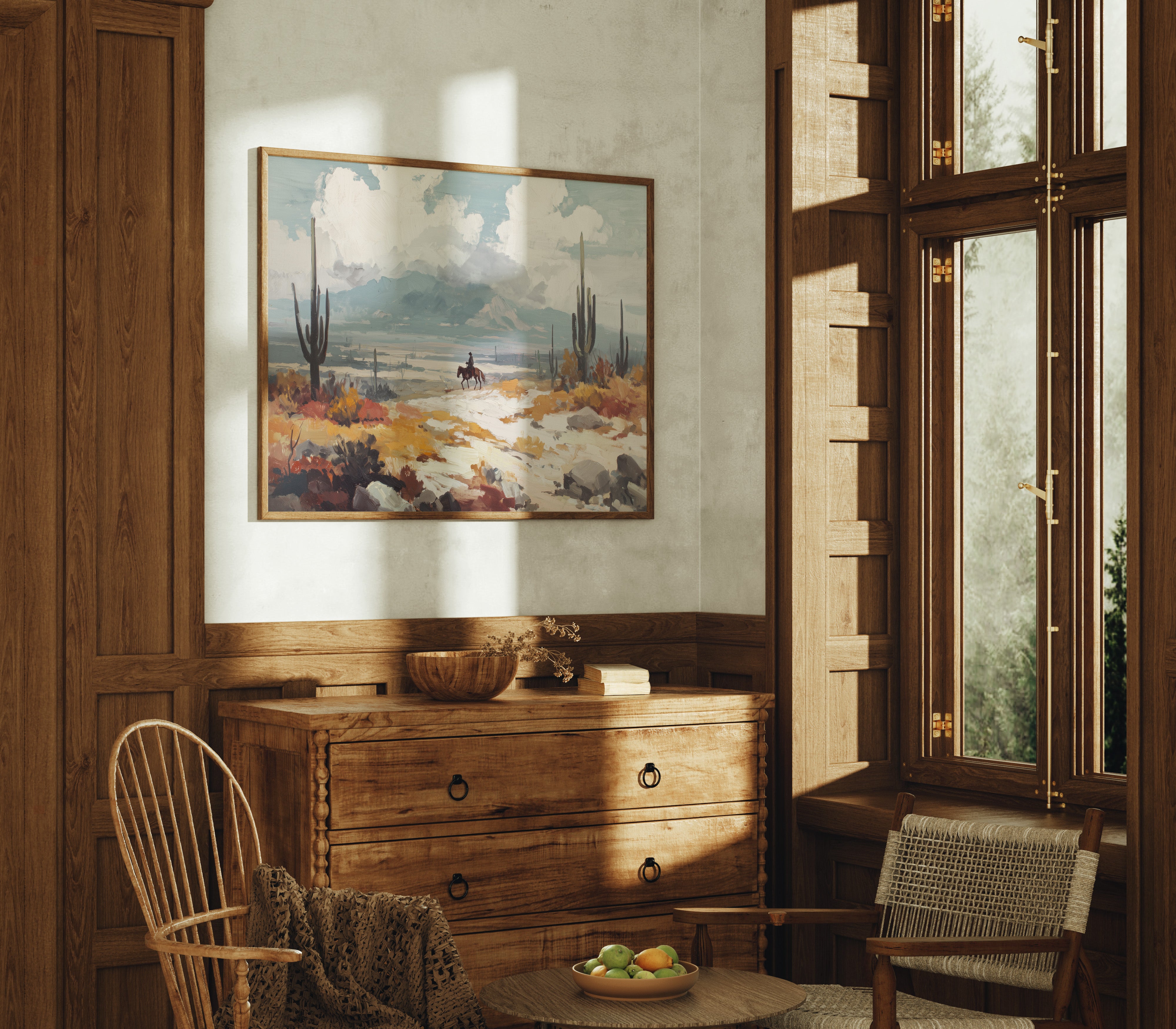 Beneath a vast sky, a lone rider traverses the arid landscape, each hoofbeat resonating with the whispers of ancient earth. This piece embodies the essence of contemporary exploration, capturing the spirit of adventure in a sun-drenched wilderness. The vibrant hues of ochre and sage mingle, creating a tapestry of nature's resilience against a backdrop of towering cacti and distant mountains, inviting contemplation of solitude and purpose. Ideal for a study or hallway, this artwork inspires dreams of open roads and uncharted paths. Let its presence evoke a sense of wanderlust and connection to the wild.