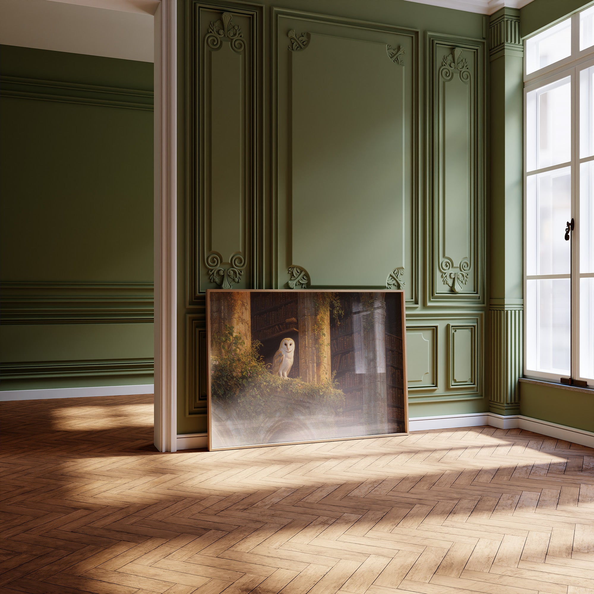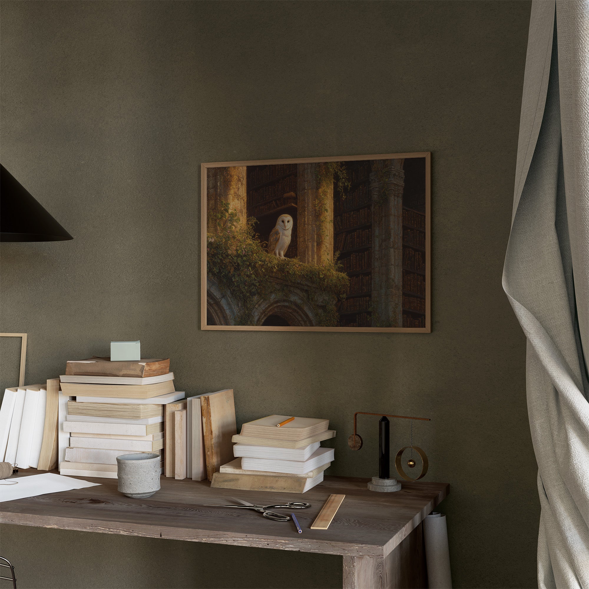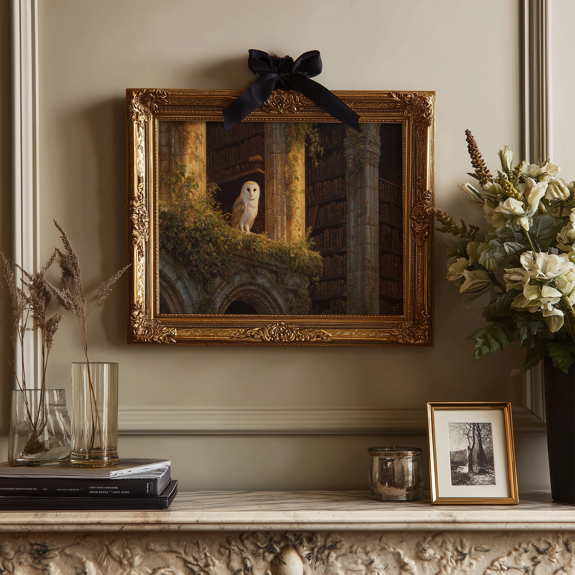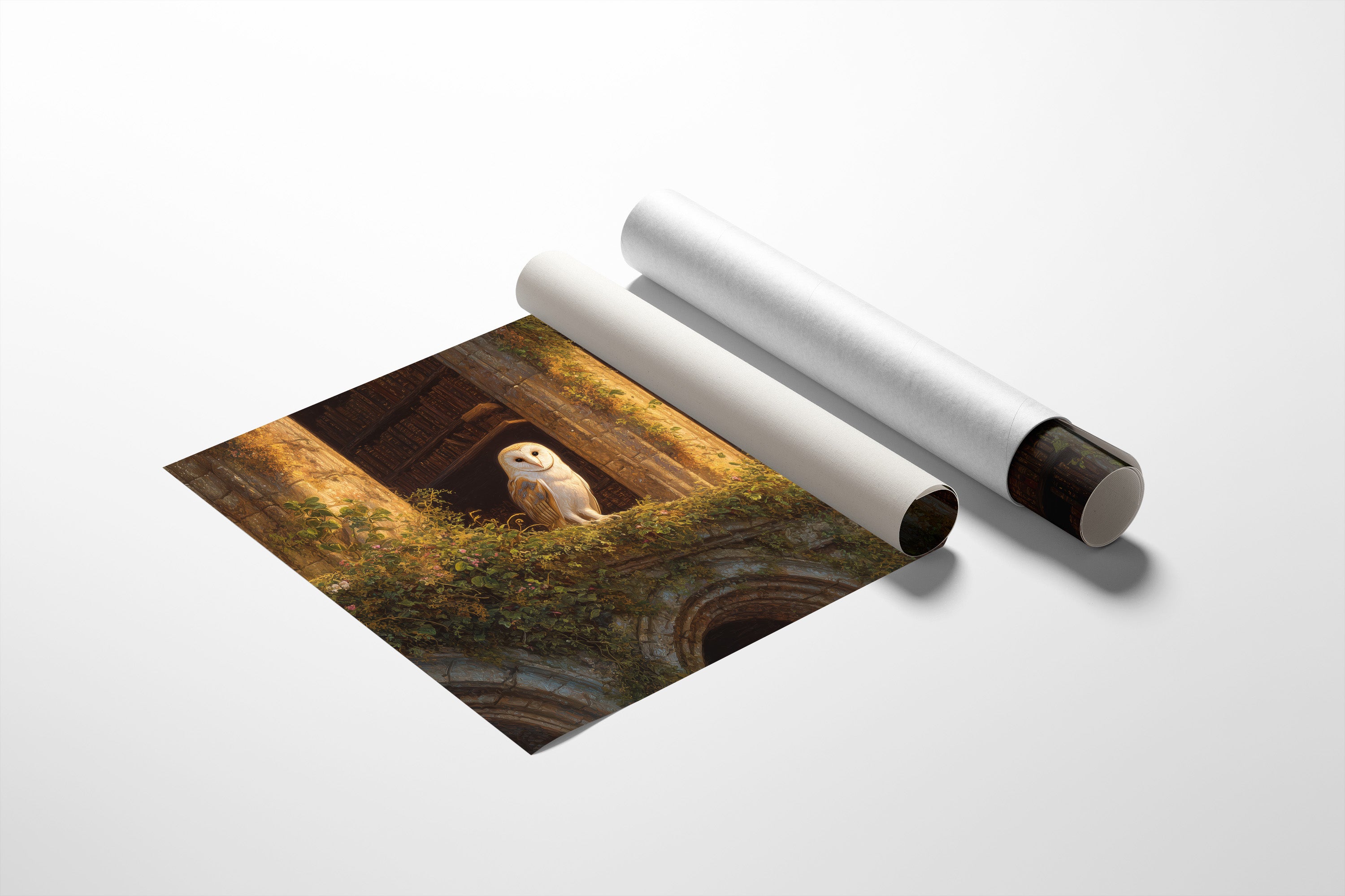 Golden light spills across forgotten tomes, illuminating a solitary barn owl perched among moss-covered ruins. The silent sentinel watches over this mystical library where nature and knowledge intertwine in perfect harmony. Warm amber tones dance across weathered stone archways and endless shelves of leather-bound wisdom, creating a sanctuary where time stands suspended between worlds. This piece brings scholarly enchantment to a home office, reading nook, or anywhere you seek to blend literary charm with natural wonder.