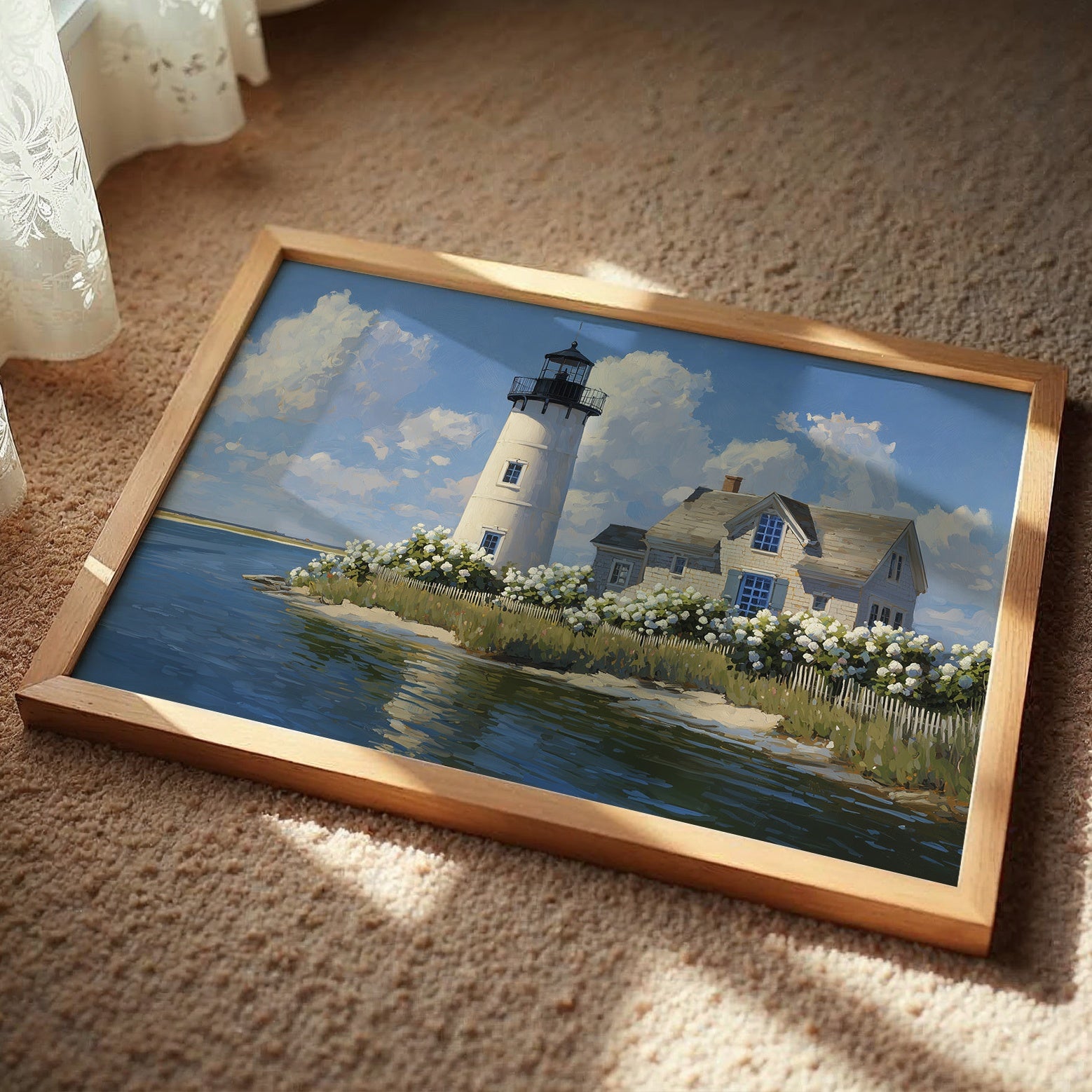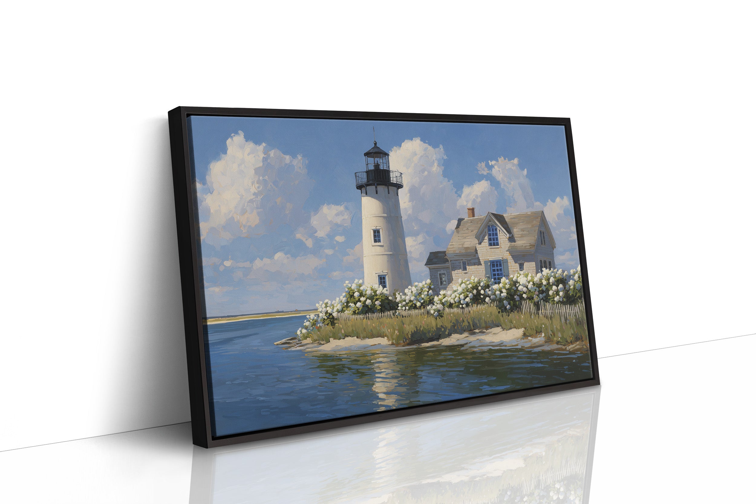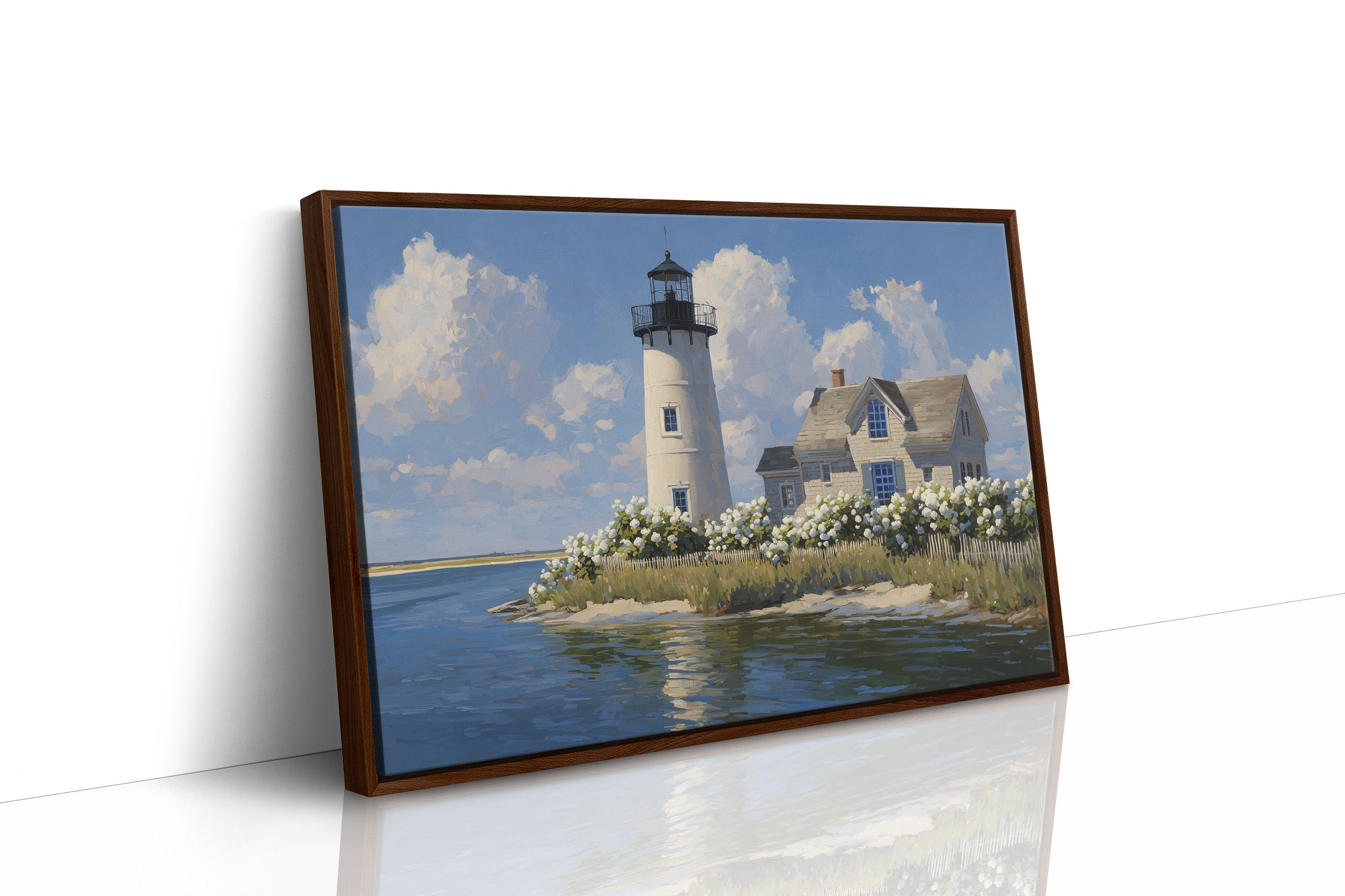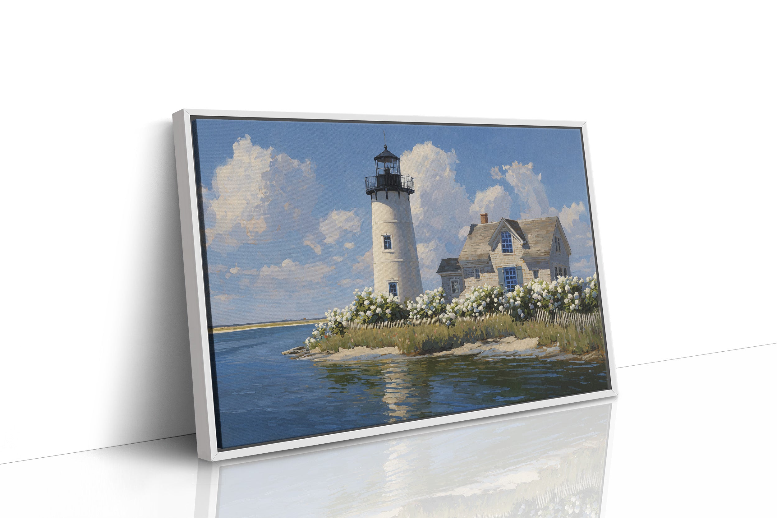 Sunlight bathes the solitary lighthouse standing tall against billowing summer clouds. The white tower rises proudly beside its keeper's cottage, surrounded by a profusion of hydrangeas that dance along the picket fence, their pale blooms echoing the clouds above. Azure waters reflect the scene with gentle ripples, creating a perfect harmony of sea, sky, and structure in this peaceful coastal tableau. This serene maritime scene brings timeless New England charm to living rooms, bedrooms, or any space where you seek to capture the tranquil essence of shoreline living.