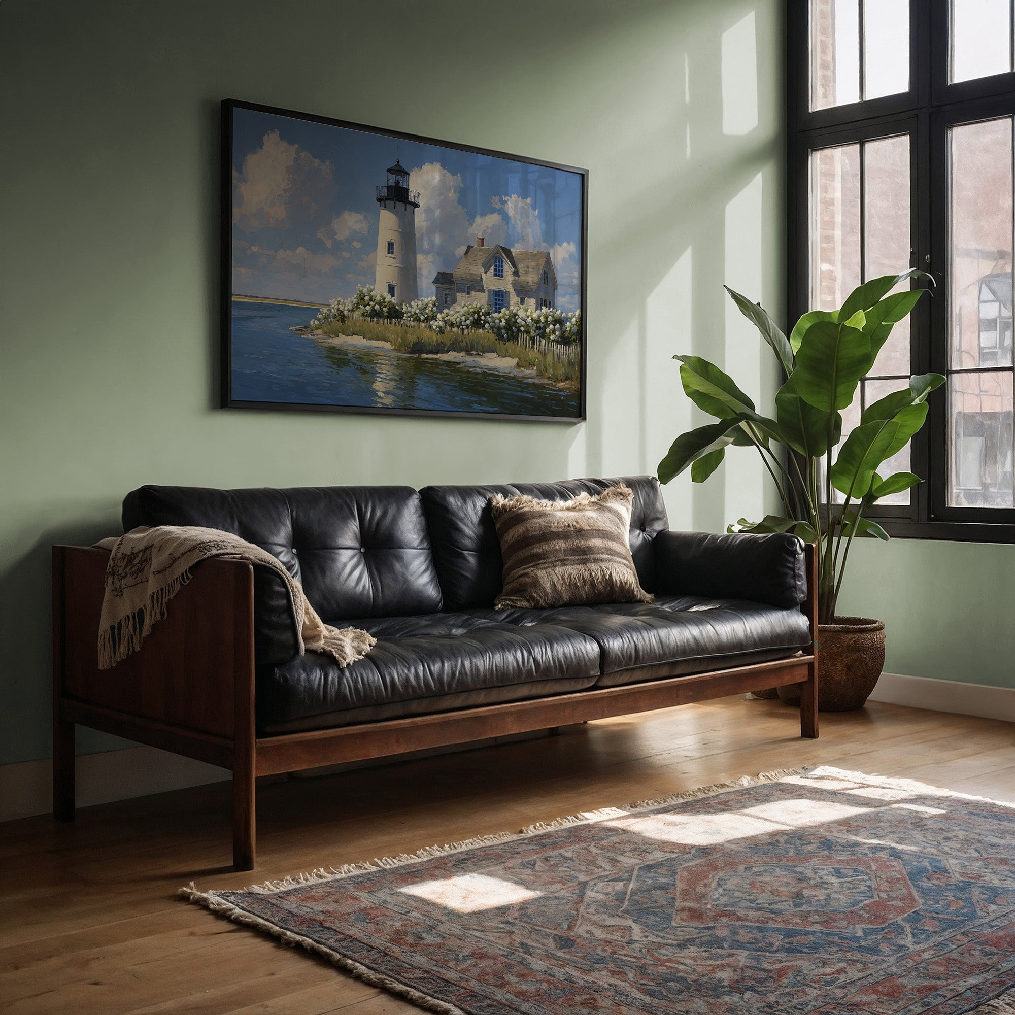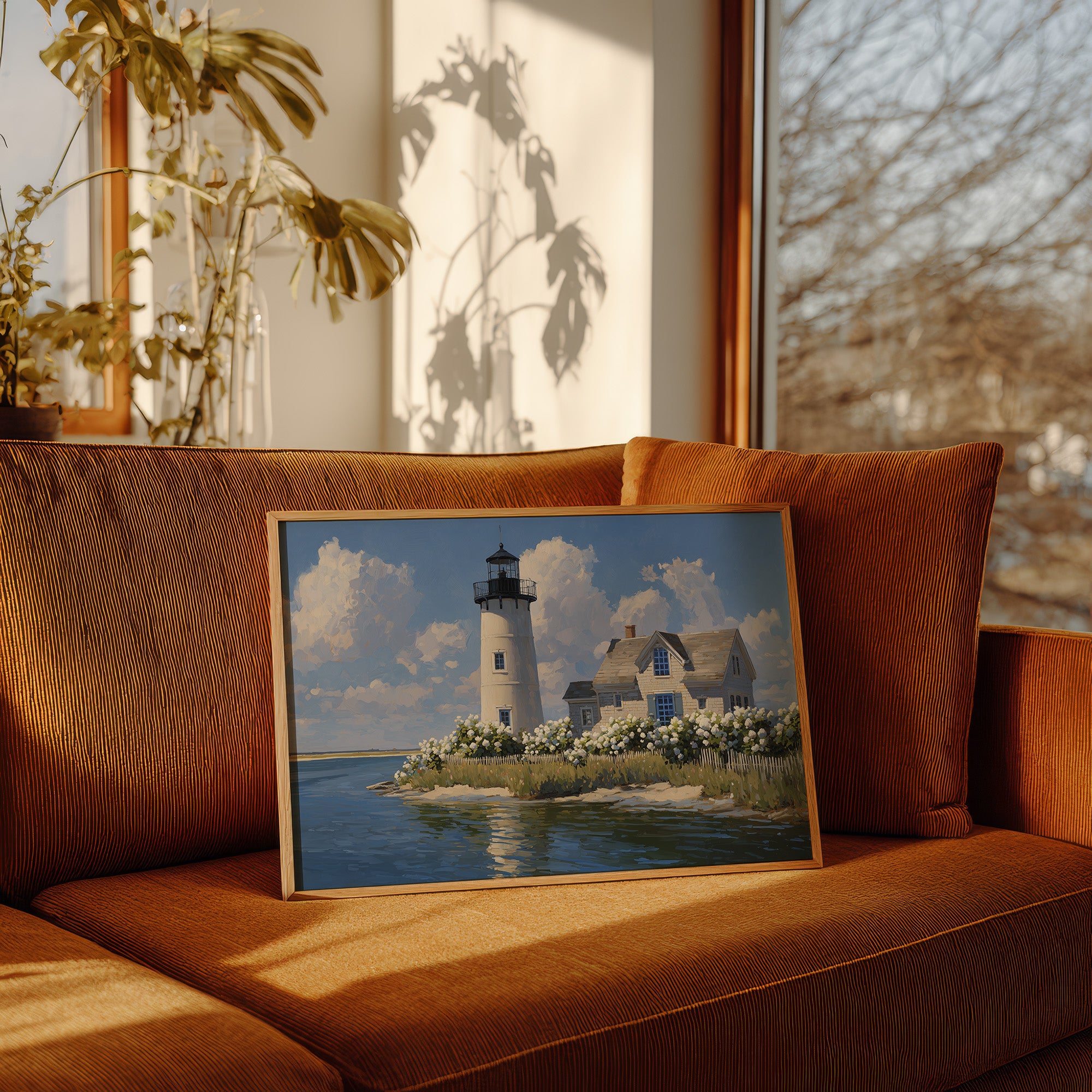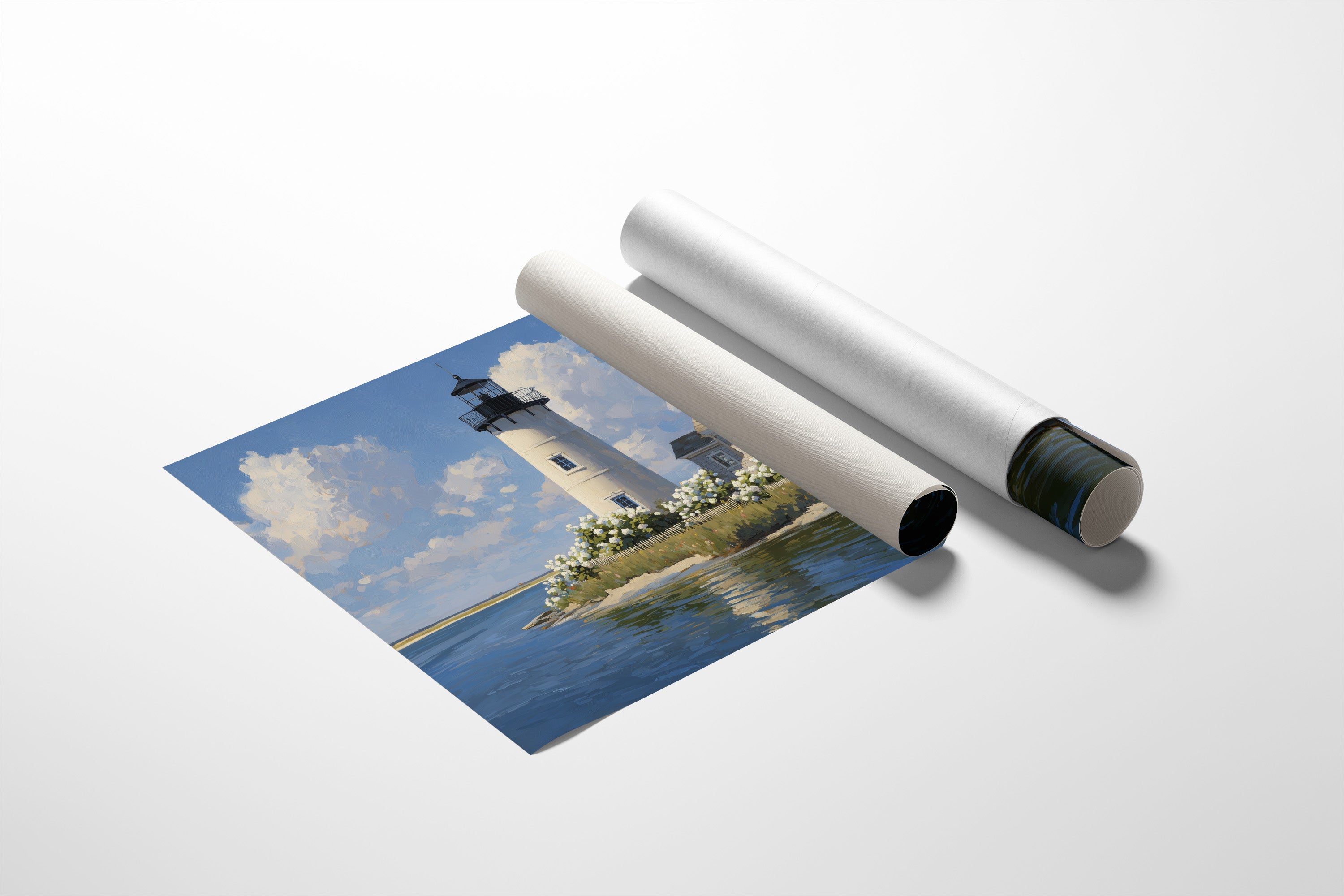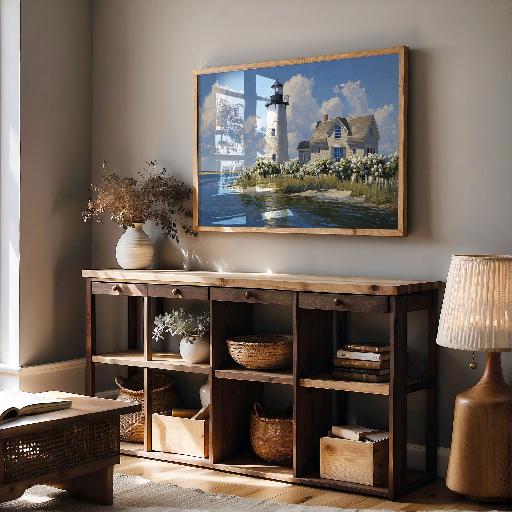 Sunlight bathes the solitary lighthouse standing tall against billowing summer clouds. The white tower rises proudly beside its keeper's cottage, surrounded by a profusion of hydrangeas that dance along the picket fence, their pale blooms echoing the clouds above. Azure waters reflect the scene with gentle ripples, creating a perfect harmony of sea, sky, and structure in this peaceful coastal tableau. This serene maritime scene brings timeless New England charm to living rooms, bedrooms, or any space where you seek to capture the tranquil essence of shoreline living.