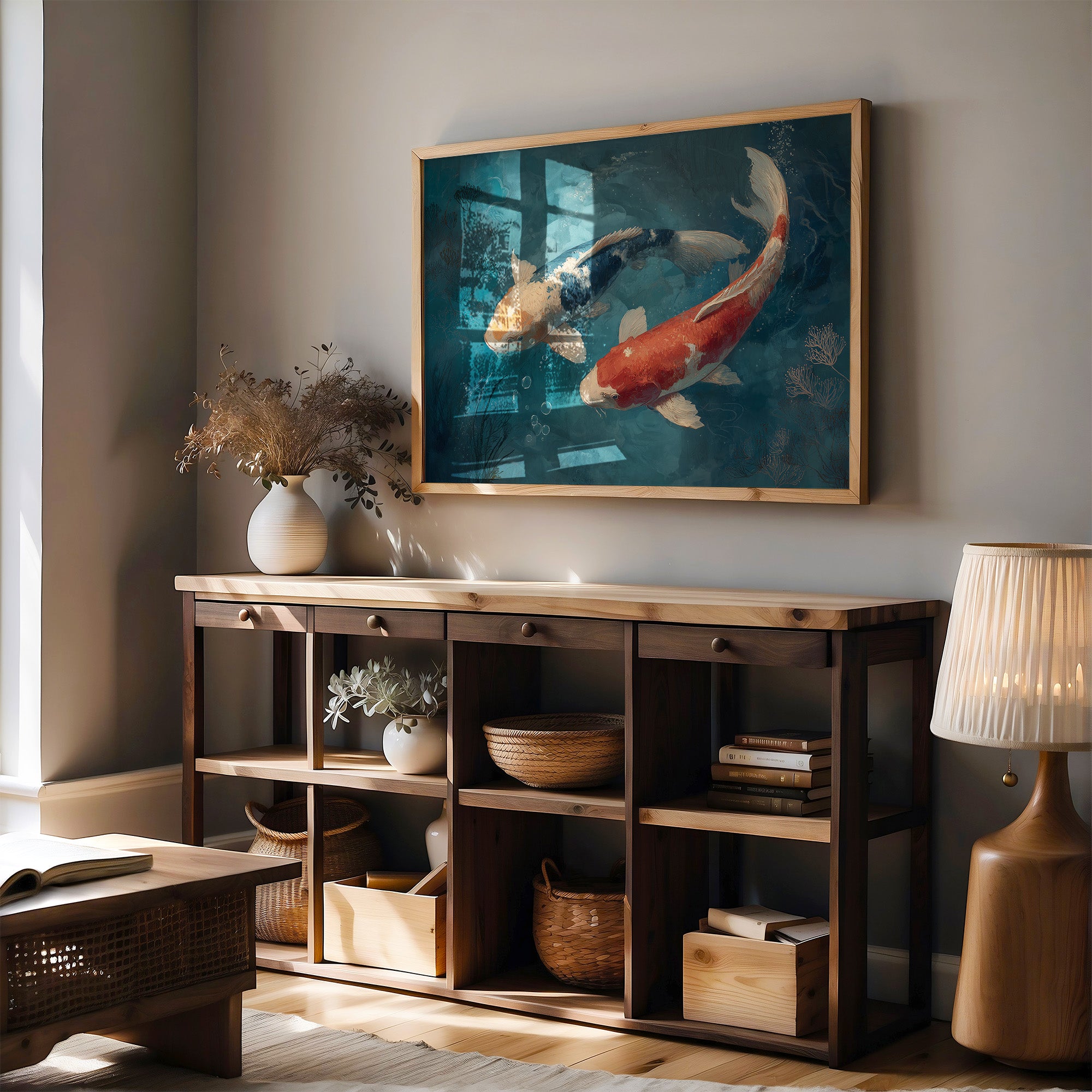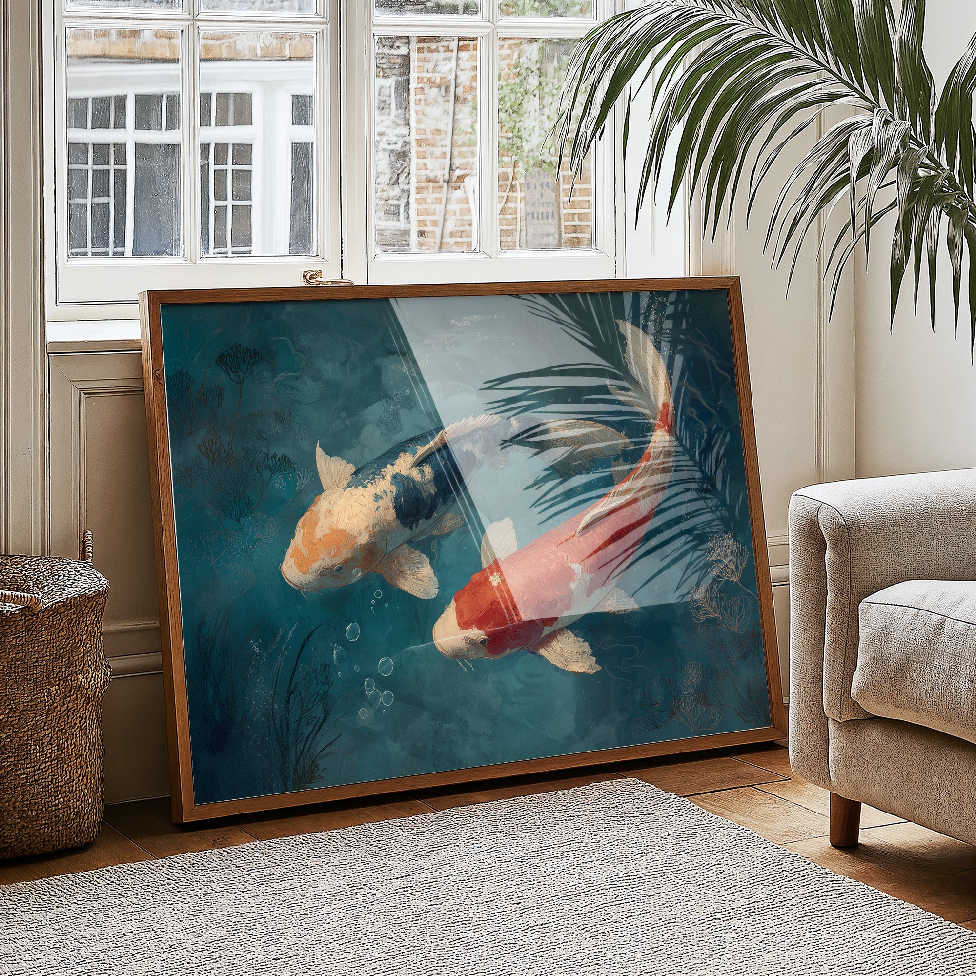 Two koi fish dance in an eternal circle, their orange and white bodies glowing against the mysterious teal waters. The painting captures that perfect moment of balanceyin and yang embodied in their graceful movements, with delicate bubbles rising between them like unspoken conversations. The rich underwater scene hints at coral silhouettes and aquatic plants, creating depth that draws you further into their tranquil world. This serene piece brings meditative calm to a reading nook, bedroom, or any space where you seek peaceful contemplation.