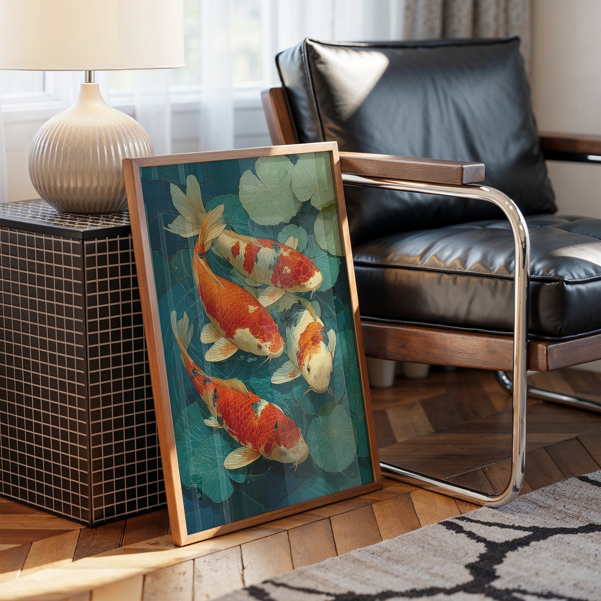 Vibrant orange and red koi fish glide through crystalline waters, their scales catching light like scattered gems. Against a backdrop of soft jade lily pads, these aquatic dancers create a mesmerizing ballet of movement and color, their forms both bold and delicate against the deep teal waters. The composition captures that perfect moment where nature's design meets artistic grace, bringing traditional Asian aesthetics into contemporary expression. This piece would bring serenity and sophisticated charm to a modern study, meditation room, or any space seeking balance between energy and calm.