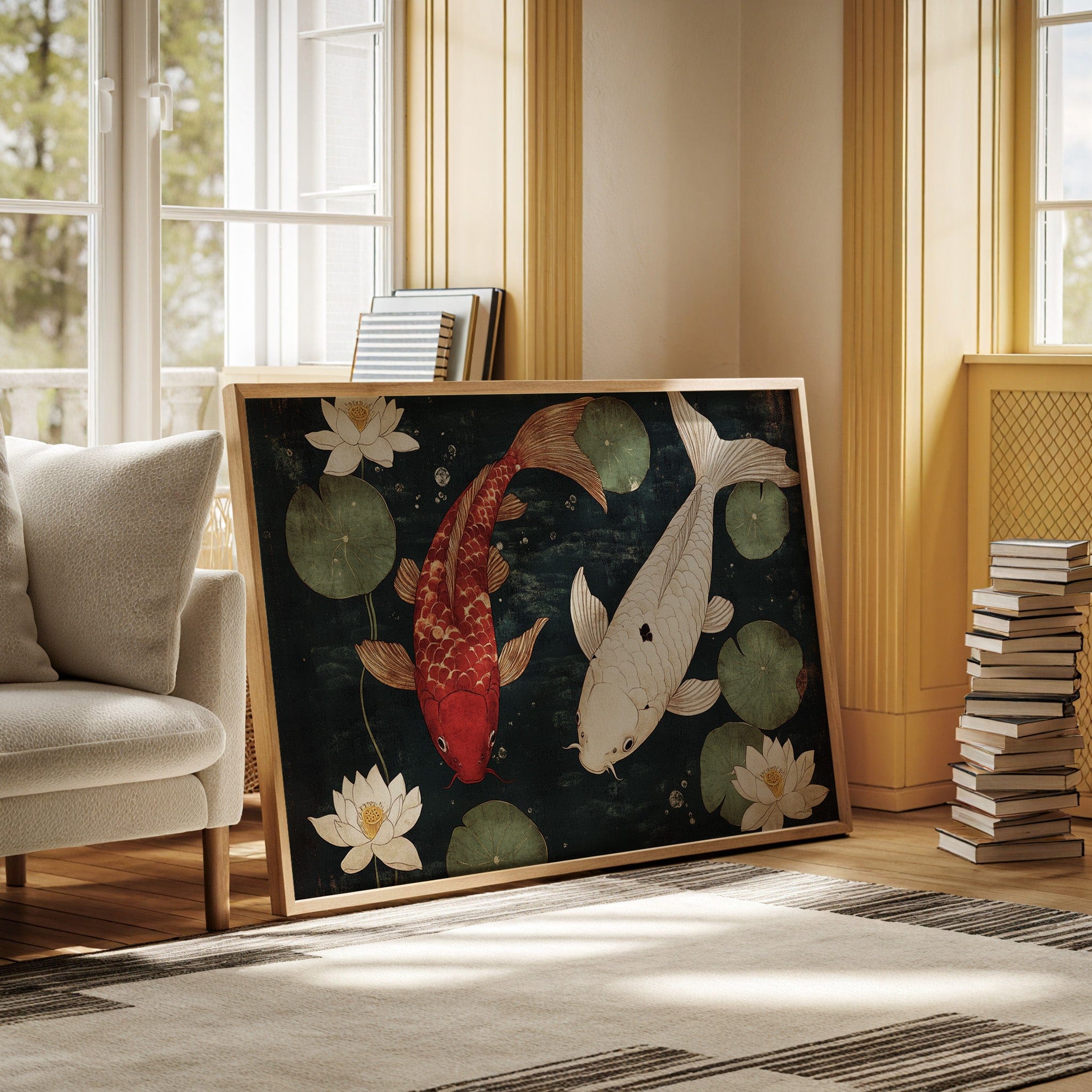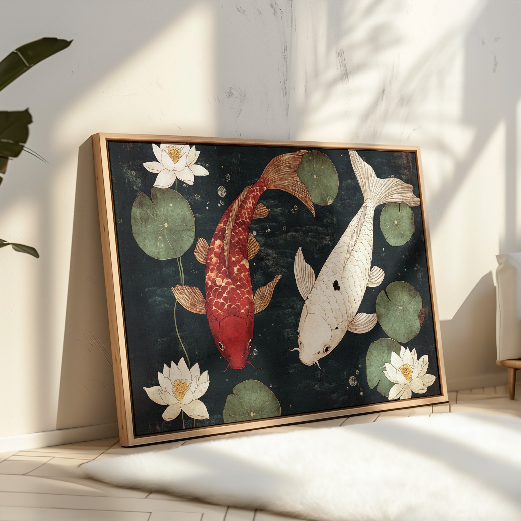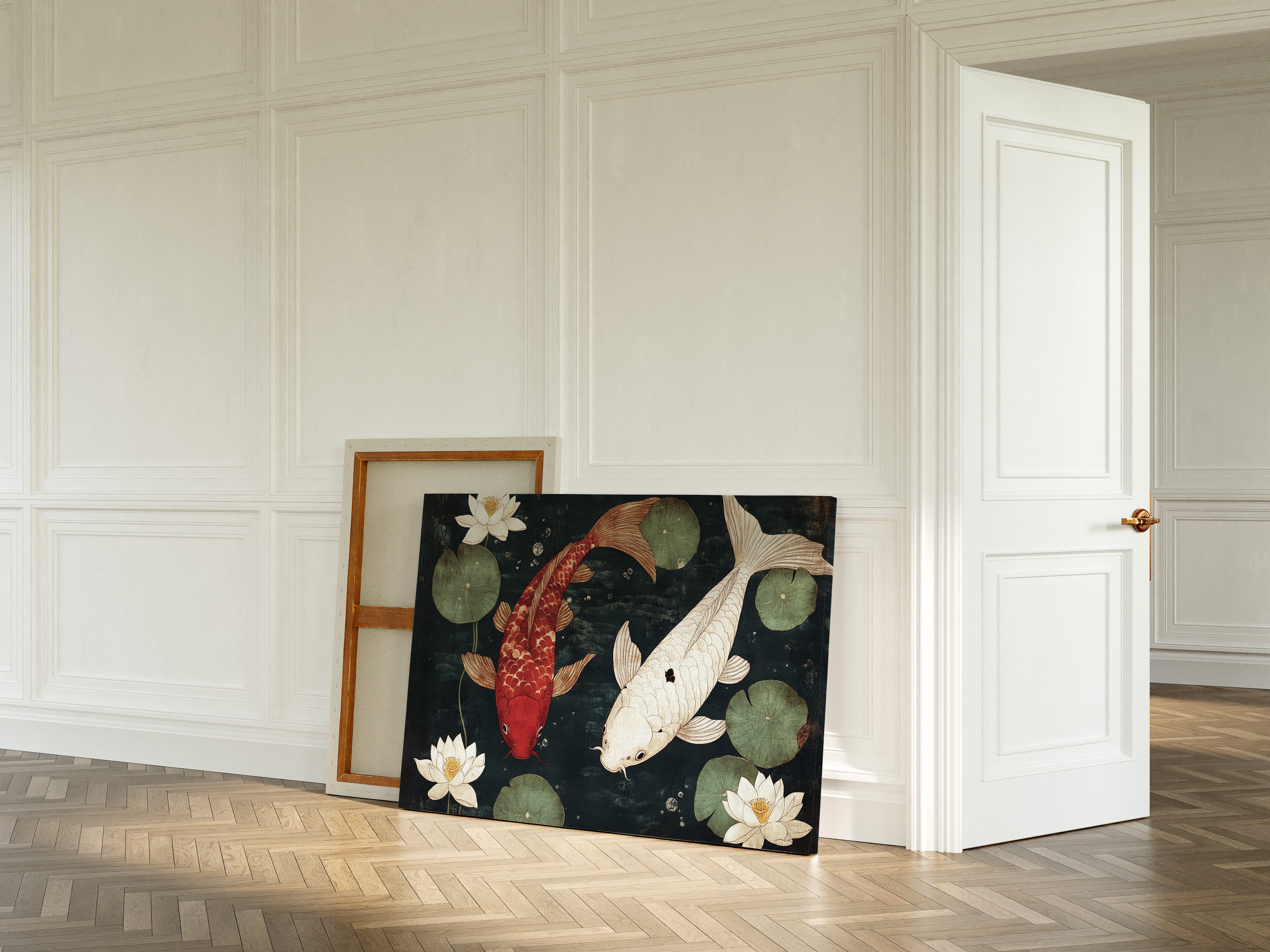 In the depths of midnight waters, two koi fish glide through a mystical garden of floating lotus flowers. Their scales shimmer with ancient stories - one blazing red like autumn sunset, the other pure as fresh snow. Between jade lily pads and delicate air bubbles, these ethereal creatures paint a meditation on balance and harmony.