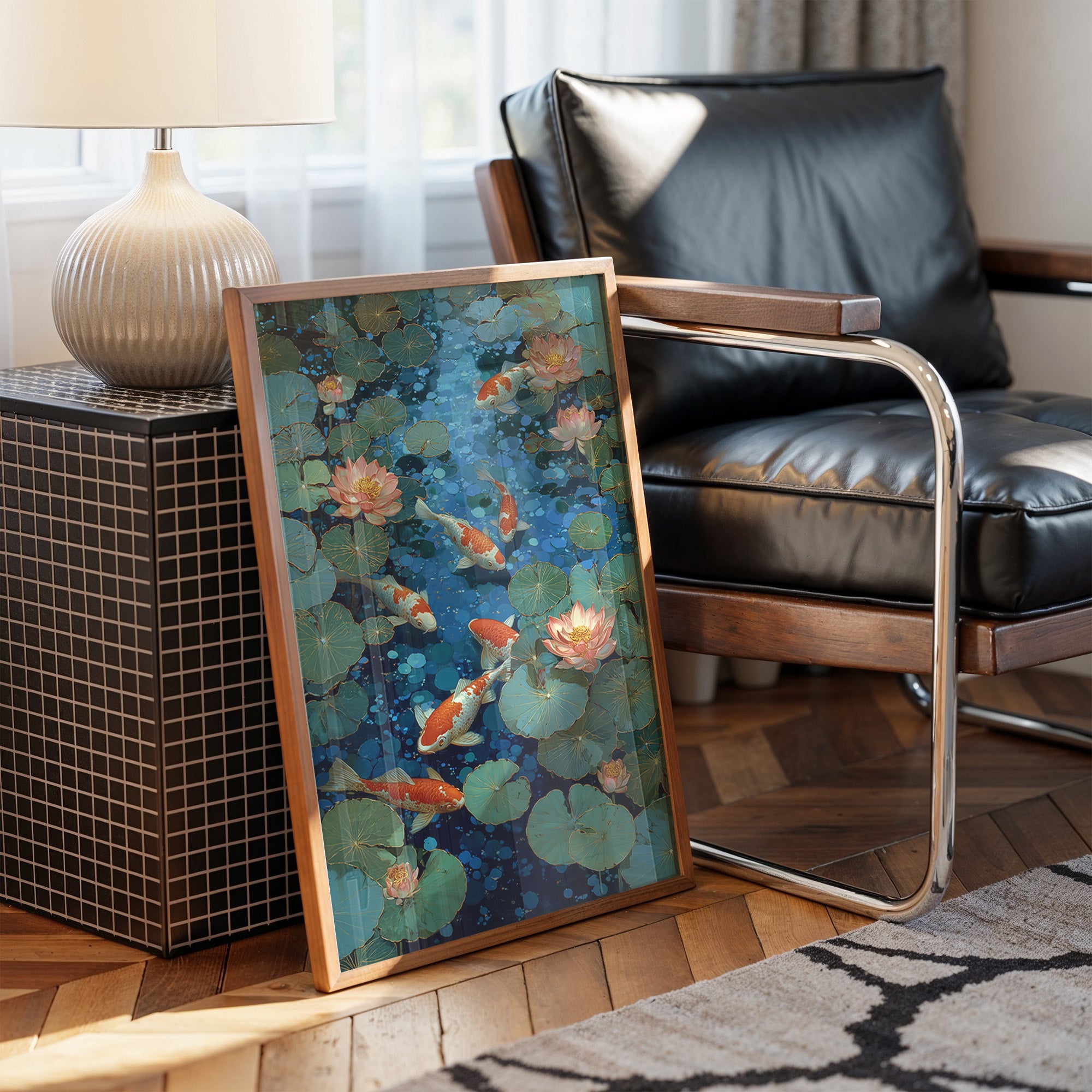 Tranquil waters hold secrets beneath their surface, where vibrant orange koi fish glide through a maze of jade lily pads. Delicate pink lotus blooms punctuate the deep azure waters, creating a mesmerizing dance of color and movement that captures the essence of a serene Japanese garden. The scene unfolds like a living meditation, each element perfectly balanced in this aquatic ballet. This piece would bring a sense of calm sophistication to a modern living room or home office, especially when paired with clean-lined furniture and natural materials.