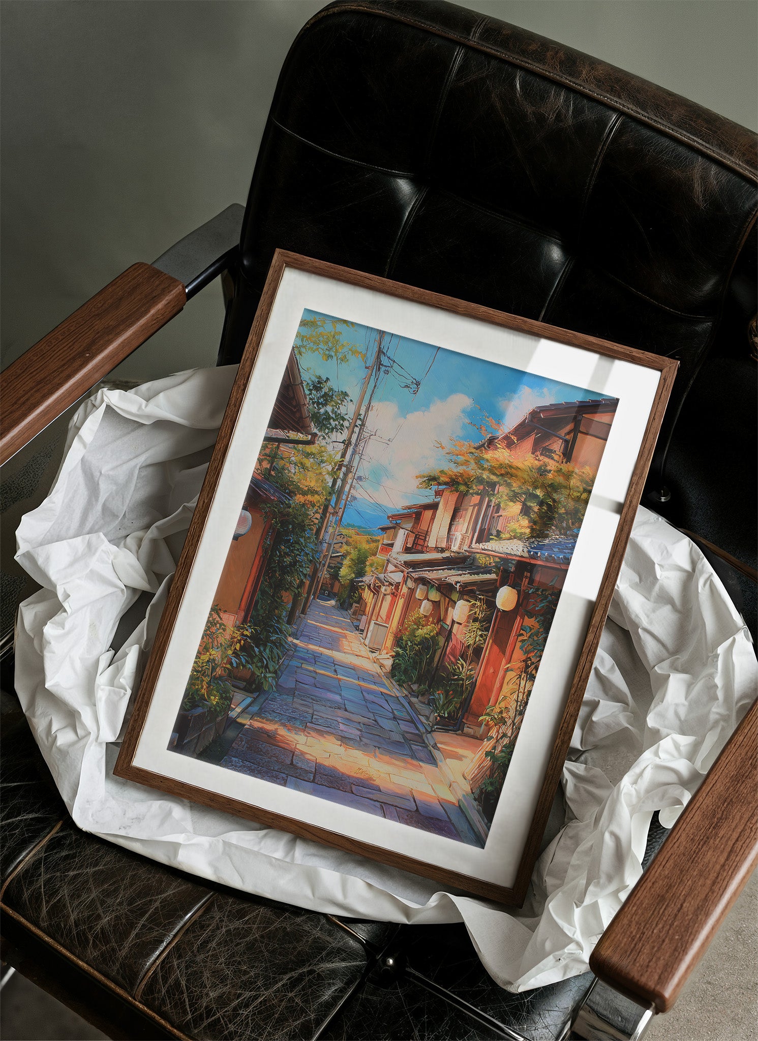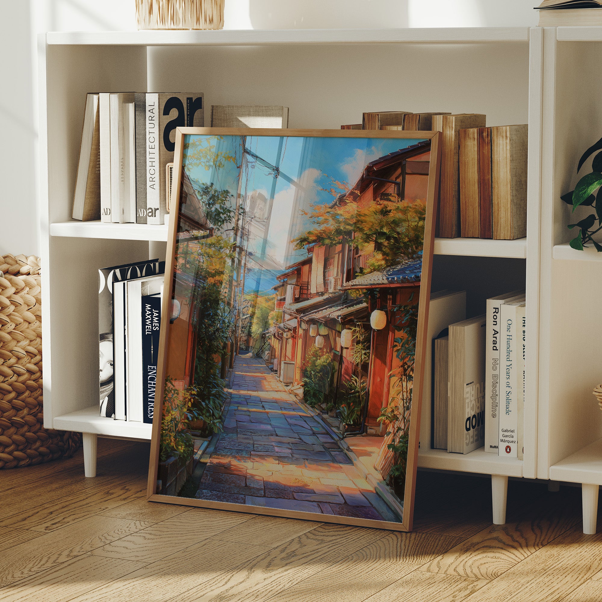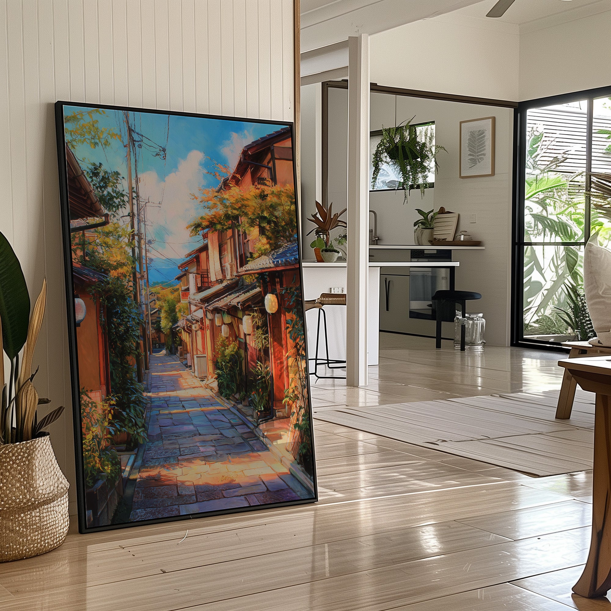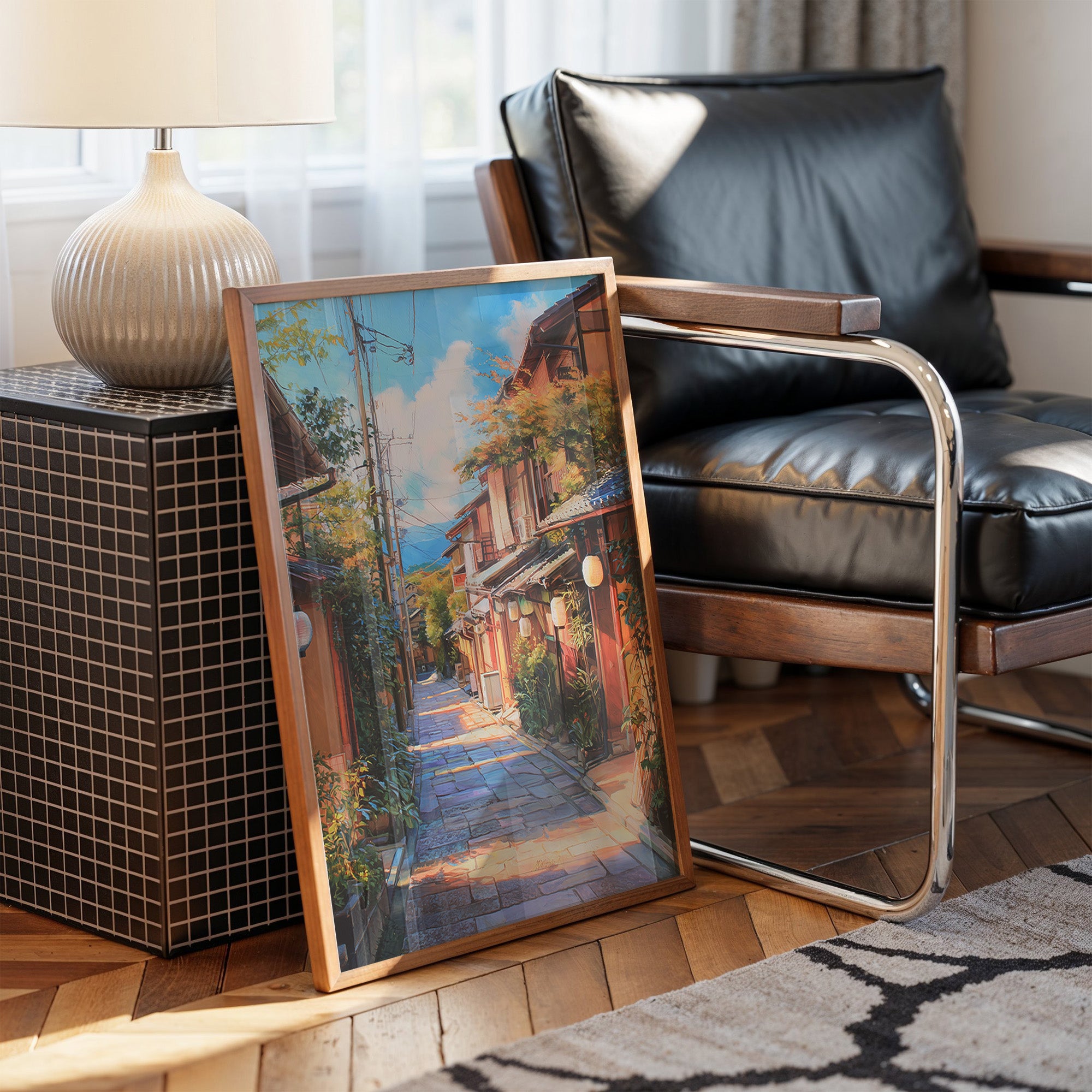 Sunlight spills across weathered cobblestones, painting a path through this tranquil Japanese alleyway. Traditional machiya houses stand sentinel in earthy terracotta and deep browns, their wooden frames telling stories of centuries past. Paper lanterns sway gently against blue skies, while maple leaves dance in golden autumn light, creating a perfect harmony between nature and architecture. This serene scene captures the essence of slow living in Kyoto's historic districts, where every stone and shadow holds meaning. An ideal focal point for meditation spaces or reading nooks where one seeks to create a sense of peaceful contemplation.