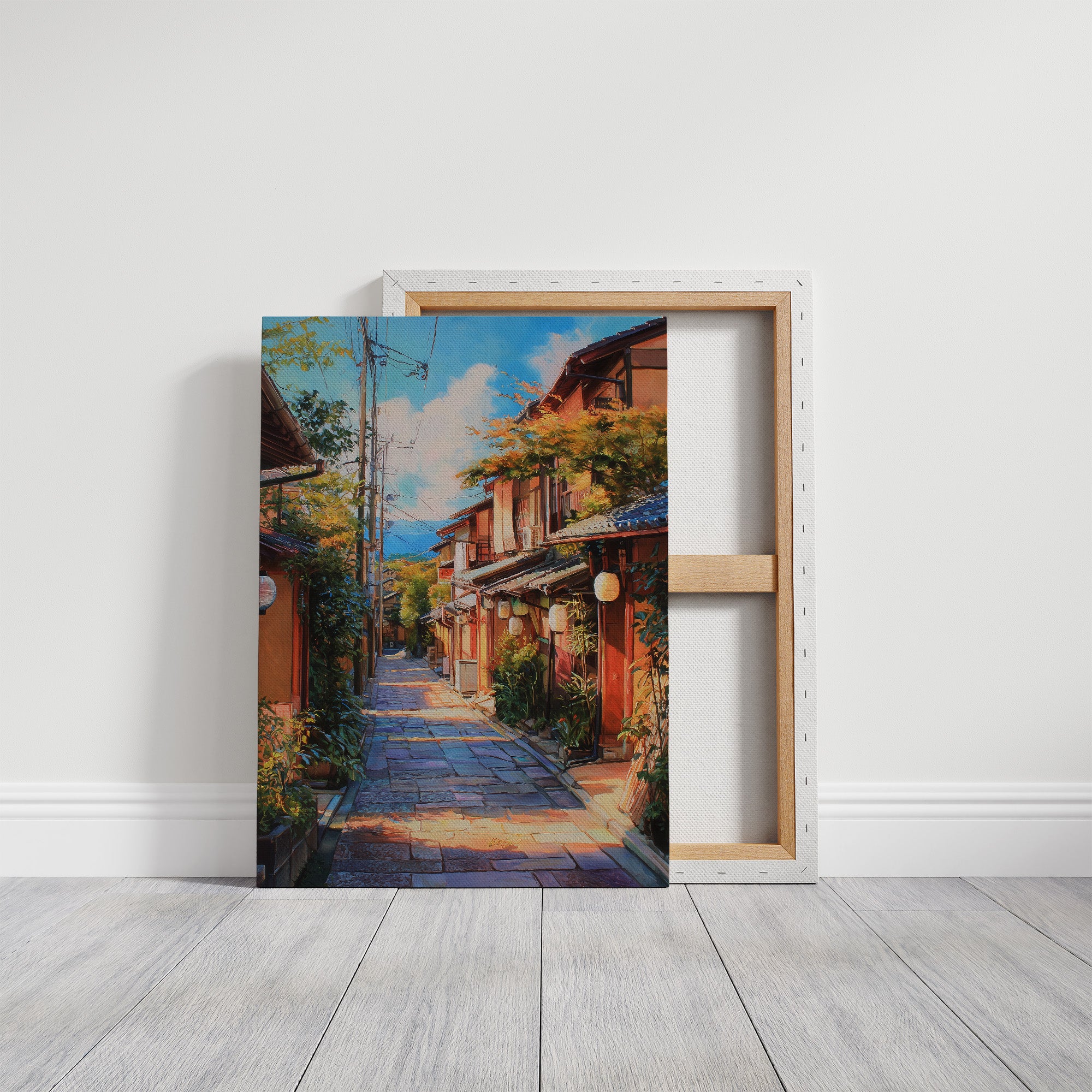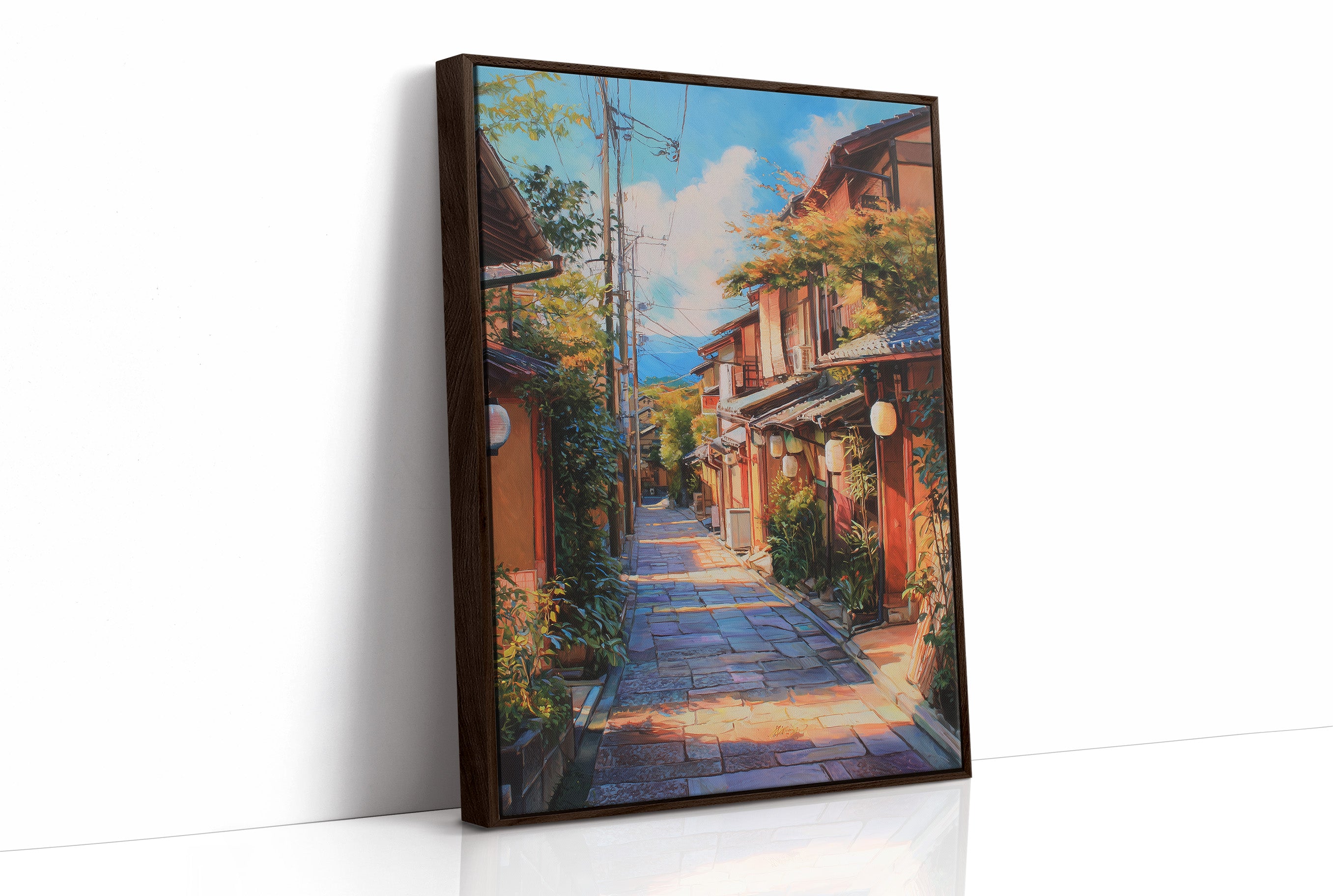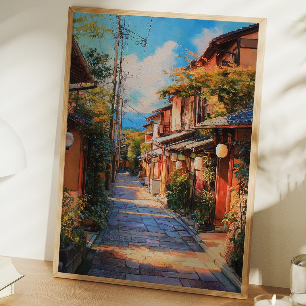 Sunlight spills across weathered cobblestones, painting a path through this tranquil Japanese alleyway. Traditional machiya houses stand sentinel in earthy terracotta and deep browns, their wooden frames telling stories of centuries past. Paper lanterns sway gently against blue skies, while maple leaves dance in golden autumn light, creating a perfect harmony between nature and architecture. This serene scene captures the essence of slow living in Kyoto's historic districts, where every stone and shadow holds meaning. An ideal focal point for meditation spaces or reading nooks where one seeks to create a sense of peaceful contemplation.