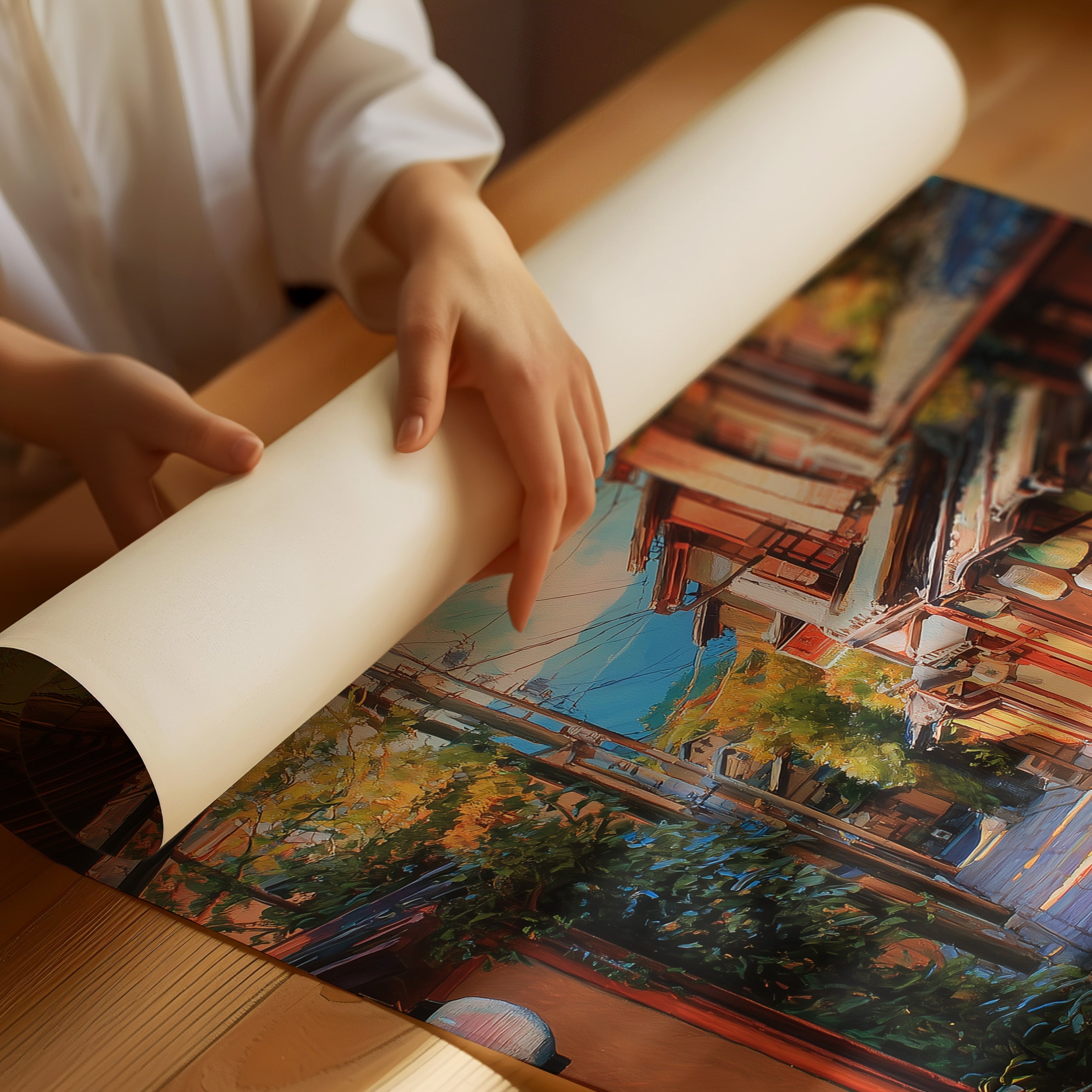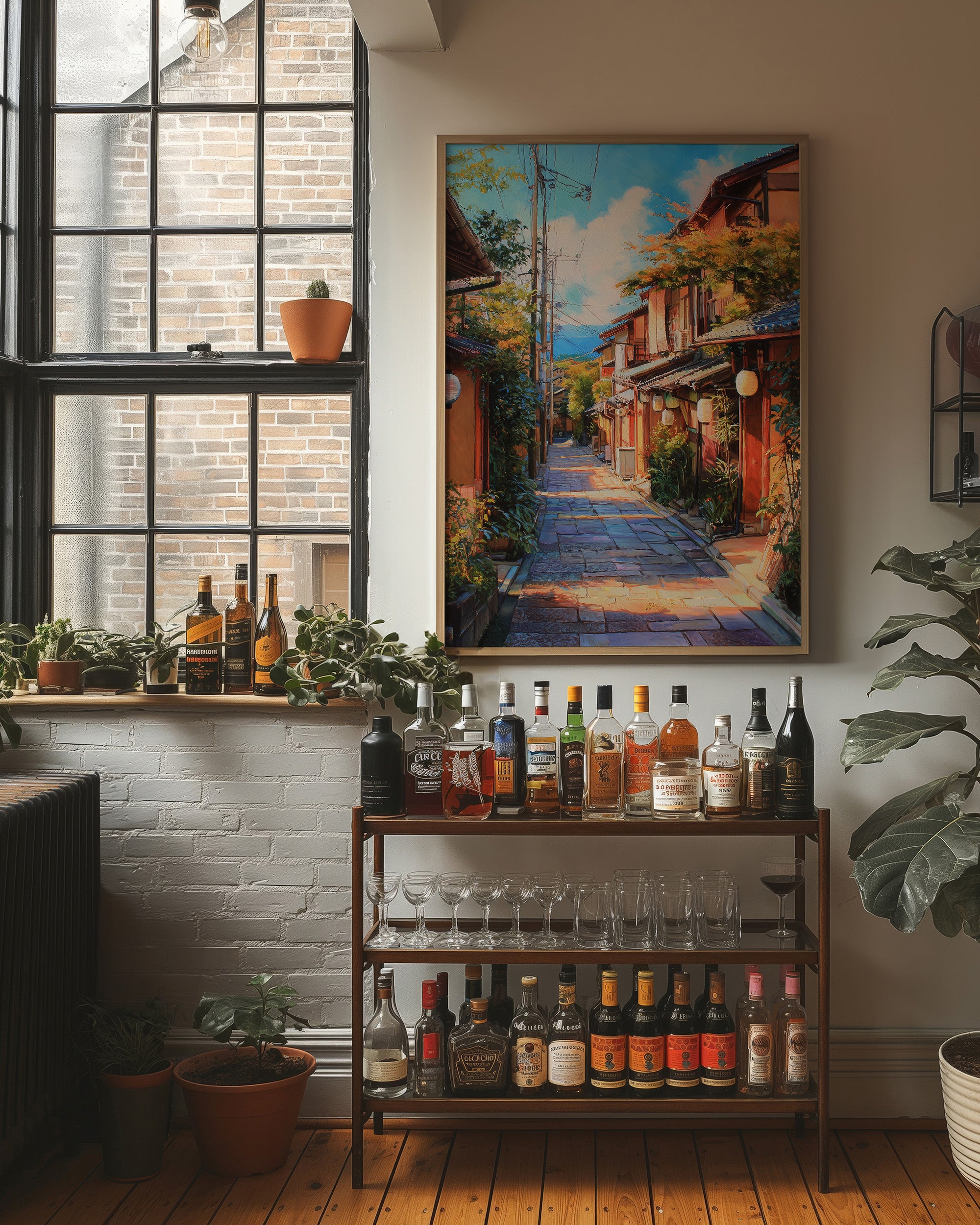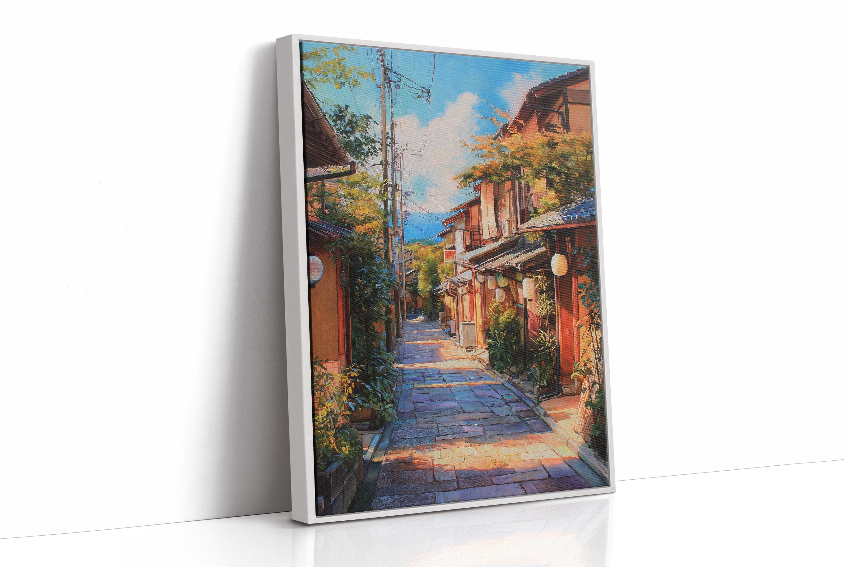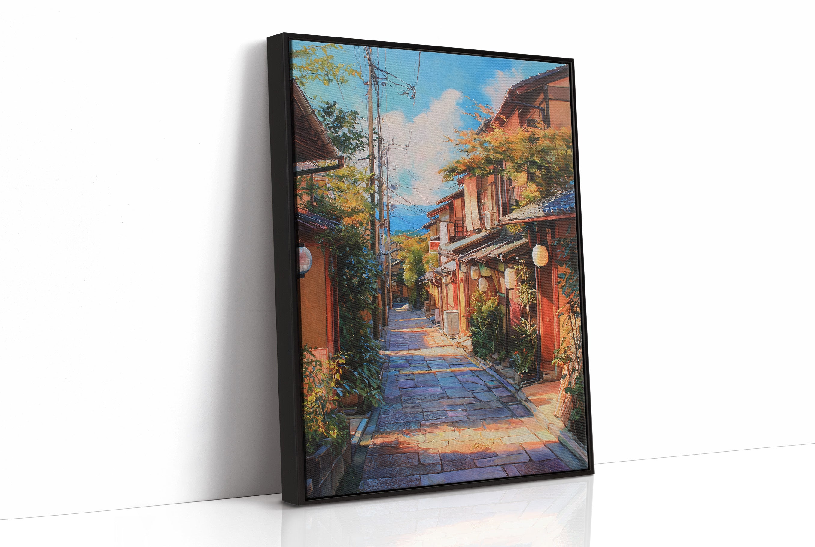 Sunlight spills across weathered cobblestones, painting a path through this tranquil Japanese alleyway. Traditional machiya houses stand sentinel in earthy terracotta and deep browns, their wooden frames telling stories of centuries past. Paper lanterns sway gently against blue skies, while maple leaves dance in golden autumn light, creating a perfect harmony between nature and architecture. This serene scene captures the essence of slow living in Kyoto's historic districts, where every stone and shadow holds meaning. An ideal focal point for meditation spaces or reading nooks where one seeks to create a sense of peaceful contemplation.