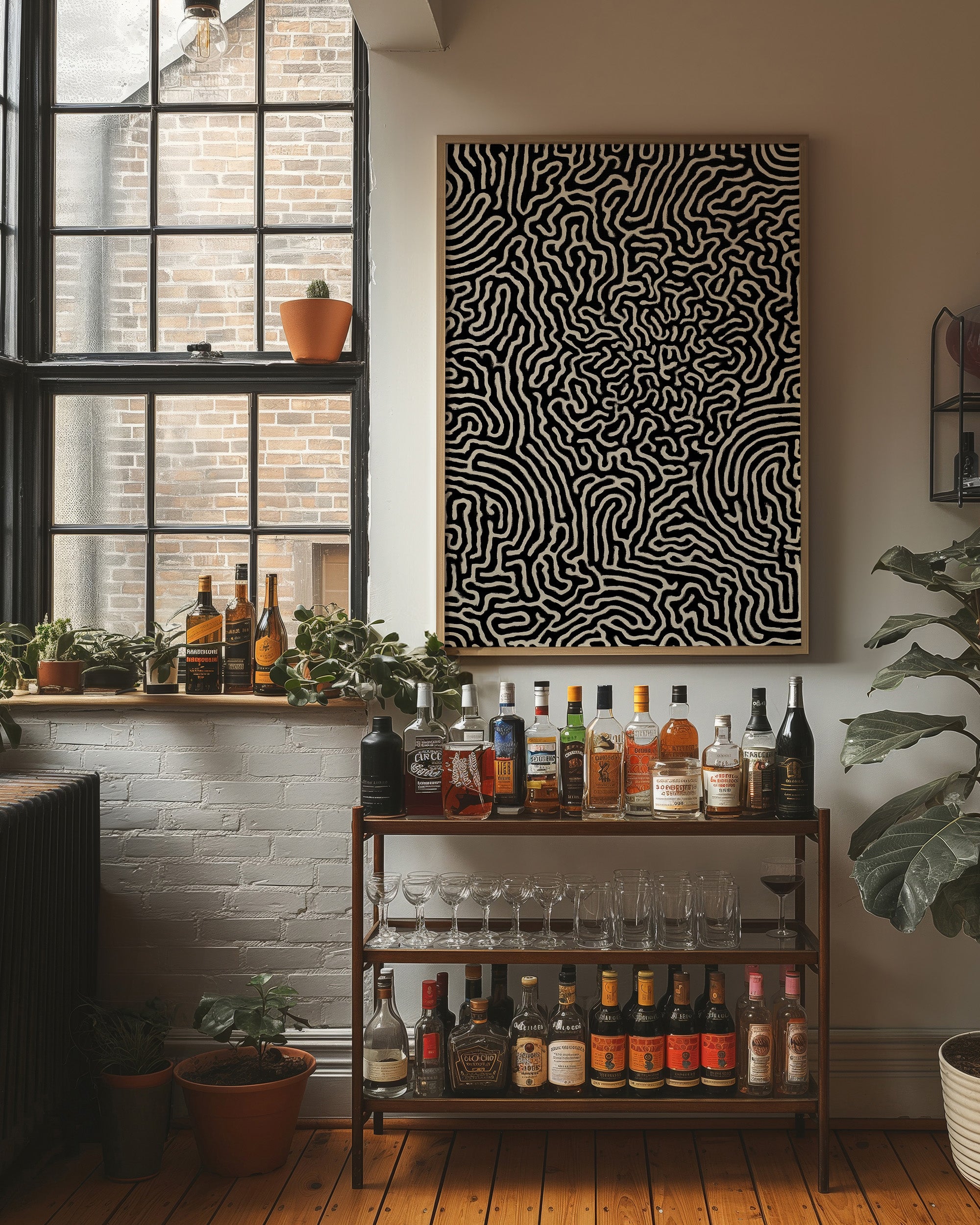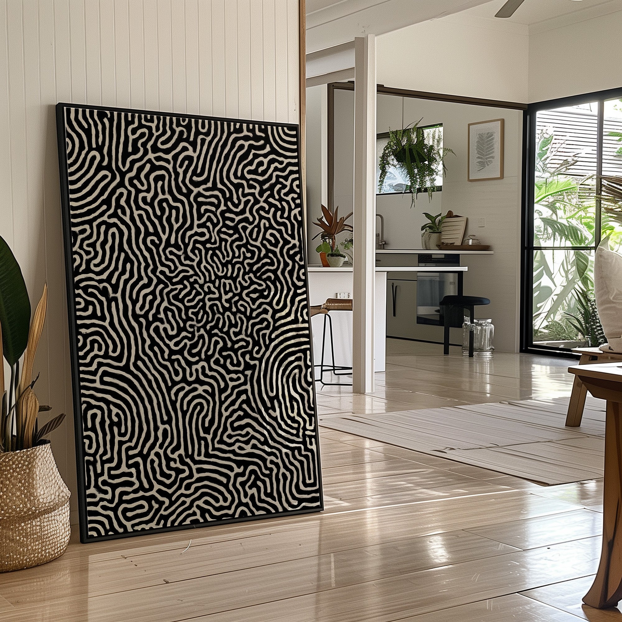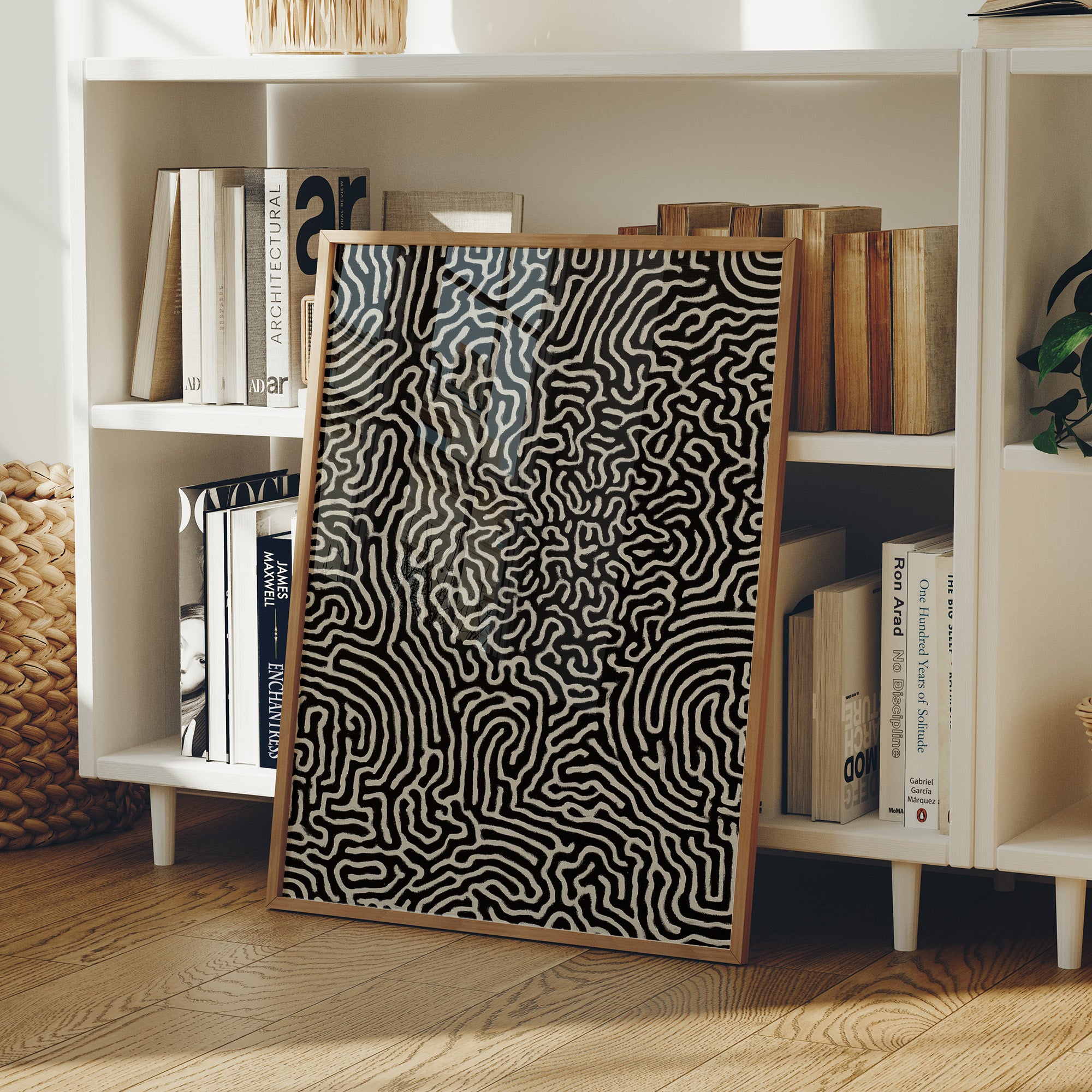Hypnotic patterns weave an intricate dance of black and white, creating a mesmerizing maze of organic curves and flowing lines. The piece pulses with dynamic energy, its serpentine pathways drawing the eye into an endless journey across the canvas, while the warm wooden frame provides an elegant anchor to the abstract composition. This sophisticated piece brings contemporary edge to a curated bookshelf, making a bold statement in a modern home office or reading nook.