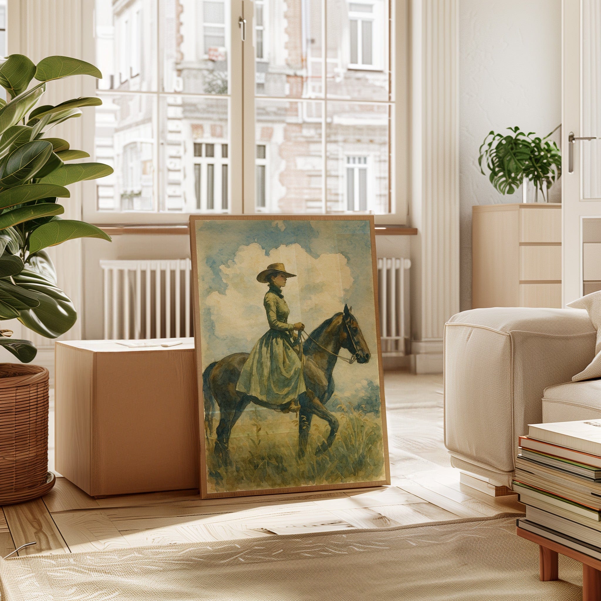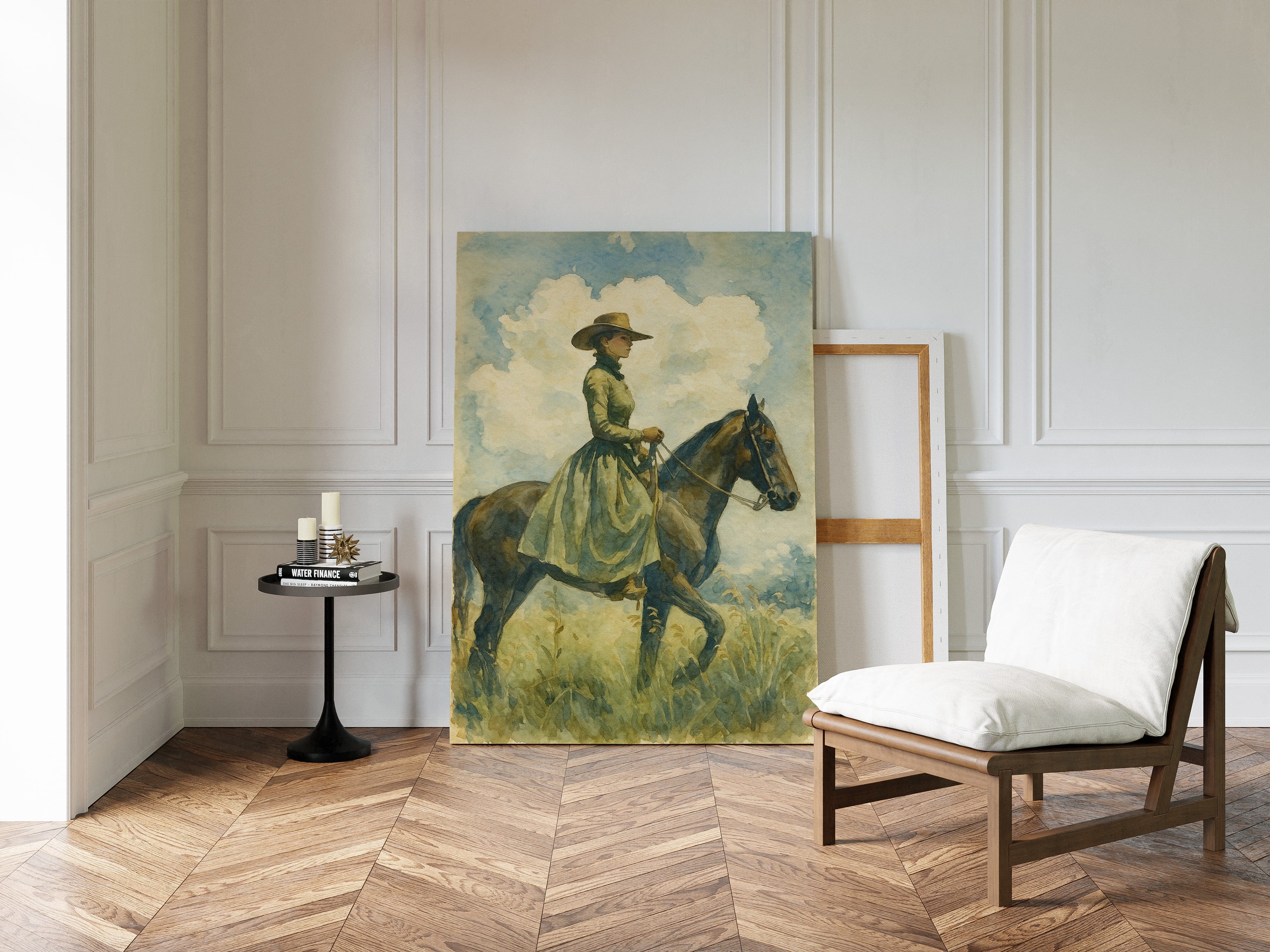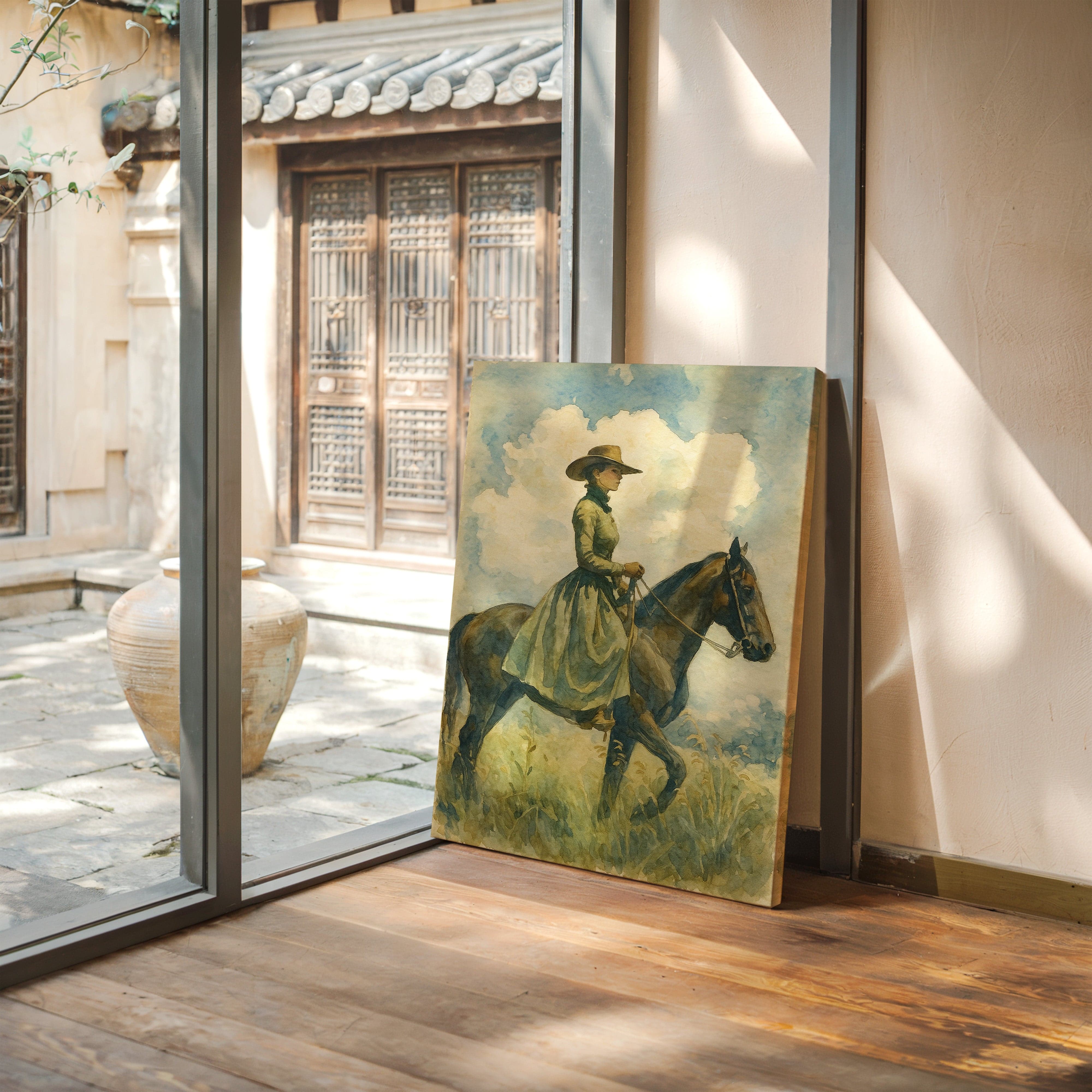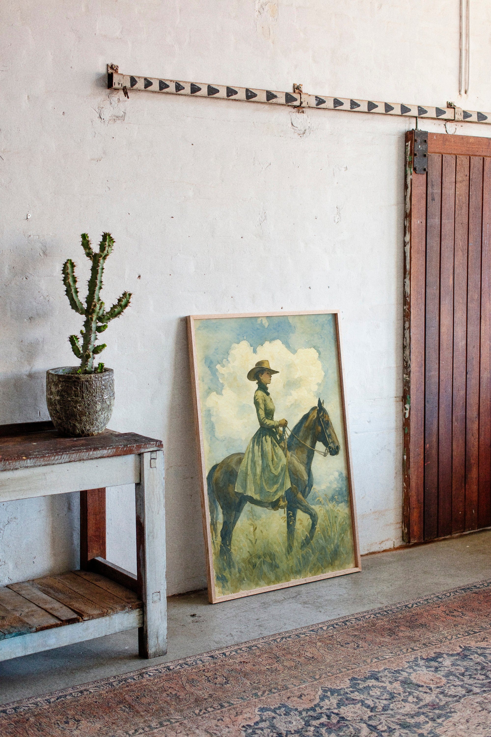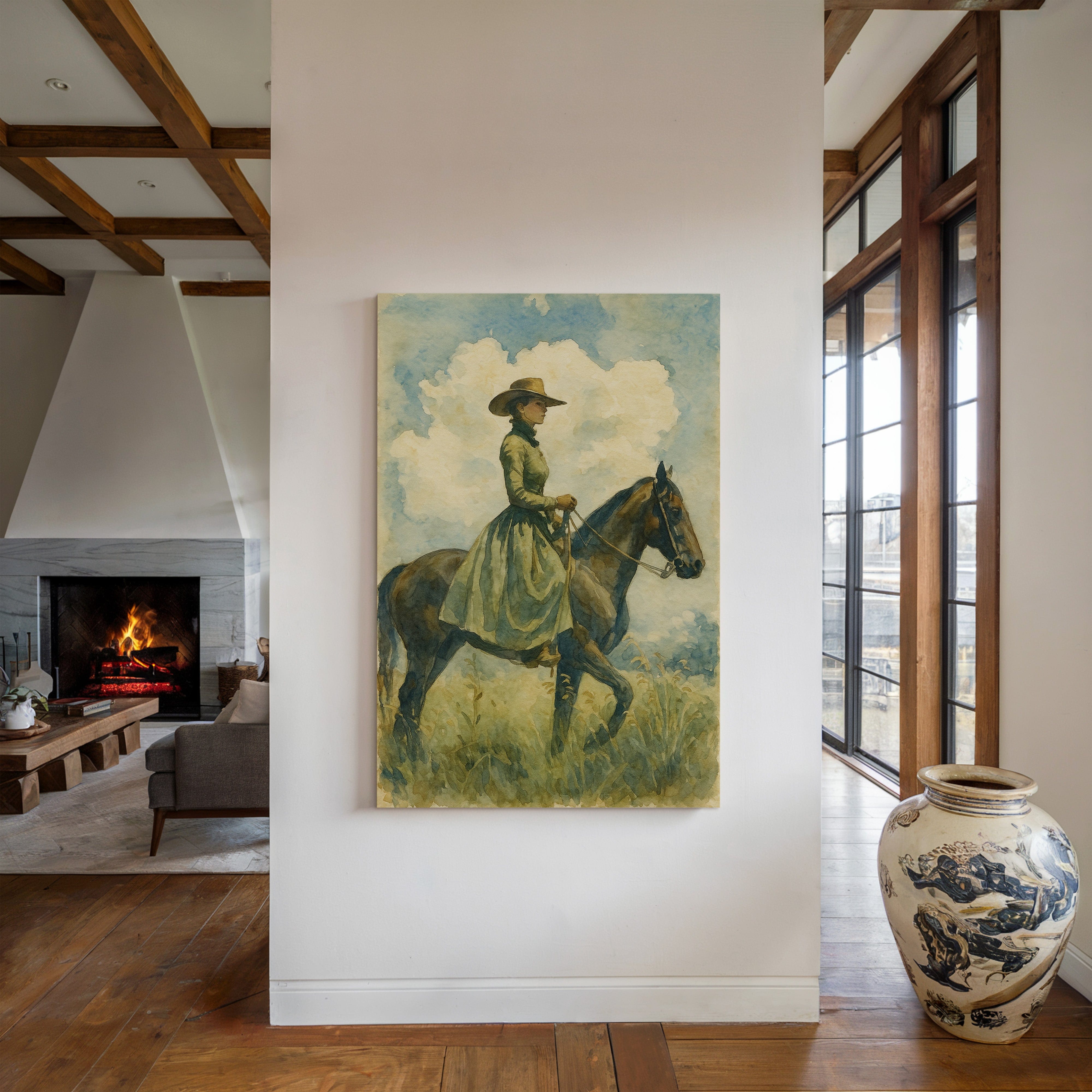 Elegance rides with quiet strength in Lady of the Prairie. This exquisite watercolor artwork captures a poised woman on horseback beneath a billowing sky, evoking the grace and resilience of frontier life. With delicate brushwork and sun-washed tones, this piece brings timeless beauty to any Western, vintage, or nature-inspired space. Ideal for collectors of feminine western art and lovers of watercolor charm.