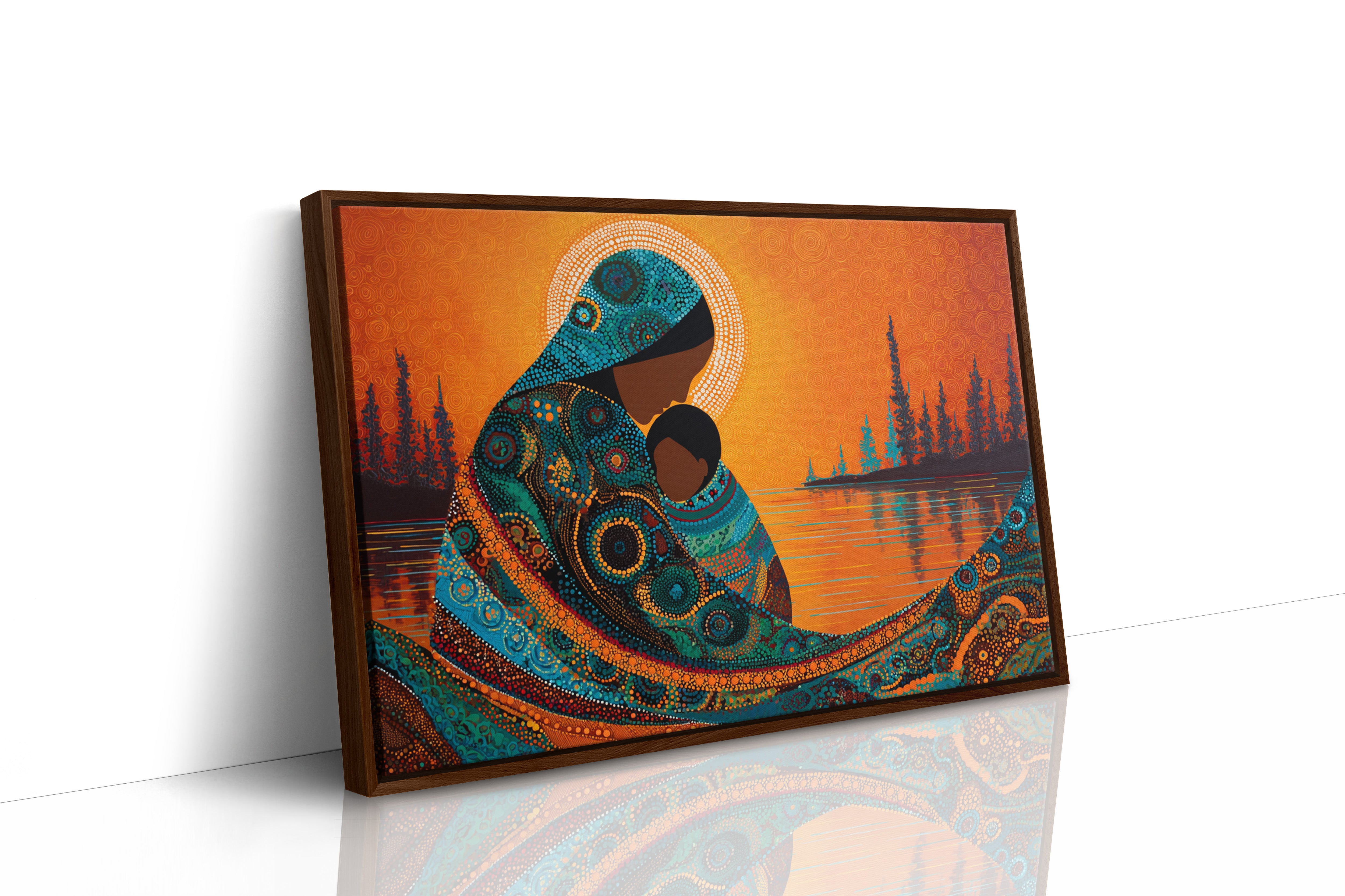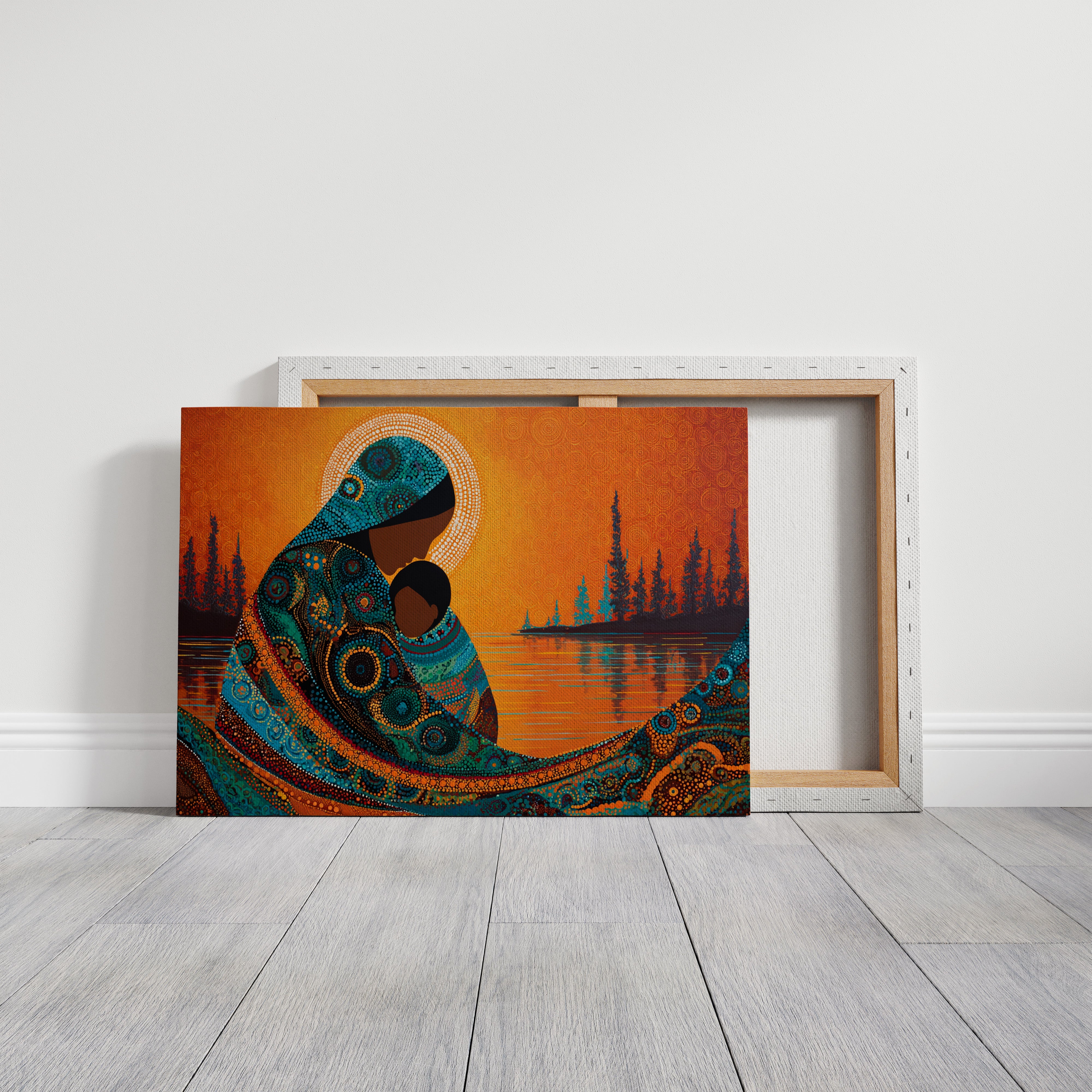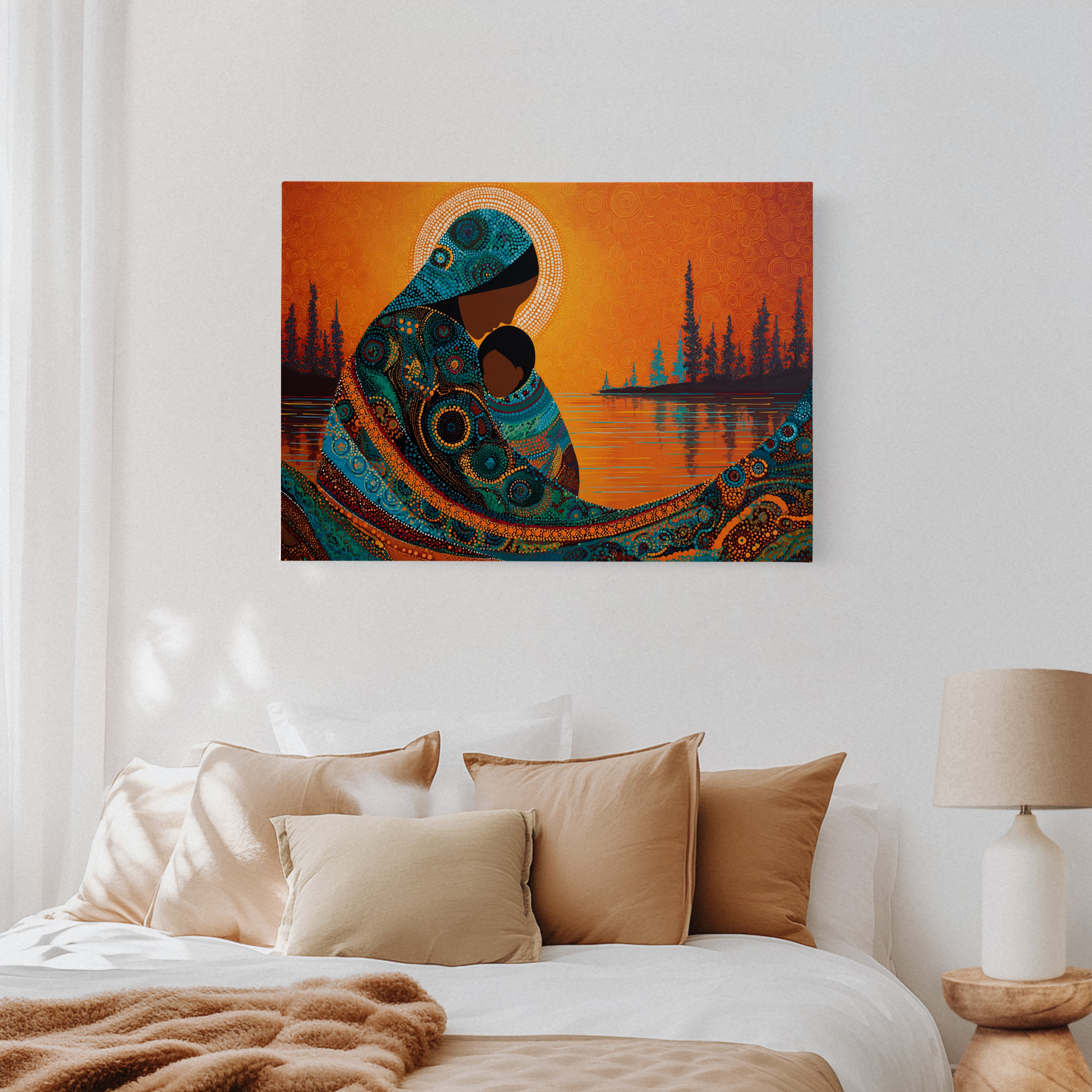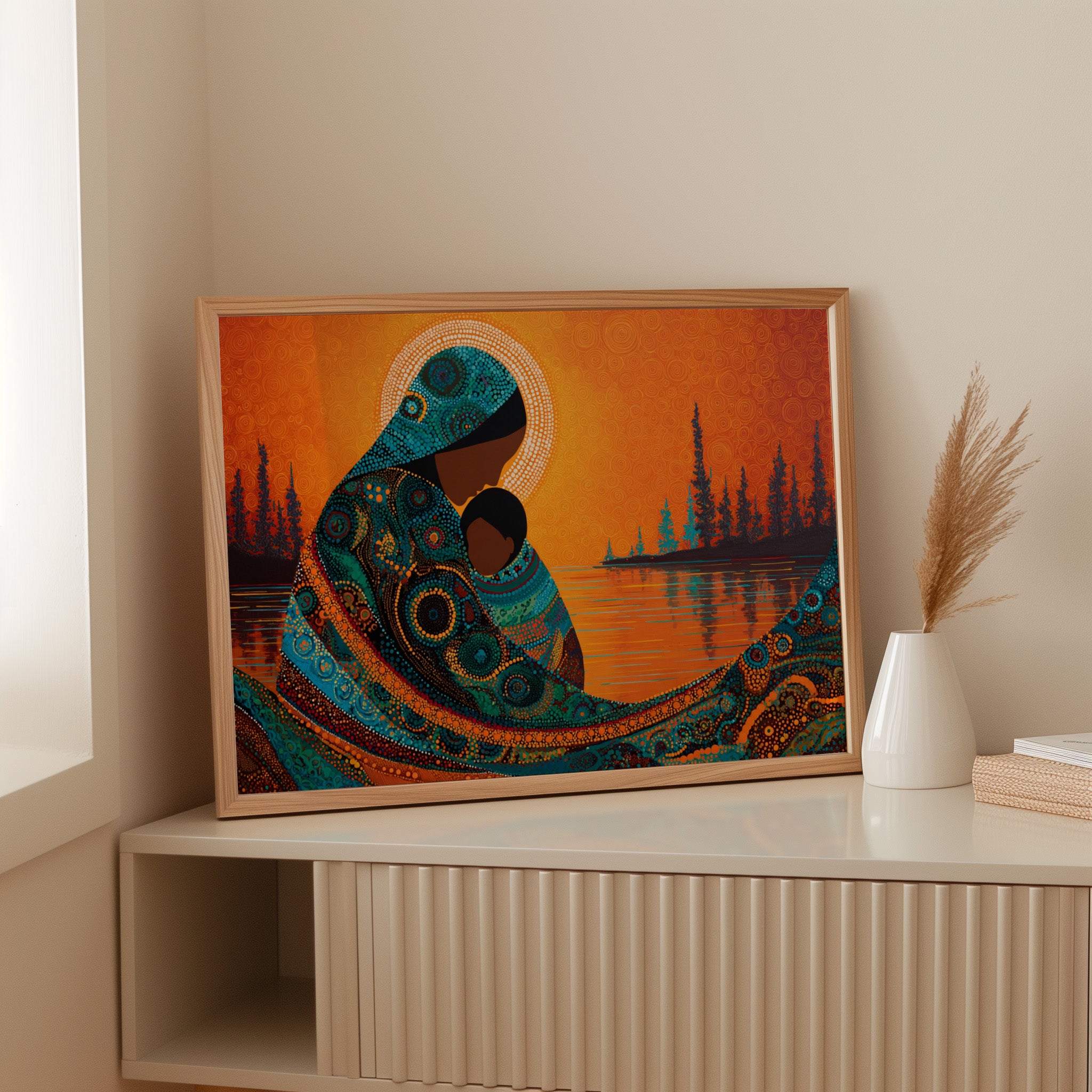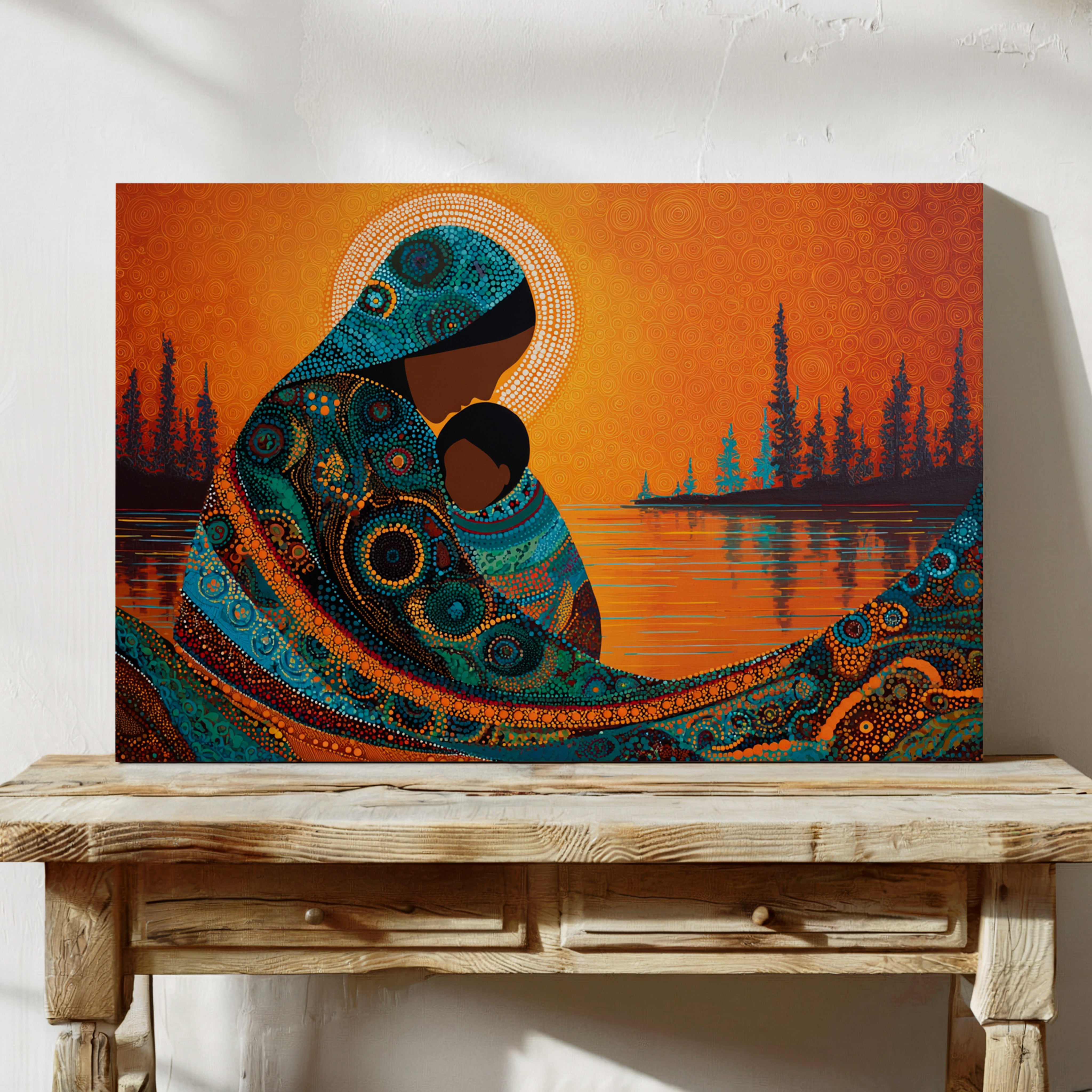 Dotted constellations of turquoise and amber swirl across a protective form, creating a mesmerizing dance of indigenous artistry. The intricate beadwork pattern flows like a living river against the burning orange sky, while silhouetted pines stand sentinel along the shoreline. This piece marries traditional dot painting techniques with contemporary color dynamics, creating a powerful statement about connection and heritage. Perfect for spaces seeking to blend cultural richness with modern design sensibilities.