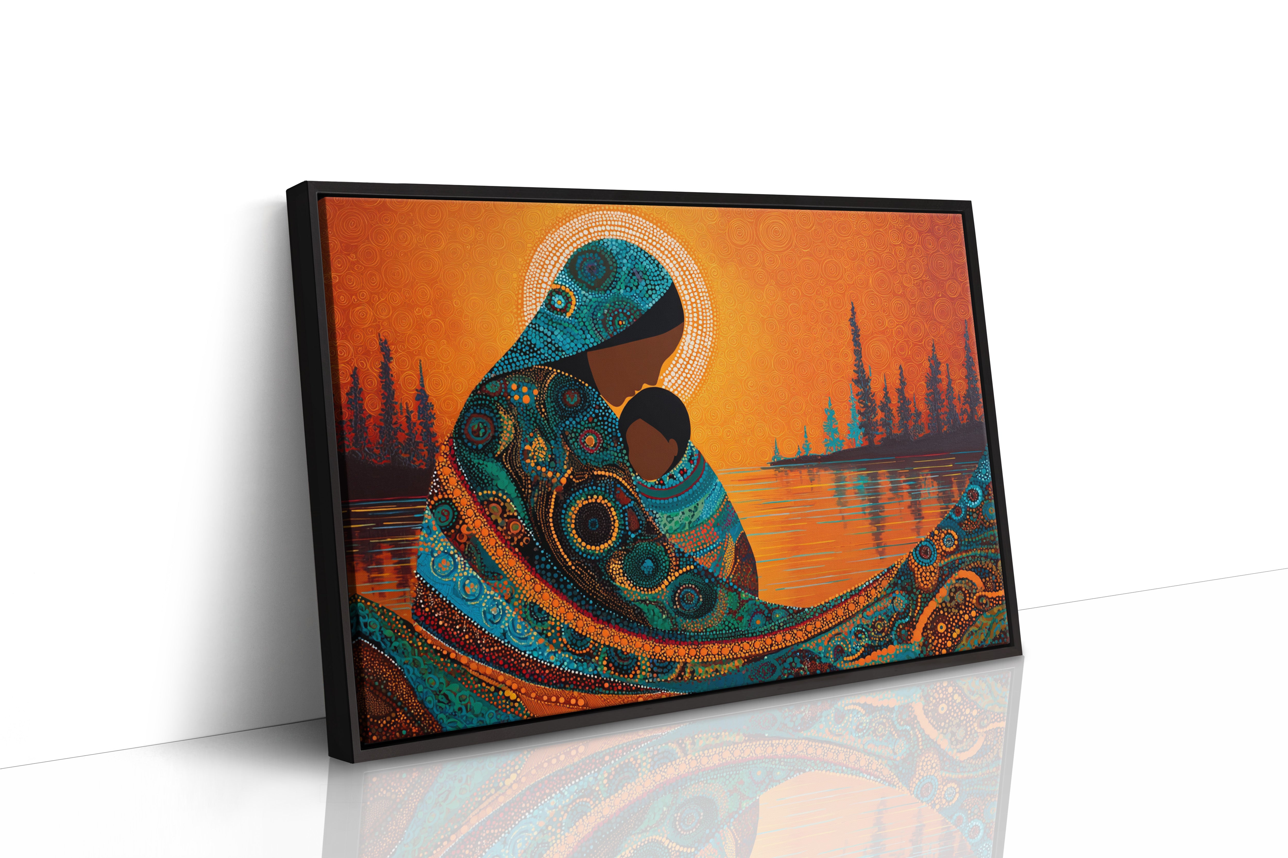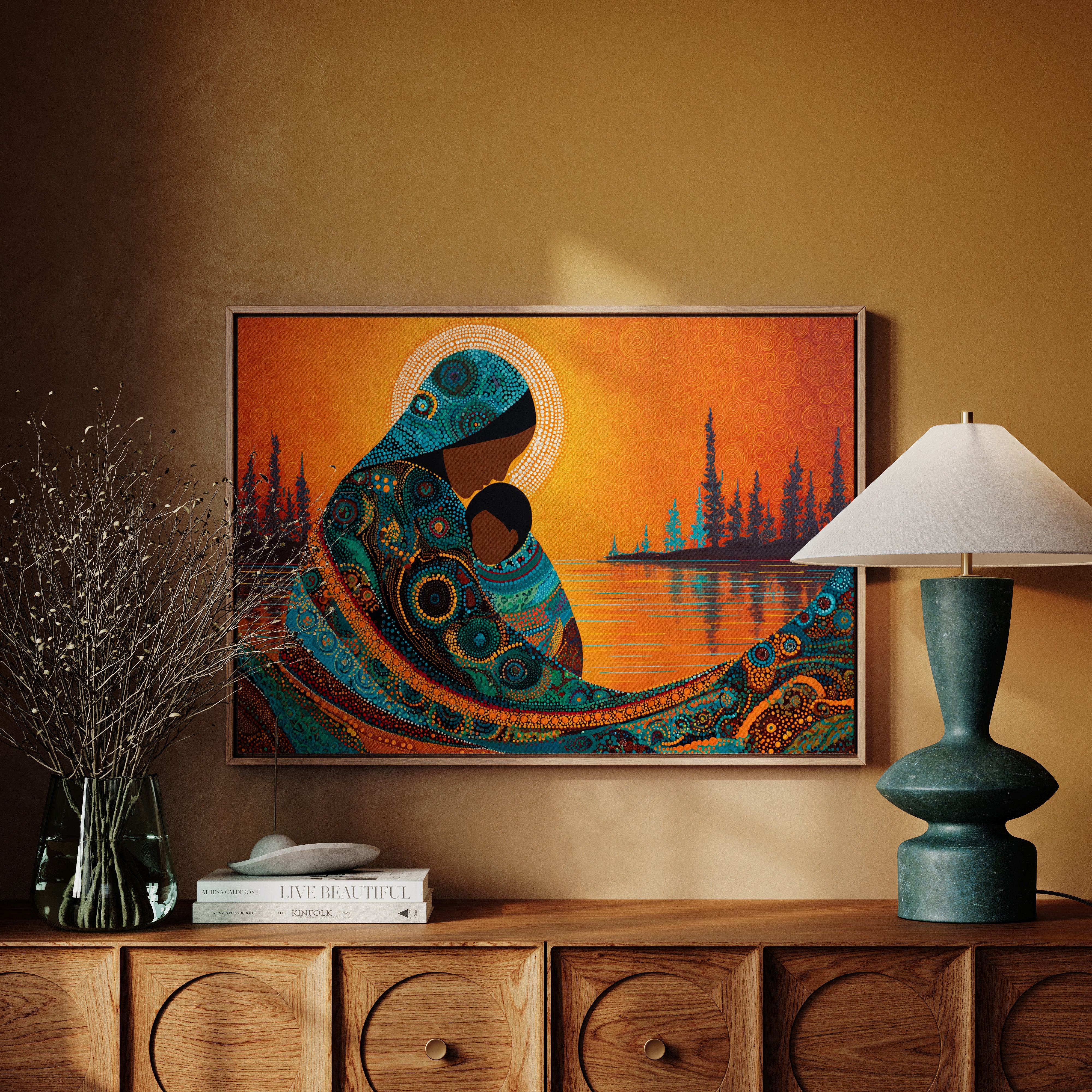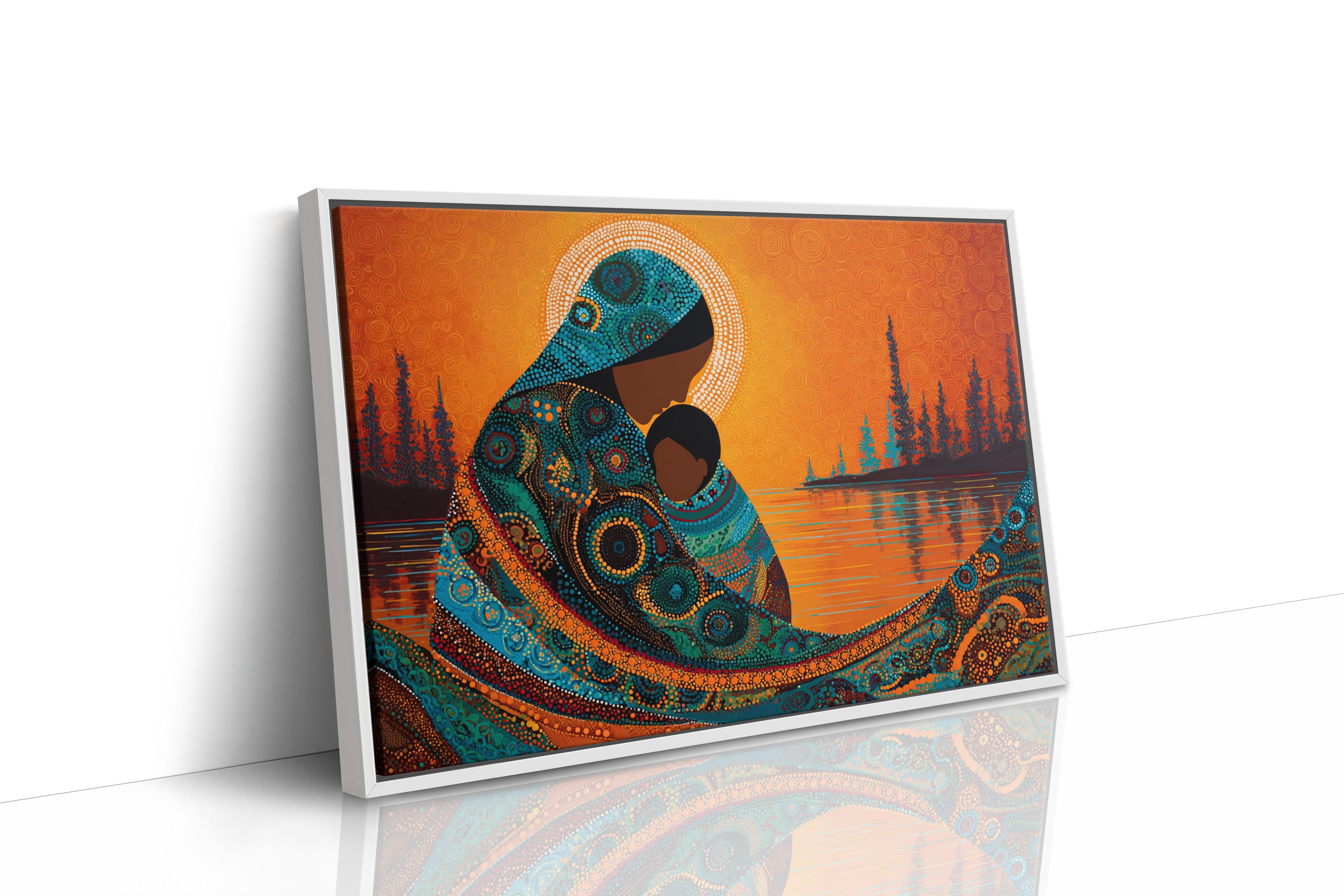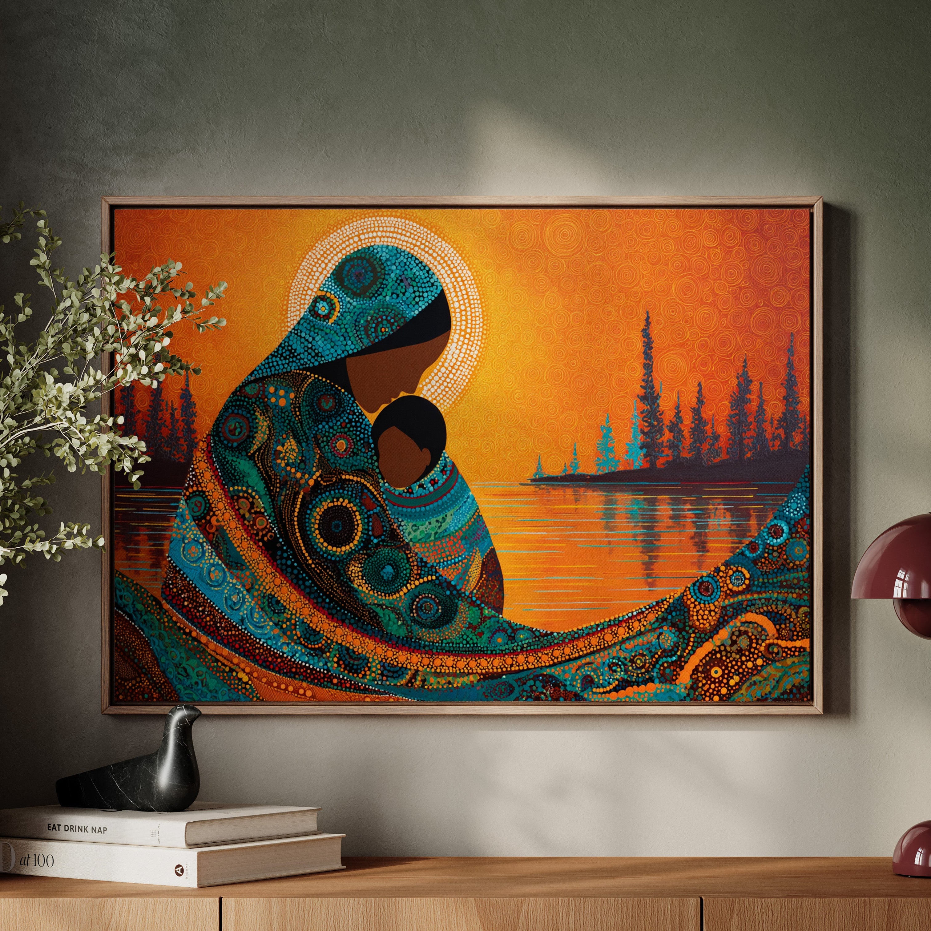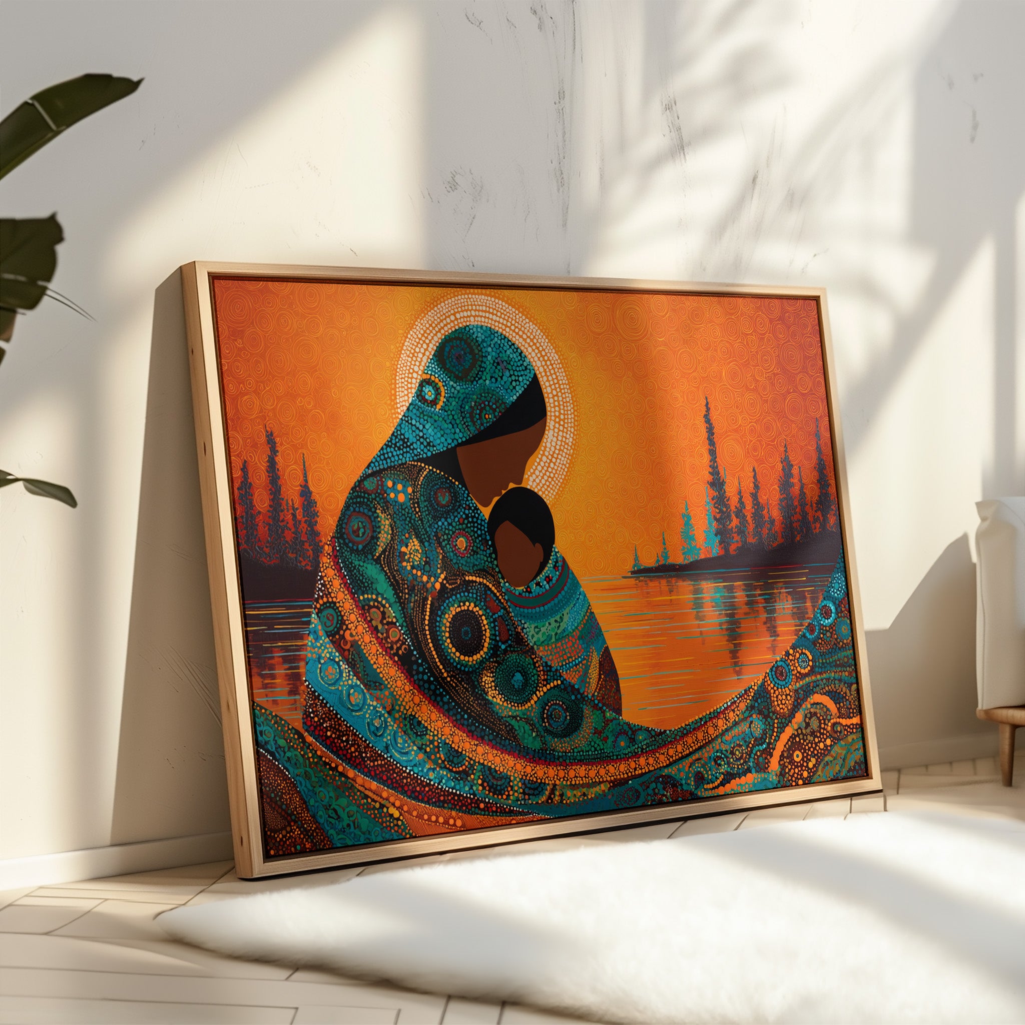 Dotted constellations of turquoise and amber swirl across a protective form, creating a mesmerizing dance of indigenous artistry. The intricate beadwork pattern flows like a living river against the burning orange sky, while silhouetted pines stand sentinel along the shoreline. This piece marries traditional dot painting techniques with contemporary color dynamics, creating a powerful statement about connection and heritage. Perfect for spaces seeking to blend cultural richness with modern design sensibilities.