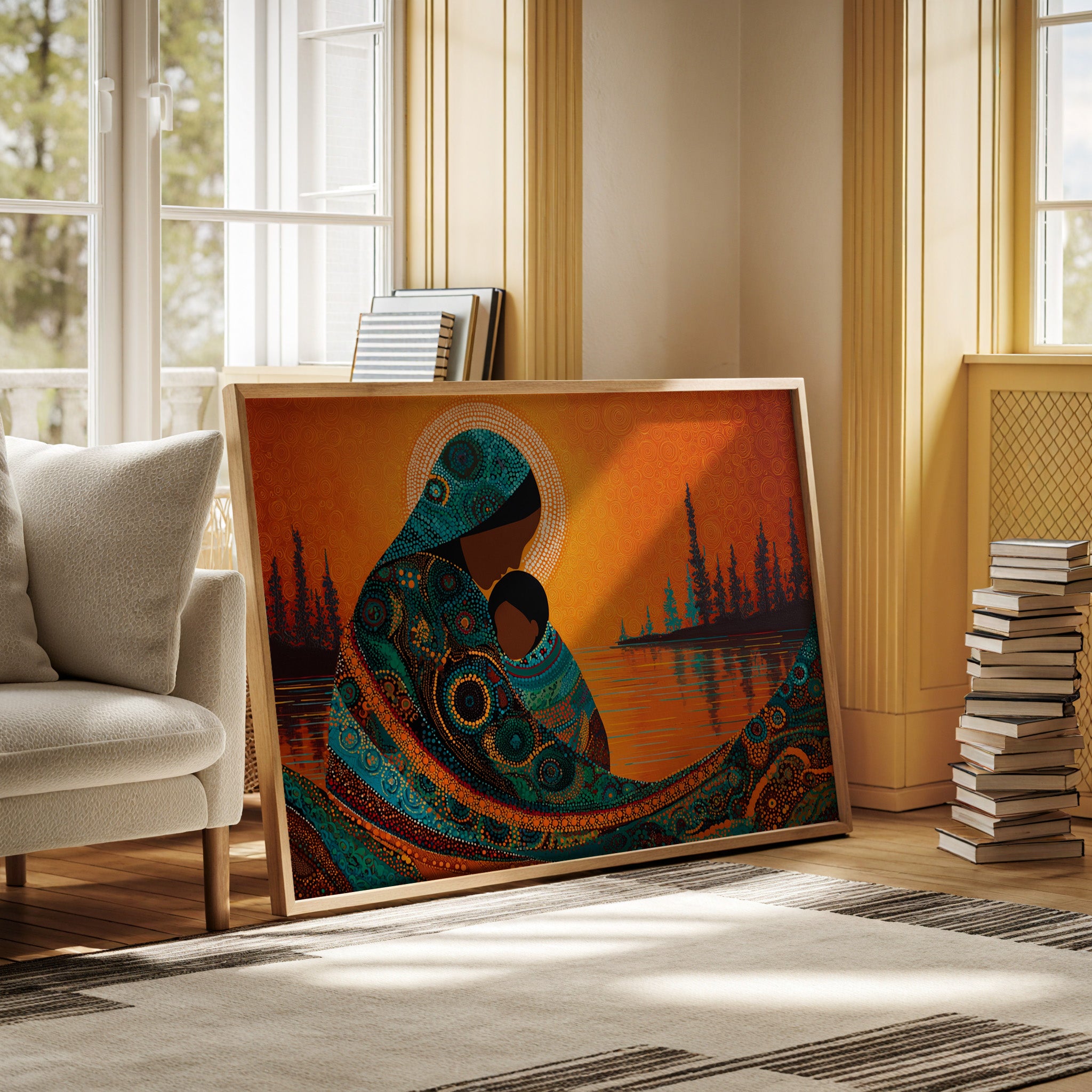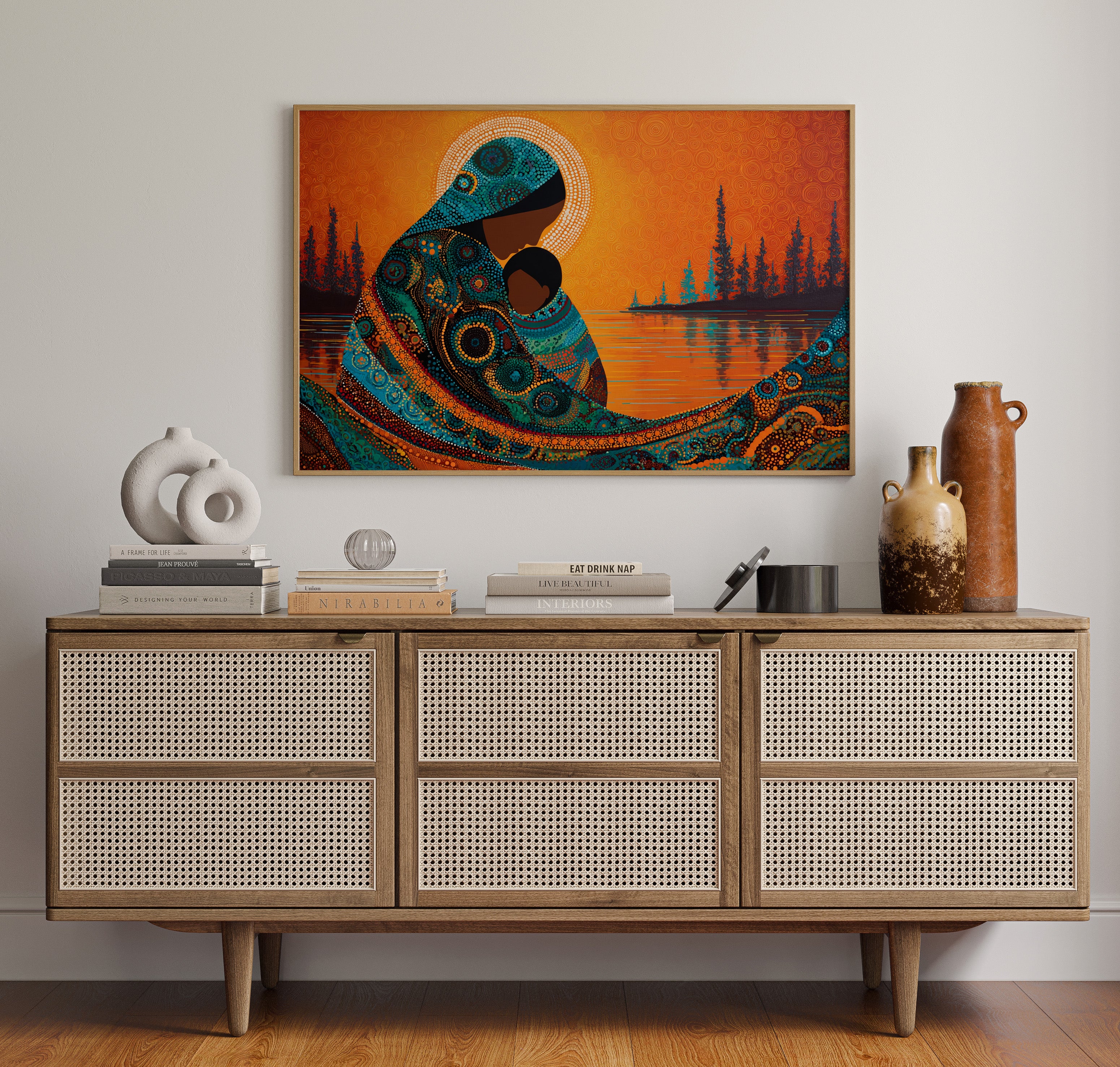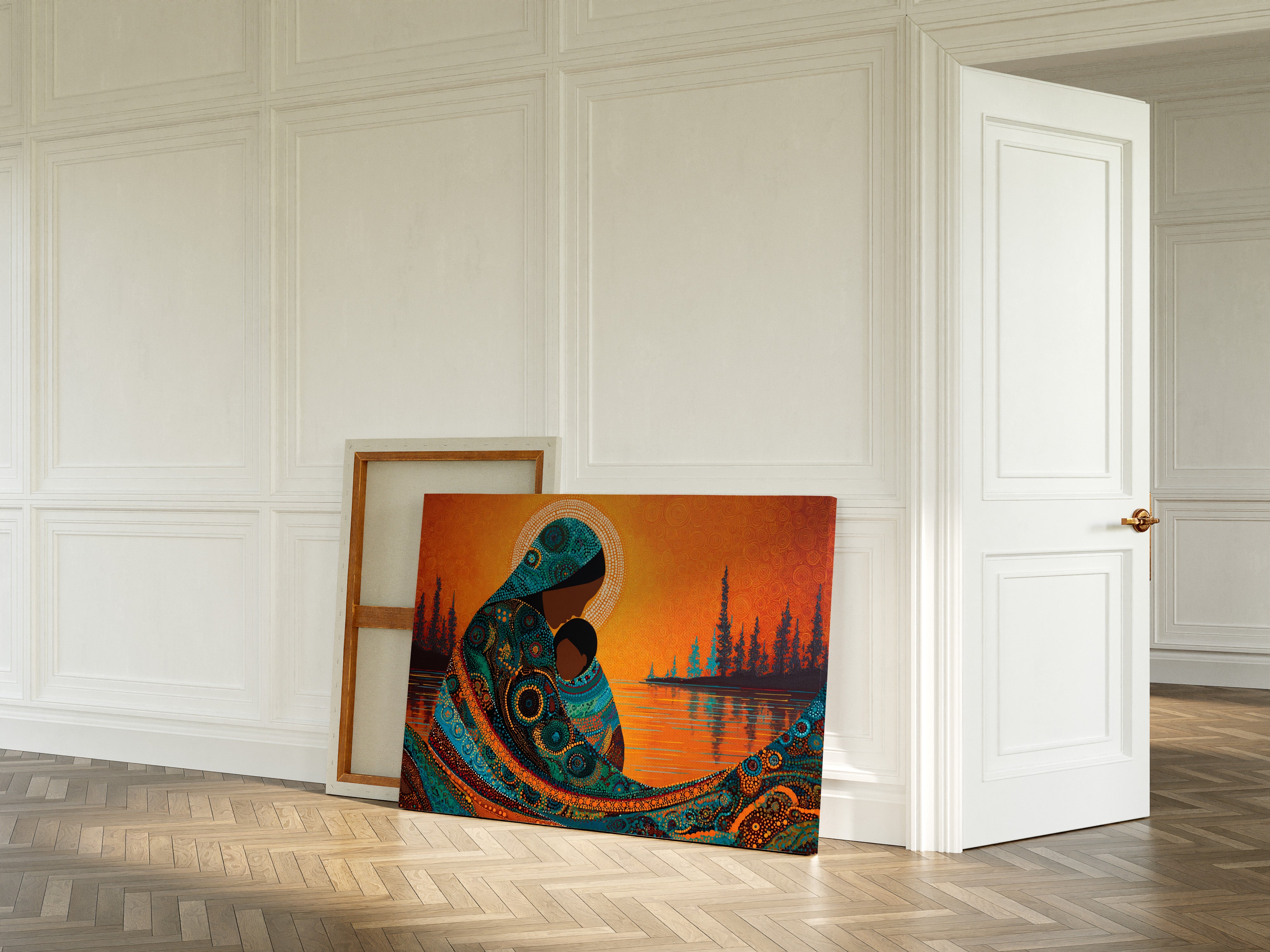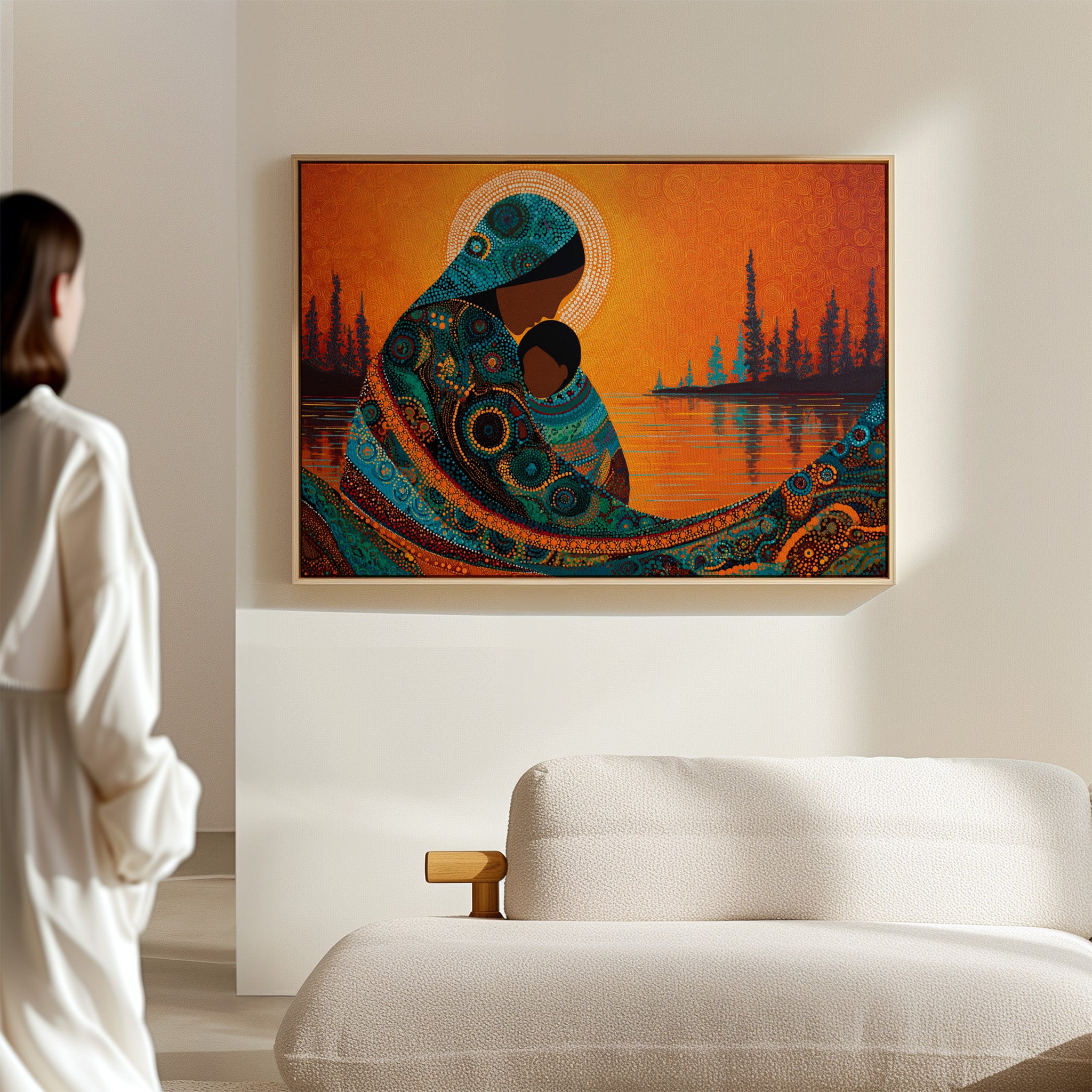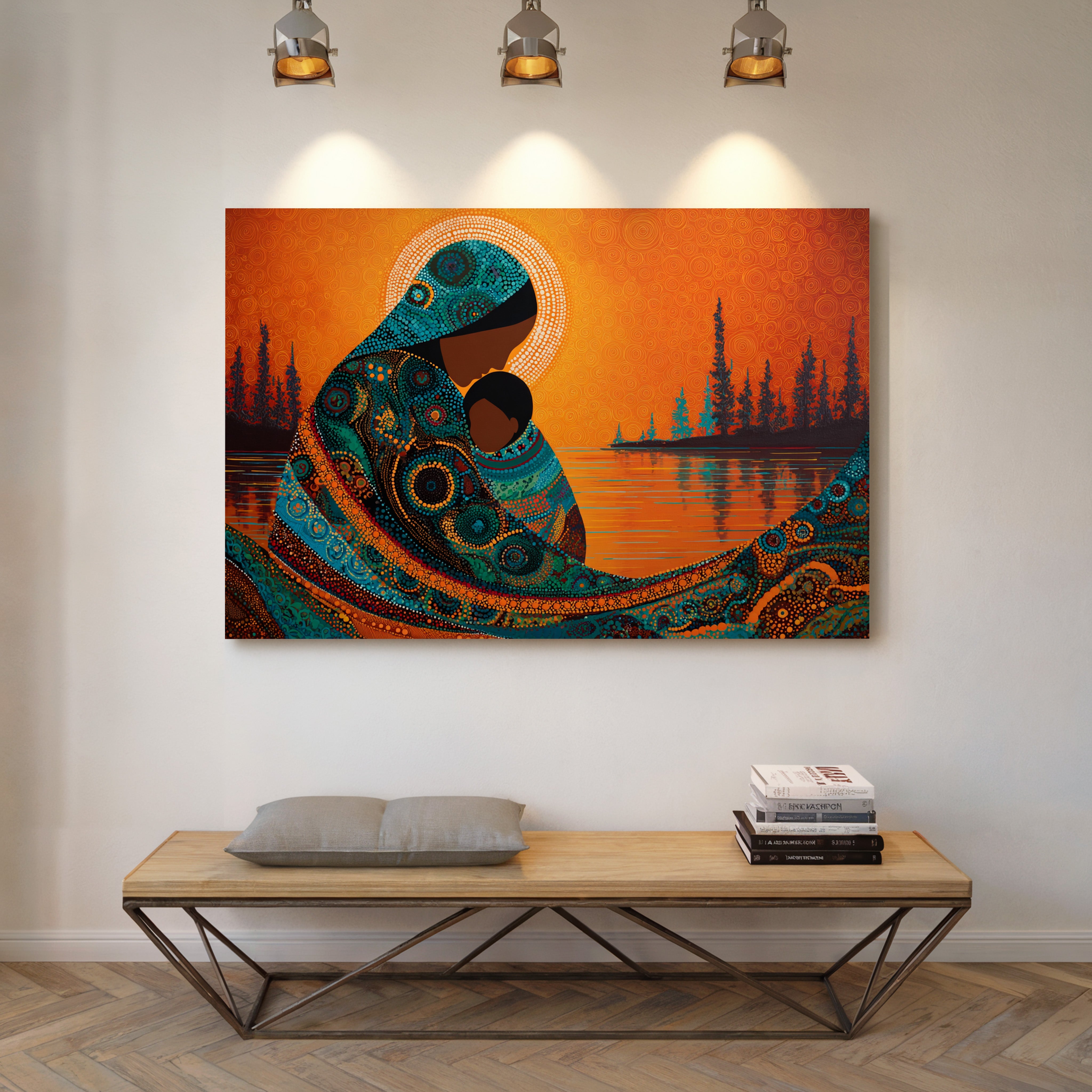 Dotted constellations of turquoise and amber swirl across a protective form, creating a mesmerizing dance of indigenous artistry. The intricate beadwork pattern flows like a living river against the burning orange sky, while silhouetted pines stand sentinel along the shoreline. This piece marries traditional dot painting techniques with contemporary color dynamics, creating a powerful statement about connection and heritage. Perfect for spaces seeking to blend cultural richness with modern design sensibilities.