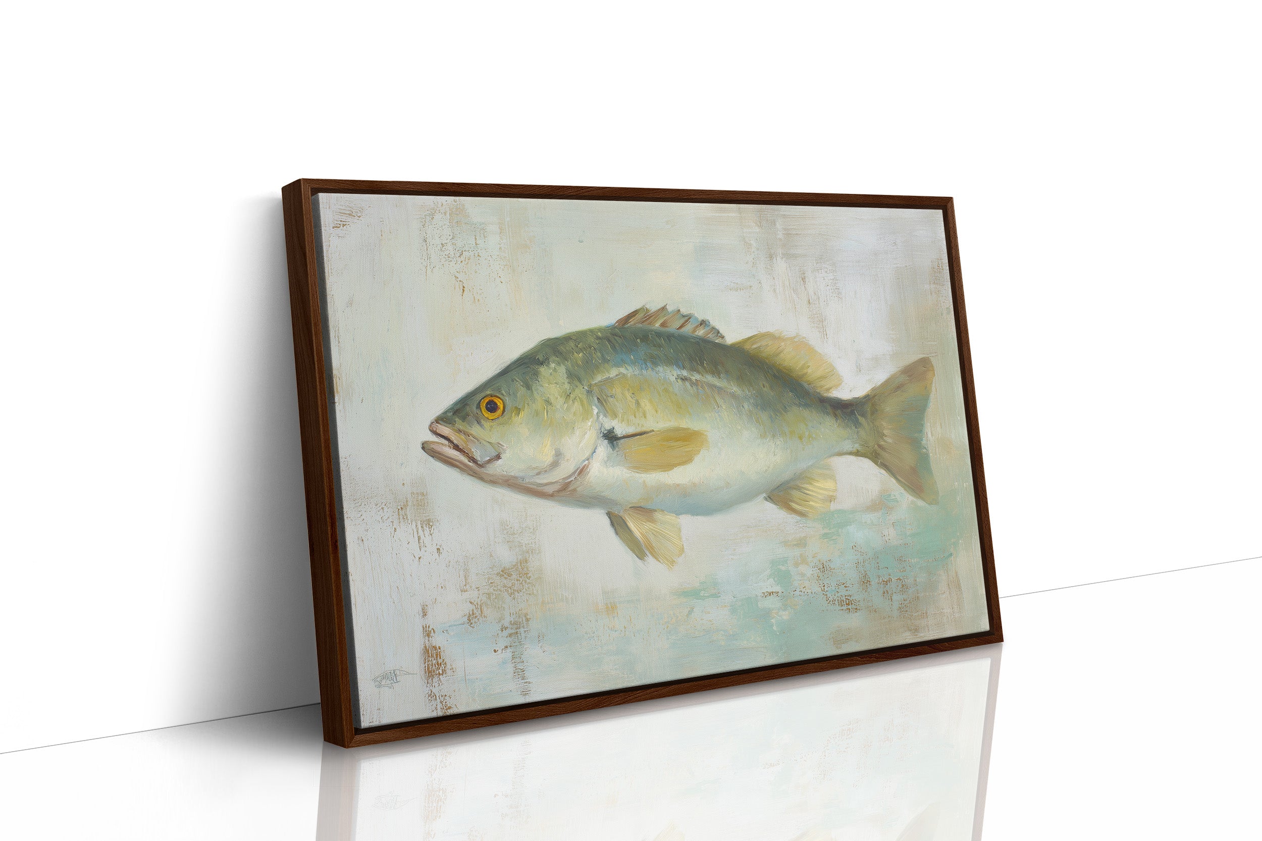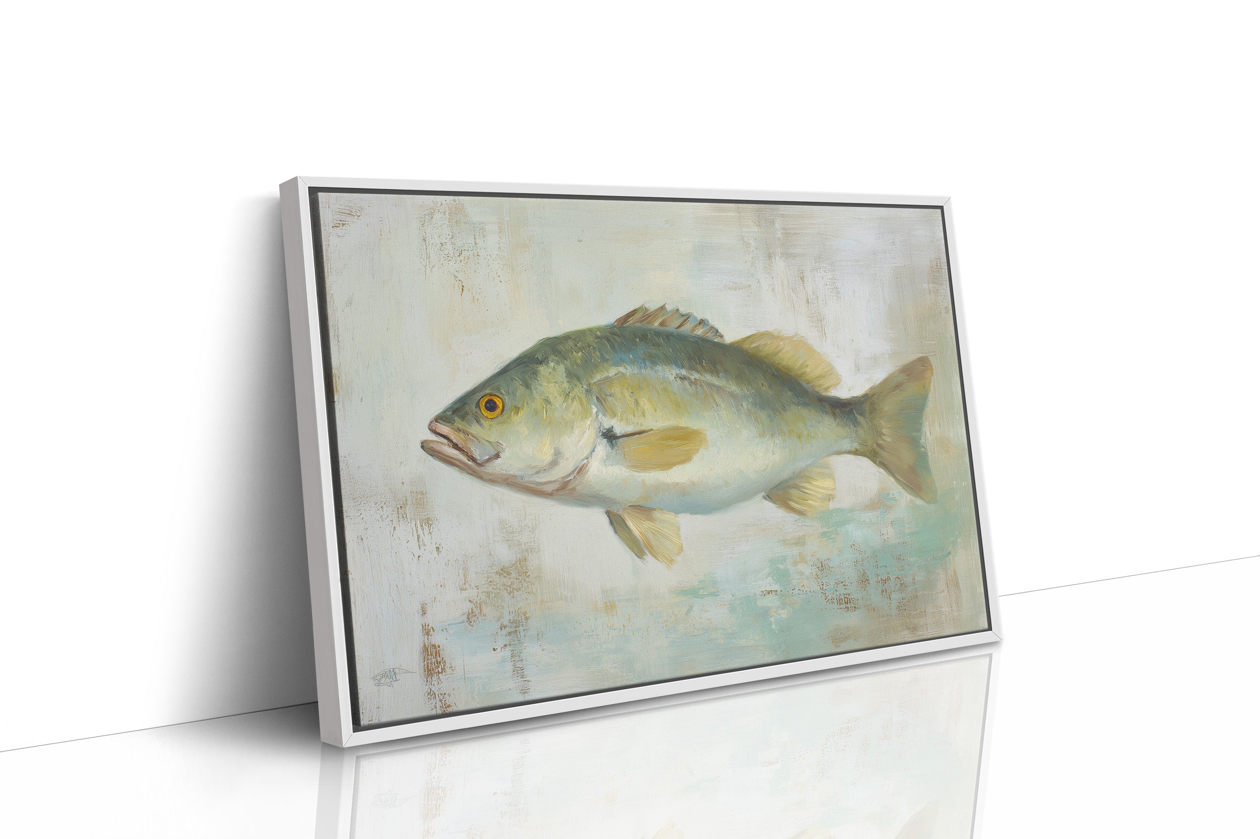 A solitary bass hovers against a weathered backdrop of soft aqua and cream, its golden eye capturing the light like a remembered summer afternoon. The textured painting balances the raw vitality of the fish with delicate brushwork that suggests rippling water and dappled sunlight. This contemplative piece brings the tranquility of lake waters into a serene interior setting.