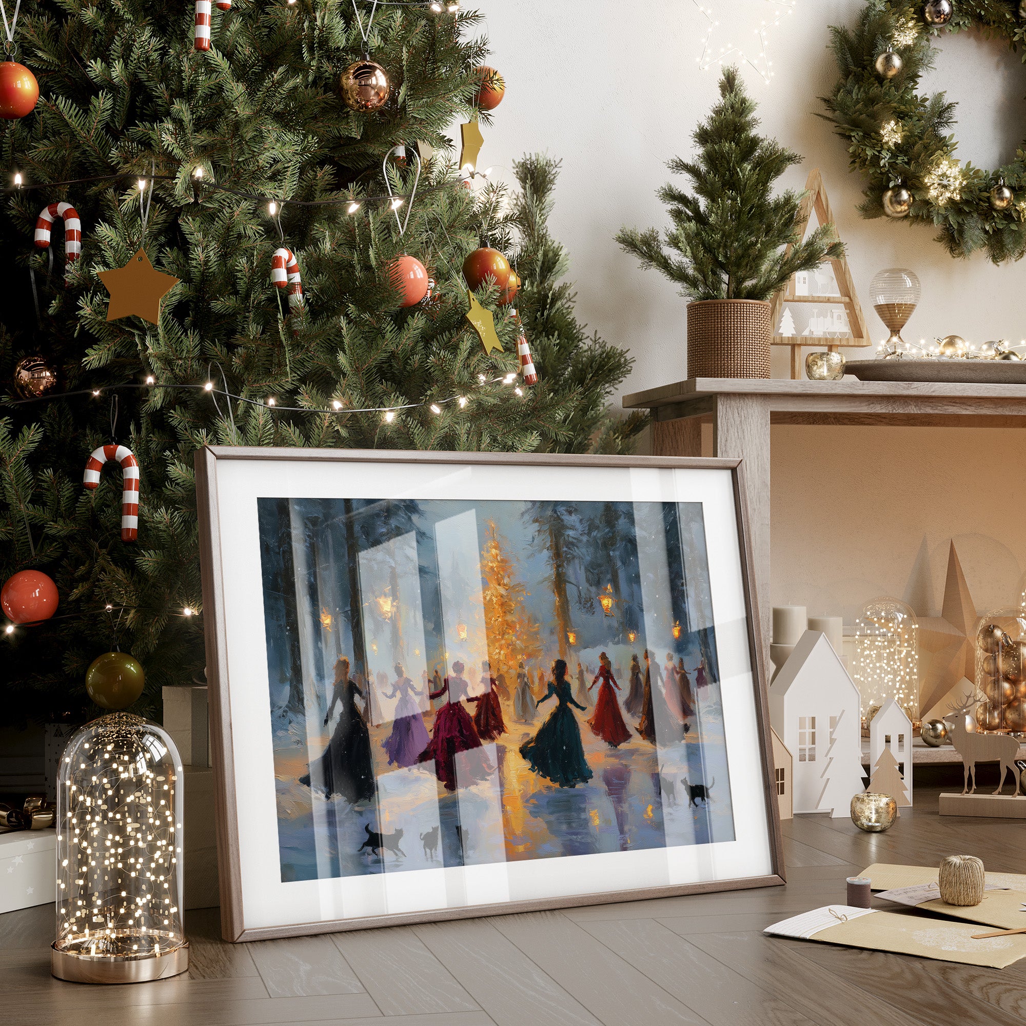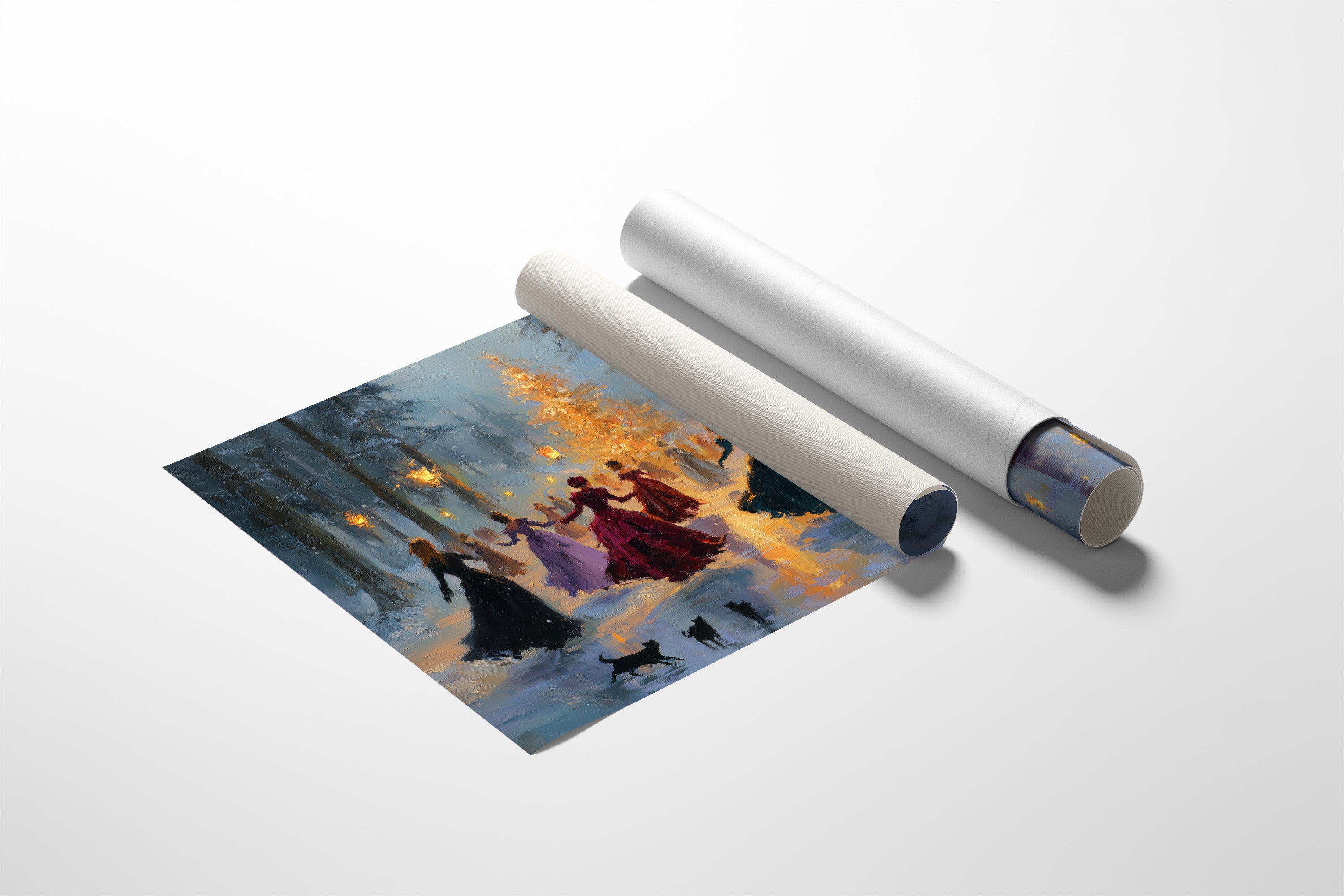 Gowned figures circle a glowing tree beneath drifting snow, lantern light flickering across the frozen ground as black cats weave through the scene. Part of our Enchanted Winter collection, this luminous piece brings storybook warmth to living rooms, bedrooms, or holiday displays, printed on archival fine art paper with rich pigment inks and crafted to order with care.