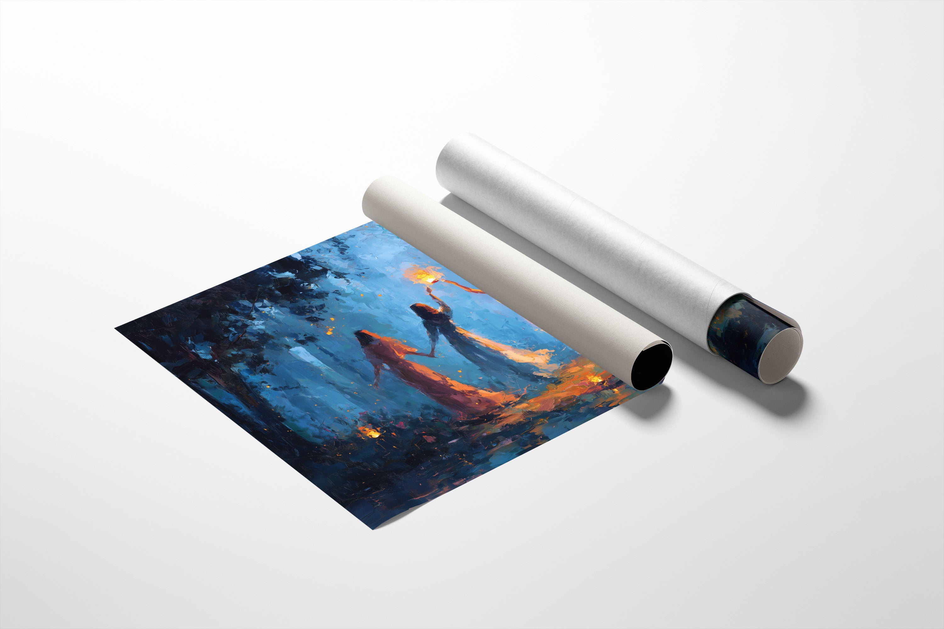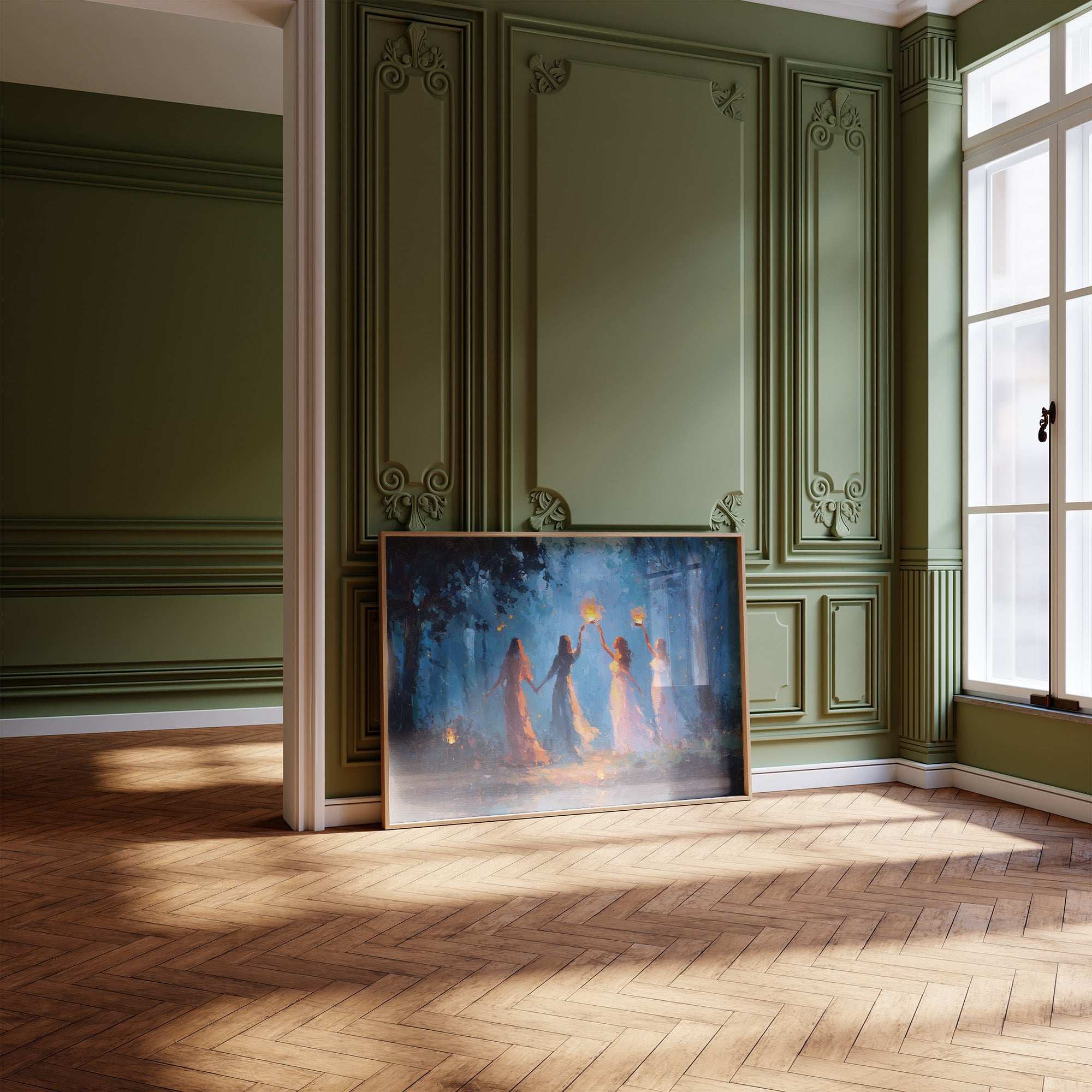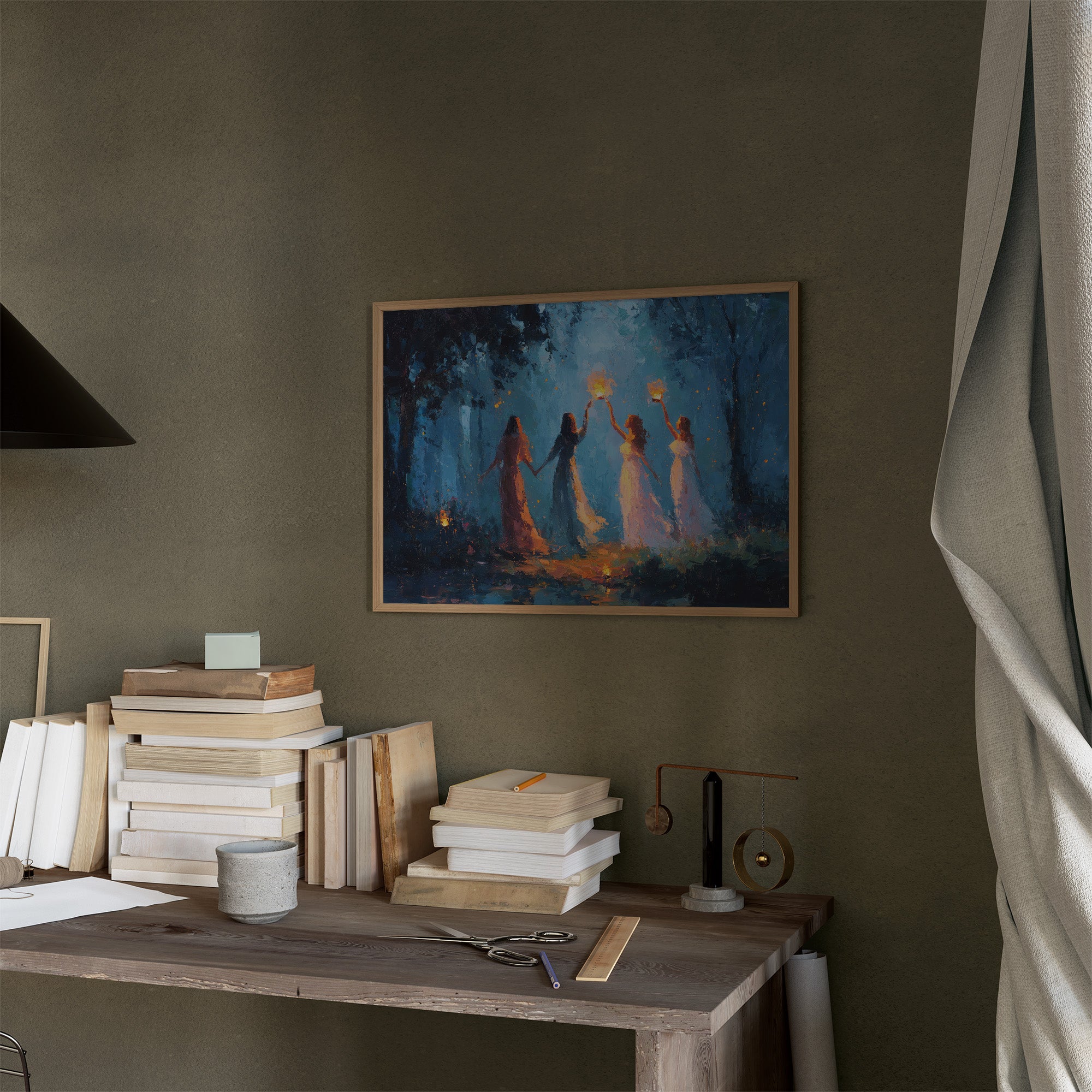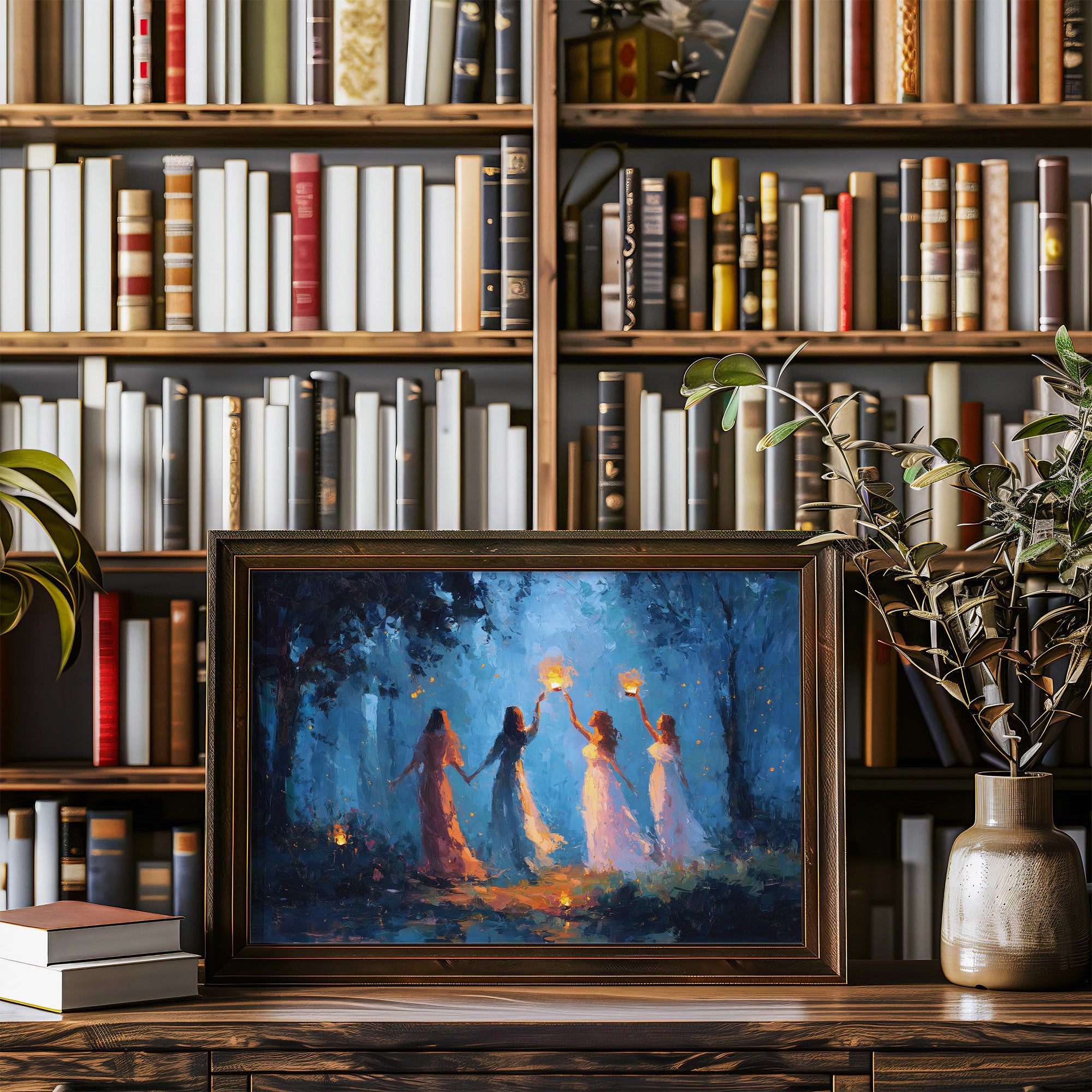 Warm golden light radiates from lanterns held aloft, cutting through the mystical blue haze of dusk. Four figures move in graceful unison through the forest, their flowing dresses catching the glow like petals of fire against the cool darkness. The impressionistic brushstrokes create a dreamlike quality, blurring the boundary between reality and enchantment, while the contrast of warm oranges against deep blues evokes a sense of ritual and celebration. This piece brings a touch of magical realism to a study, library, or meditation space where stories and imagination flourish.