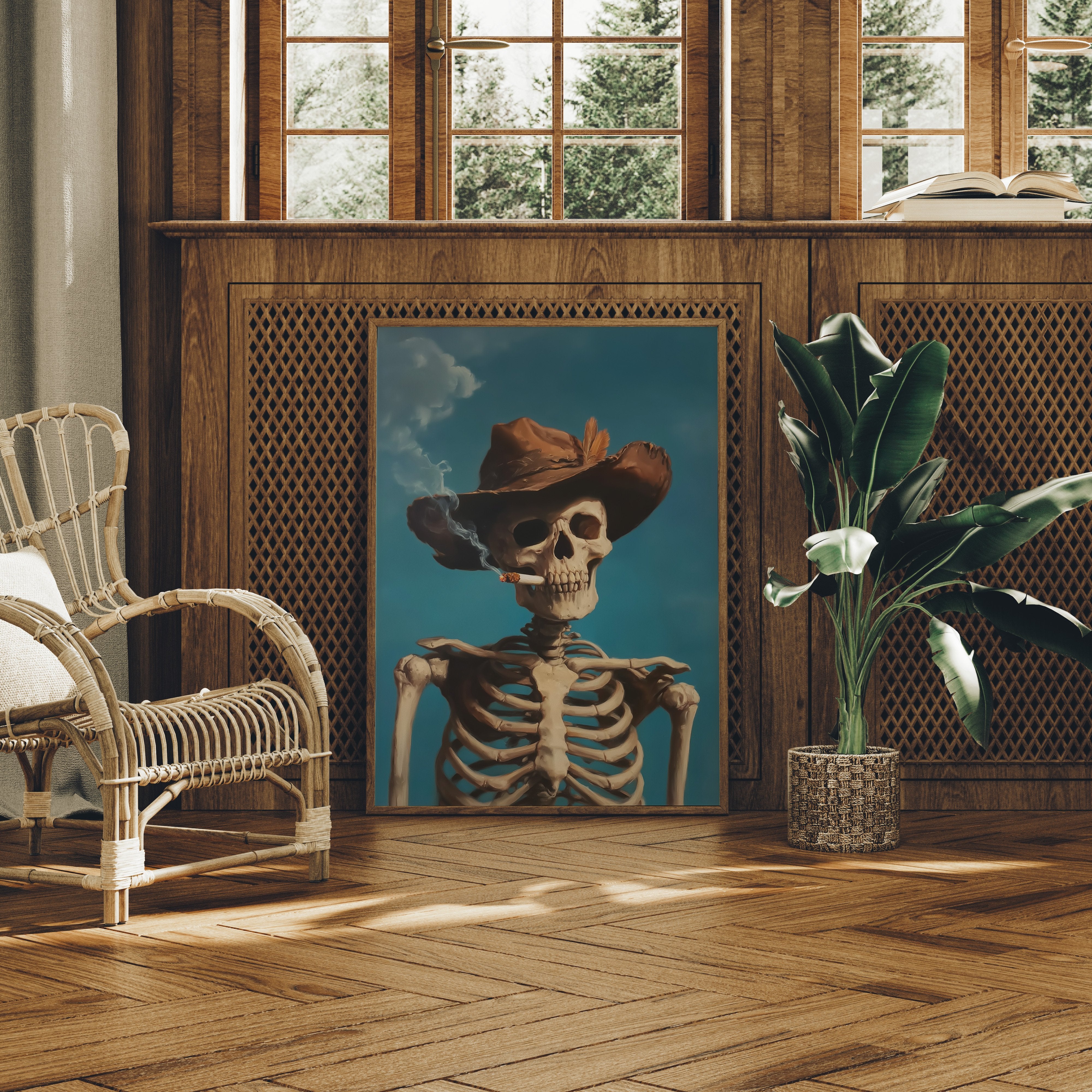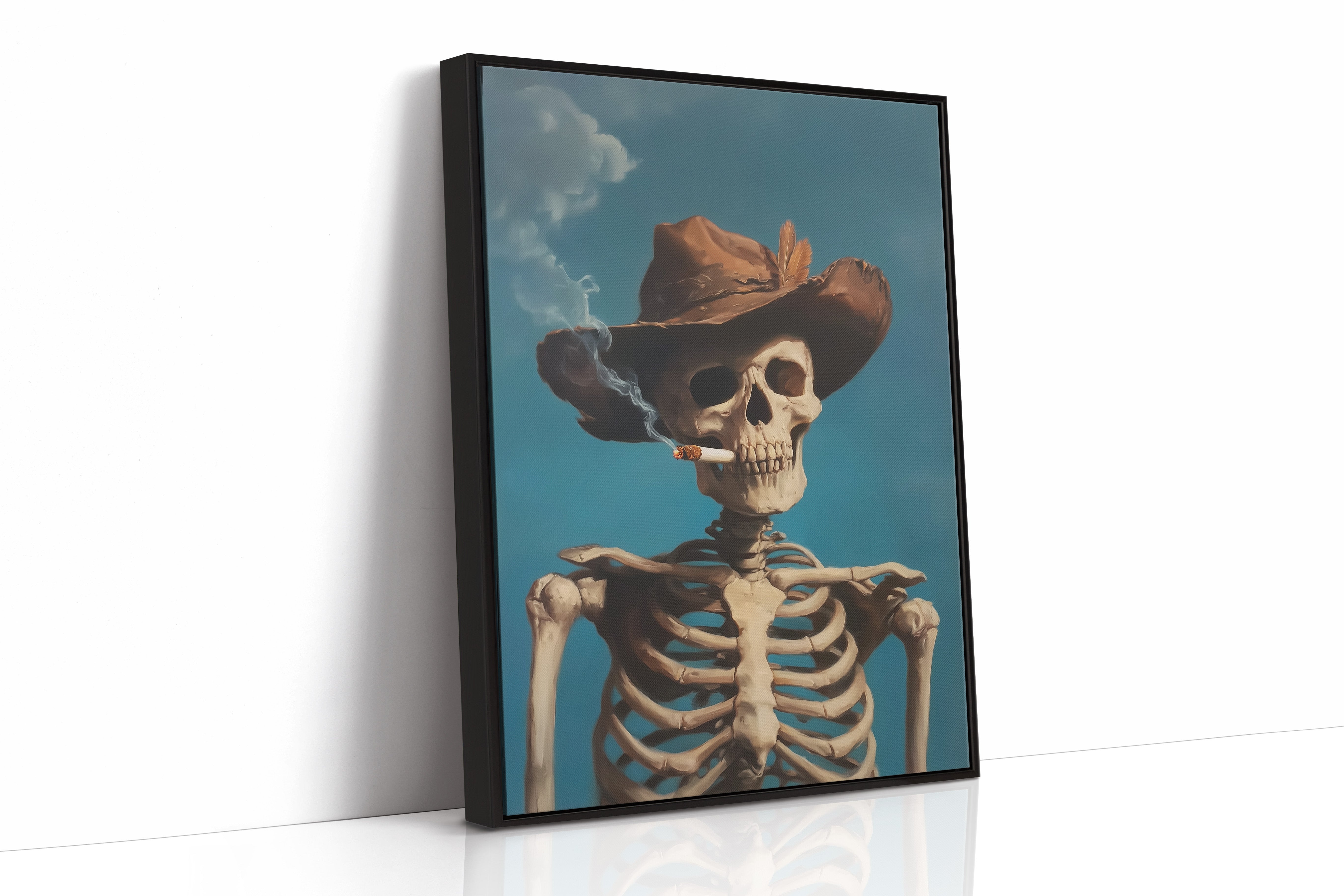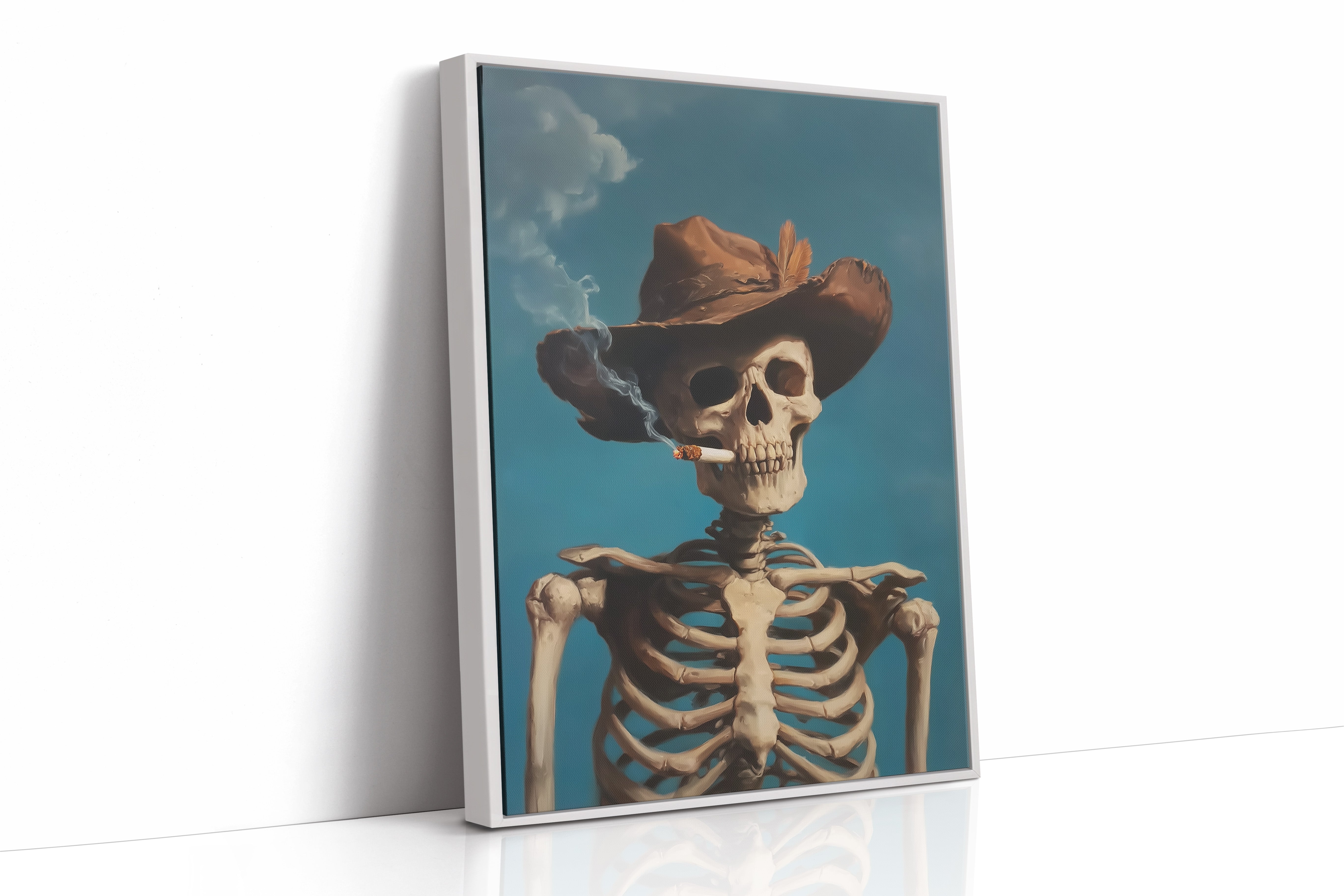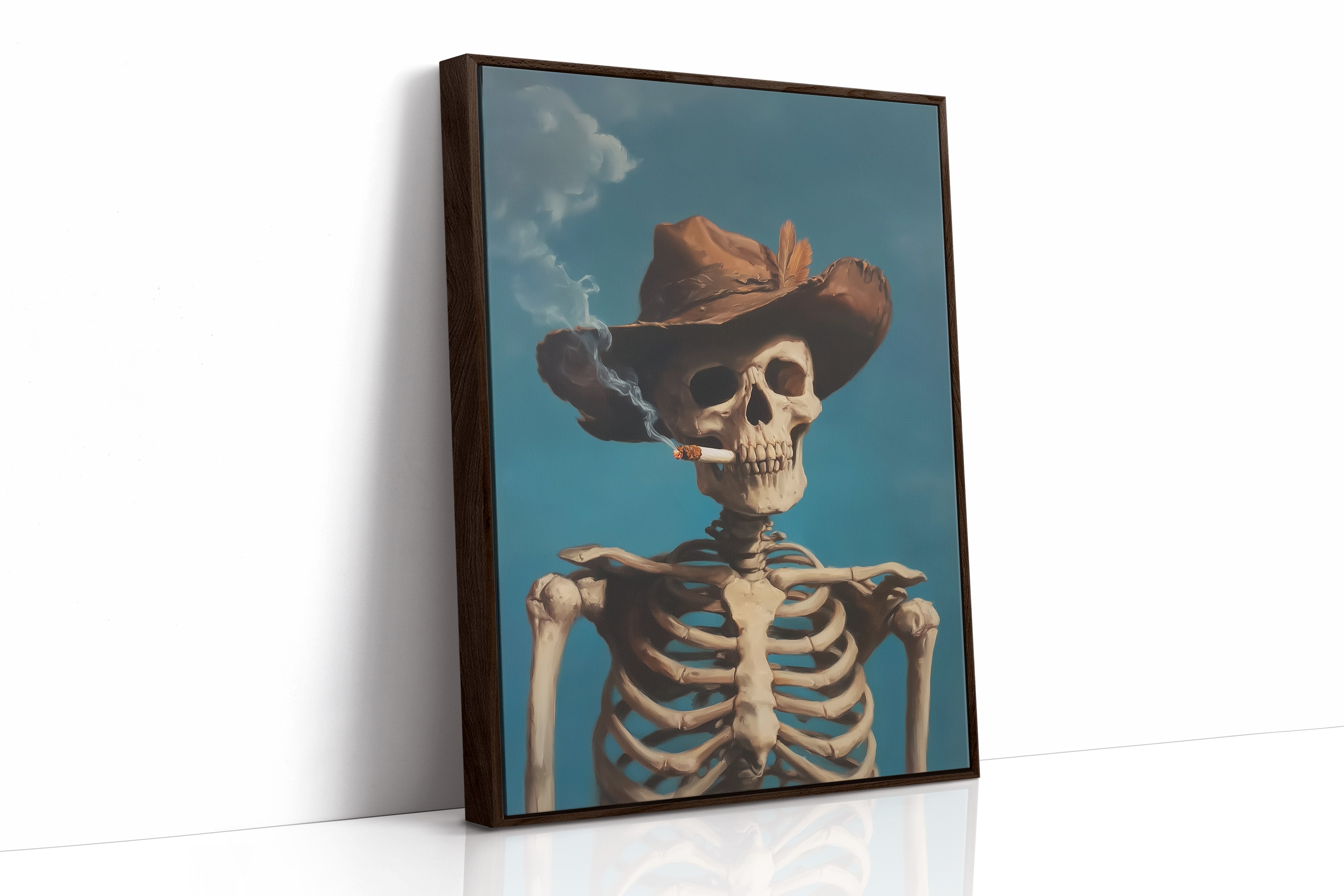 A weathered cowboy skull takes one final drag, wisps of smoke curling lazily against a turquoise sky. This piece from our Contemporary collection merges Western nostalgia with dark humor and modern pop art sensibilities. The rich brown leather hat perched atop bleached bone creates a striking contrast against the vibrant backdrop, while the burning cigarette adds an element of surreal vitality to the macabre subject. The composition plays with themes of mortality and Americana, finding beauty in the intersection of life and death. Perfect for adding an edge of sophisticated rebellion to a home office or creative studio space. Each viewing reveals new details in this meditation on time and transformation.