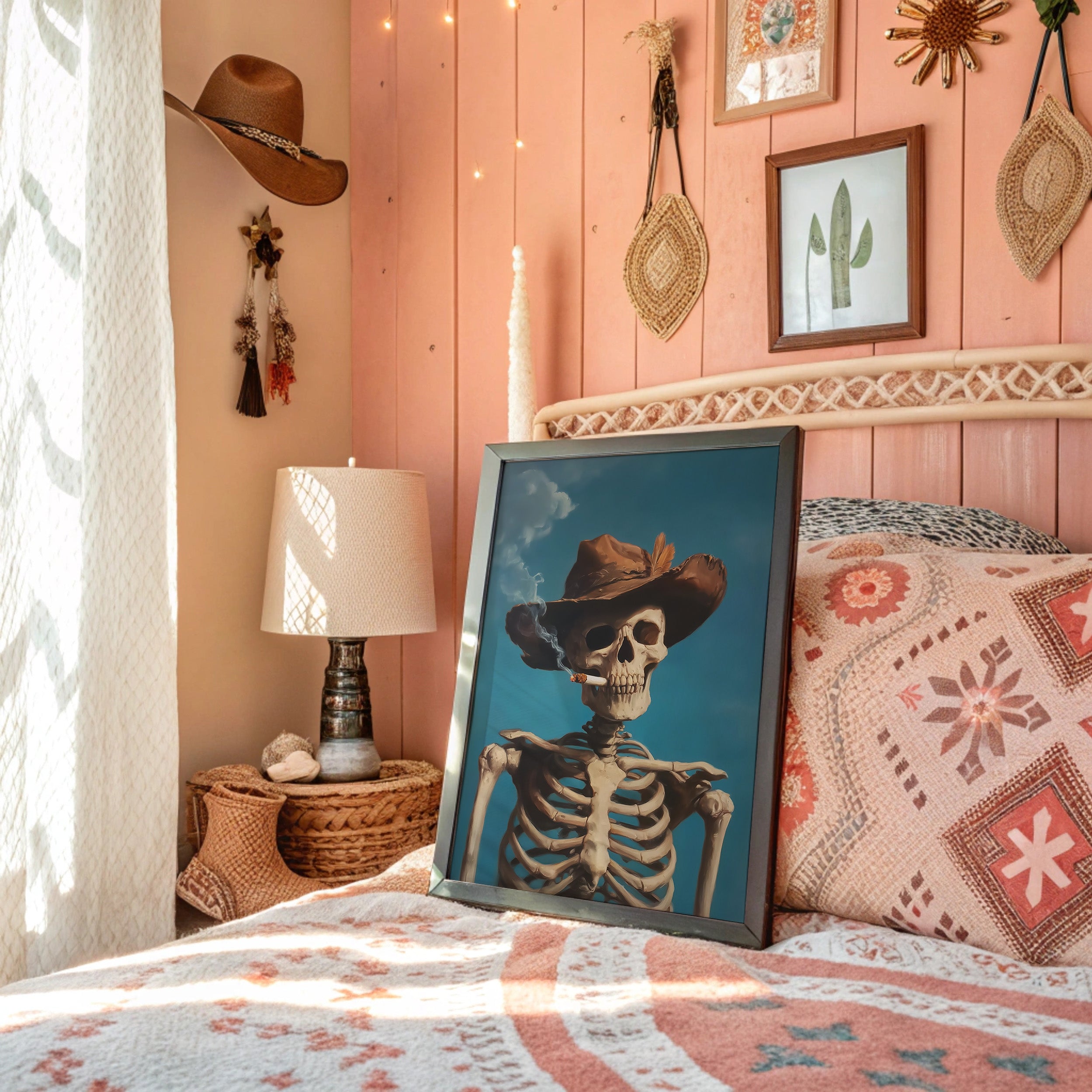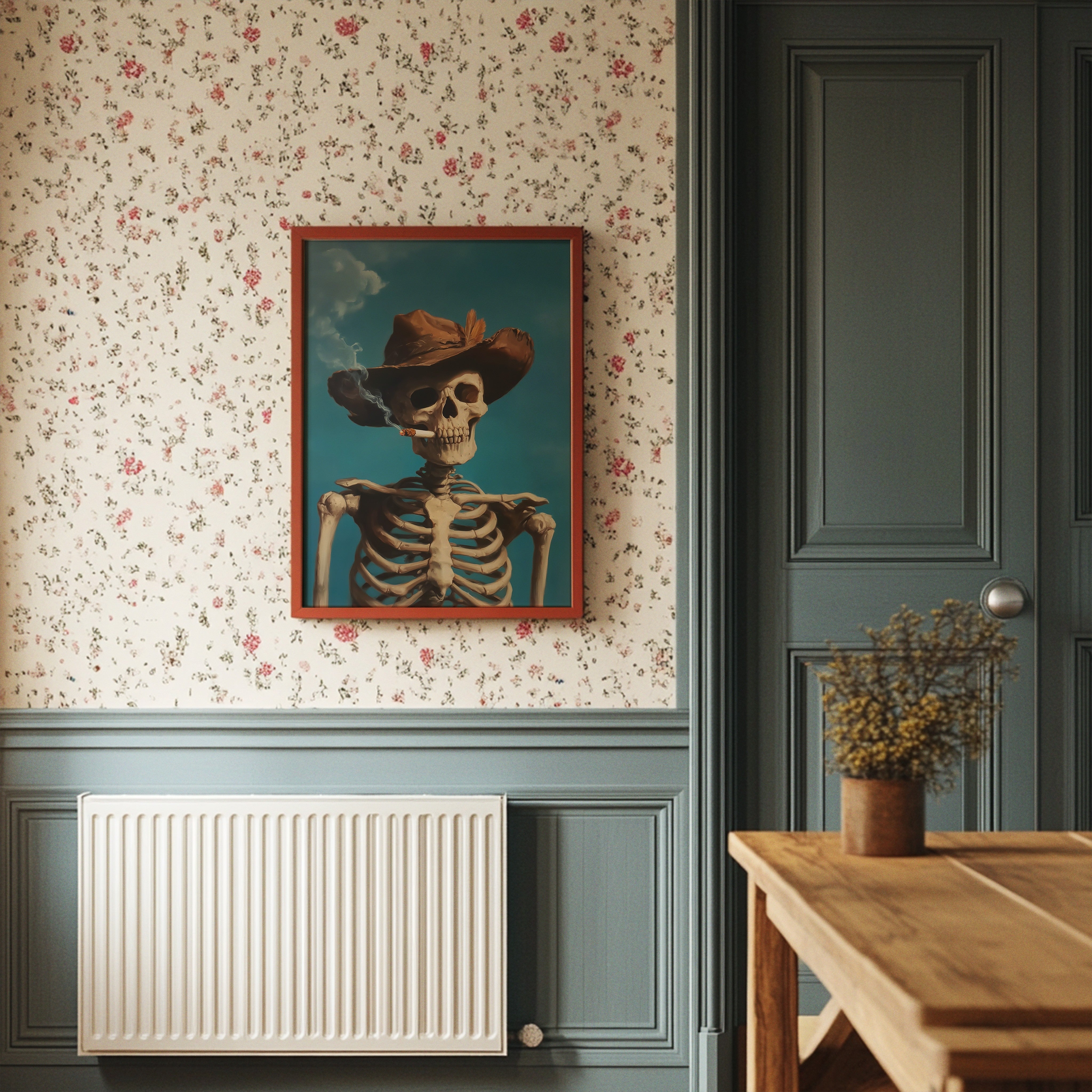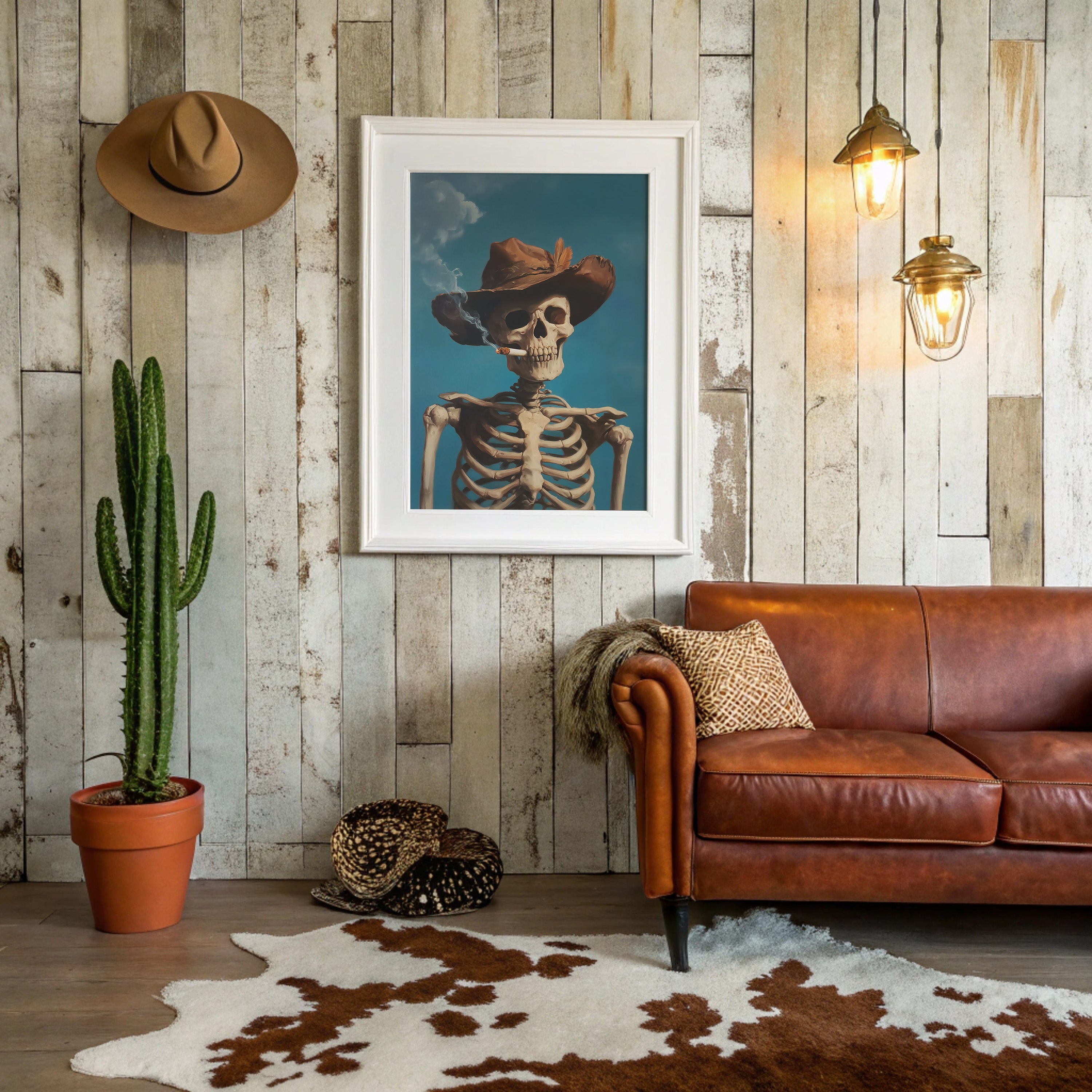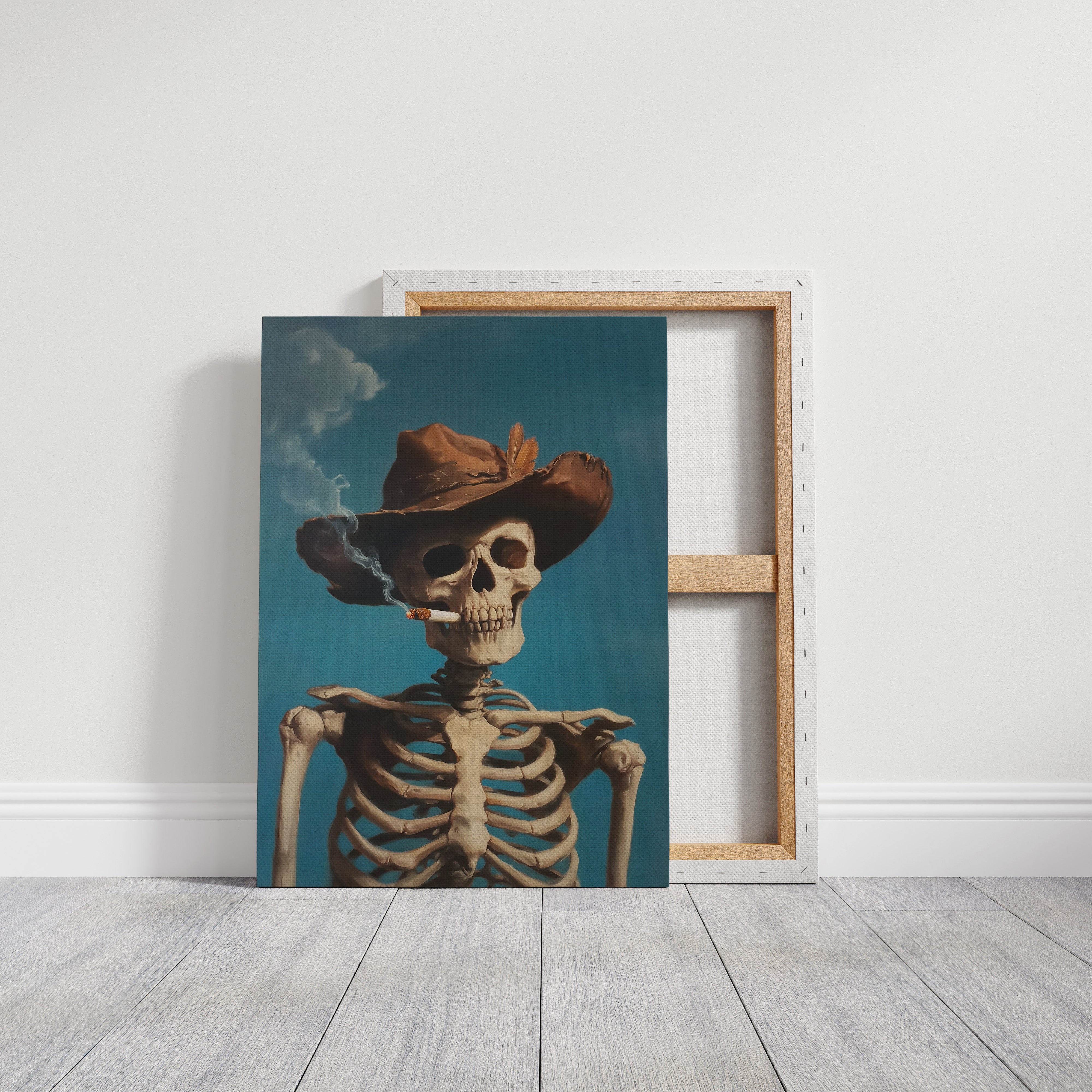 A weathered cowboy skull takes one final drag, wisps of smoke curling lazily against a turquoise sky. This piece from our Contemporary collection merges Western nostalgia with dark humor and modern pop art sensibilities. The rich brown leather hat perched atop bleached bone creates a striking contrast against the vibrant backdrop, while the burning cigarette adds an element of surreal vitality to the macabre subject. The composition plays with themes of mortality and Americana, finding beauty in the intersection of life and death. Perfect for adding an edge of sophisticated rebellion to a home office or creative studio space. Each viewing reveals new details in this meditation on time and transformation.