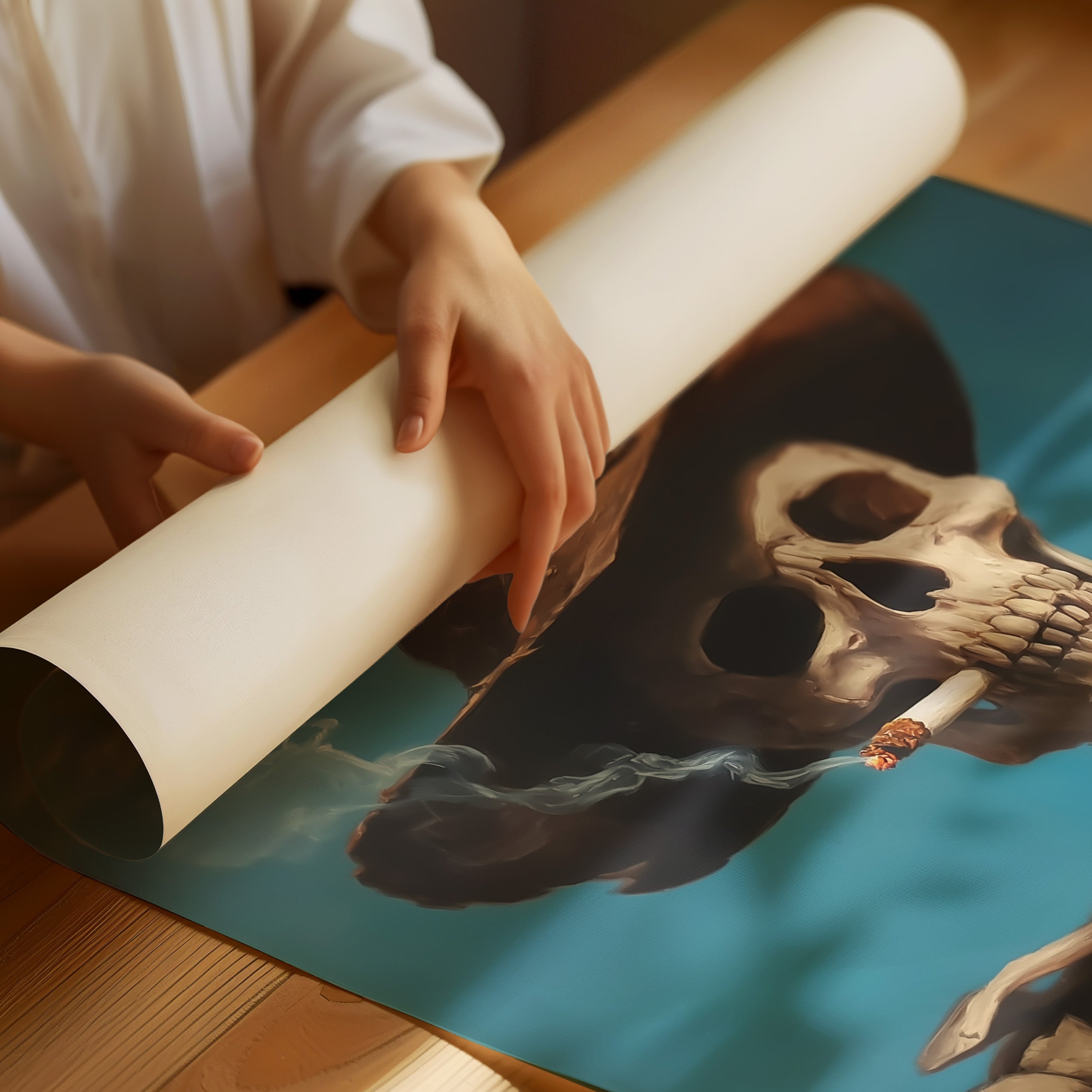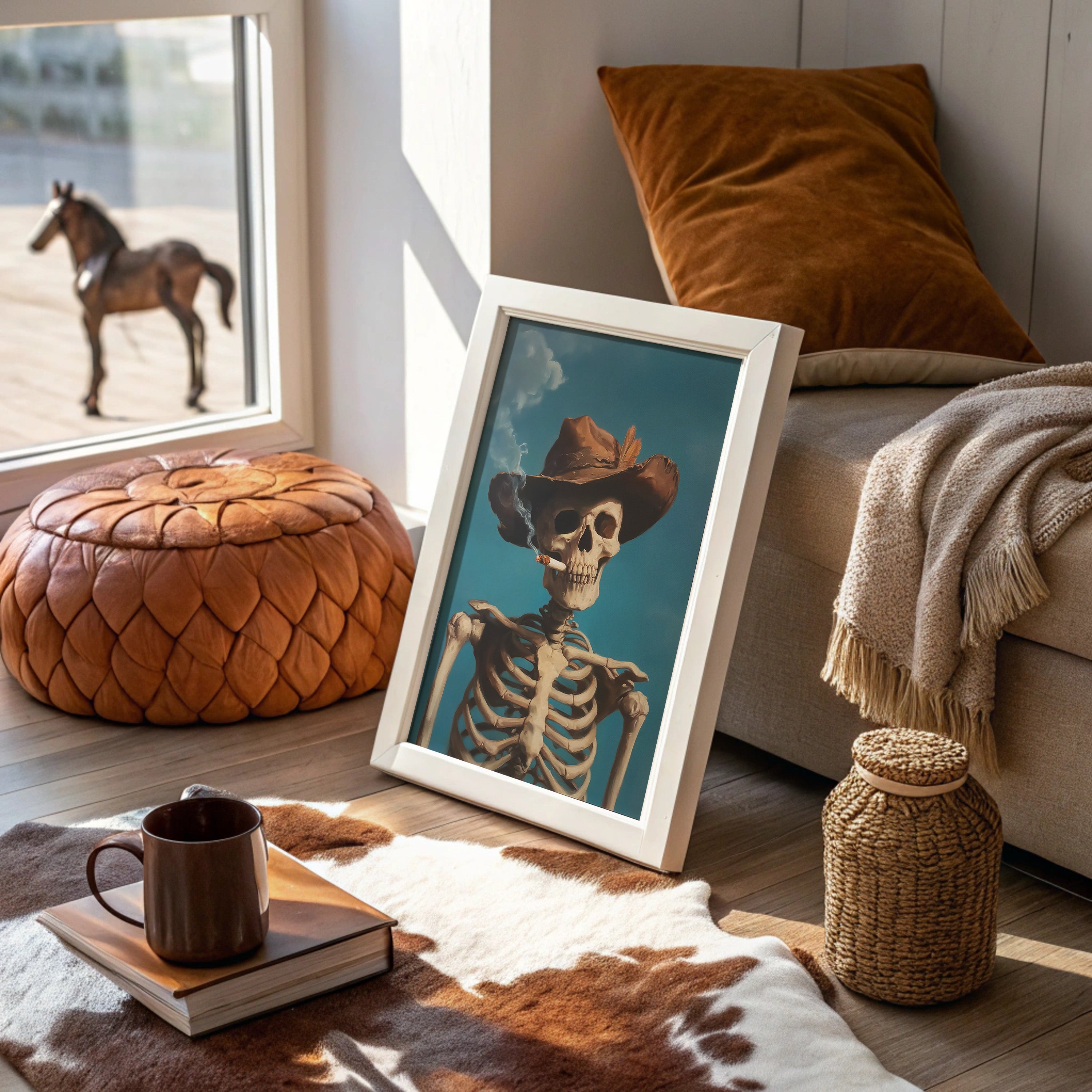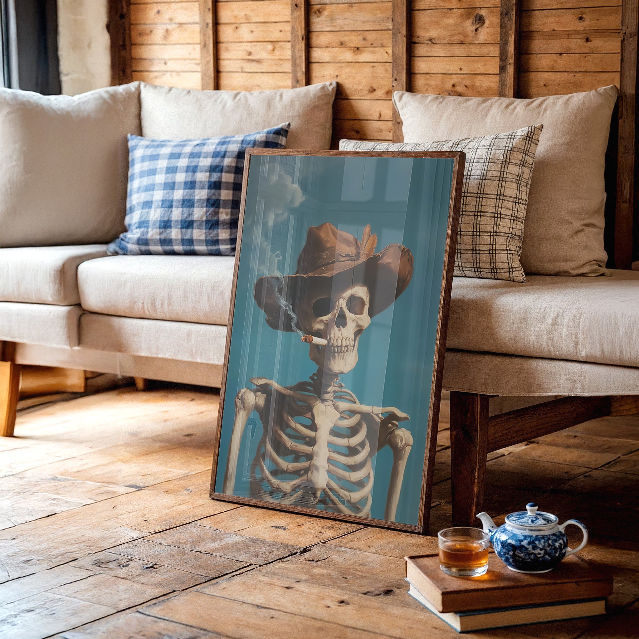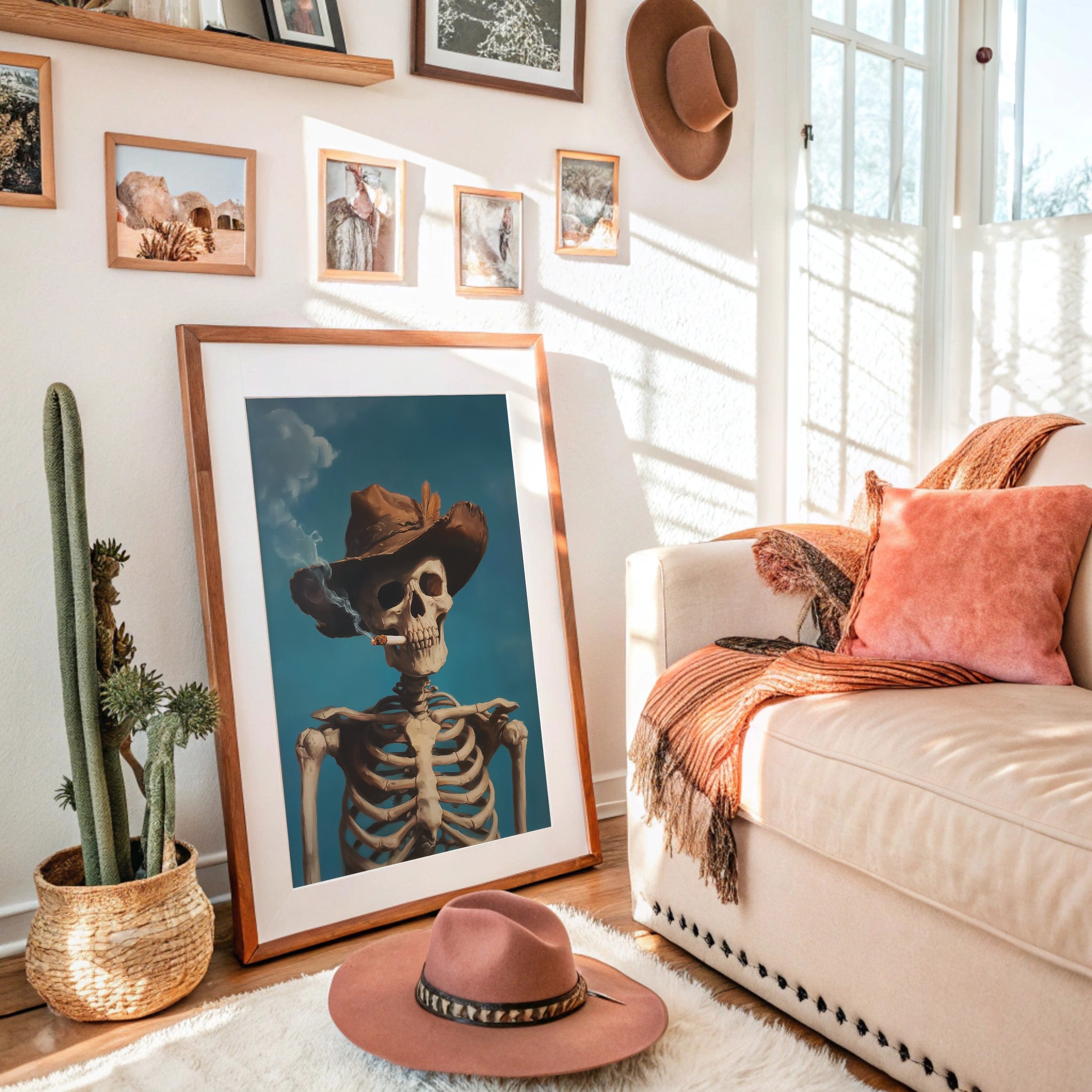 A weathered cowboy skull takes one final drag, wisps of smoke curling lazily against a turquoise sky. This piece from our Contemporary collection merges Western nostalgia with dark humor and modern pop art sensibilities. The rich brown leather hat perched atop bleached bone creates a striking contrast against the vibrant backdrop, while the burning cigarette adds an element of surreal vitality to the macabre subject. The composition plays with themes of mortality and Americana, finding beauty in the intersection of life and death. Perfect for adding an edge of sophisticated rebellion to a home office or creative studio space. Each viewing reveals new details in this meditation on time and transformation.