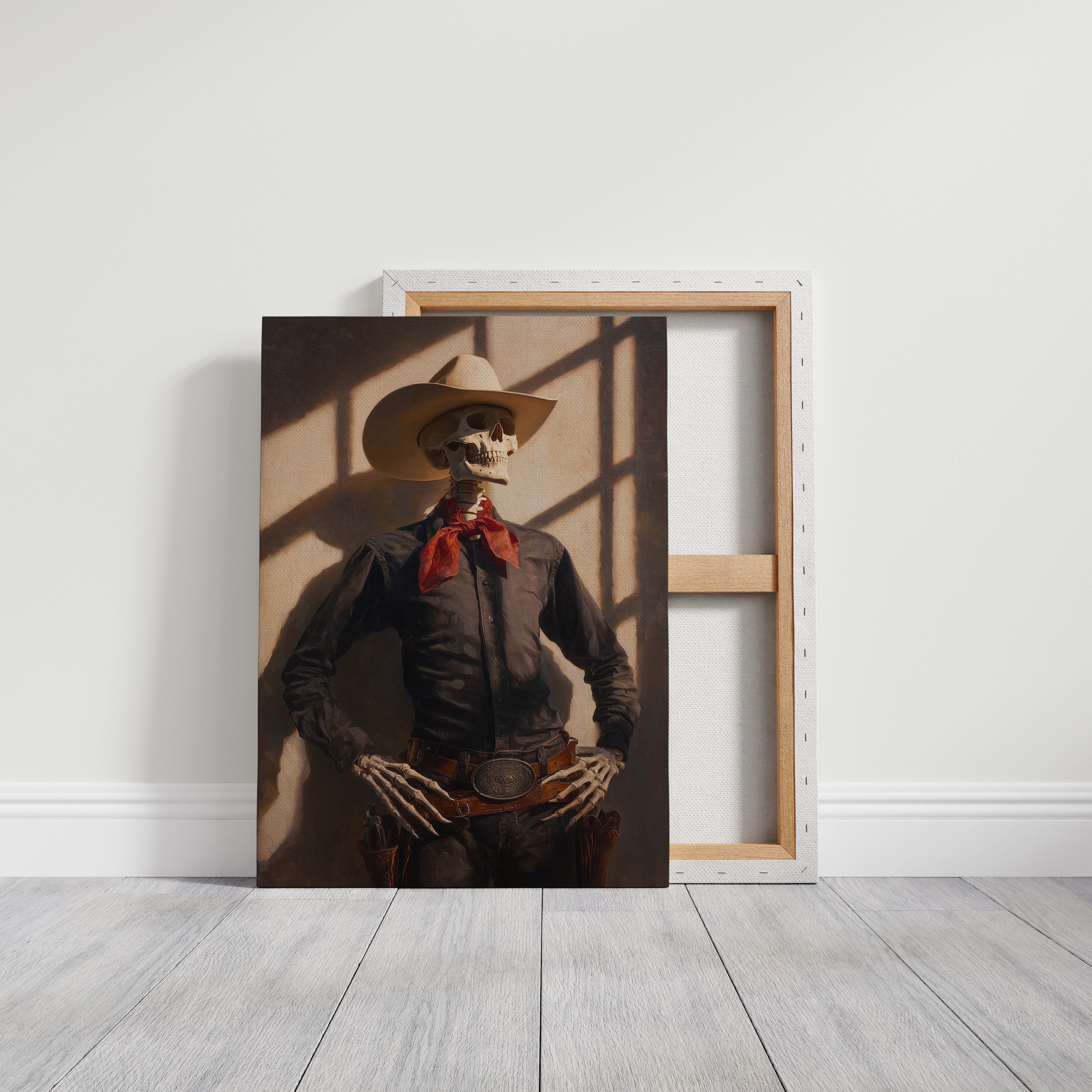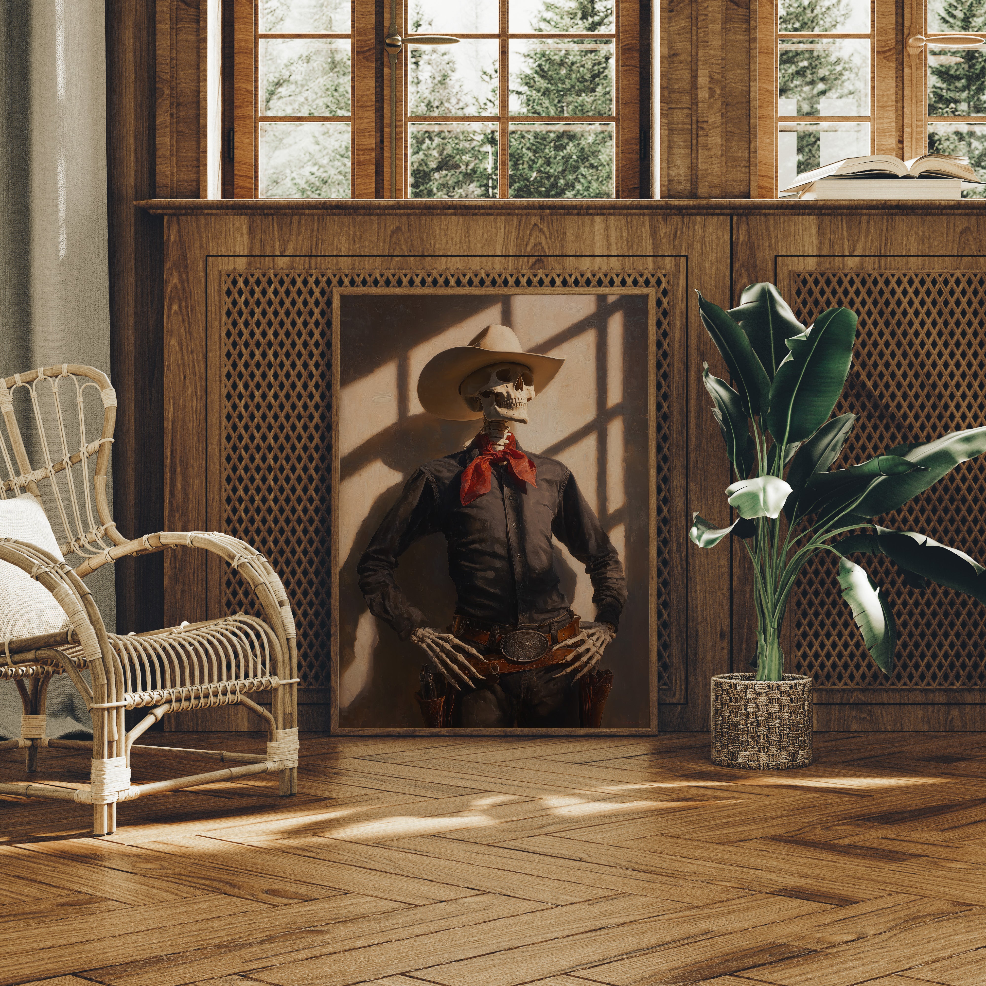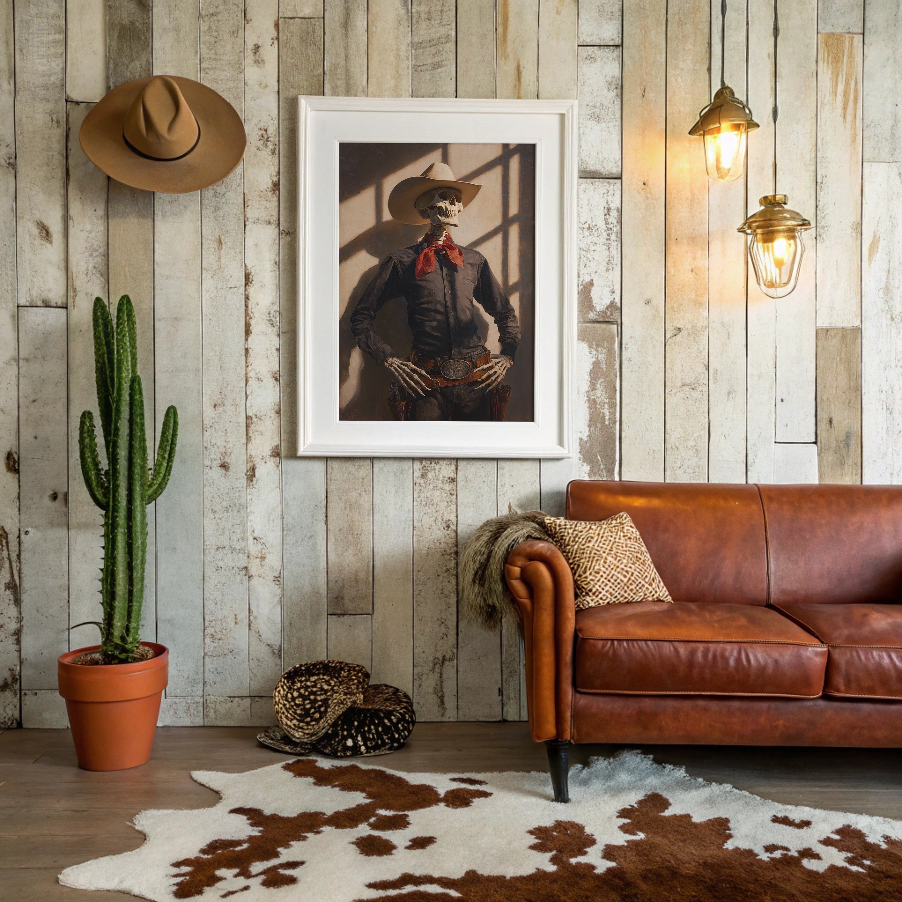 Dramatic shadows play across weathered wood walls, casting an otherworldly glow on this contemporary Western scene. A striking portrait commands attention against distressed planks, while warm leather and desert elements create a bold narrative of modern ranch life. The interplay of vintage-inspired lighting fixtures and industrial touches brings an edgy sophistication to familiar Western motifs. This statement piece becomes a natural focal point in spaces that blend rustic charm with contemporary edge. Perfect for elevating modern ranch homes, urban lofts, or any space seeking to capture untamed spirit with refined style.