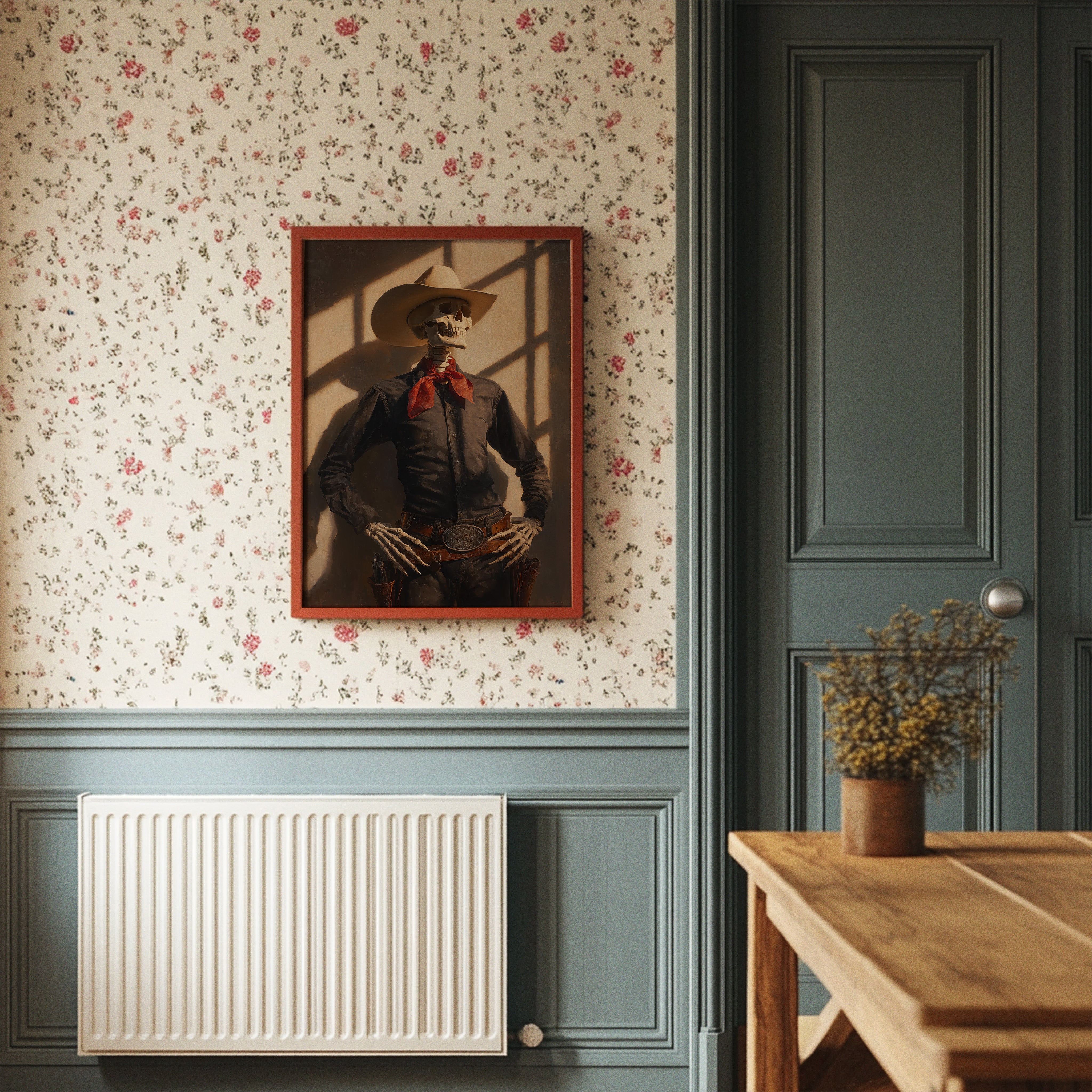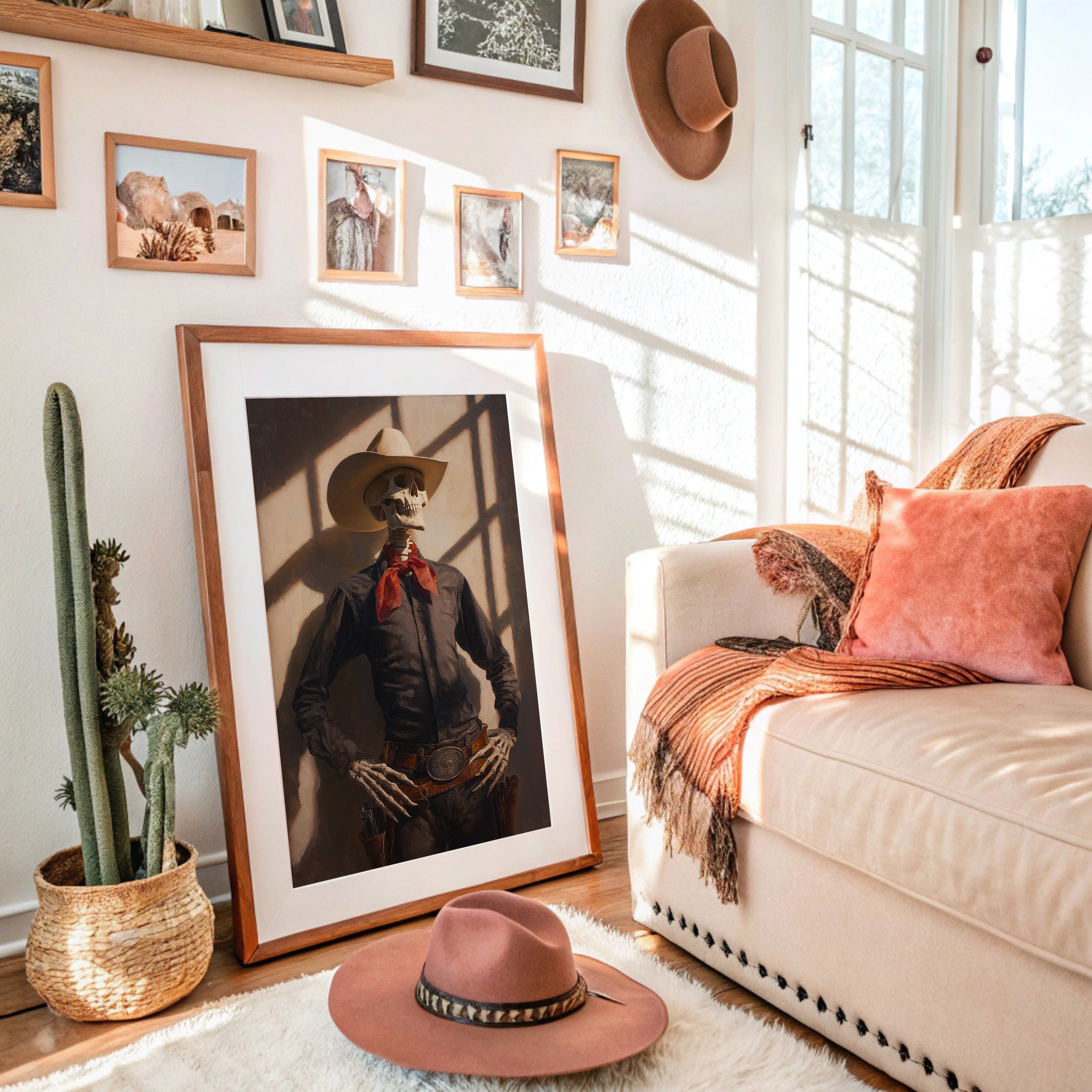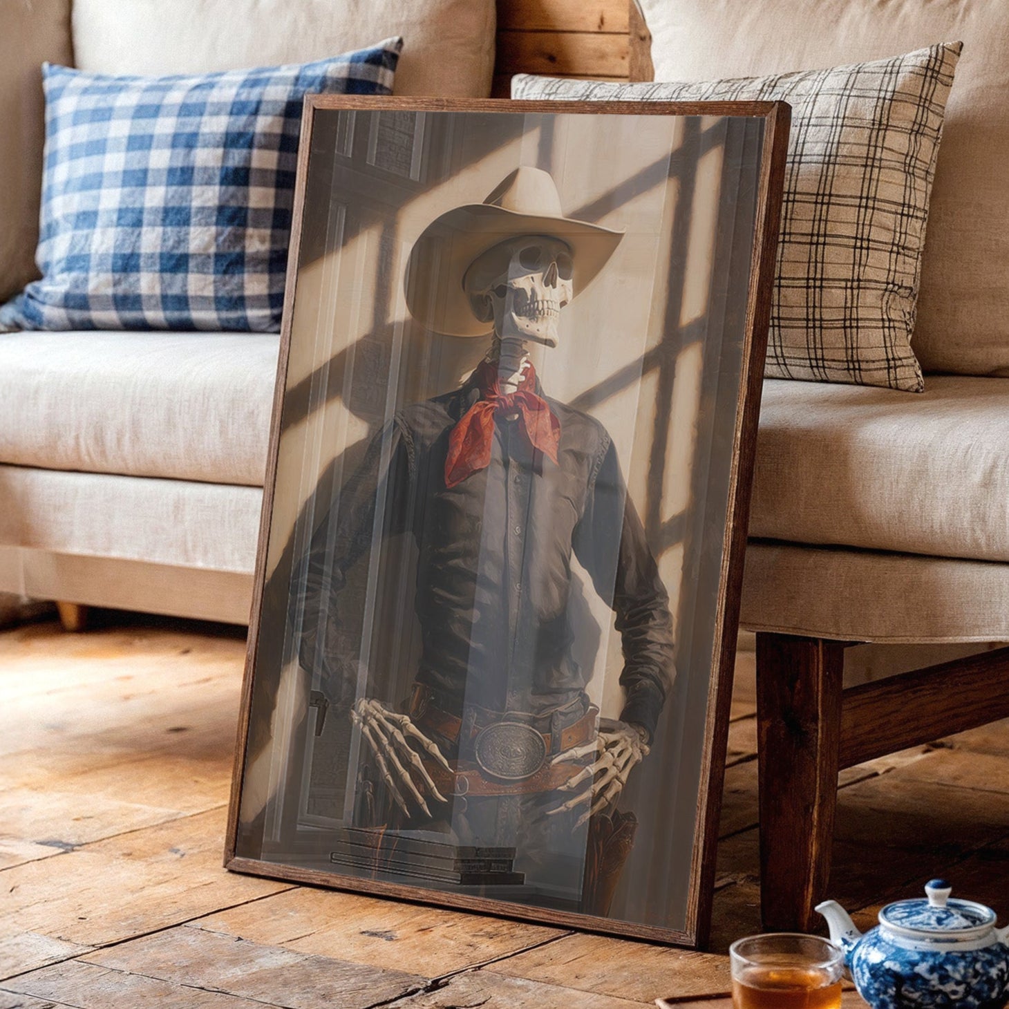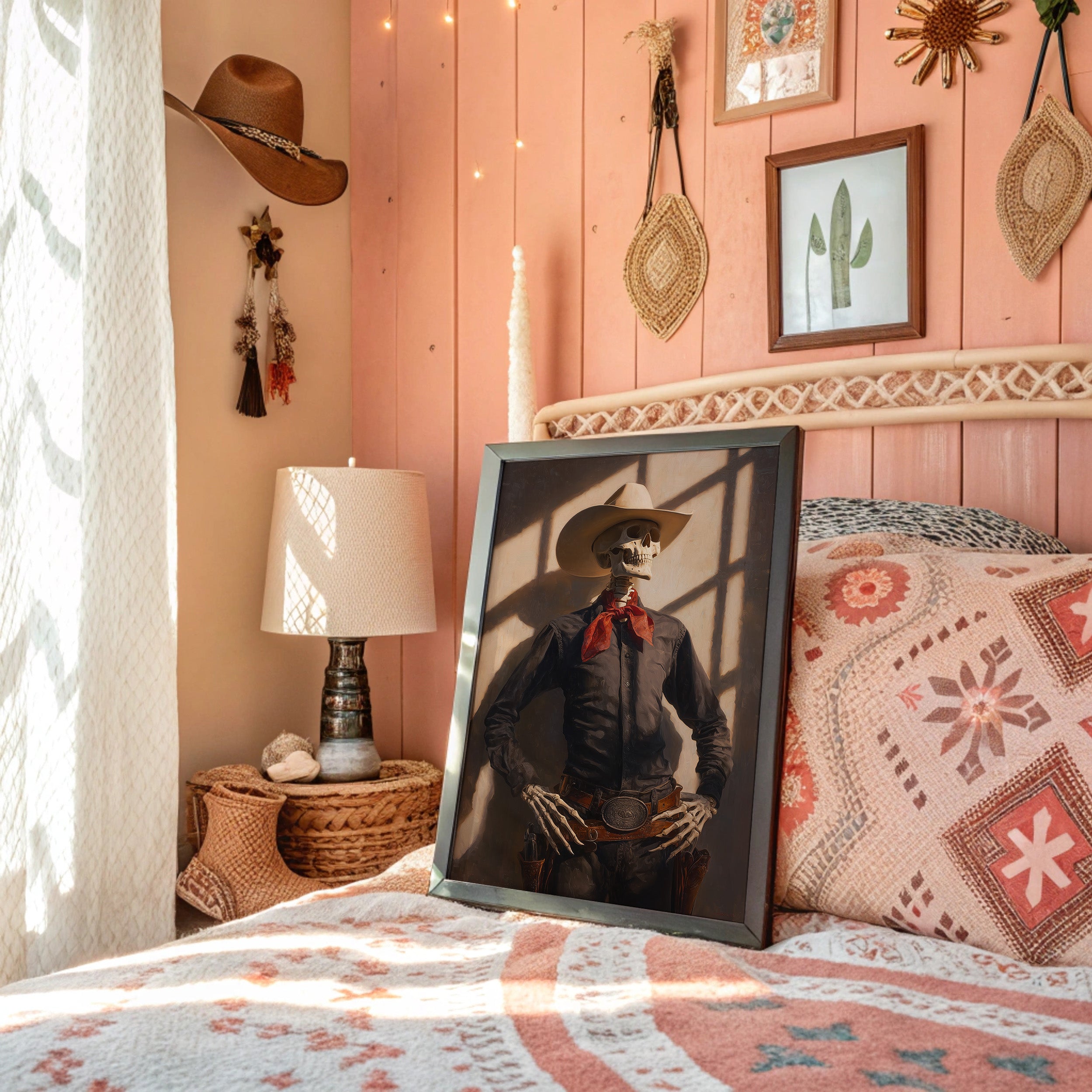 Dramatic shadows play across weathered wood walls, casting an otherworldly glow on this contemporary Western scene. A striking portrait commands attention against distressed planks, while warm leather and desert elements create a bold narrative of modern ranch life. The interplay of vintage-inspired lighting fixtures and industrial touches brings an edgy sophistication to familiar Western motifs. This statement piece becomes a natural focal point in spaces that blend rustic charm with contemporary edge. Perfect for elevating modern ranch homes, urban lofts, or any space seeking to capture untamed spirit with refined style.