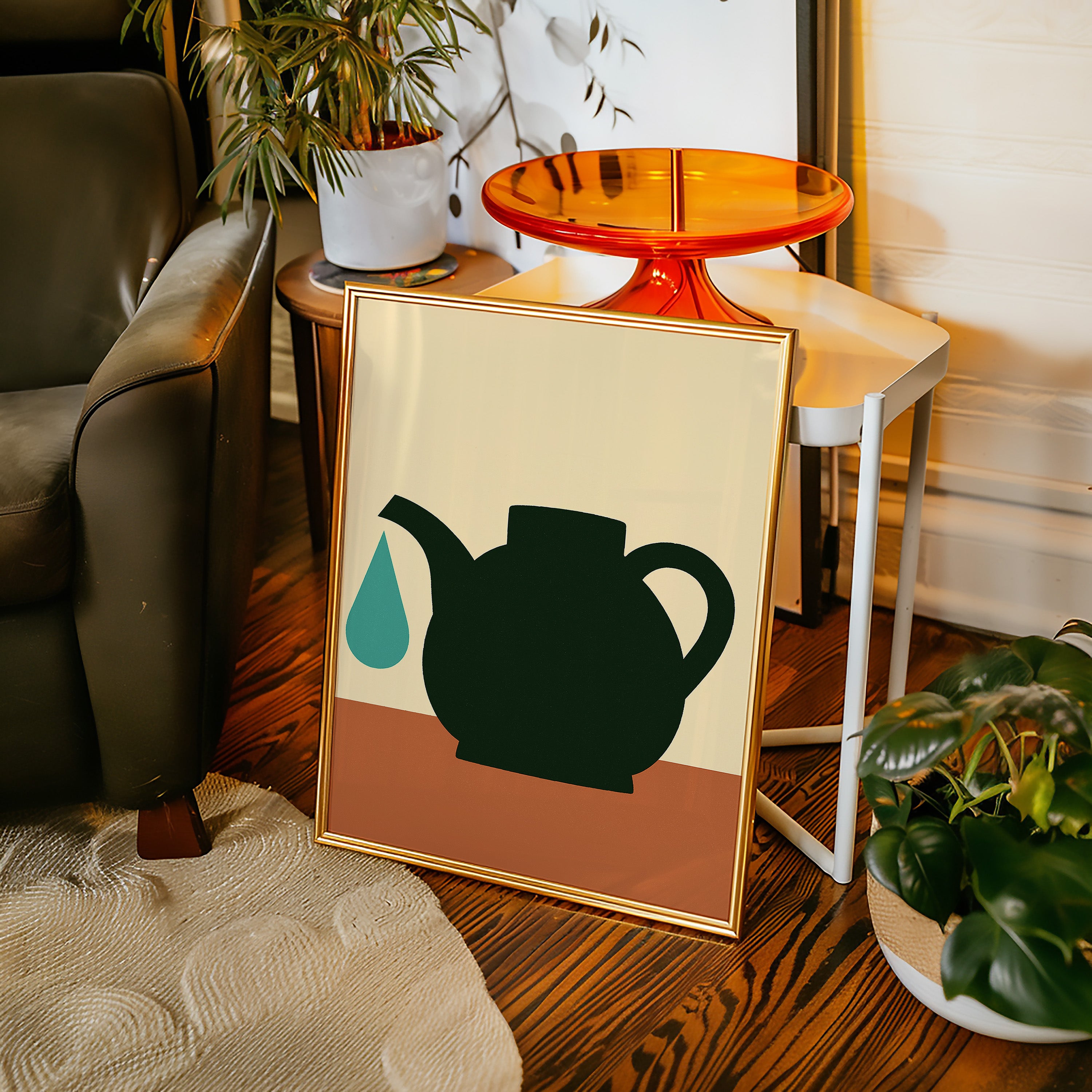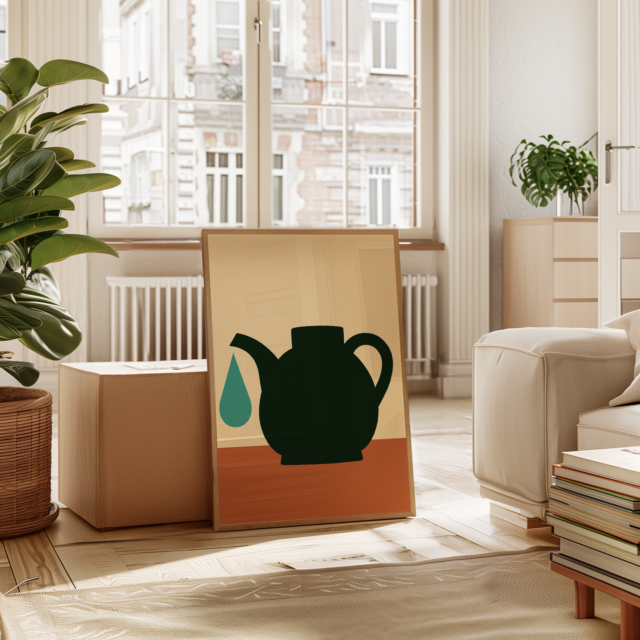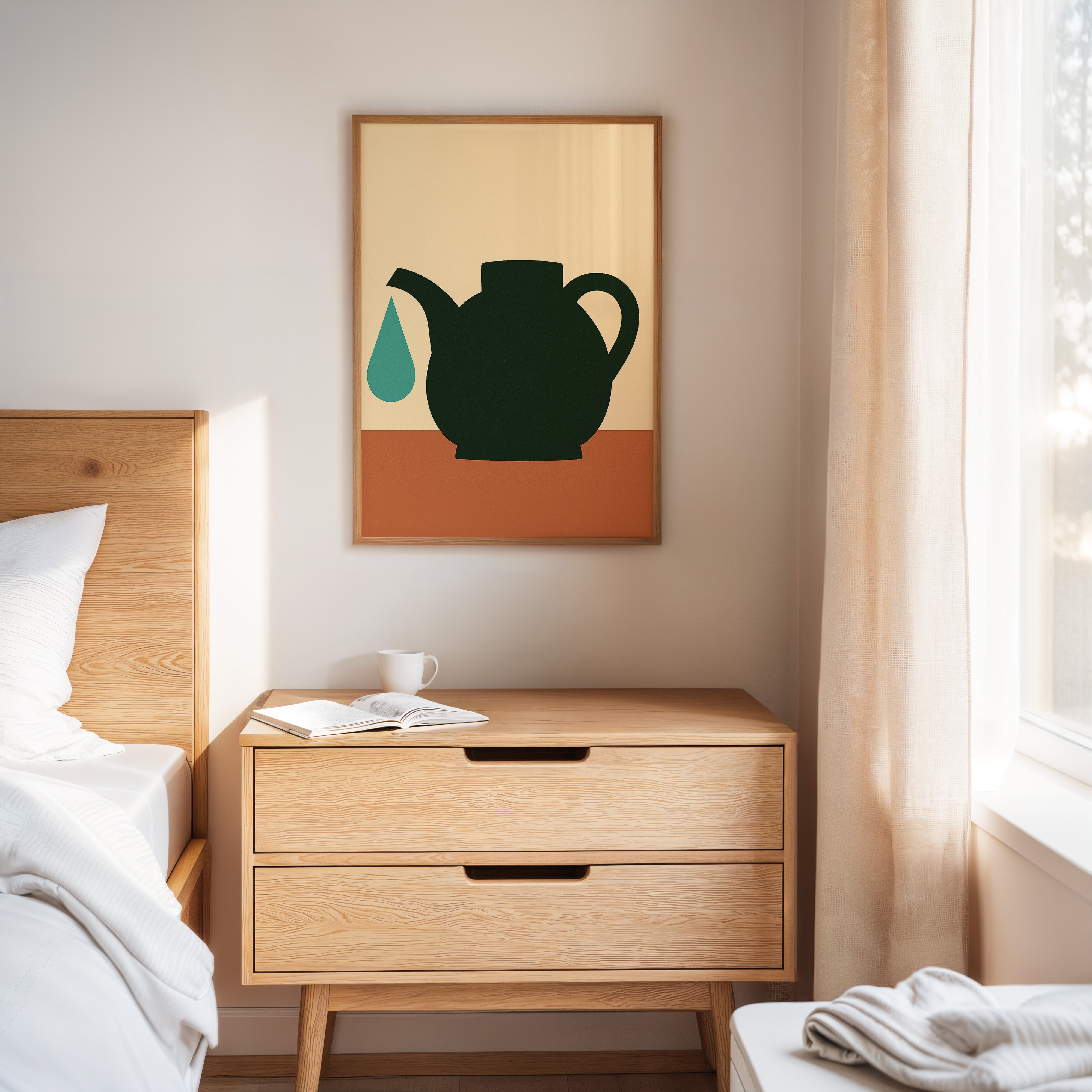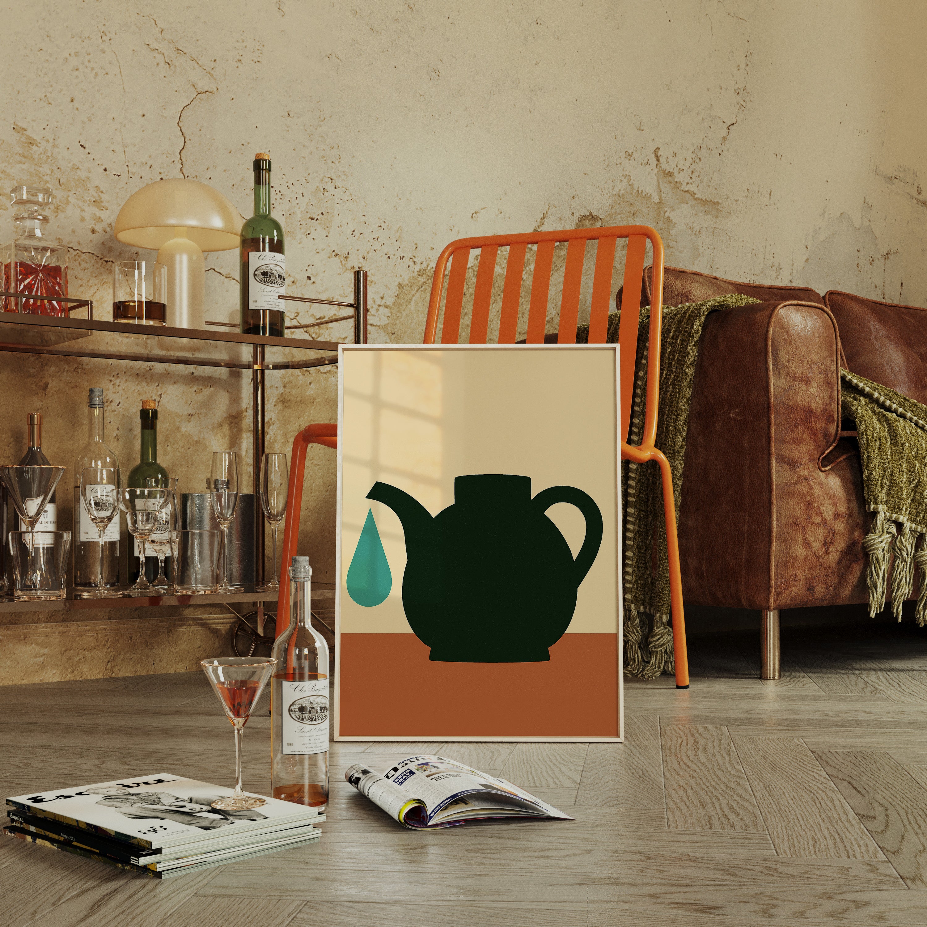 A single turquoise tear hovers in perfect suspension beside a deep forest green teapot silhouette. Against a warm cream background, this minimalist composition speaks of stillness and anticipation. The bold shapes create a powerful contrast between the curved, substantial form of the pot and the delicate droplet, while the terracotta surface grounds the scene in earthy warmth. This piece captures that contemplative moment when the final drop of tea reluctantly parts from its source.