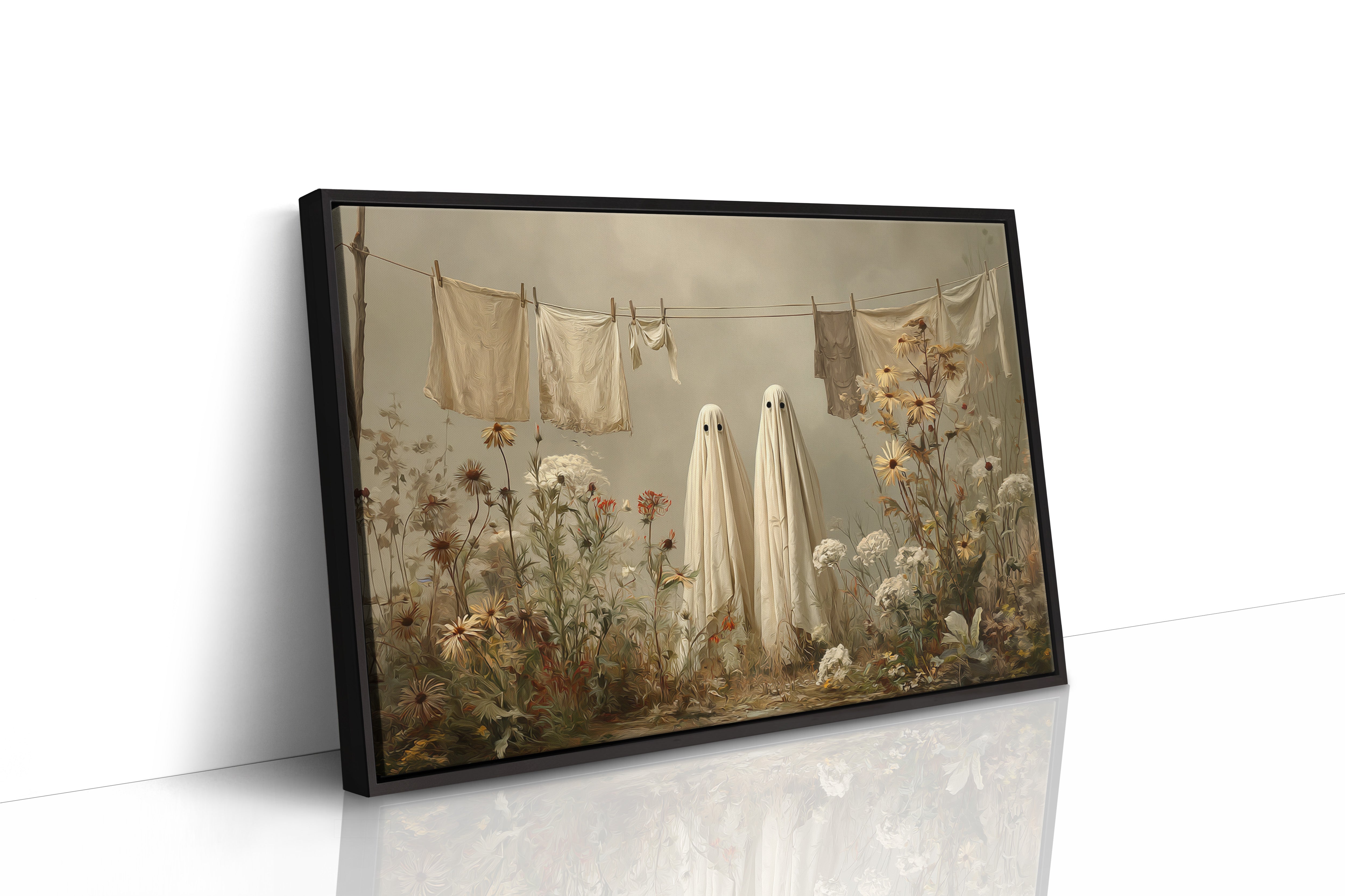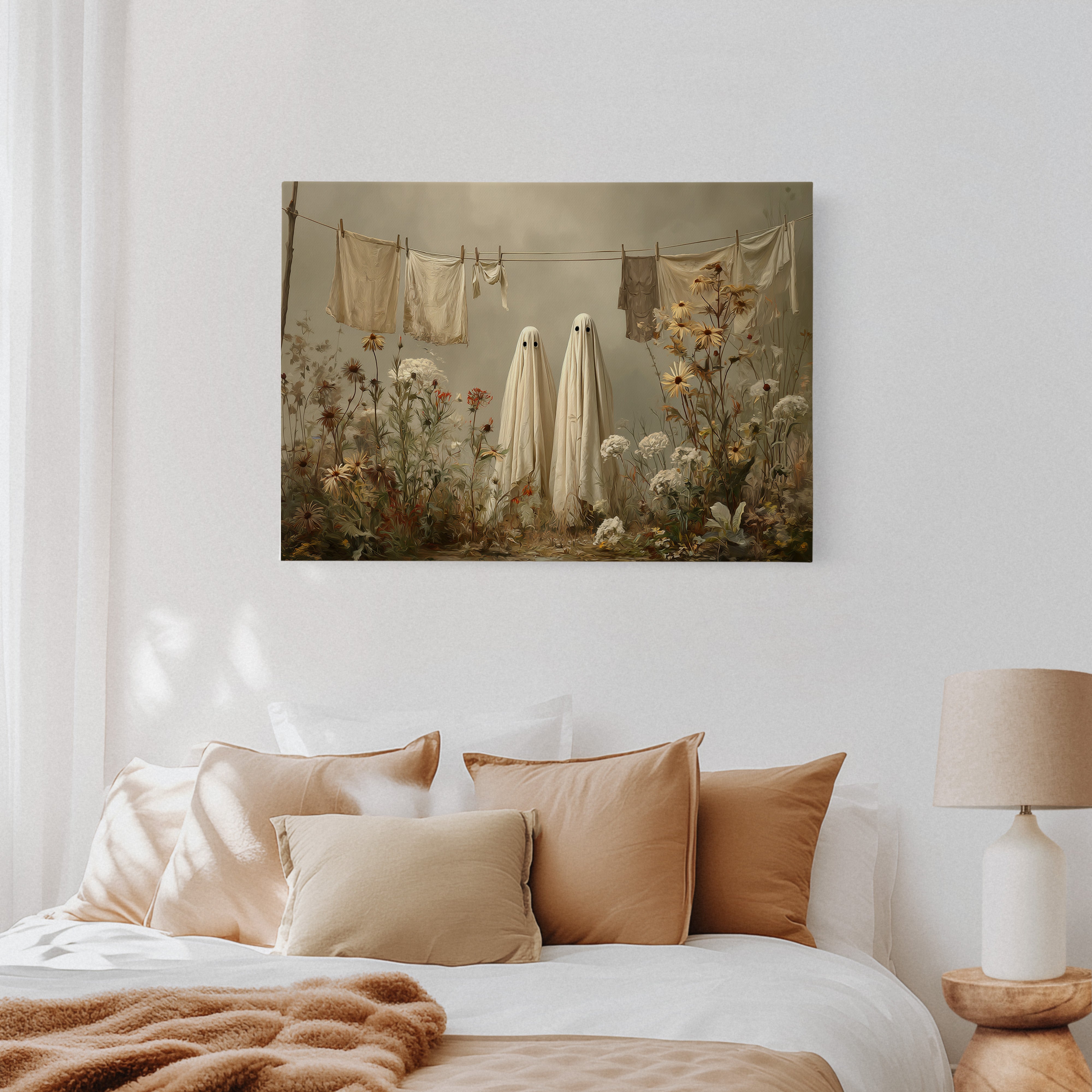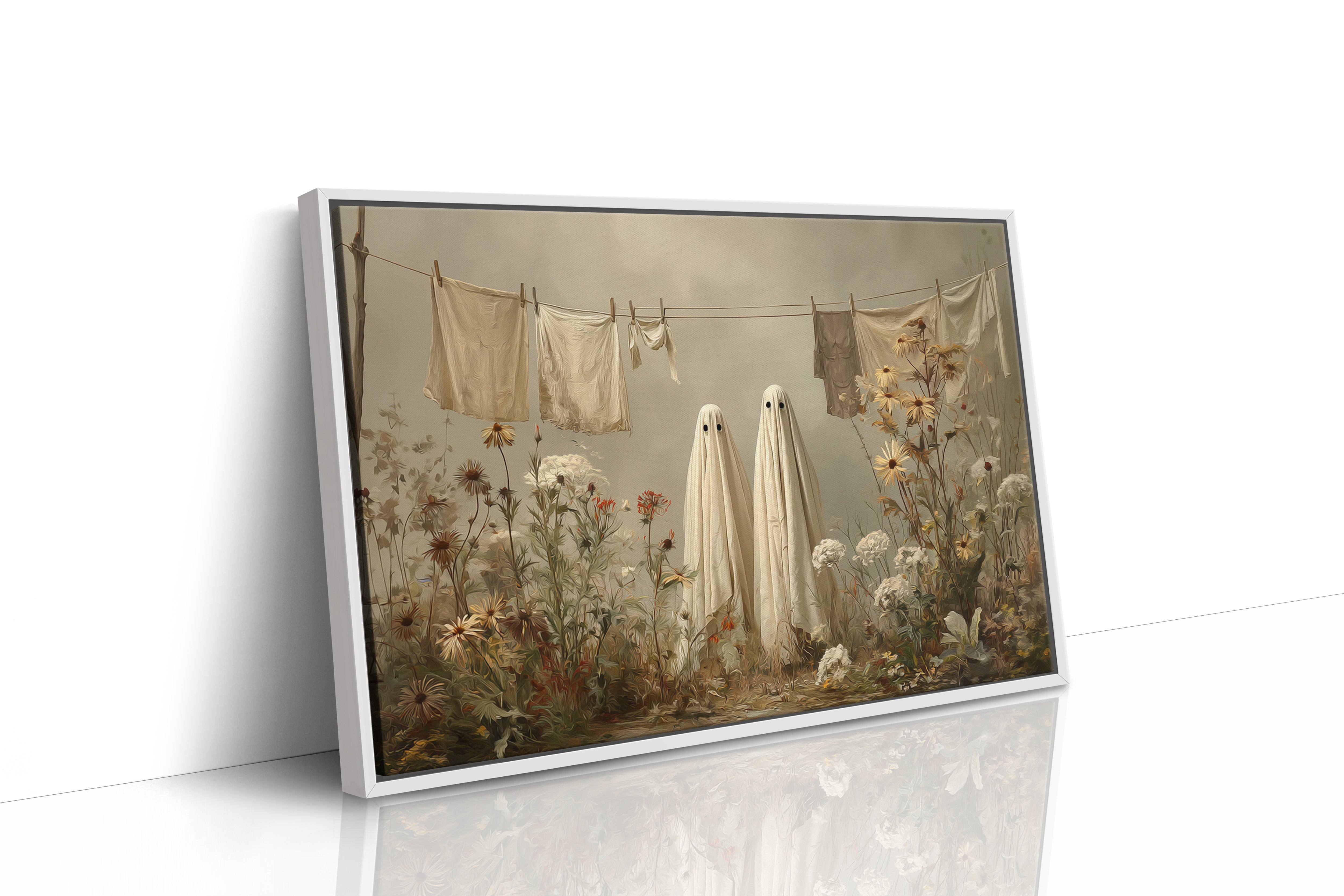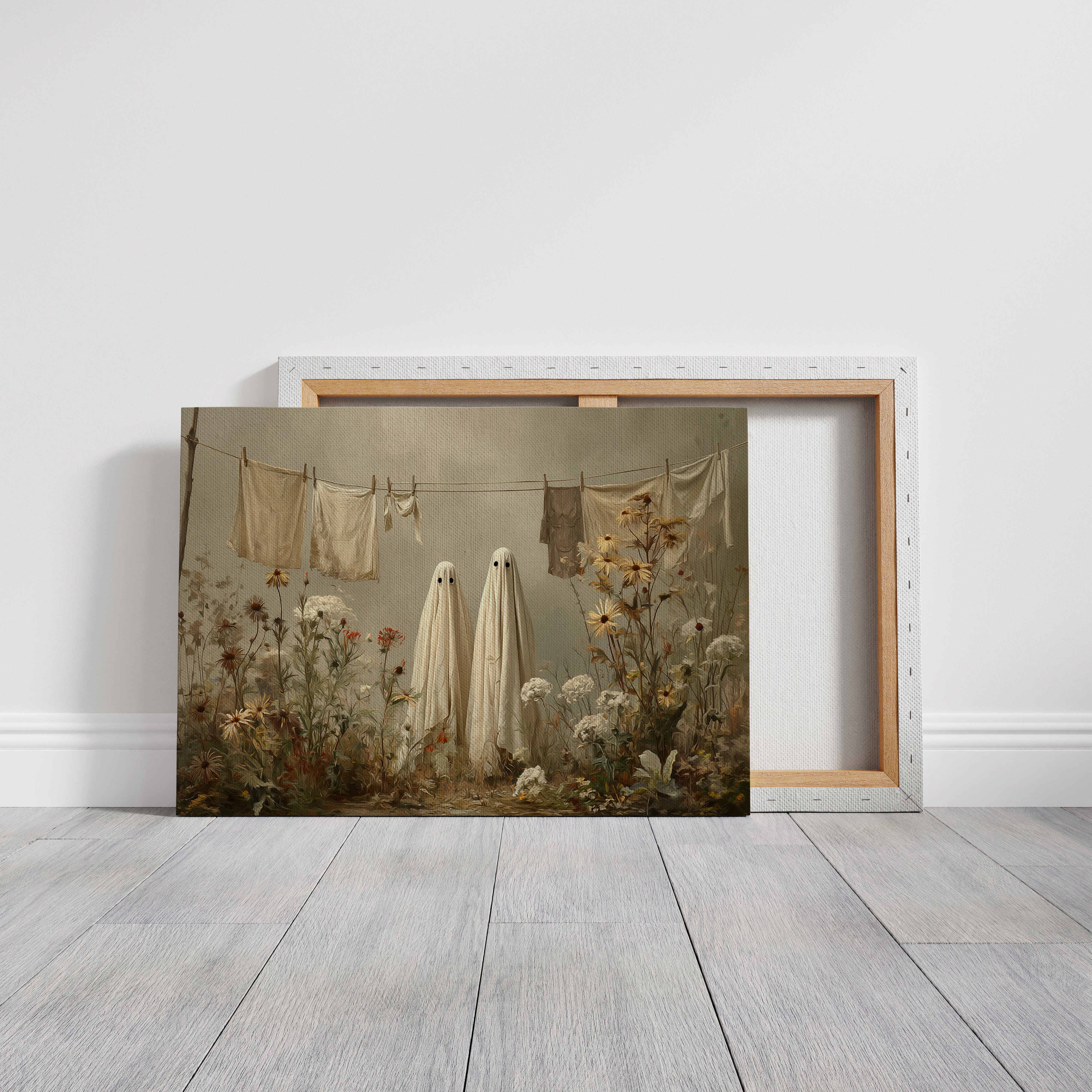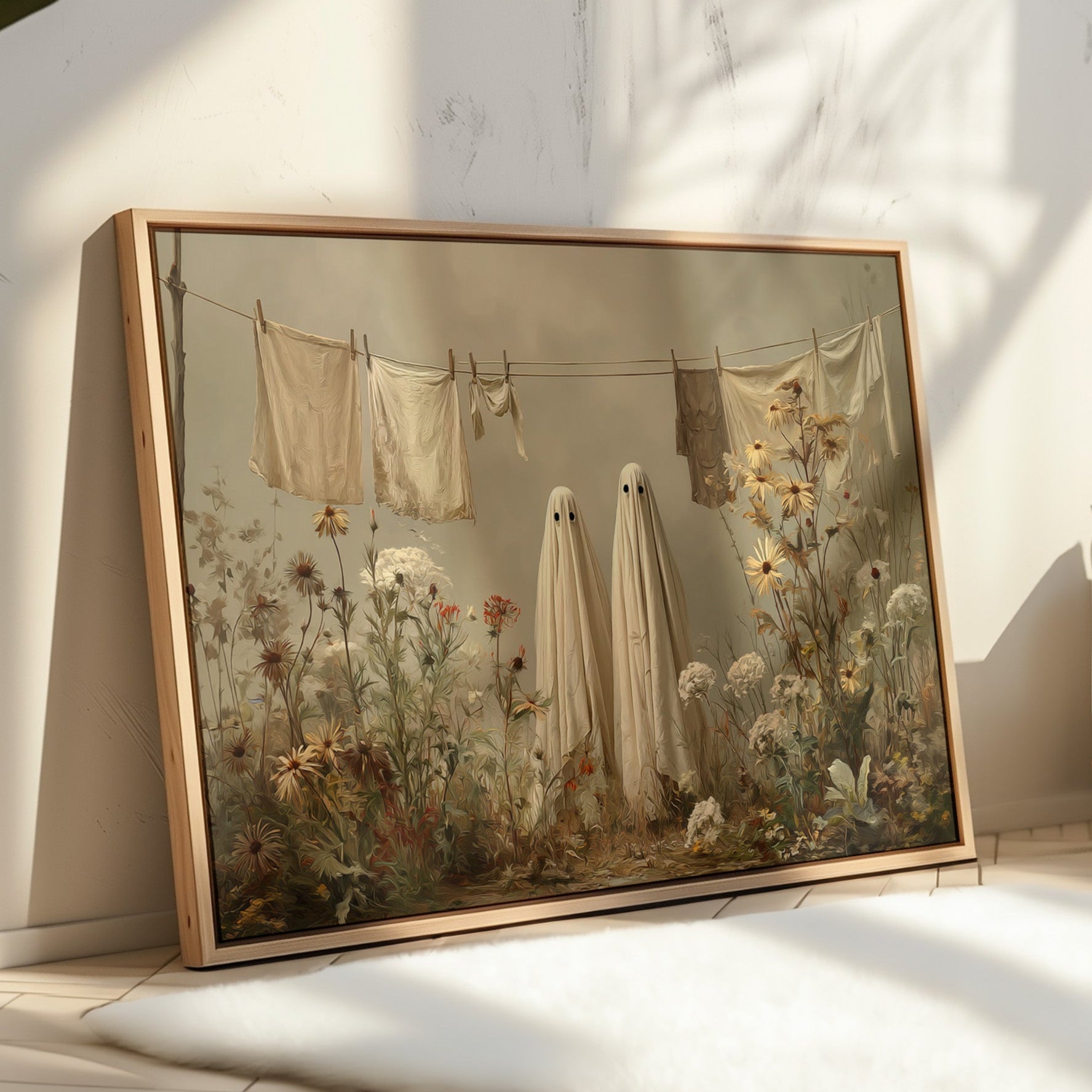 In a whimsical garden scene, two sheet-draped figures stand among wild blooms, creating an oddly charming moment of domestic surrealism. Cream-colored linens dance on the clothesline above, while golden daisies and white carnations tangle at their feet in beautiful disorder. The muted autumn palette and soft lighting cast everything in a dreamy, nostalgic glow, blending the ordinary with the extraordinary. This playful piece turns a simple backyard scene into a magical encounter, where everyday chores meet childhood imagination.