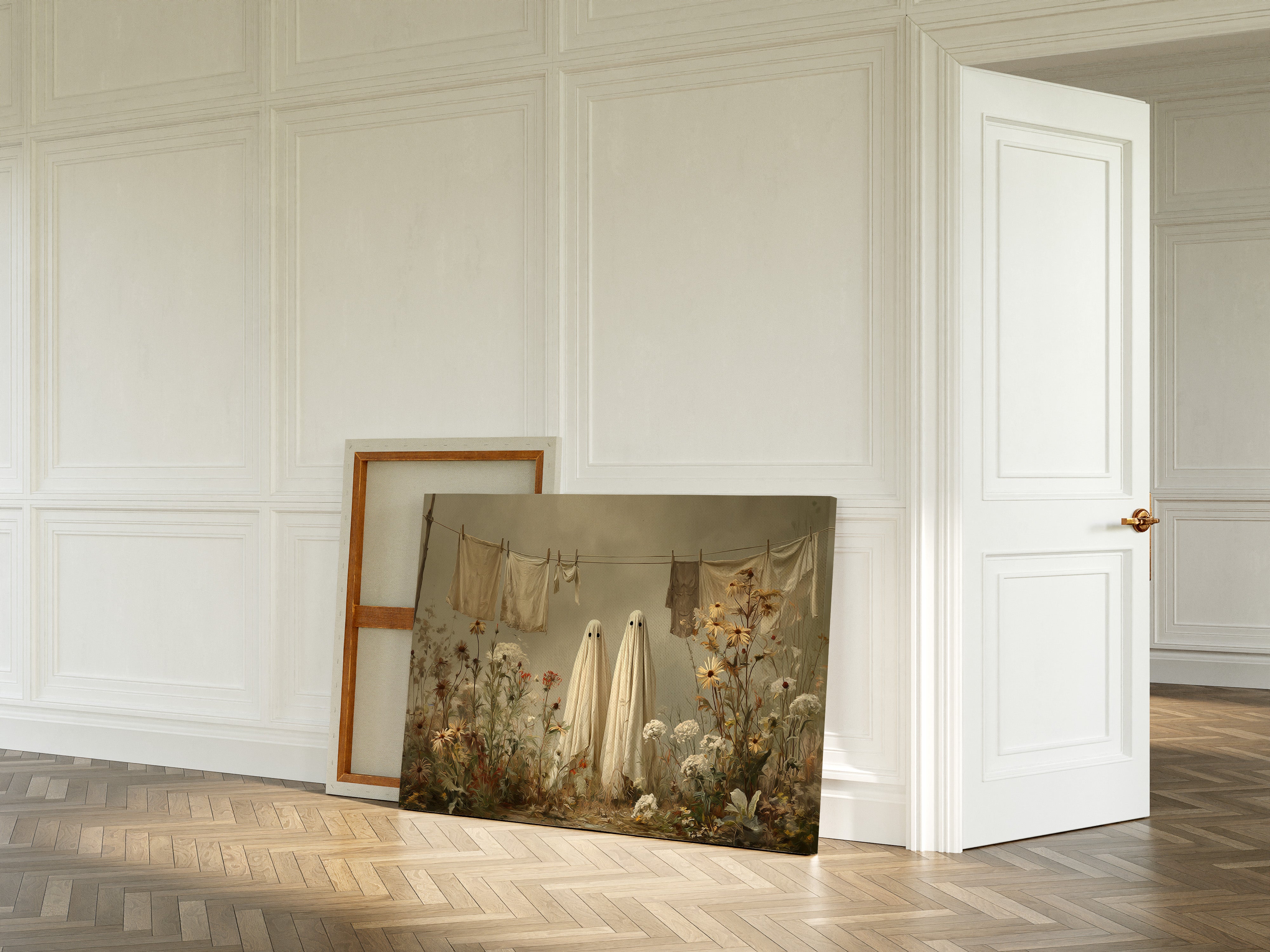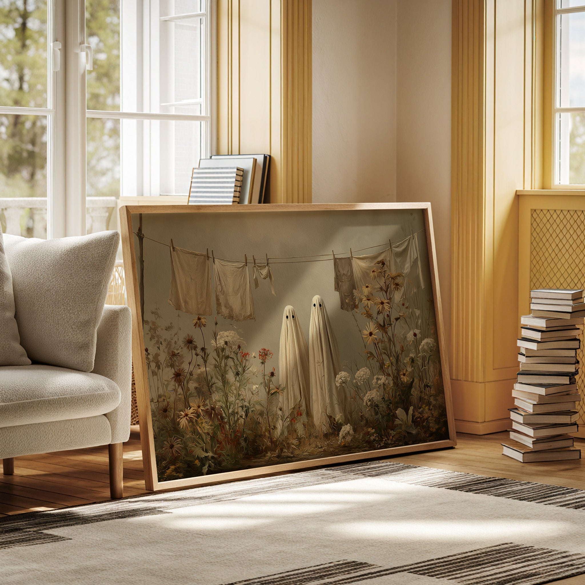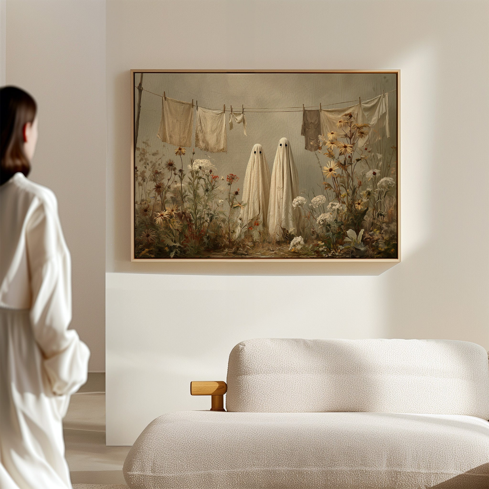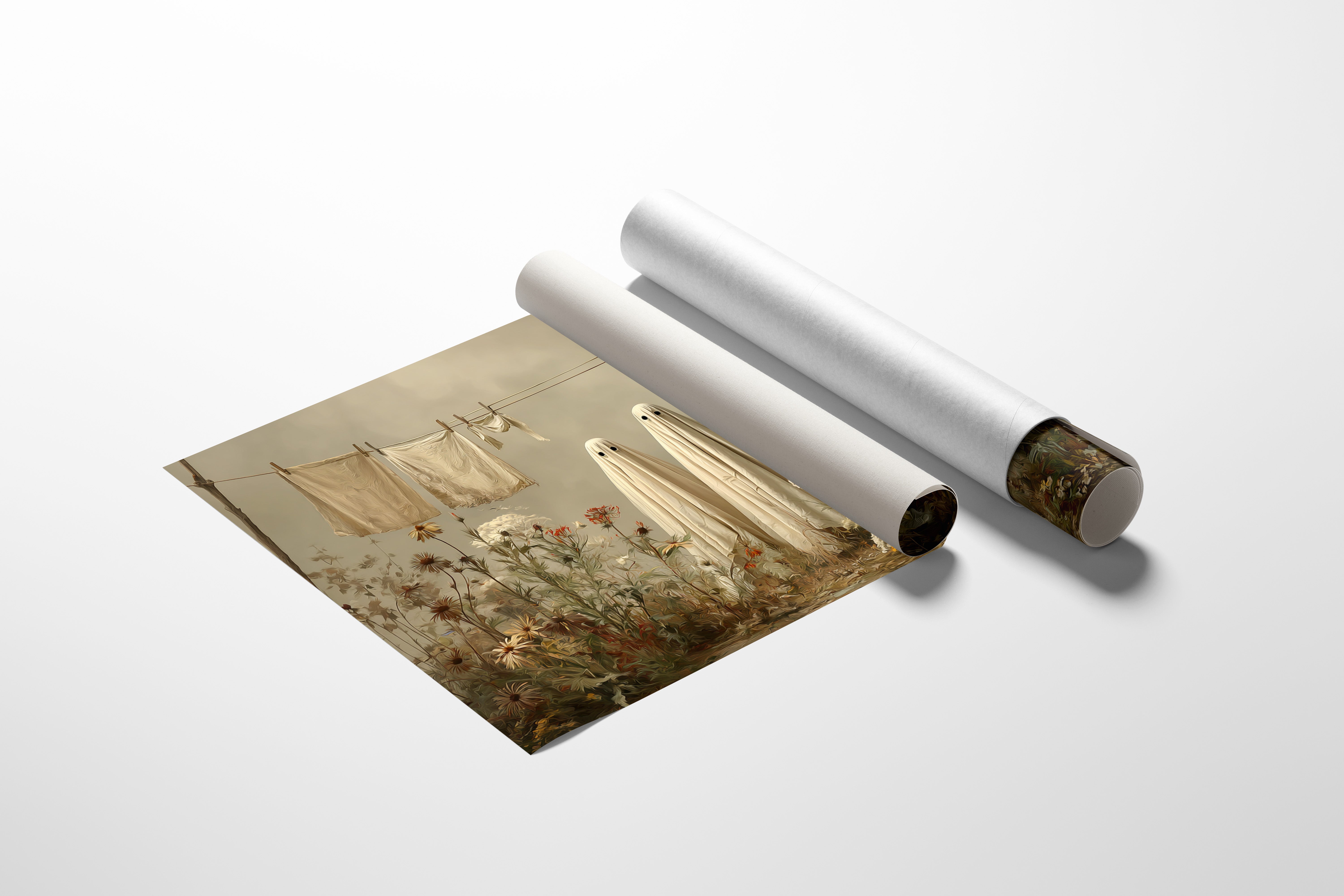 In a whimsical garden scene, two sheet-draped figures stand among wild blooms, creating an oddly charming moment of domestic surrealism. Cream-colored linens dance on the clothesline above, while golden daisies and white carnations tangle at their feet in beautiful disorder. The muted autumn palette and soft lighting cast everything in a dreamy, nostalgic glow, blending the ordinary with the extraordinary. This playful piece turns a simple backyard scene into a magical encounter, where everyday chores meet childhood imagination.