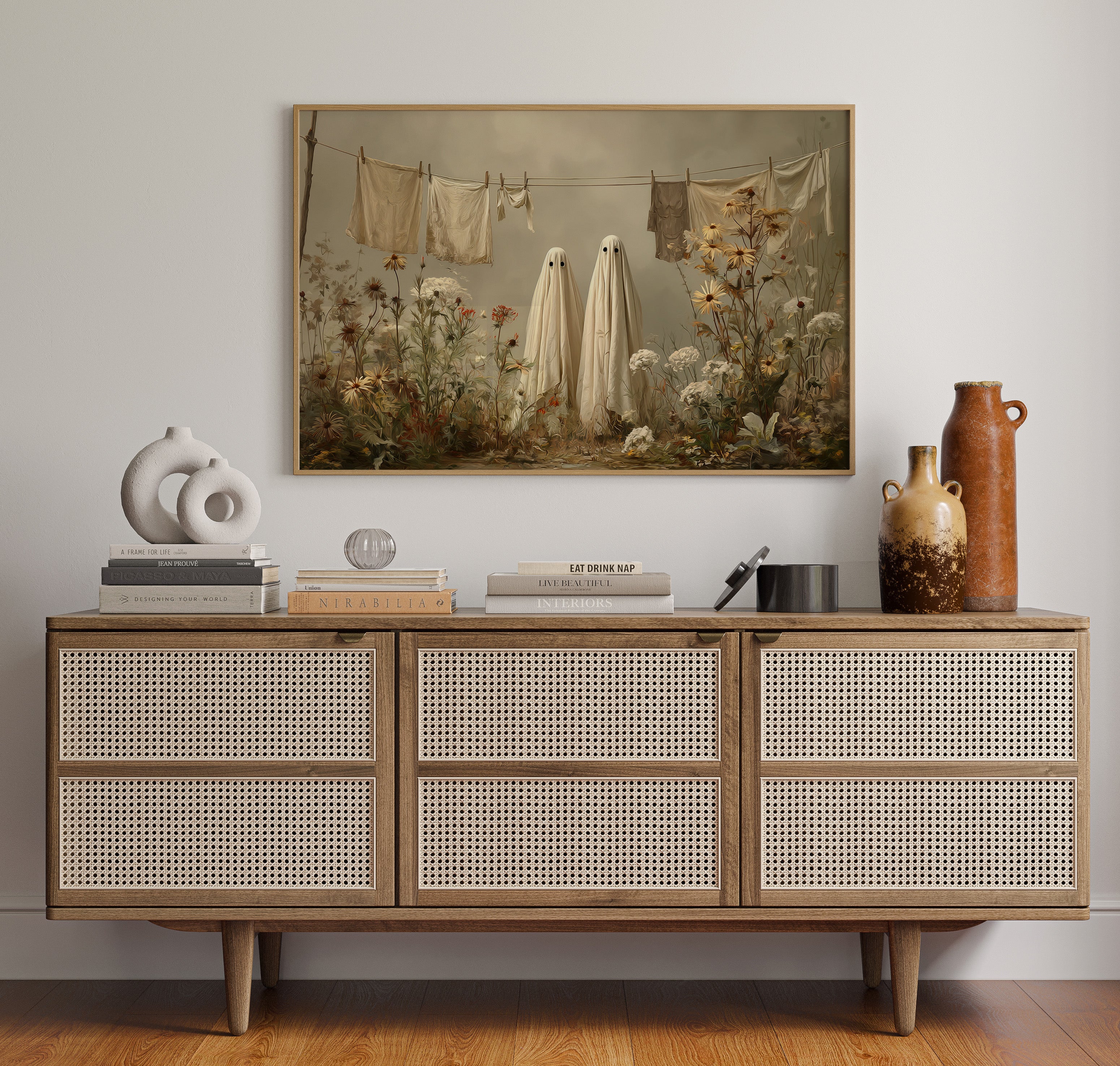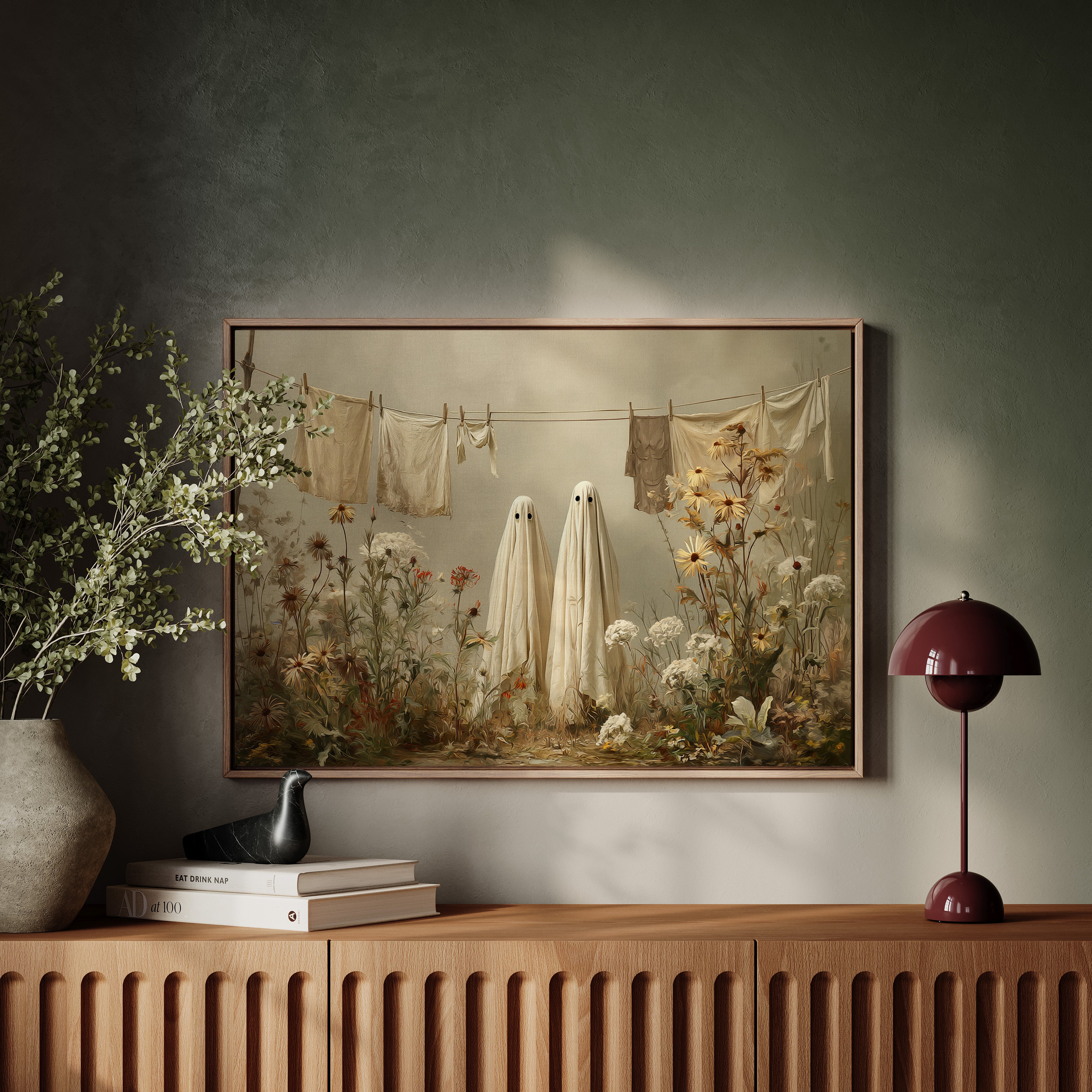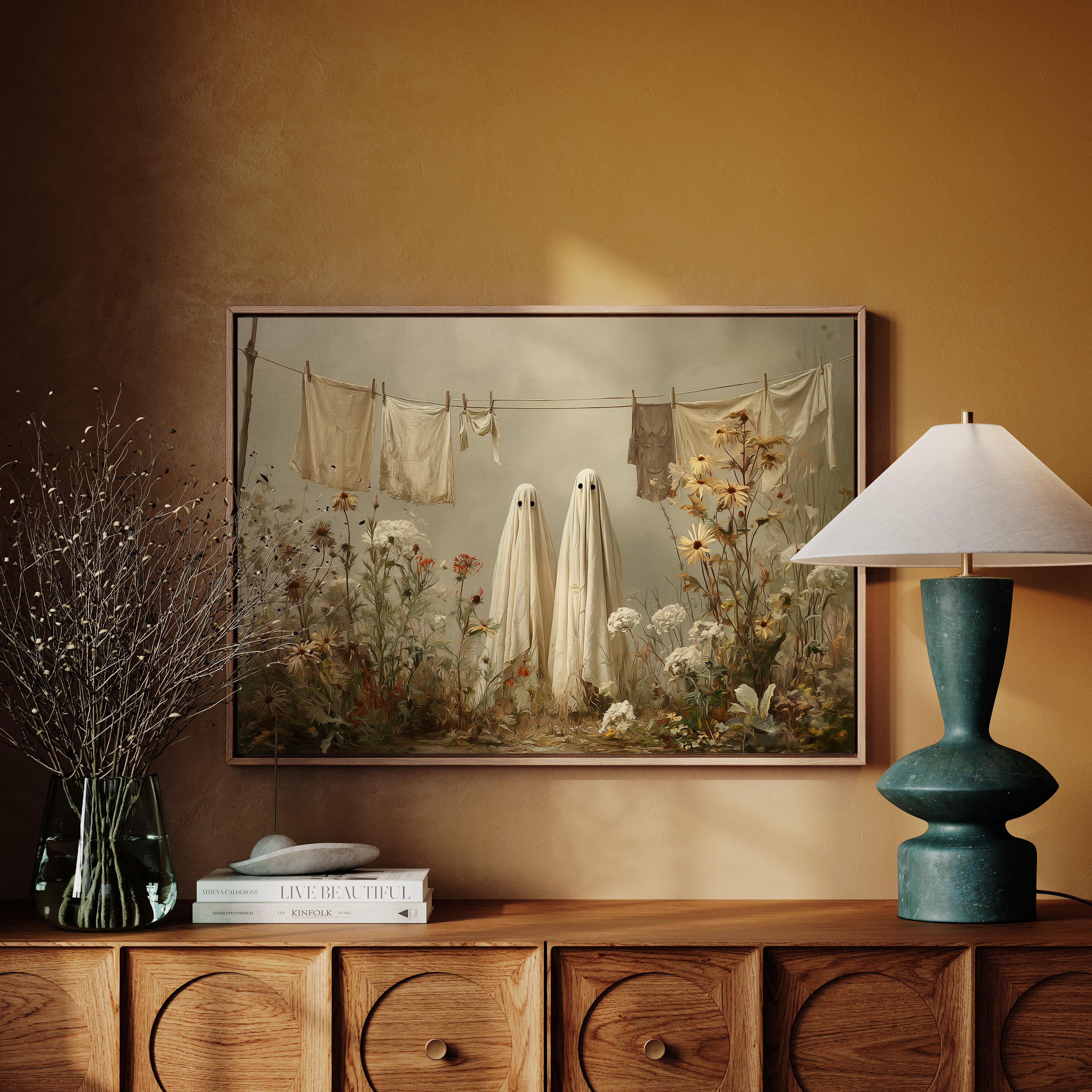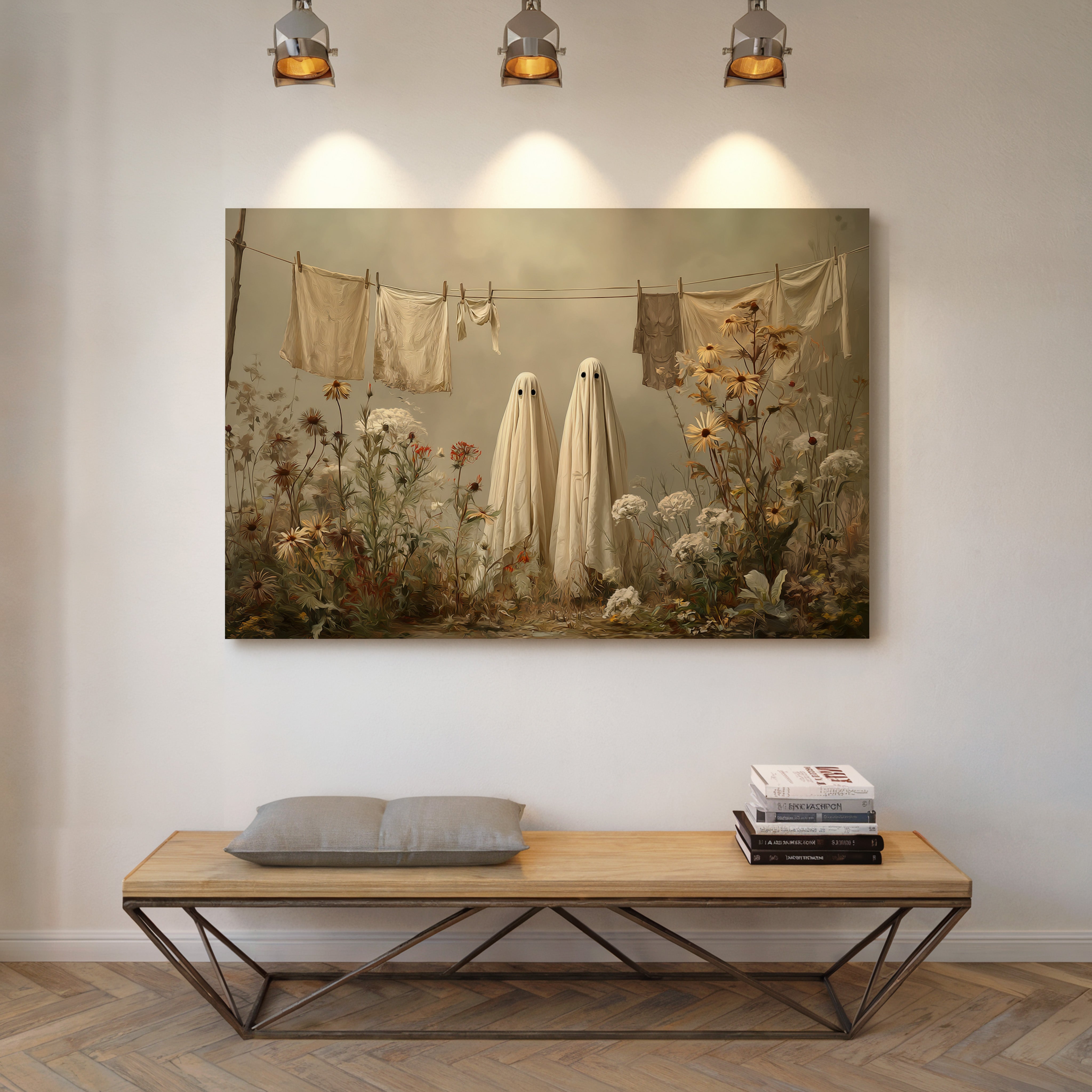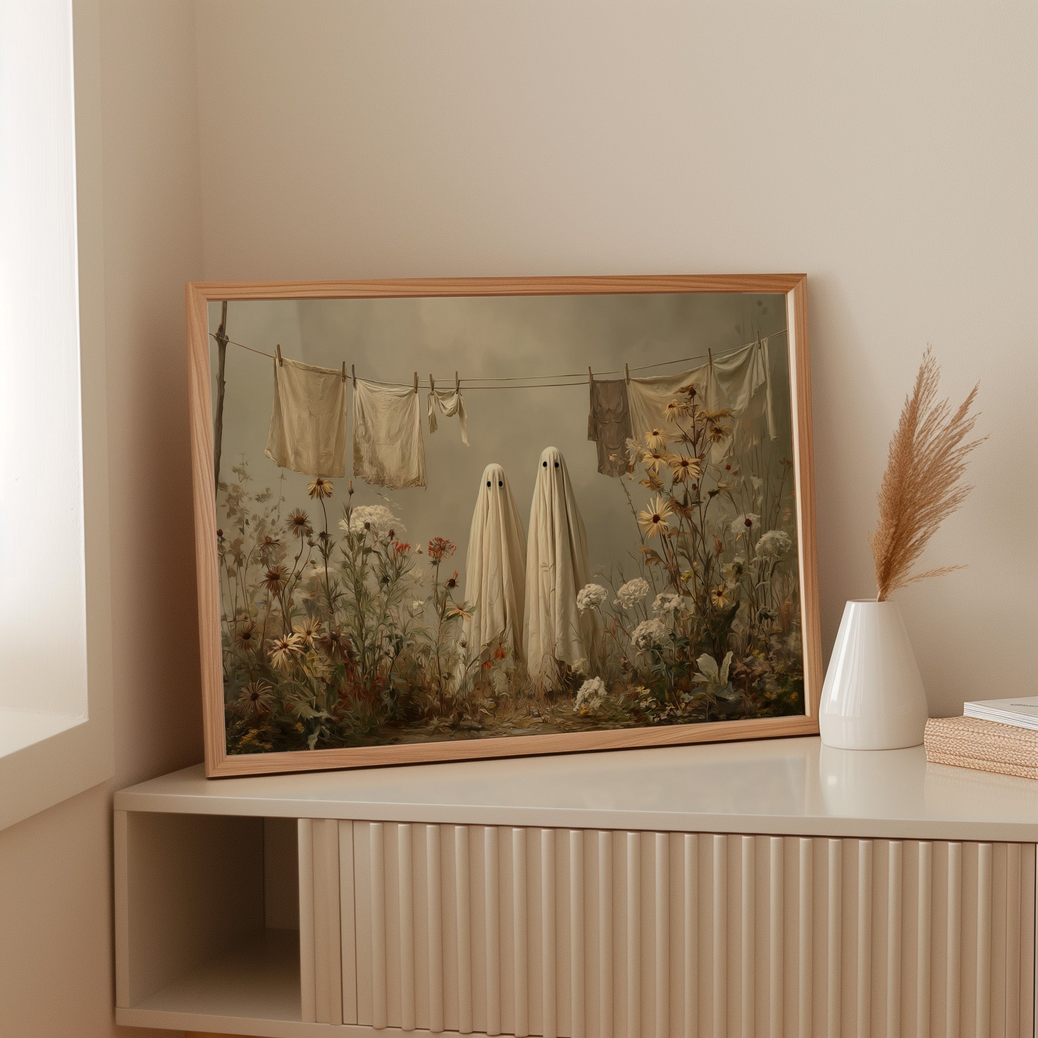 In a whimsical garden scene, two sheet-draped figures stand among wild blooms, creating an oddly charming moment of domestic surrealism. Cream-colored linens dance on the clothesline above, while golden daisies and white carnations tangle at their feet in beautiful disorder. The muted autumn palette and soft lighting cast everything in a dreamy, nostalgic glow, blending the ordinary with the extraordinary. This playful piece turns a simple backyard scene into a magical encounter, where everyday chores meet childhood imagination.