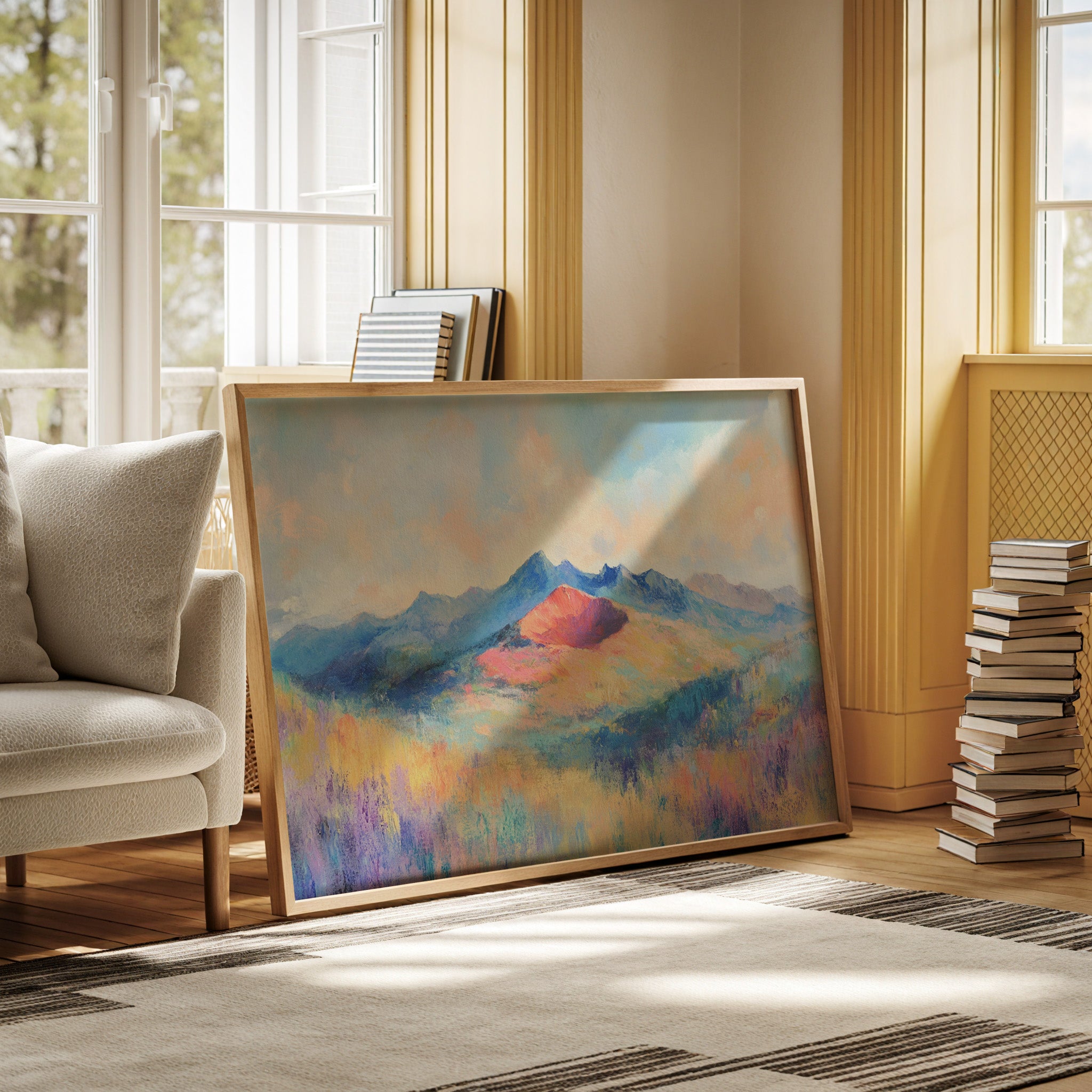 Morning light spills across a dreamy mountain landscape, where lavender meadows stretch toward peaks painted in coral and blue. The scene captures that magical moment when dawn's palette transforms the ordinary into the extraordinary. Brushstrokes of turquoise, purple, and golden yellow create a symphony of color, while the central mountain glows like a jewel caught in nature's spotlight. This ethereal vista invites viewers into a world where reality meets imagination.