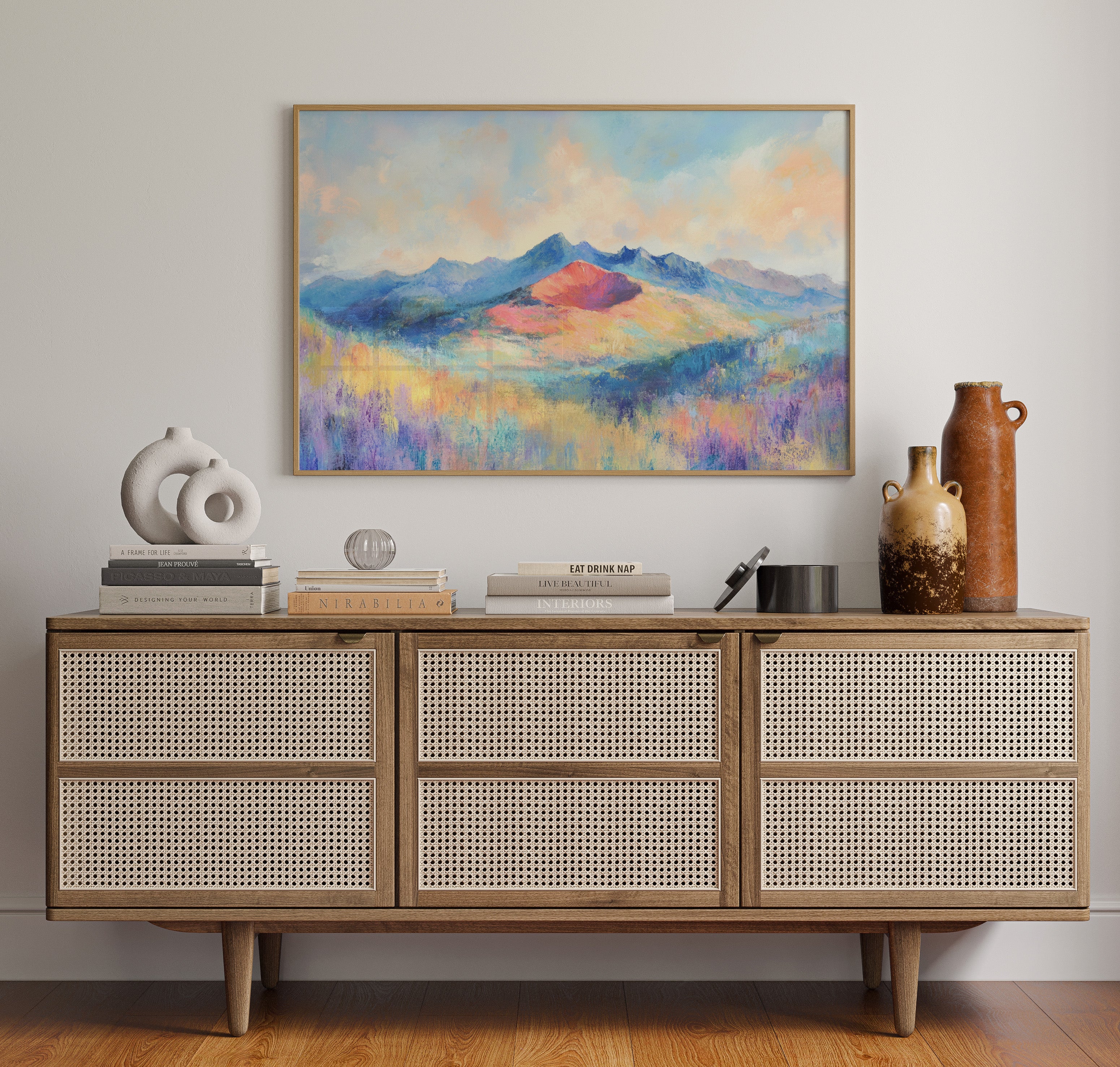 Your artwork should take up 60-75% of wall space above furniture. For standard sofas, choose 24"x36" or larger. When in doubt, go slightly bigger.