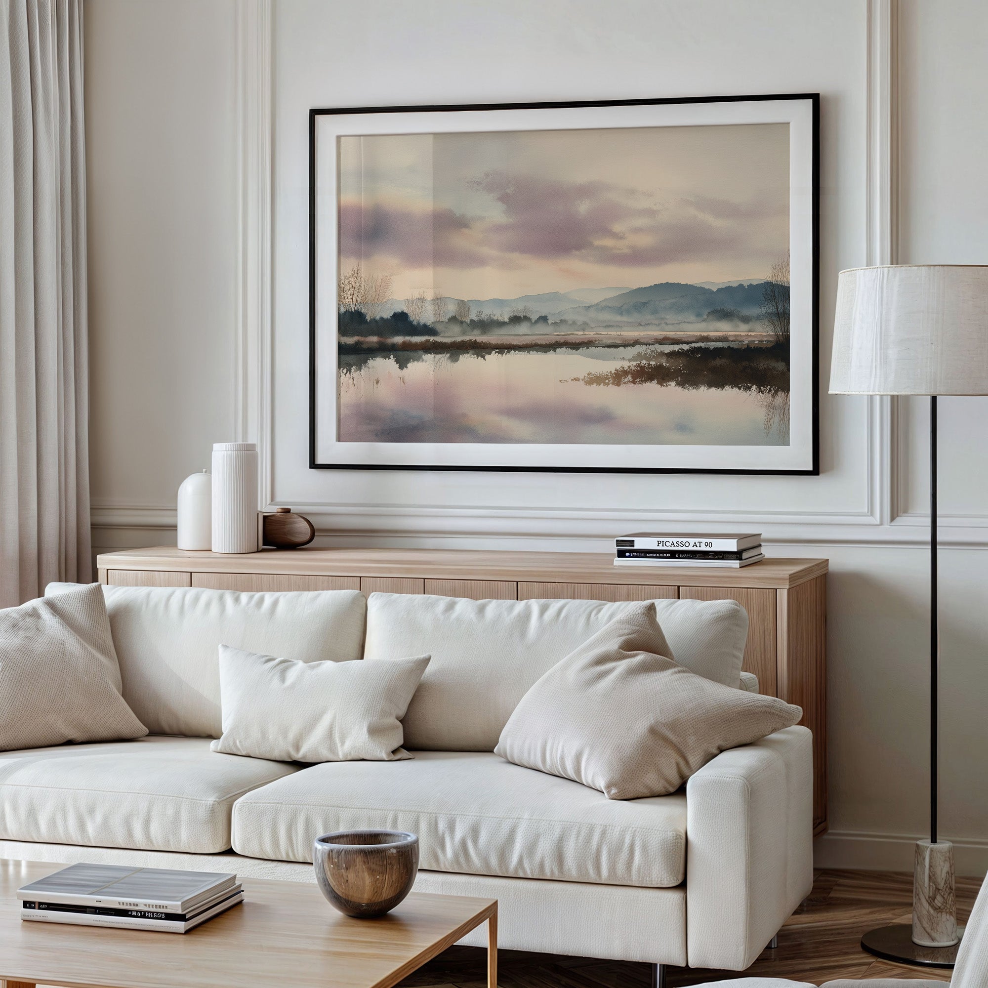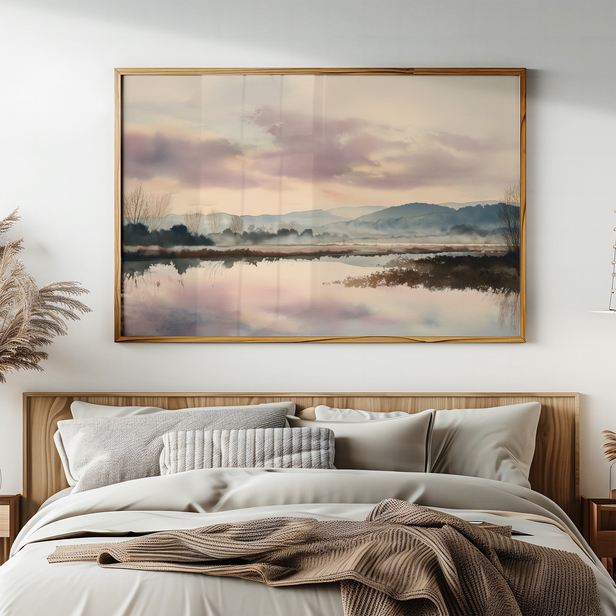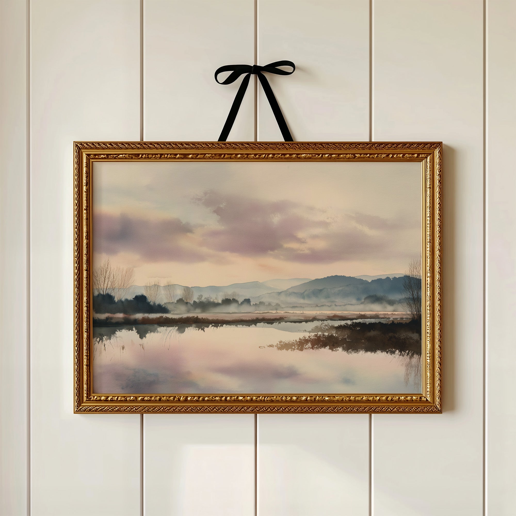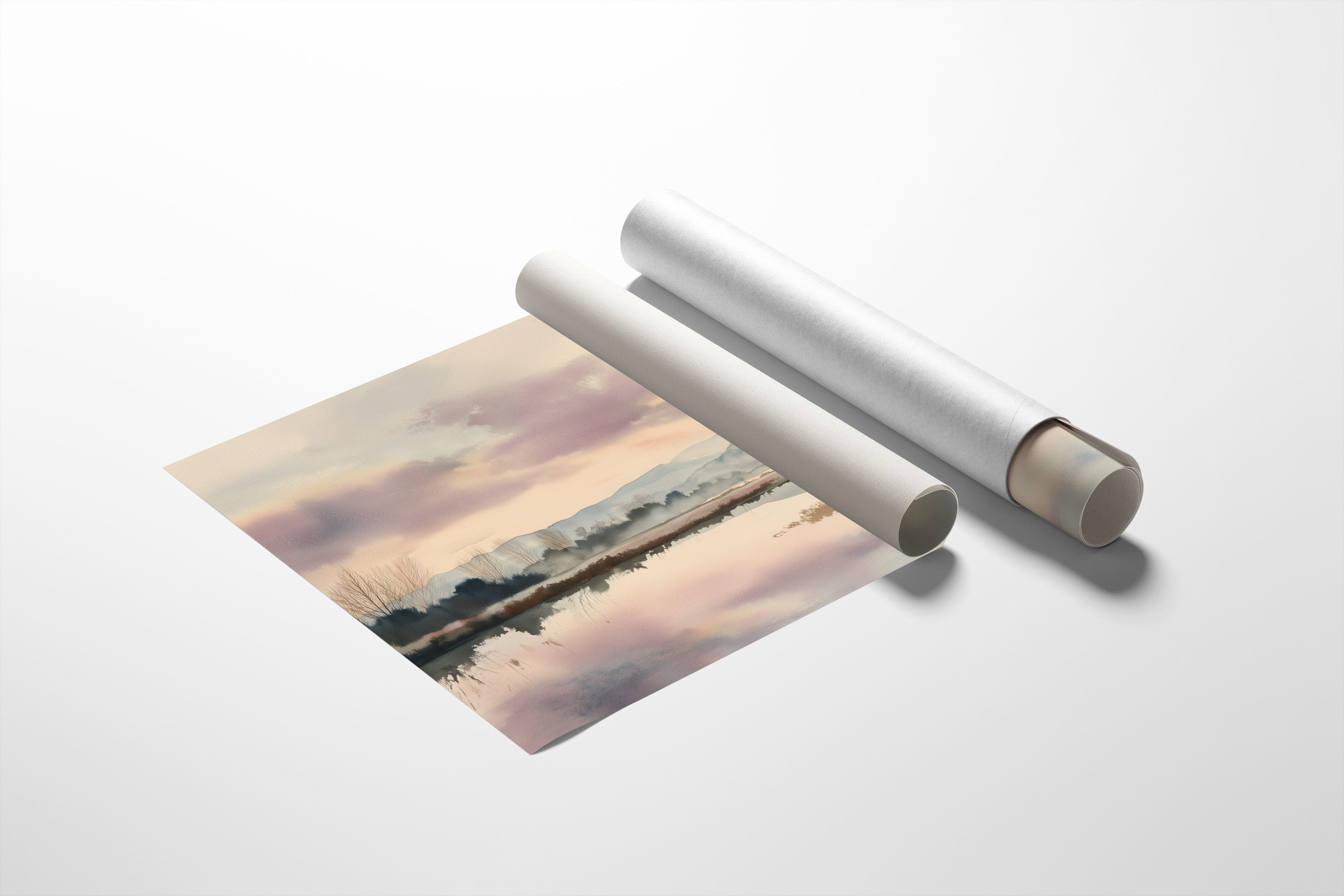 Morning mist hovers like a secret between water and sky, painting the landscape in soft lavender and blush tones. The tranquil lake mirrors the gentle mountains beyond, creating a perfect symmetry where reality blends with reflection. This serene watercolor captures that fleeting moment when the world holds its breath before the day fully awakens.