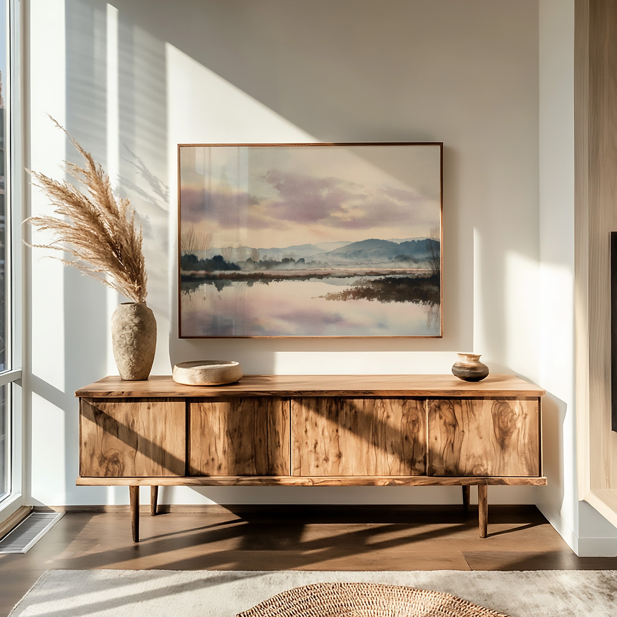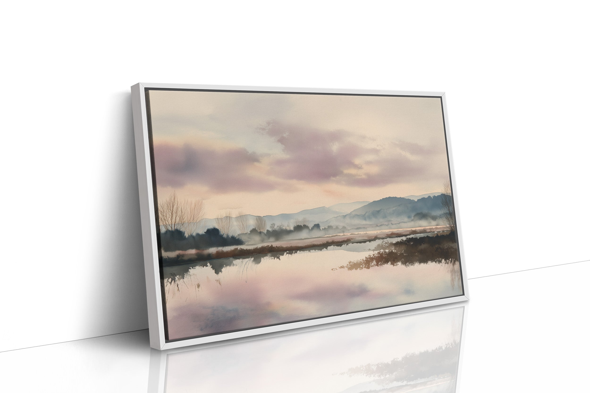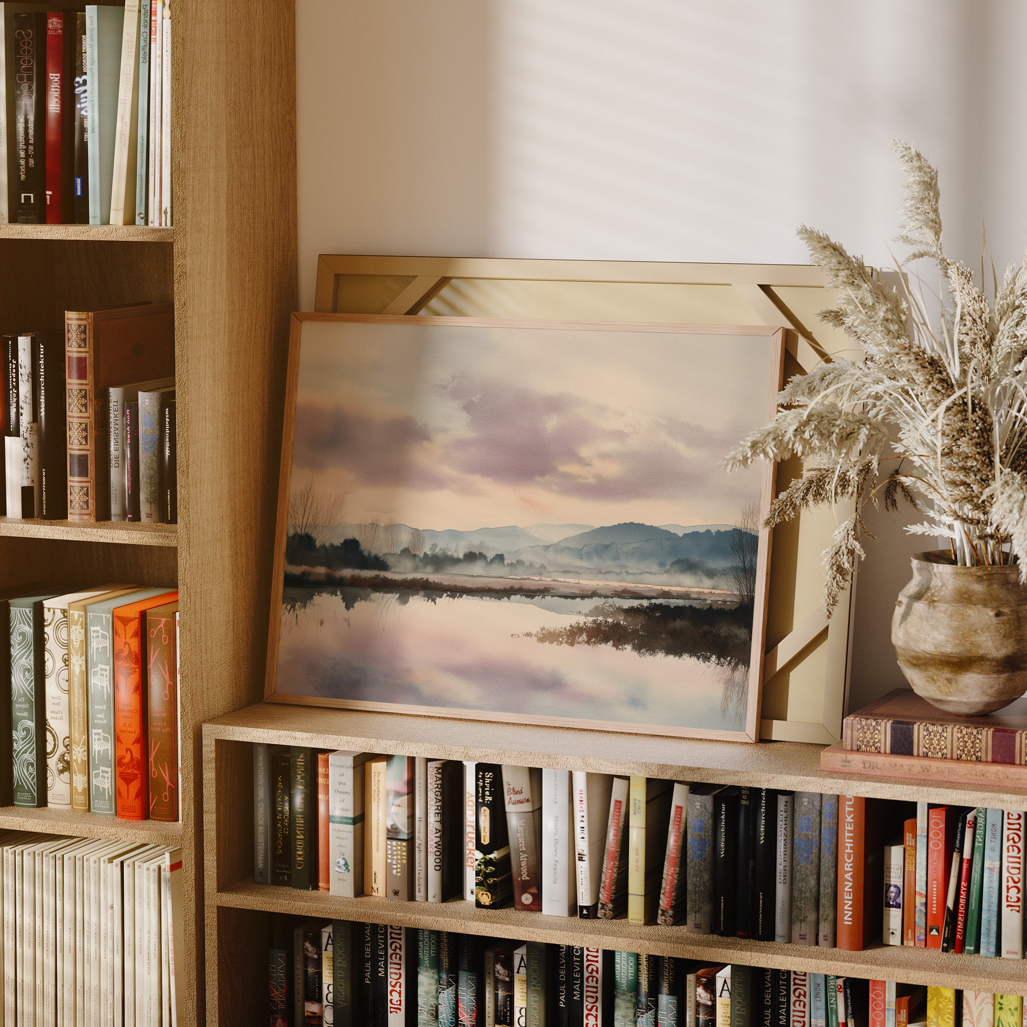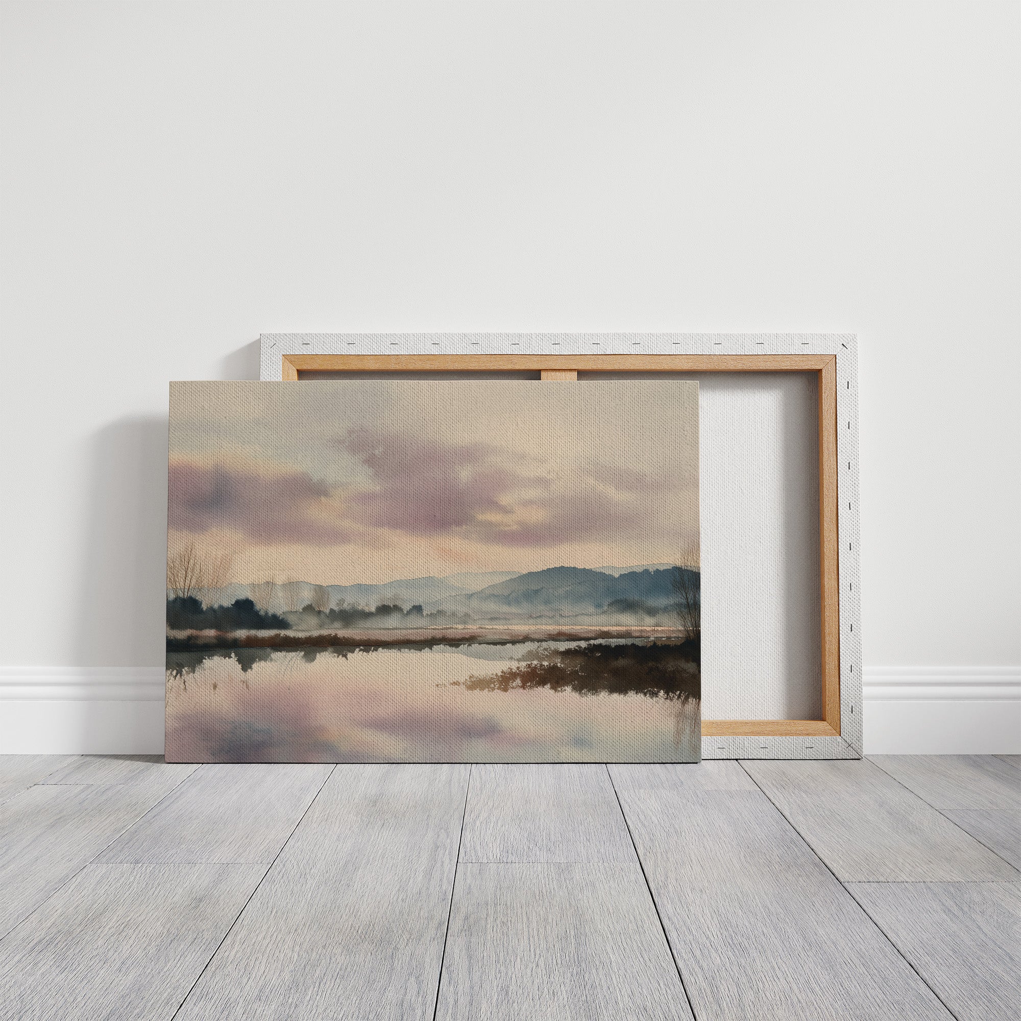 Morning mist hovers like a secret between water and sky, painting the landscape in soft lavender and blush tones. The tranquil lake mirrors the gentle mountains beyond, creating a perfect symmetry where reality blends with reflection. This serene watercolor captures that fleeting moment when the world holds its breath before the day fully awakens.