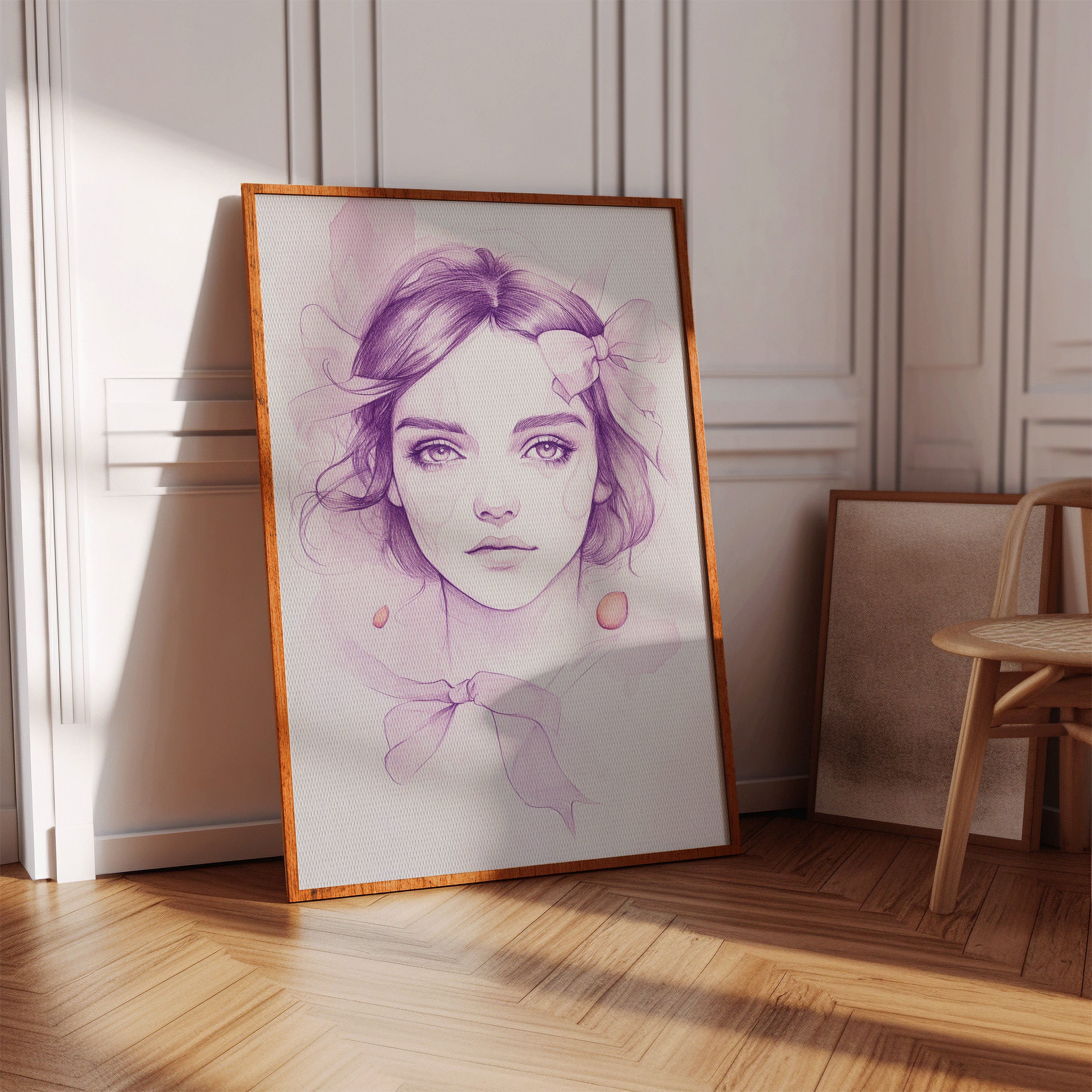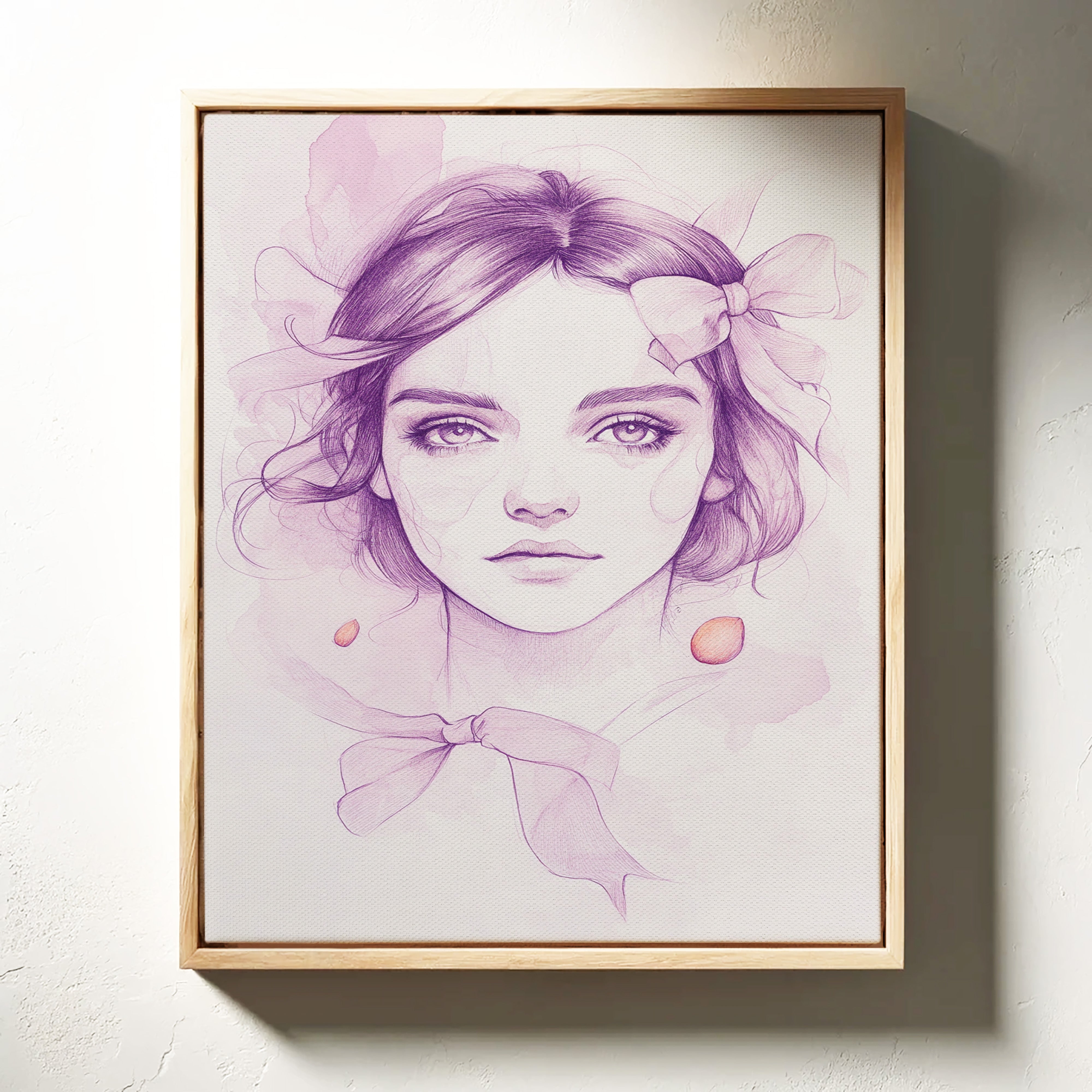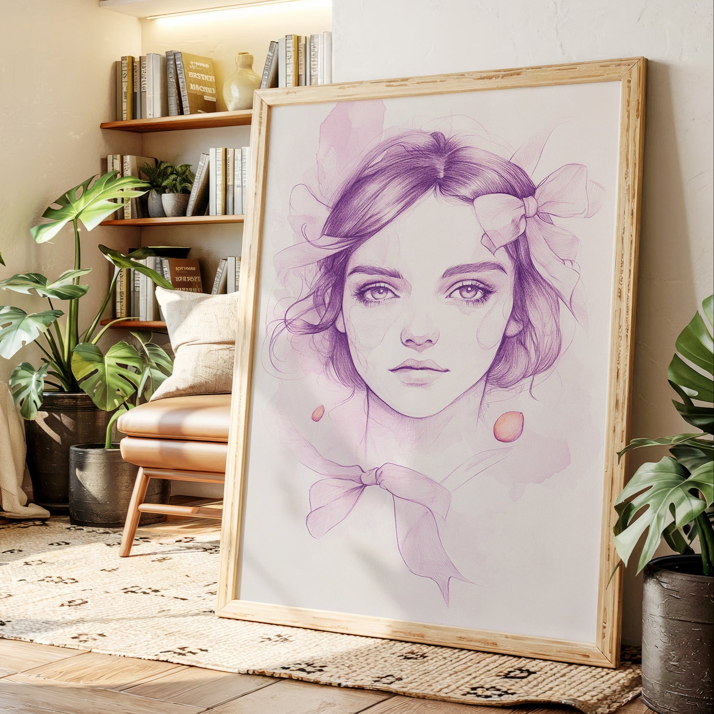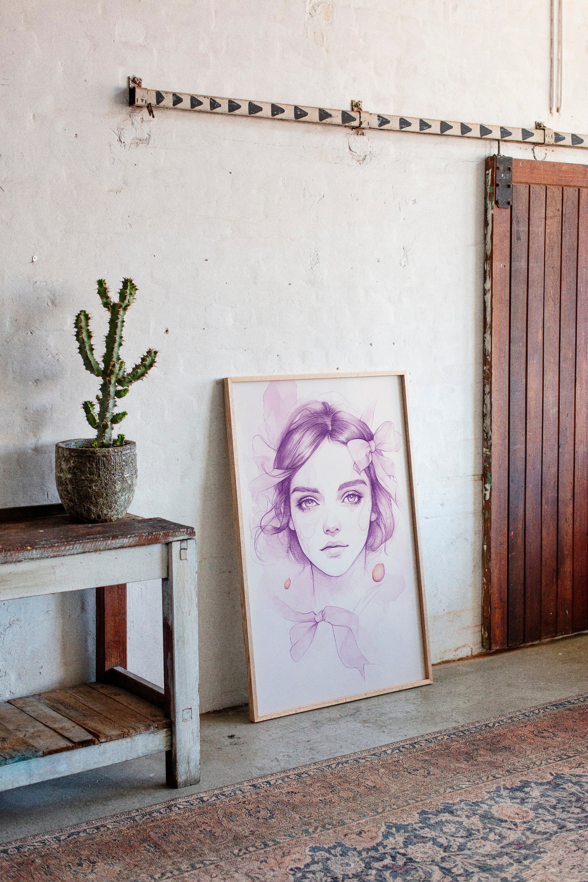Delicate purple strokes dance across pristine paper, creating an ethereal portrait that captures both strength and softness. The illustration flows with graceful linework, highlighted by subtle watercolor washes in varying shades of lavender and hints of coral. Ribbons frame the composition with elegant bows, while loose strands of hair suggest movement and spontaneity. This contemporary piece would bring a sophisticated feminine energy to a modern bedroom, powder room, or creative studio space.