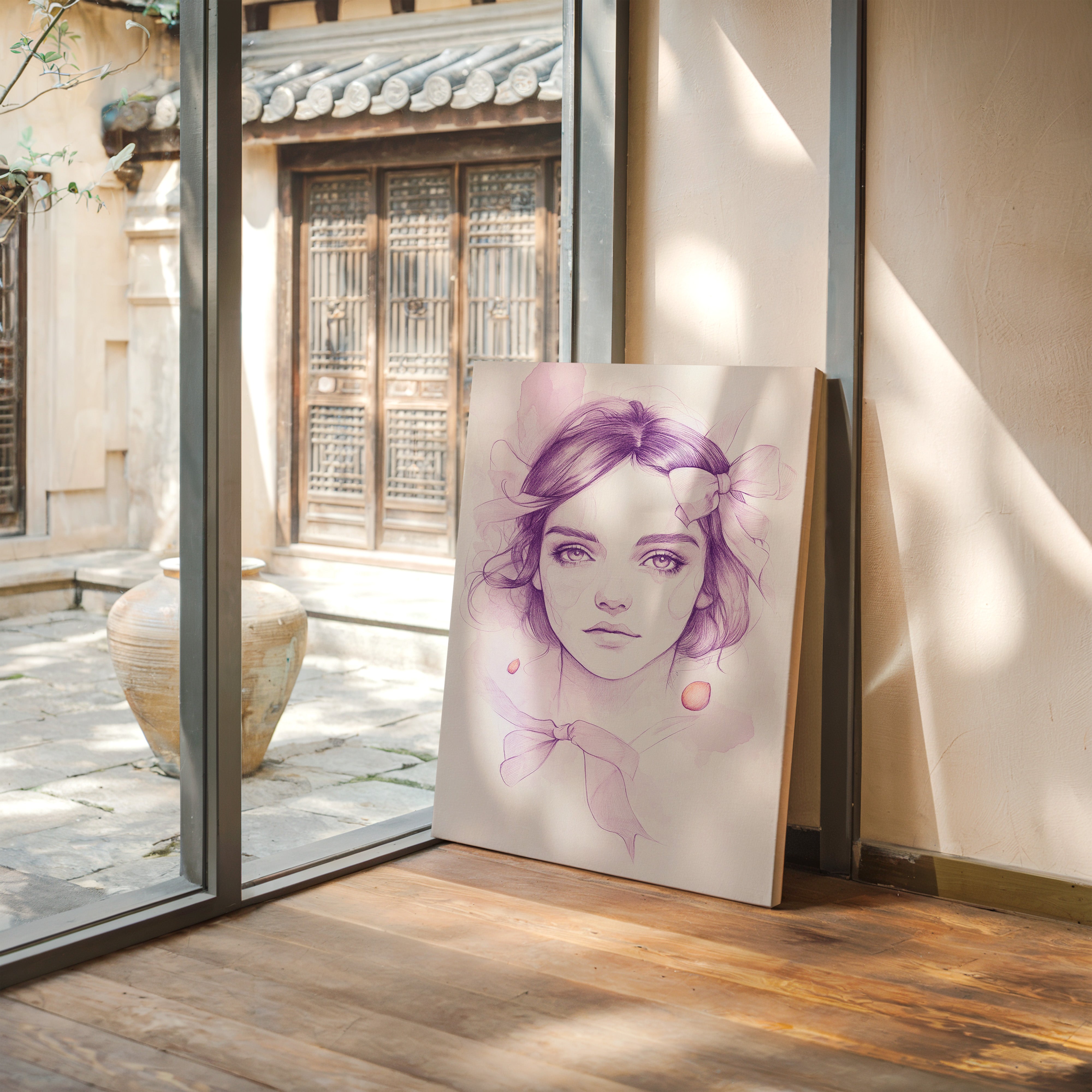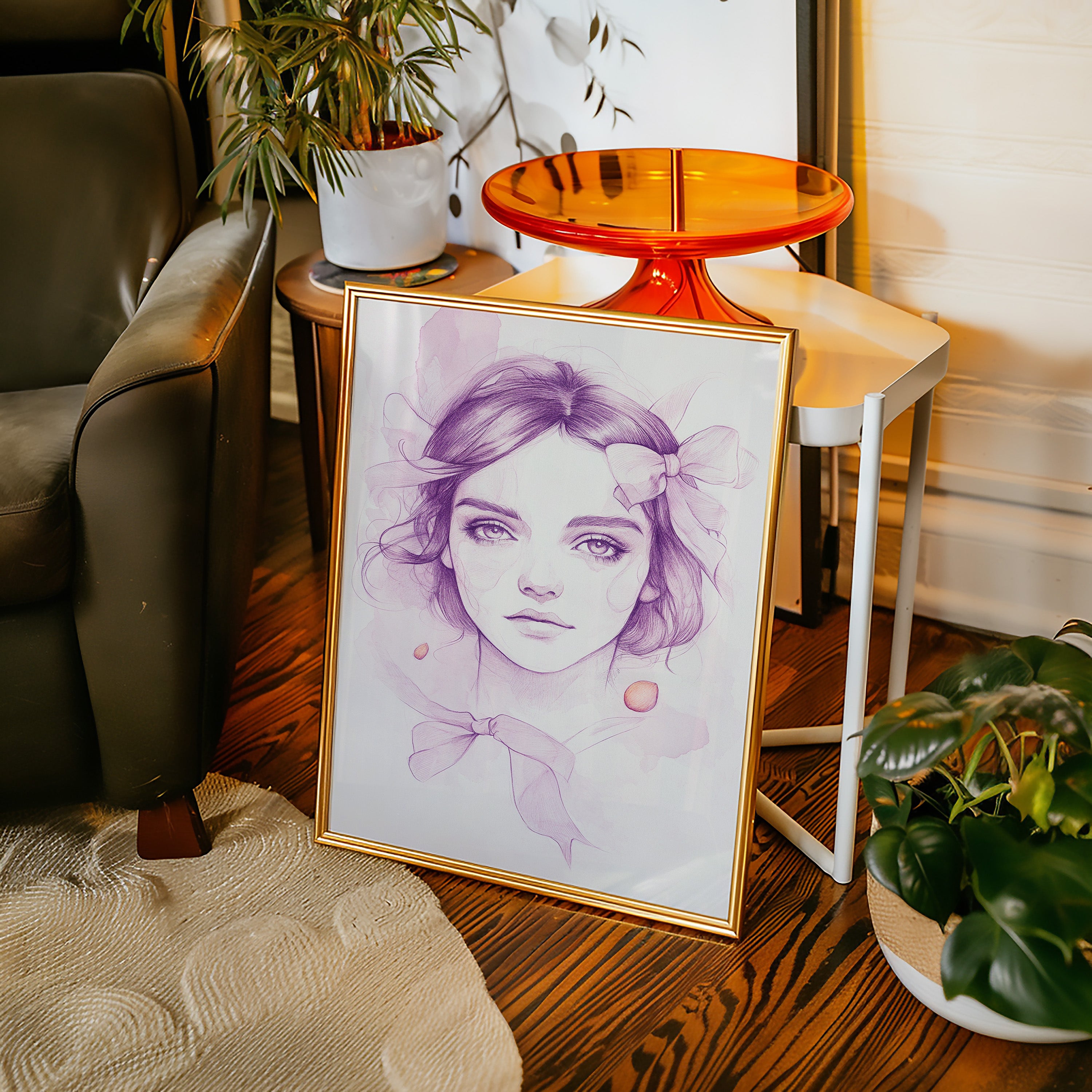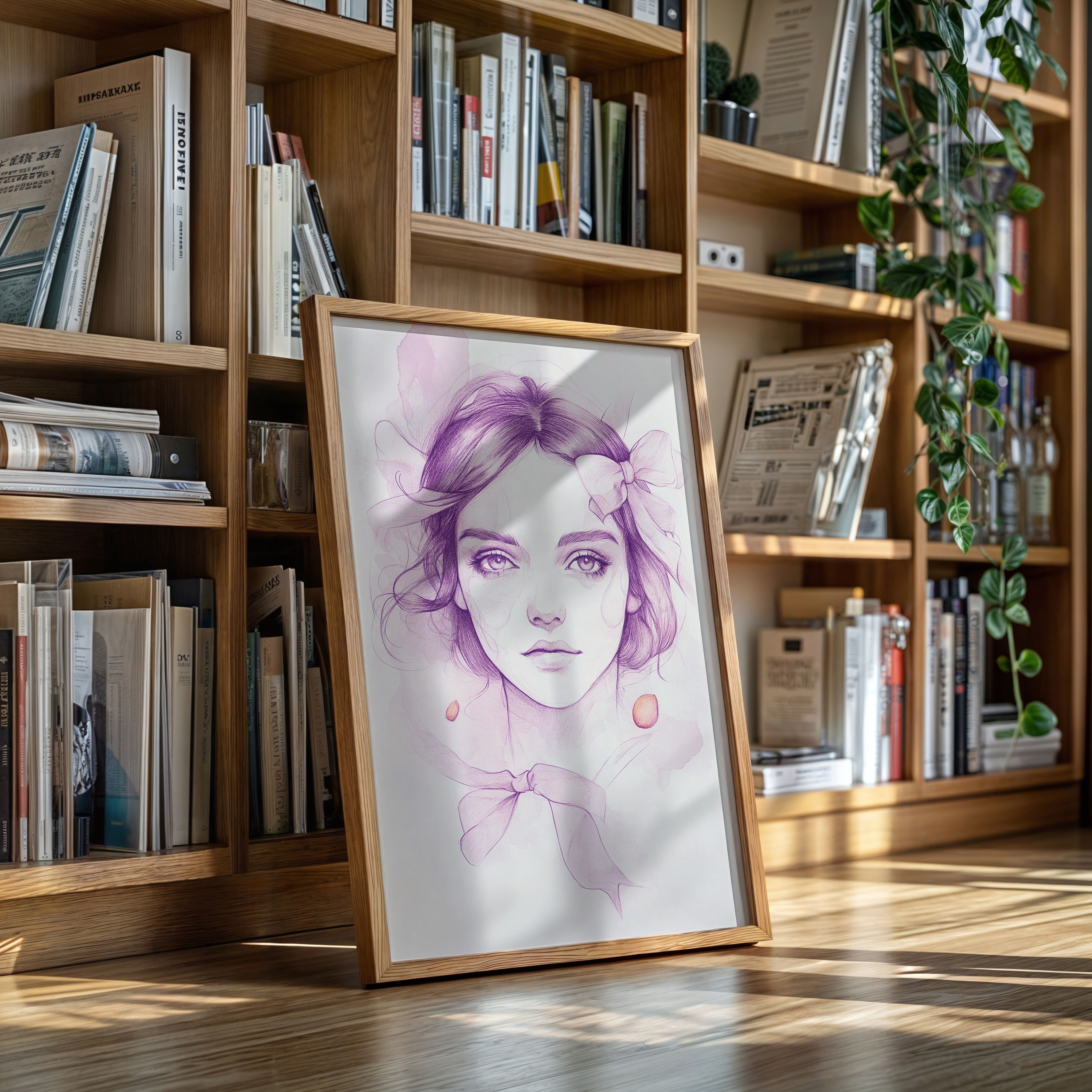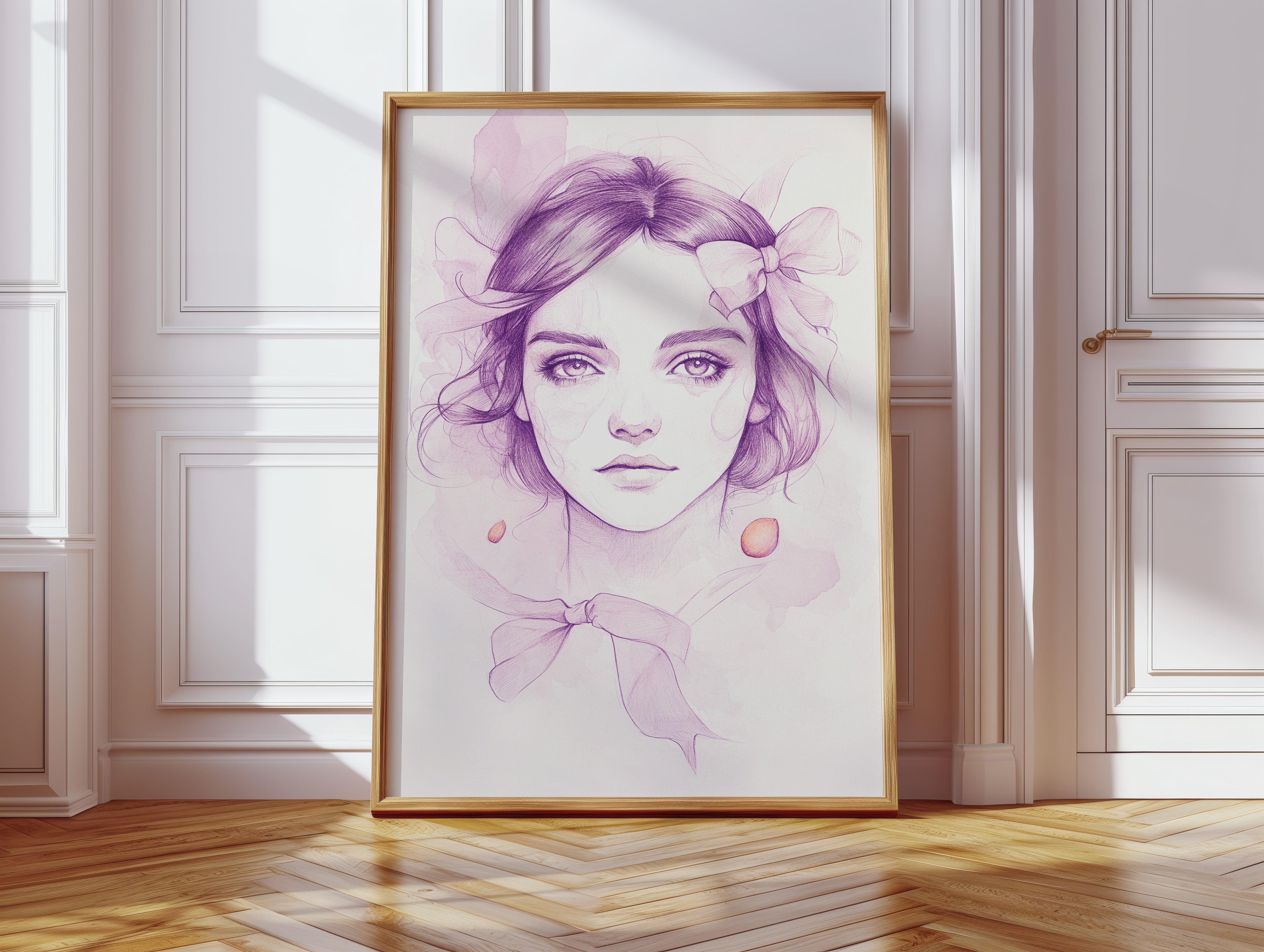 Delicate purple strokes dance across pristine paper, creating an ethereal portrait that captures both strength and softness. The illustration flows with graceful linework, highlighted by subtle watercolor washes in varying shades of lavender and hints of coral. Ribbons frame the composition with elegant bows, while loose strands of hair suggest movement and spontaneity. This contemporary piece would bring a sophisticated feminine energy to a modern bedroom, powder room, or creative studio space.