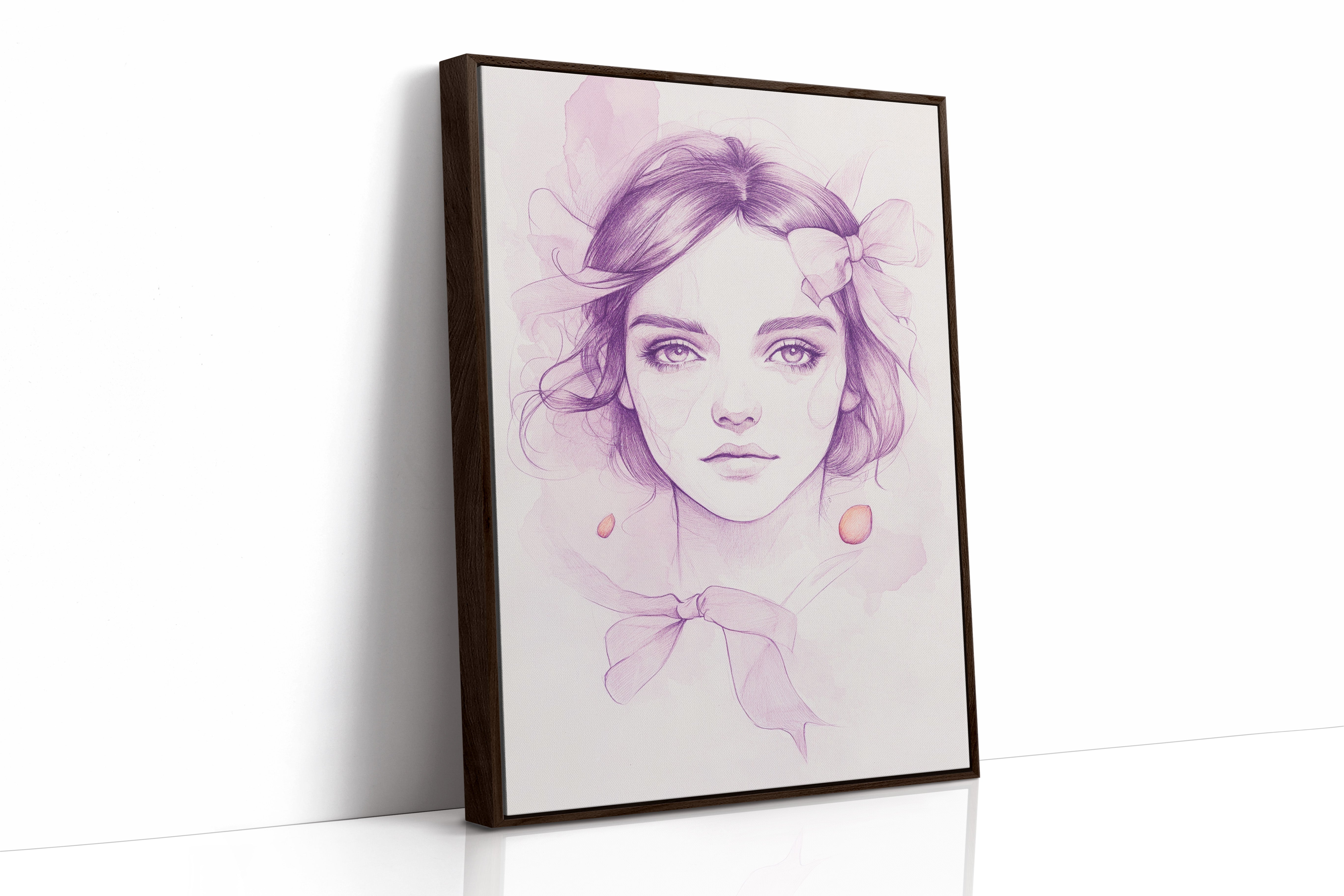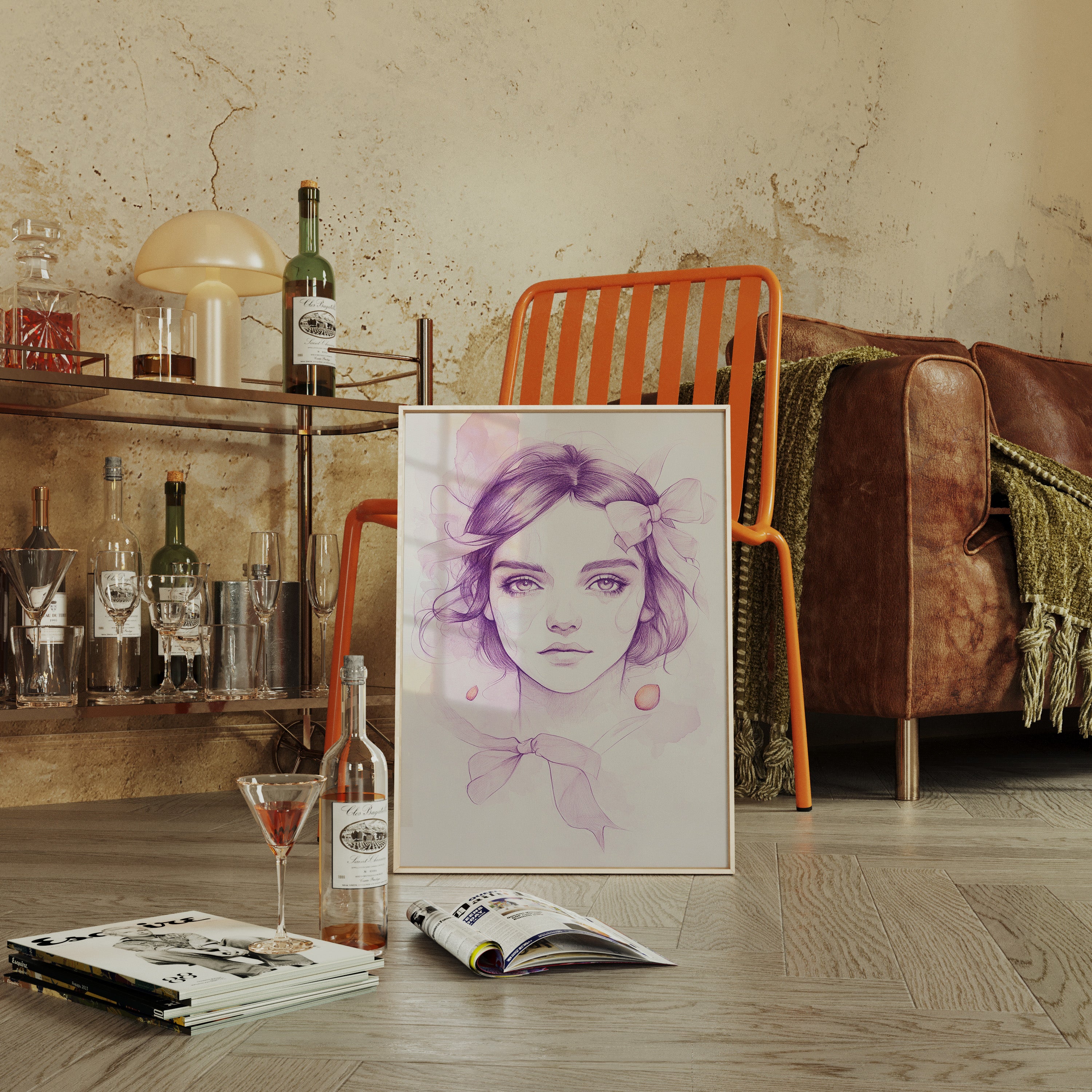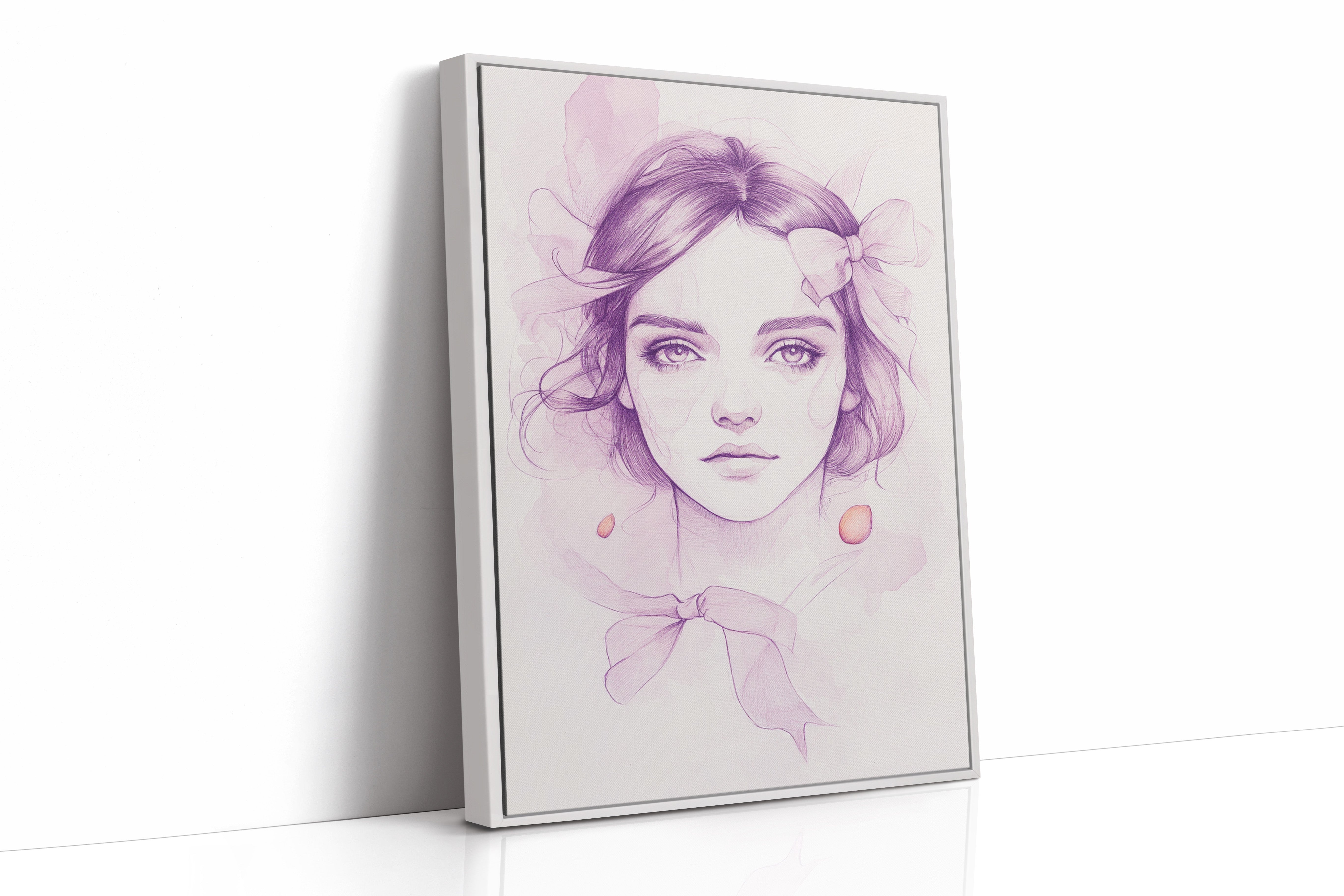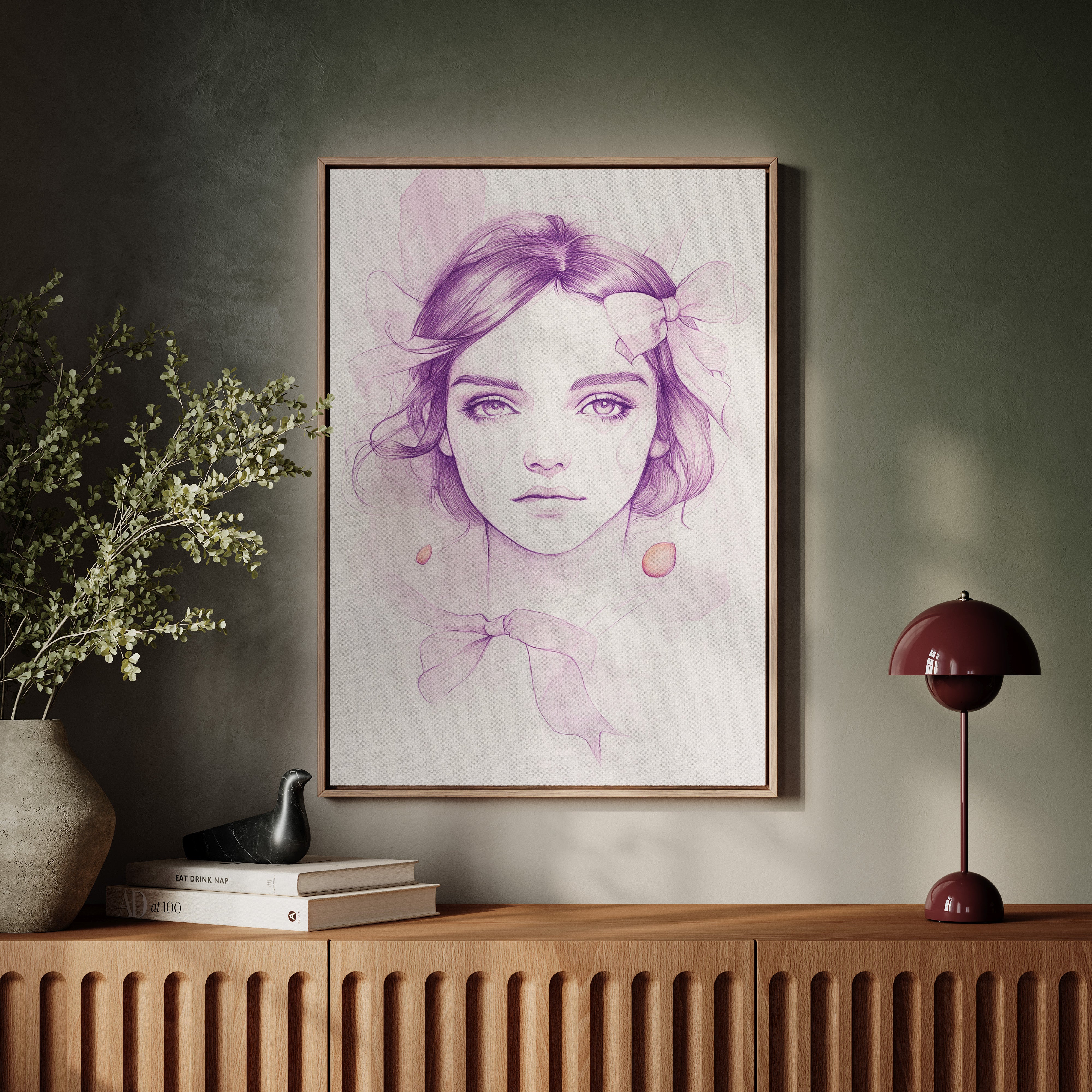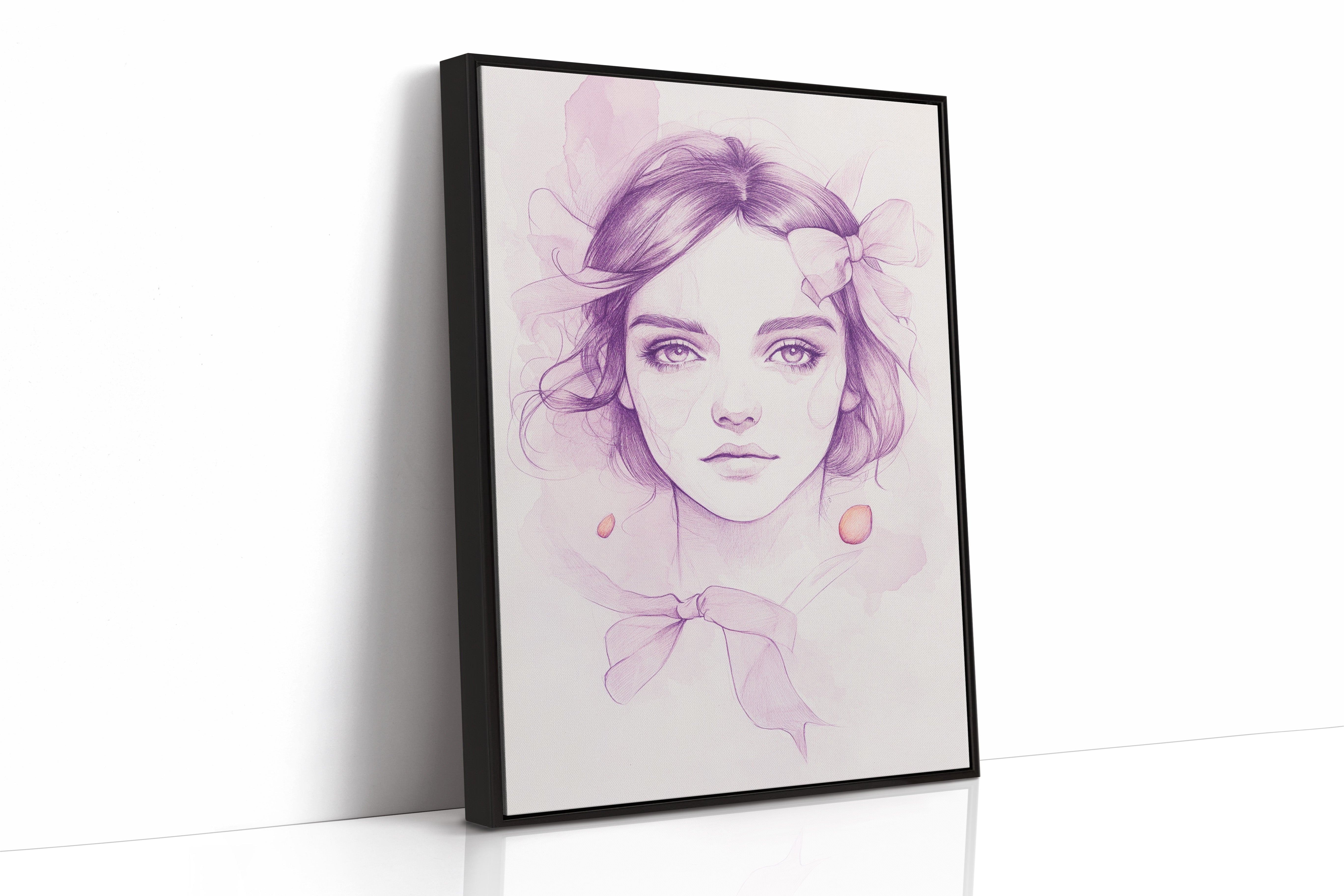 Delicate purple strokes dance across pristine paper, creating an ethereal portrait that captures both strength and softness. The illustration flows with graceful linework, highlighted by subtle watercolor washes in varying shades of lavender and hints of coral. Ribbons frame the composition with elegant bows, while loose strands of hair suggest movement and spontaneity. This contemporary piece would bring a sophisticated feminine energy to a modern bedroom, powder room, or creative studio space.