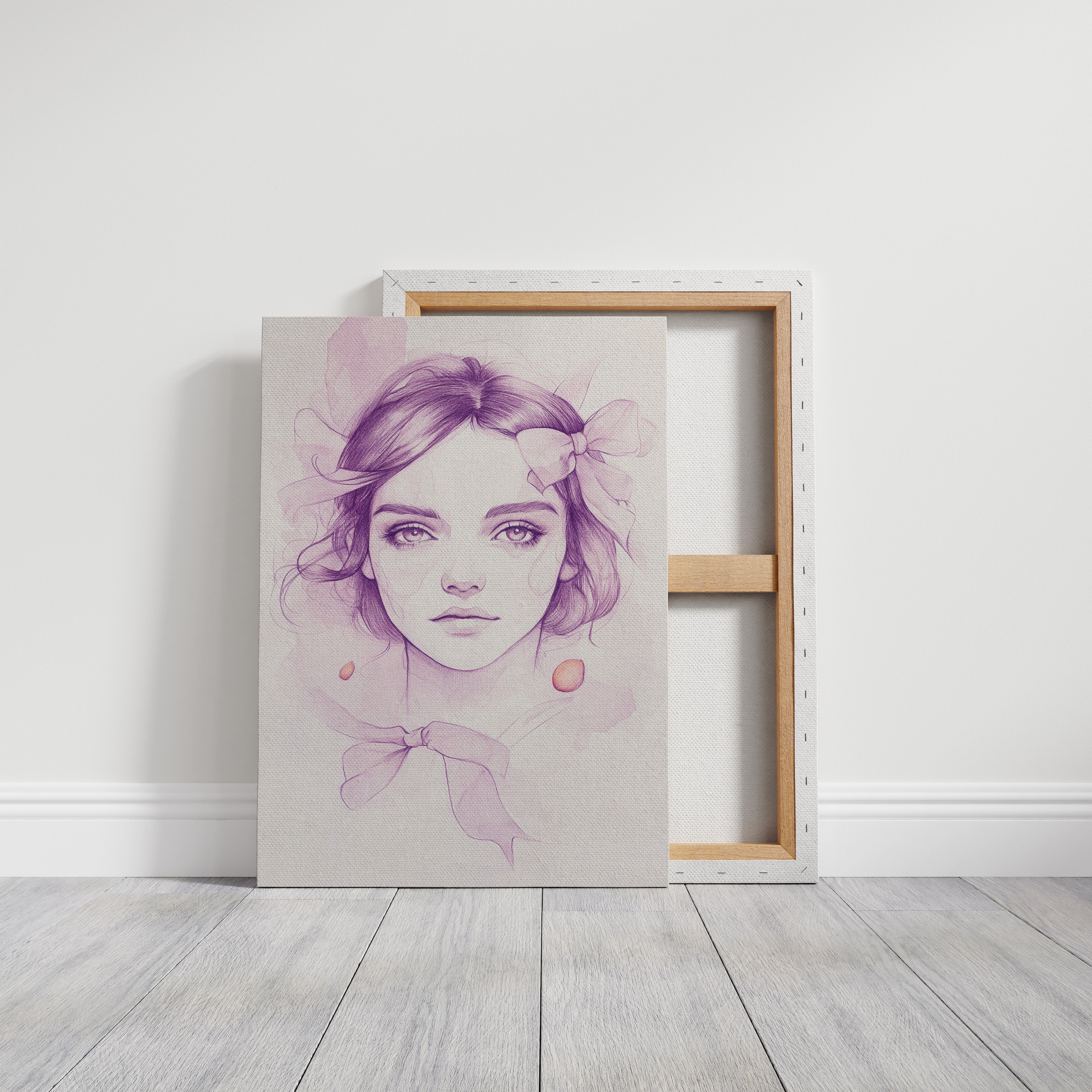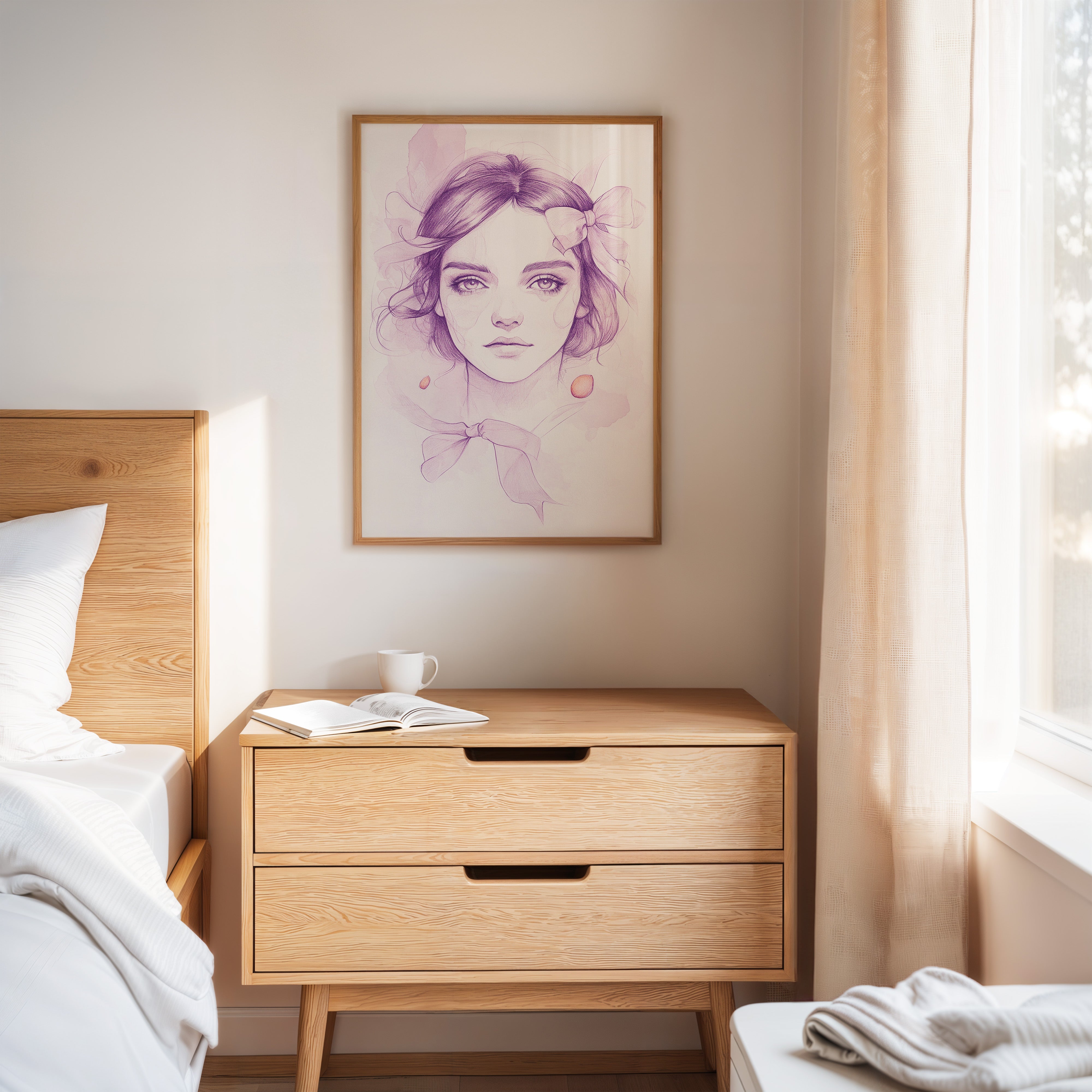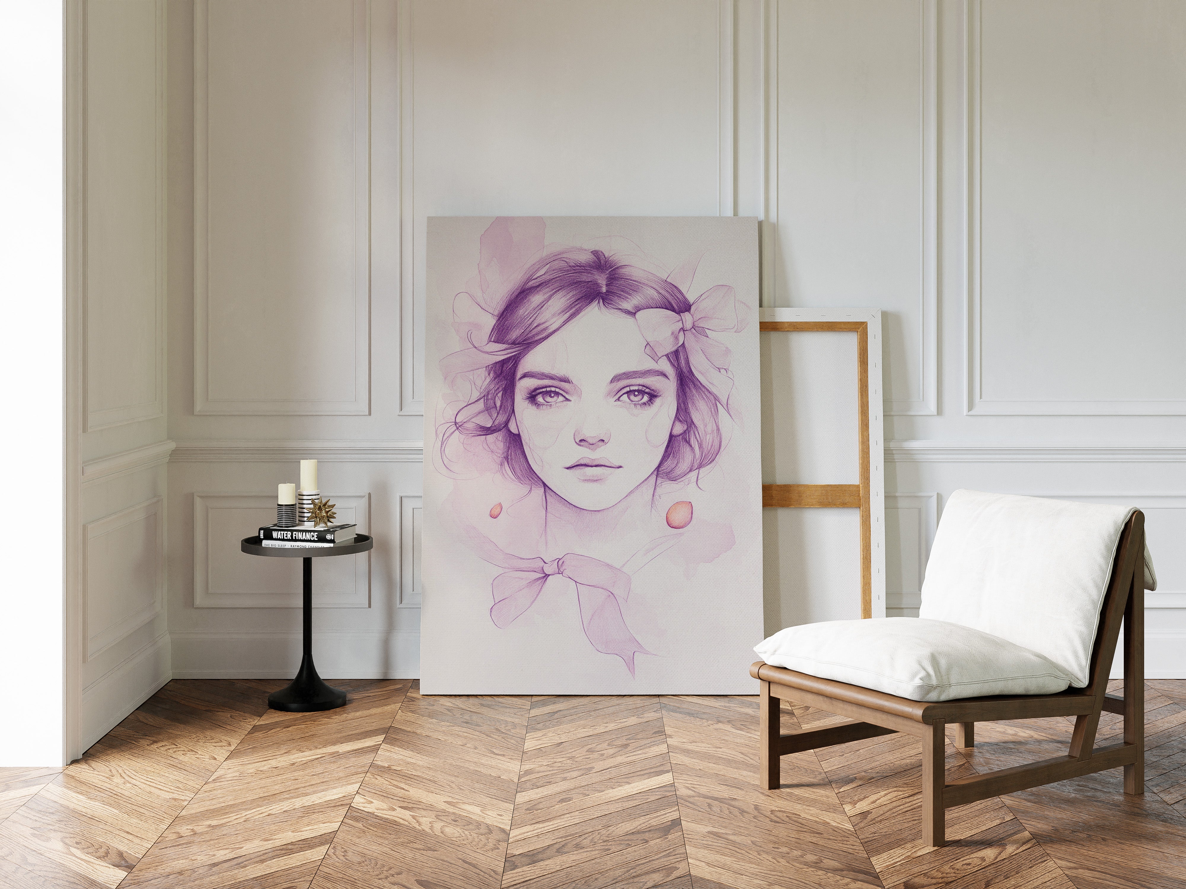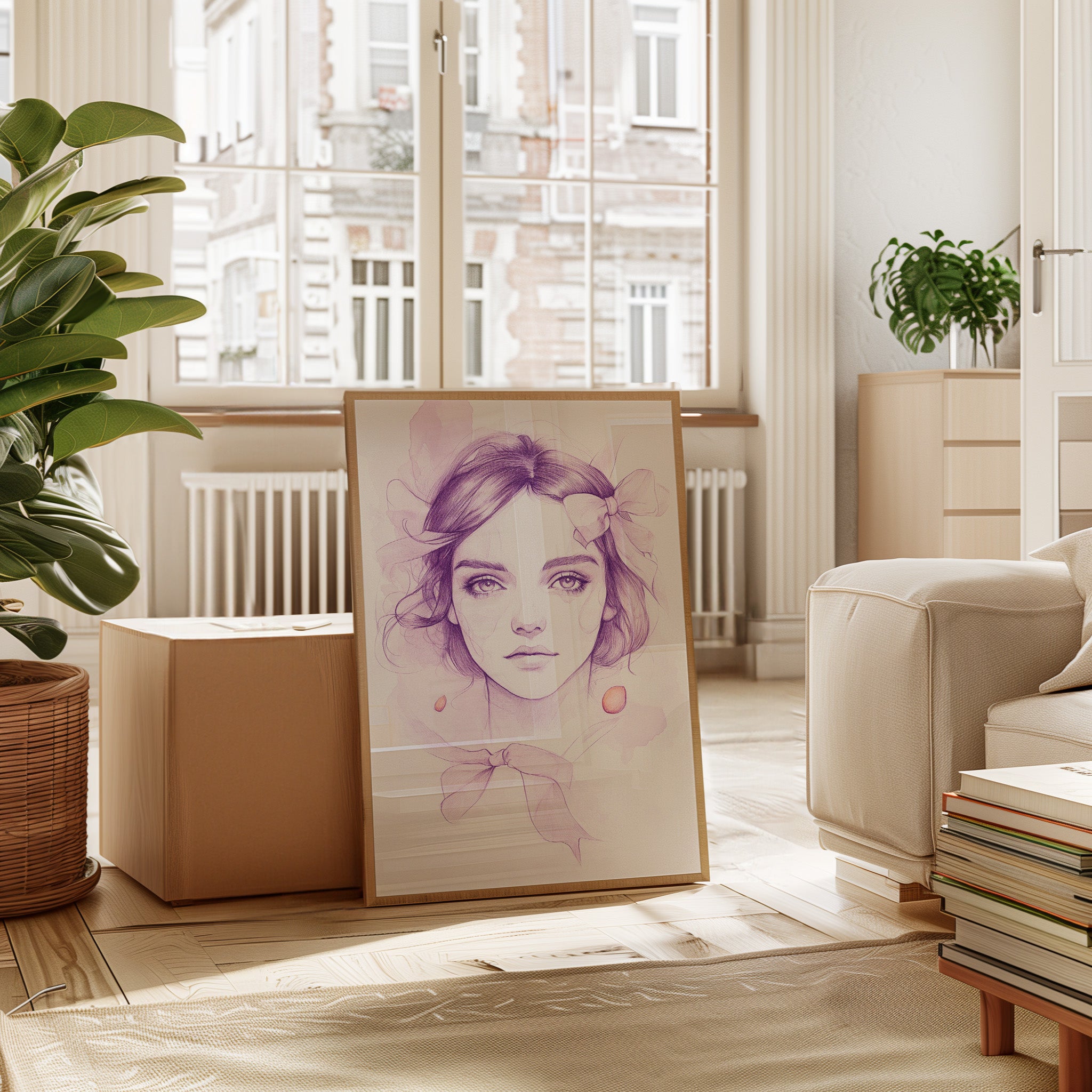 Delicate purple strokes dance across pristine paper, creating an ethereal portrait that captures both strength and softness. The illustration flows with graceful linework, highlighted by subtle watercolor washes in varying shades of lavender and hints of coral. Ribbons frame the composition with elegant bows, while loose strands of hair suggest movement and spontaneity. This contemporary piece would bring a sophisticated feminine energy to a modern bedroom, powder room, or creative studio space.