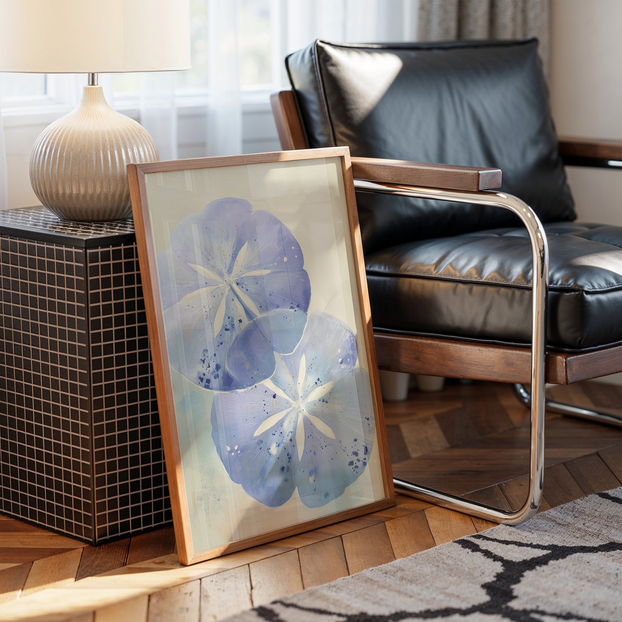 A delicate contemporary painting featuring two stylized sand dollar forms rendered in soft lavender and periwinkle blue hues against a neutral beige background. The circular shapes showcase intricate star patterns at their centers, with subtle speckles of deeper blue scattered across their surfaces.