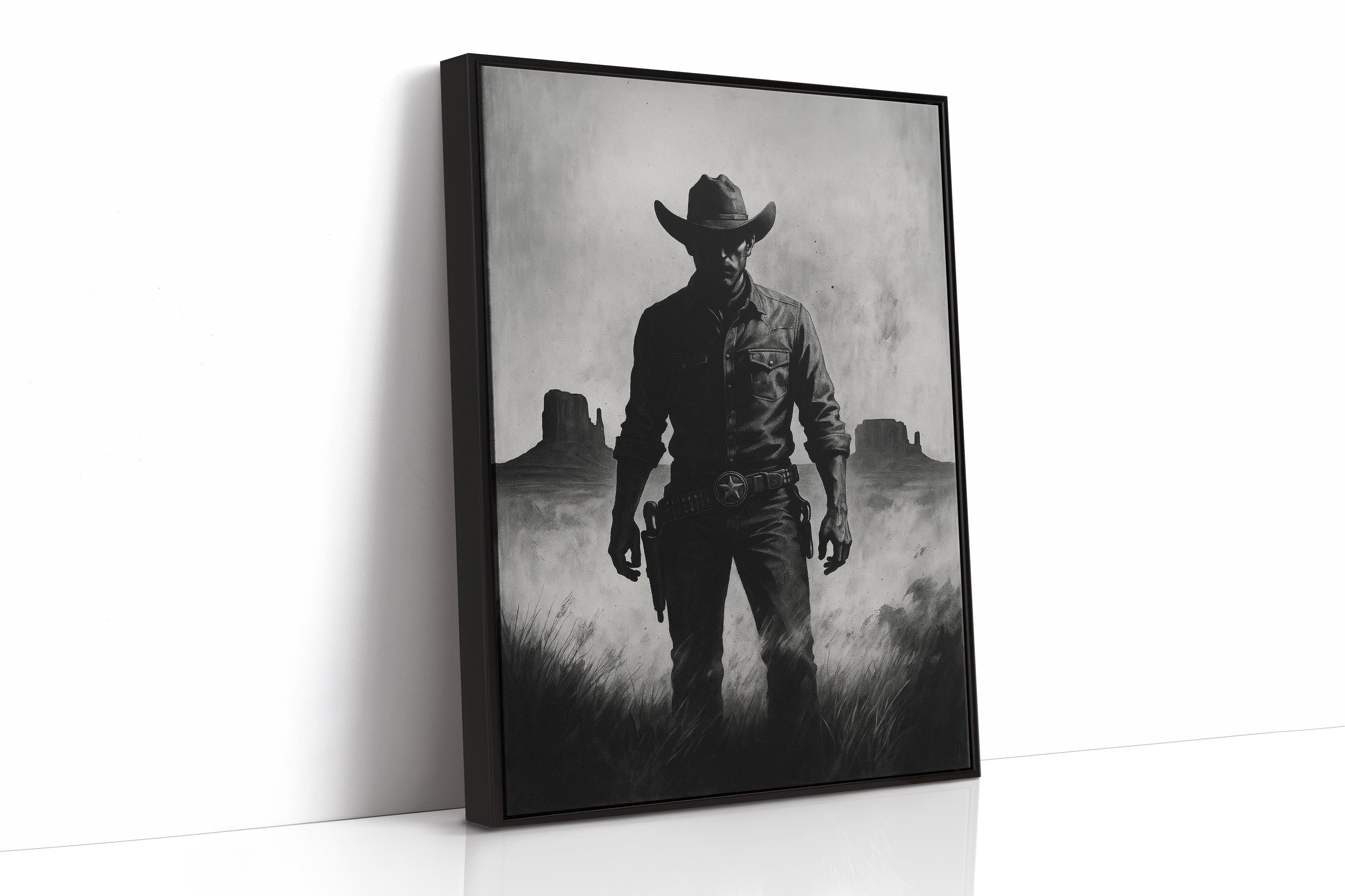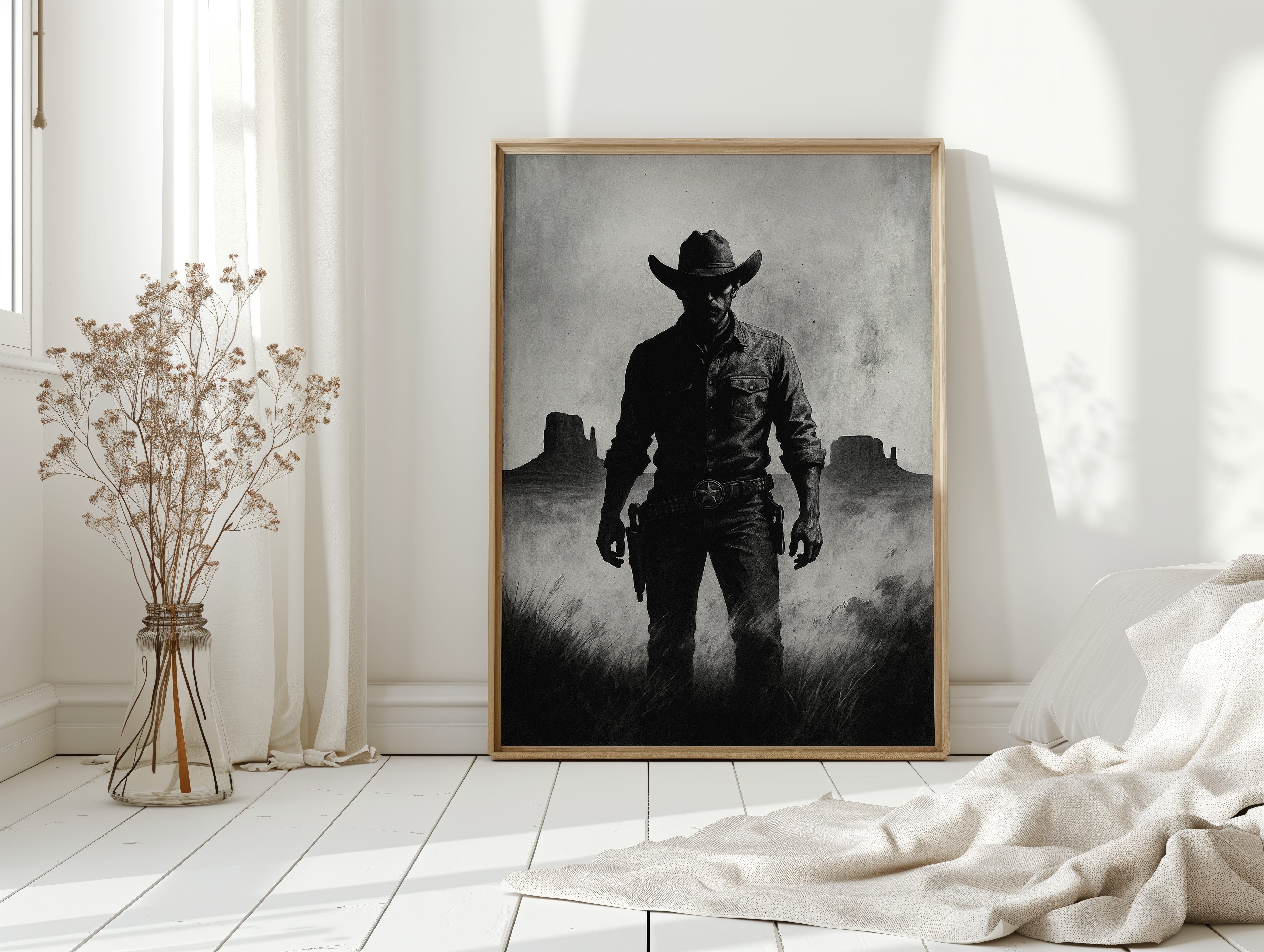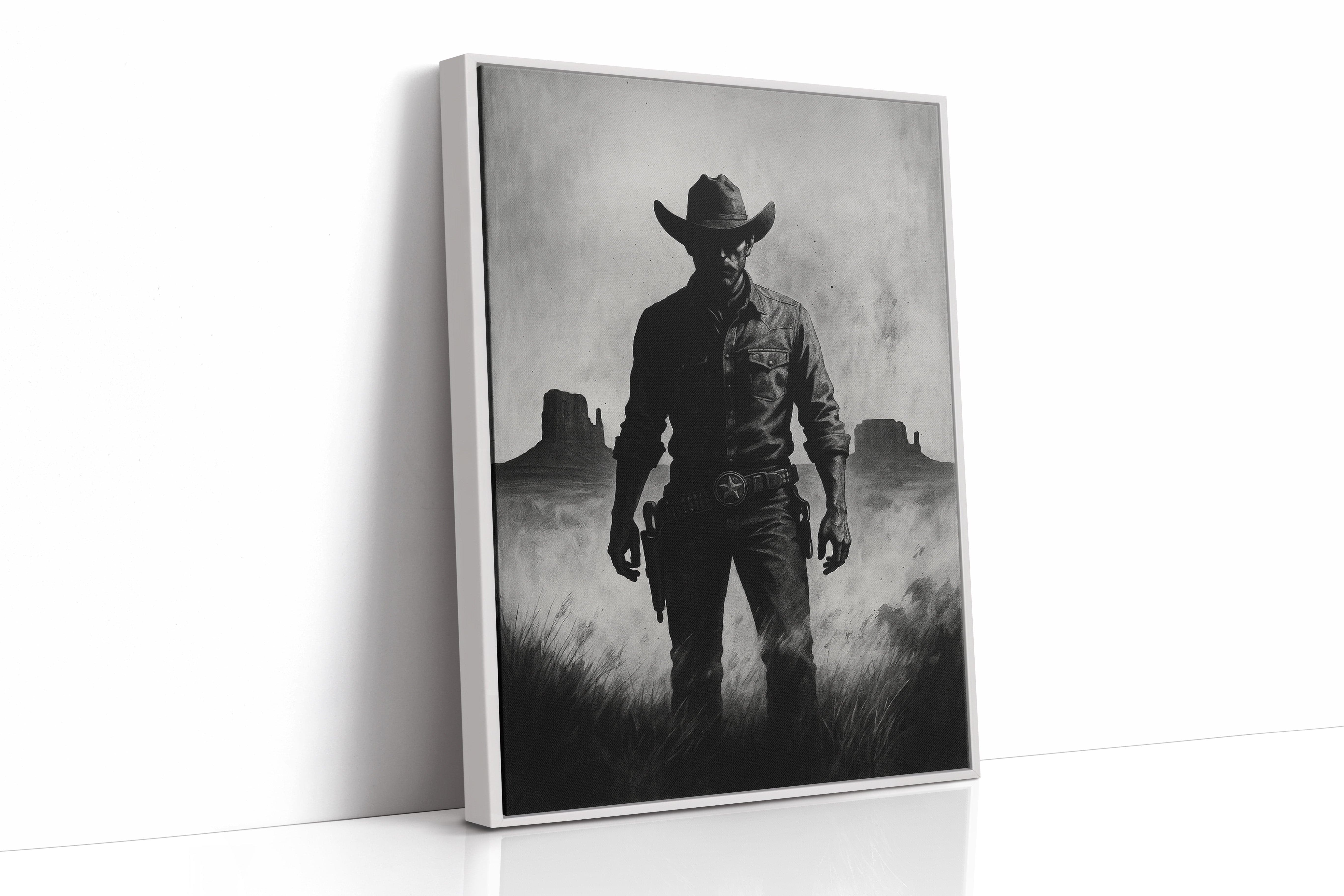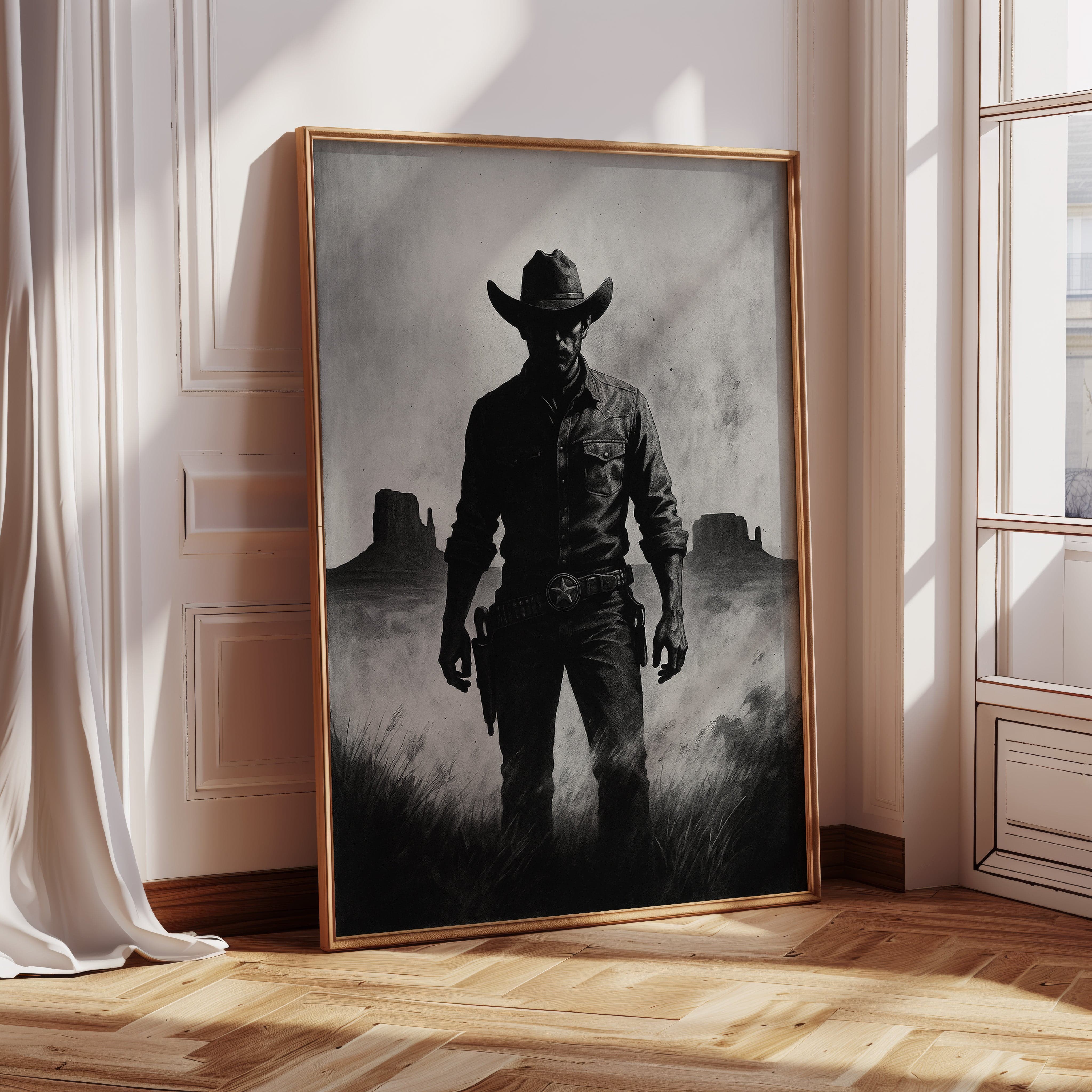 Stand your ground with Law of the Land, a bold black-and-white illustration capturing the formidable silhouette of a Western sheriff. With Monument Valley rising in the distance and a badge shining at his hip, this piece evokes authority, grit, and the dusty edge of justice in the Old West. A striking addition to noir Western décor or collectors of iconic cowboy imagery.