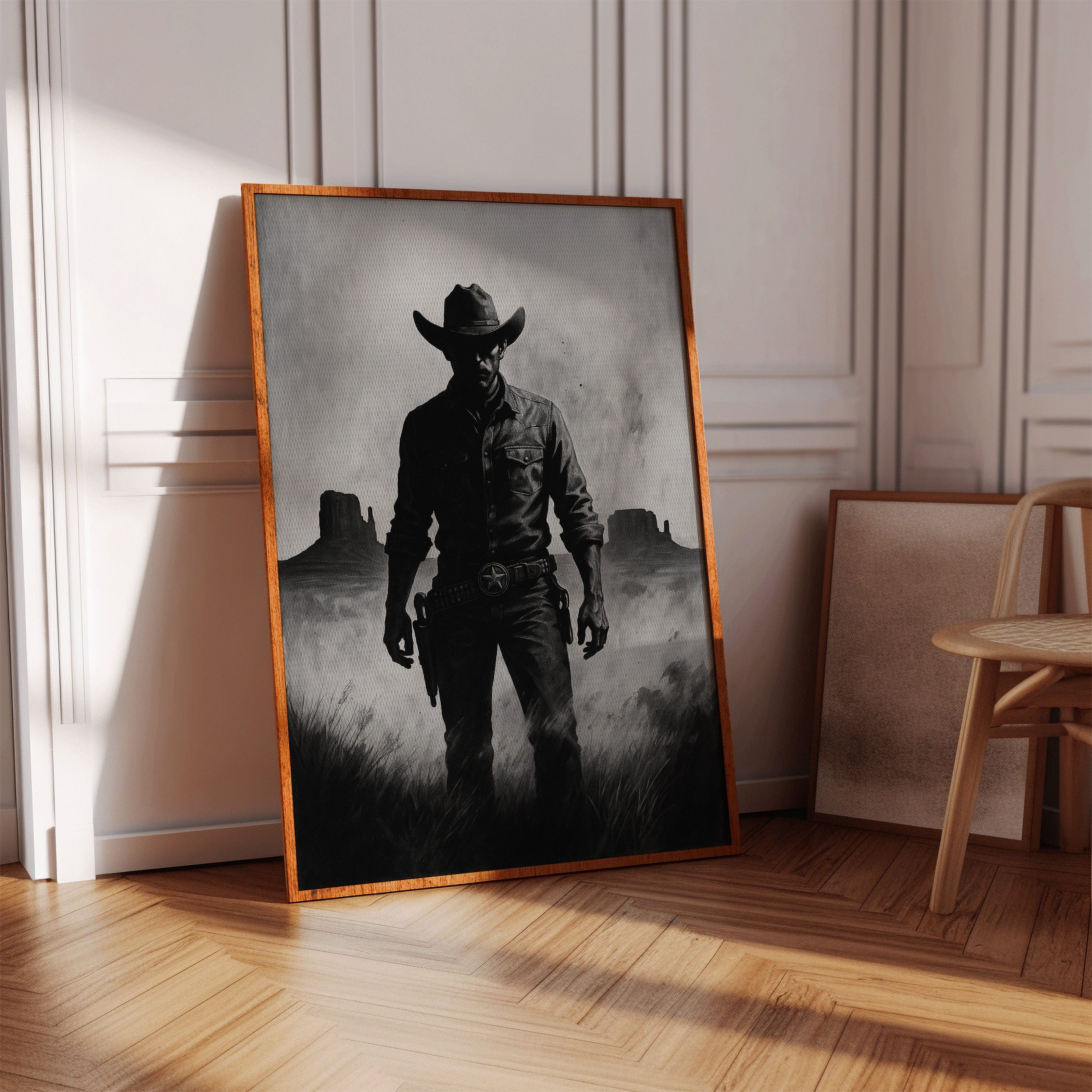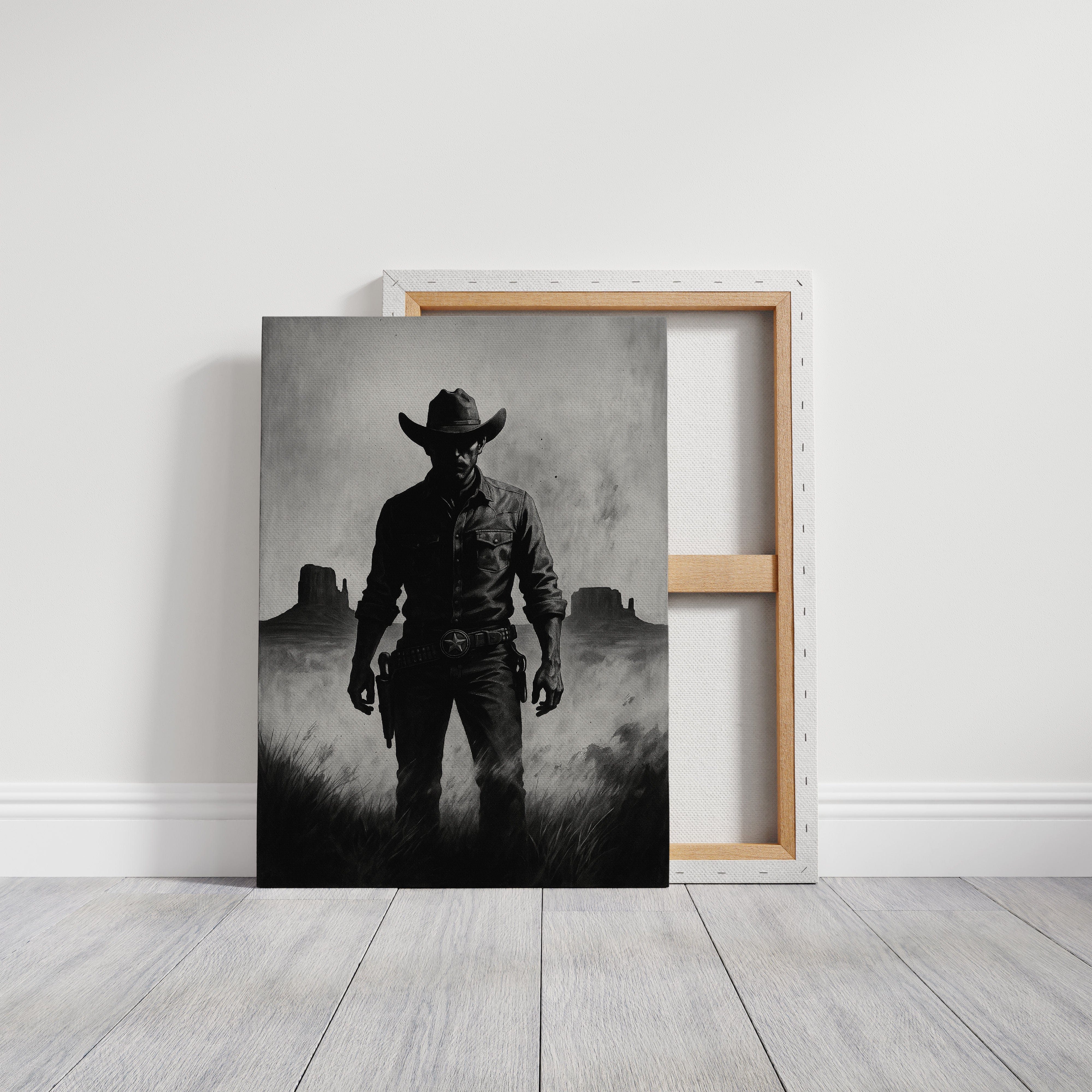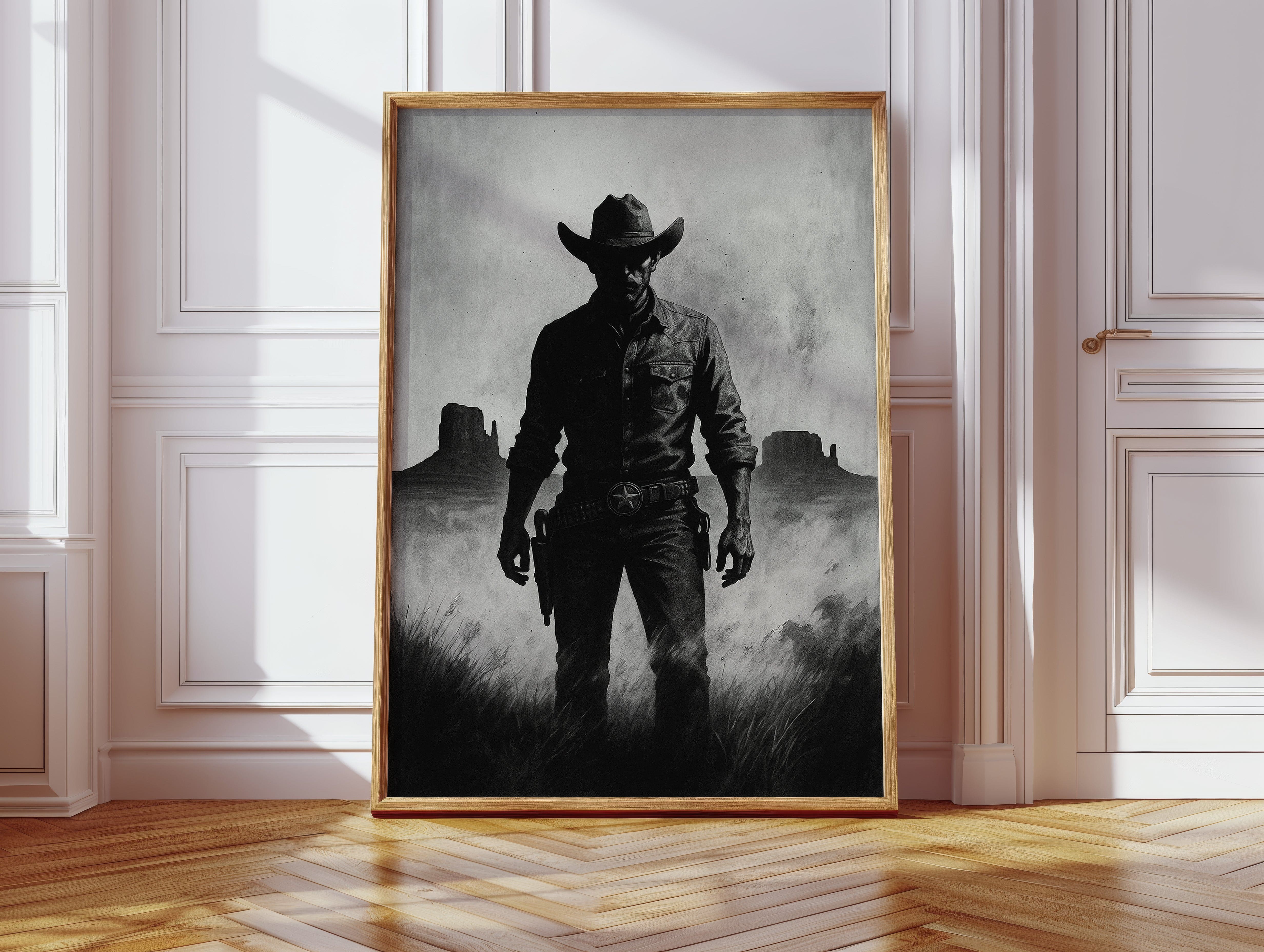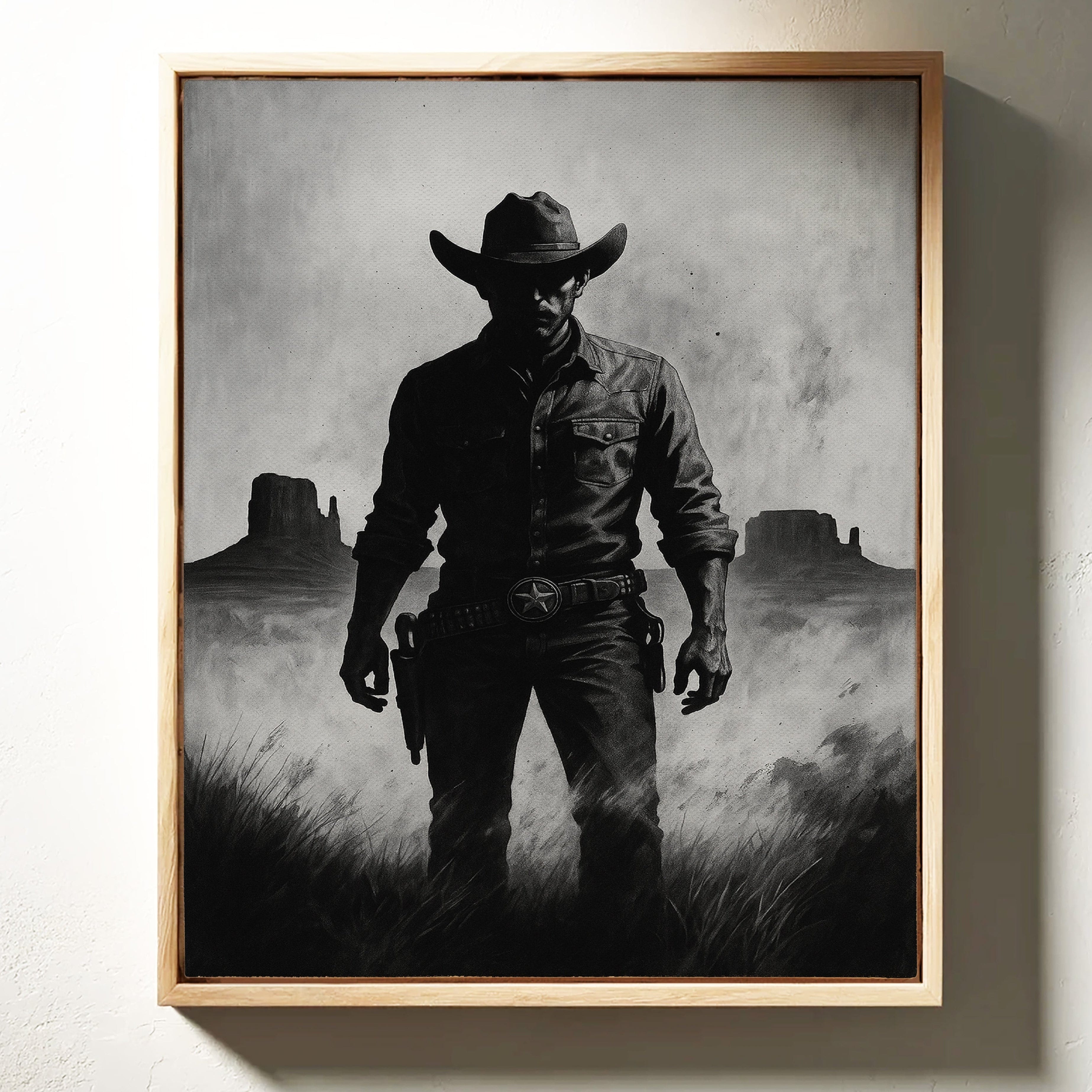 Stand your ground with Law of the Land, a bold black-and-white illustration capturing the formidable silhouette of a Western sheriff. With Monument Valley rising in the distance and a badge shining at his hip, this piece evokes authority, grit, and the dusty edge of justice in the Old West. A striking addition to noir Western décor or collectors of iconic cowboy imagery.