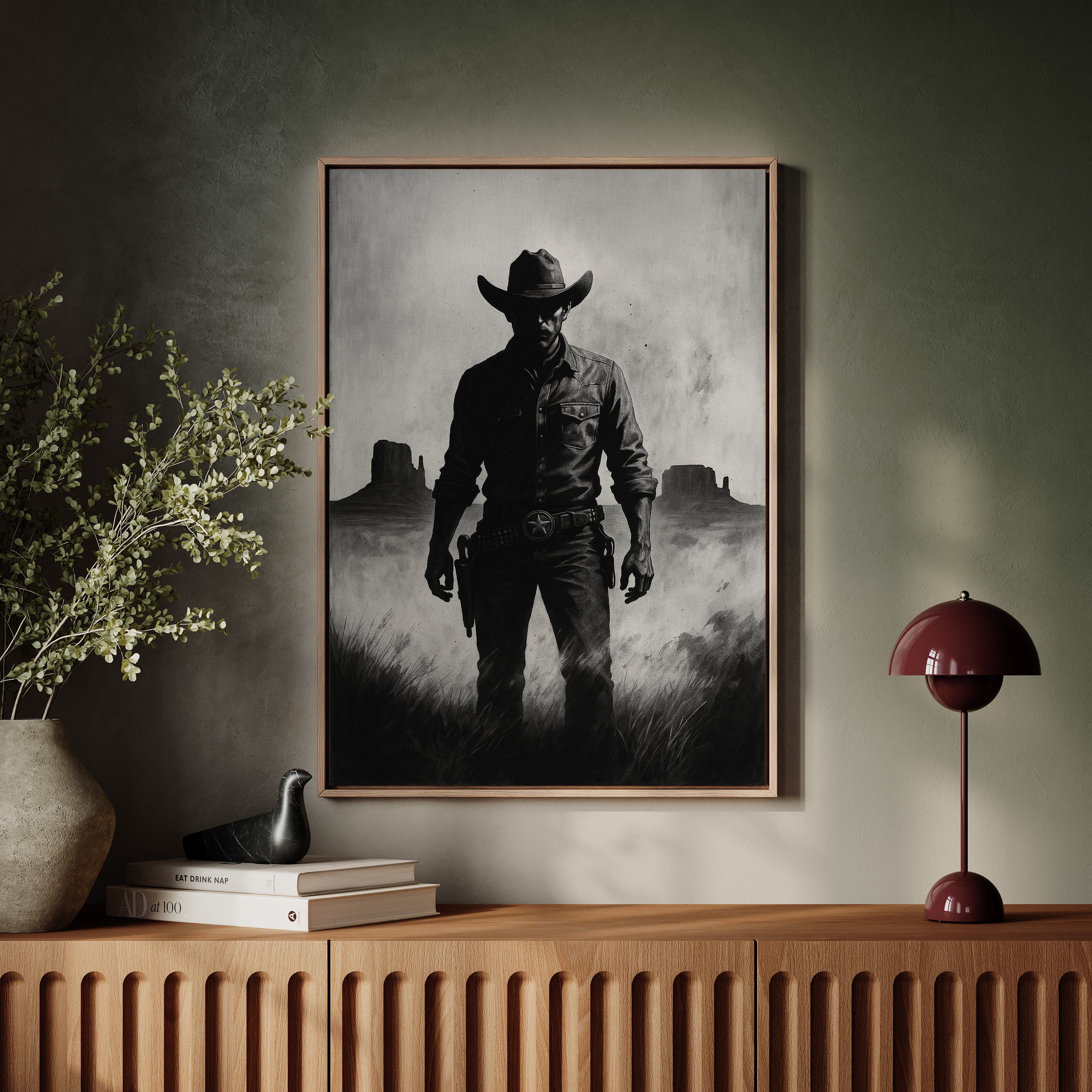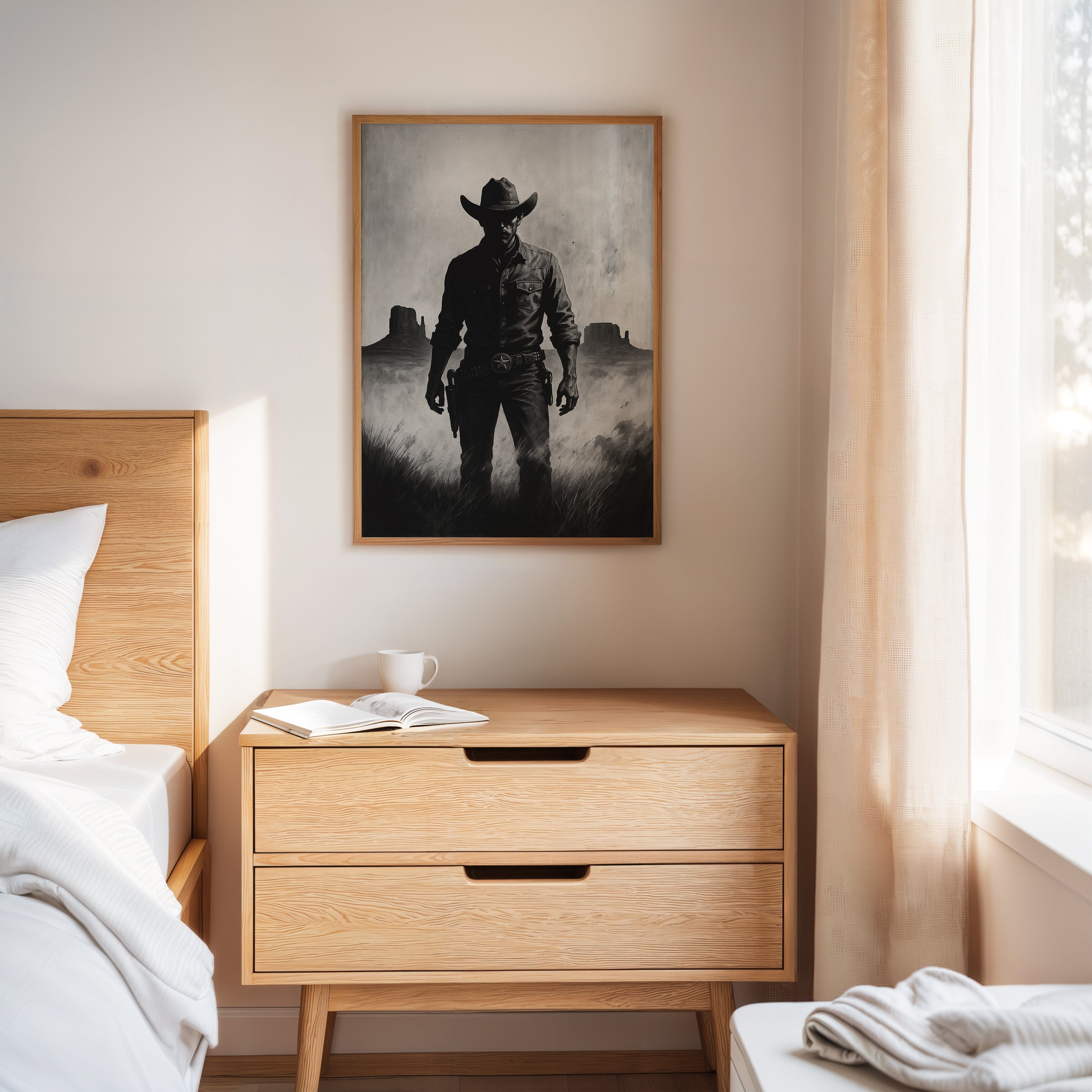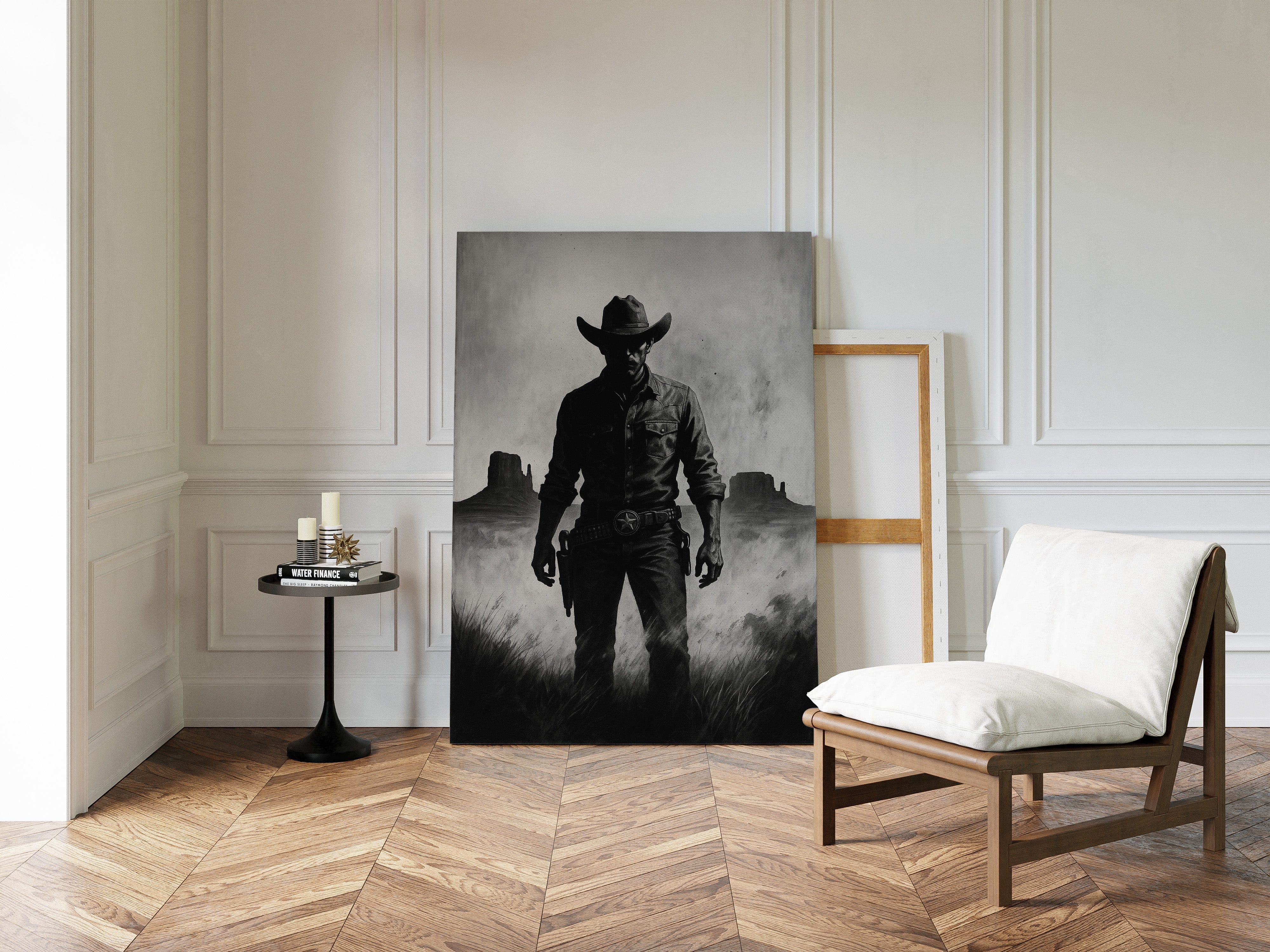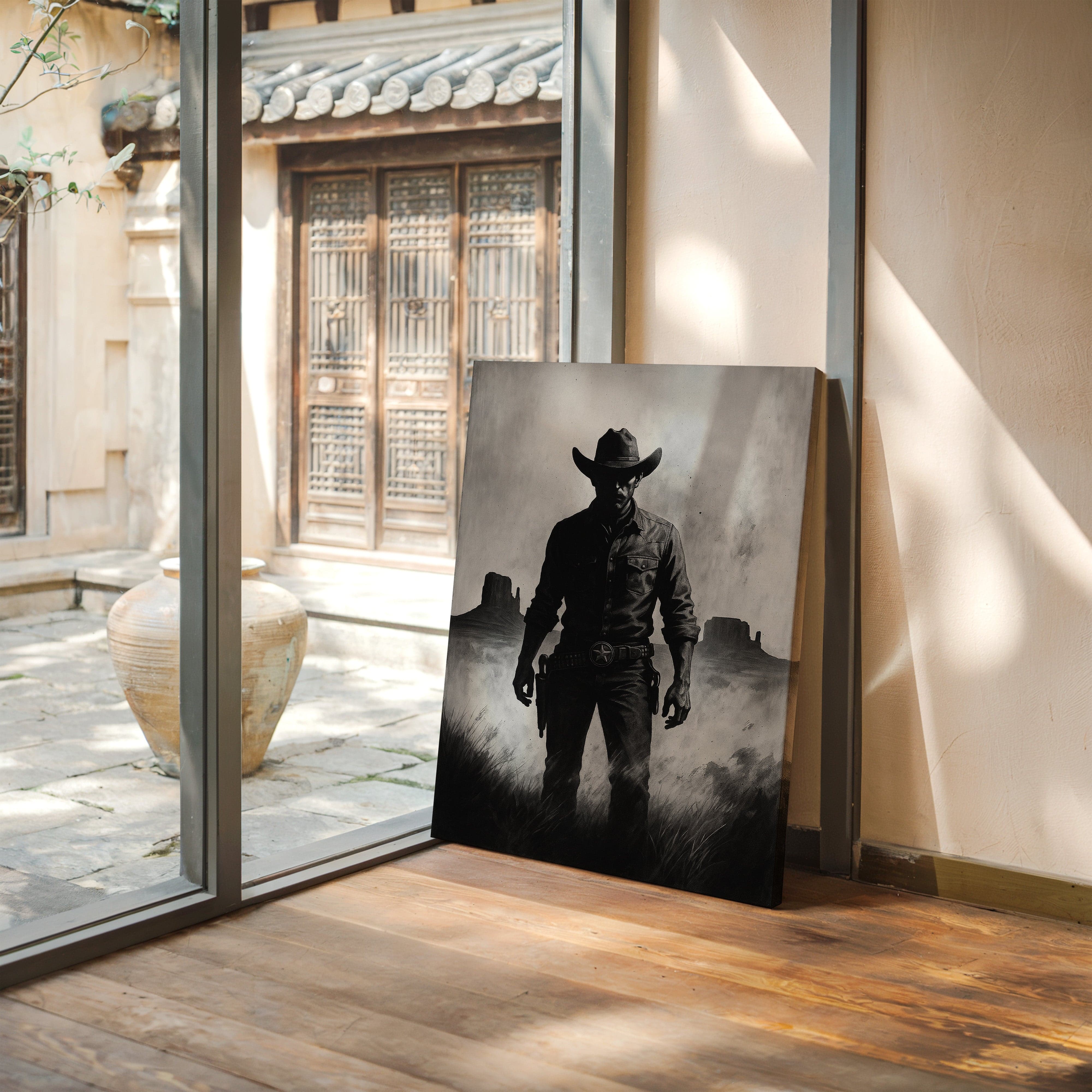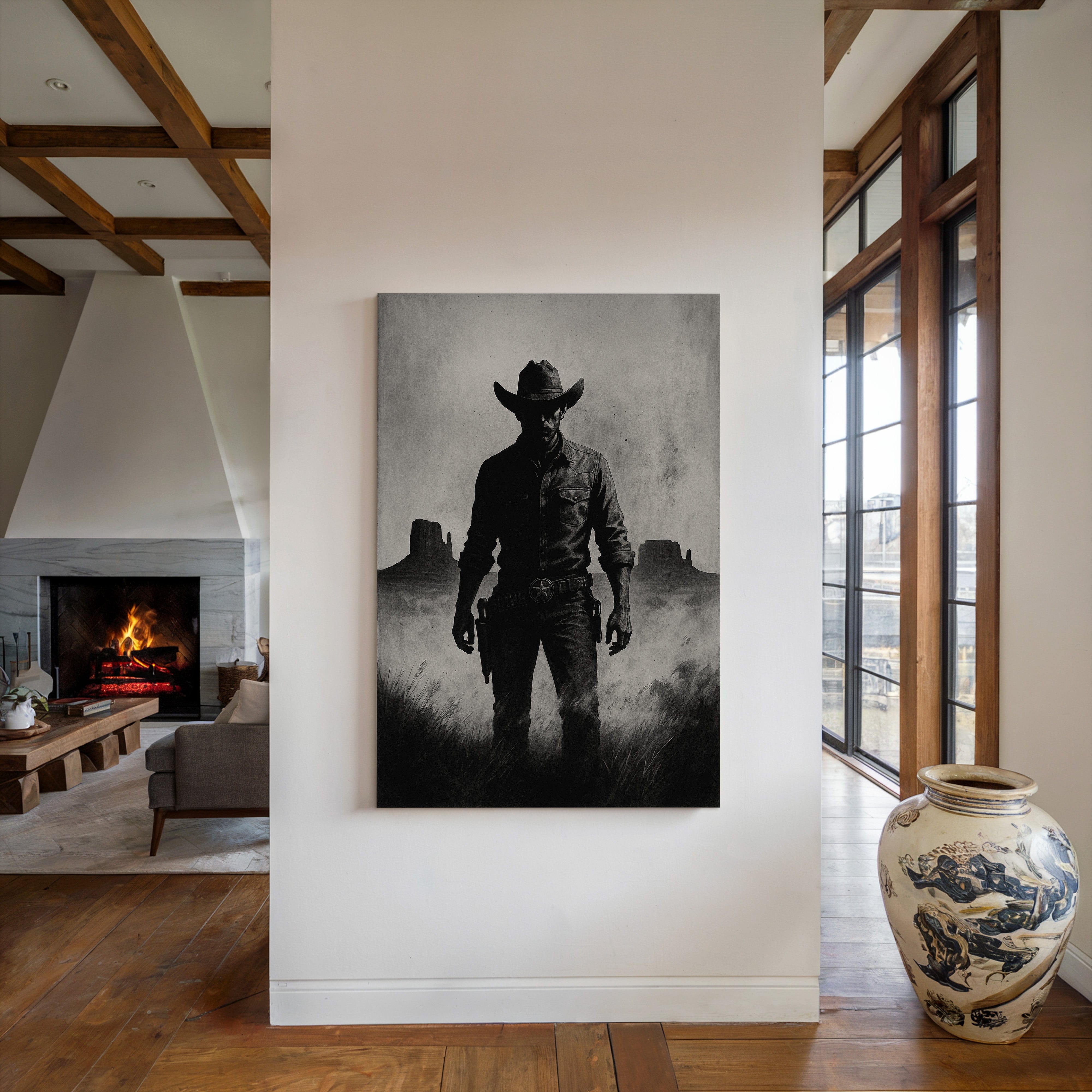 Stand your ground with Law of the Land, a bold black-and-white illustration capturing the formidable silhouette of a Western sheriff. With Monument Valley rising in the distance and a badge shining at his hip, this piece evokes authority, grit, and the dusty edge of justice in the Old West. A striking addition to noir Western décor or collectors of iconic cowboy imagery.
