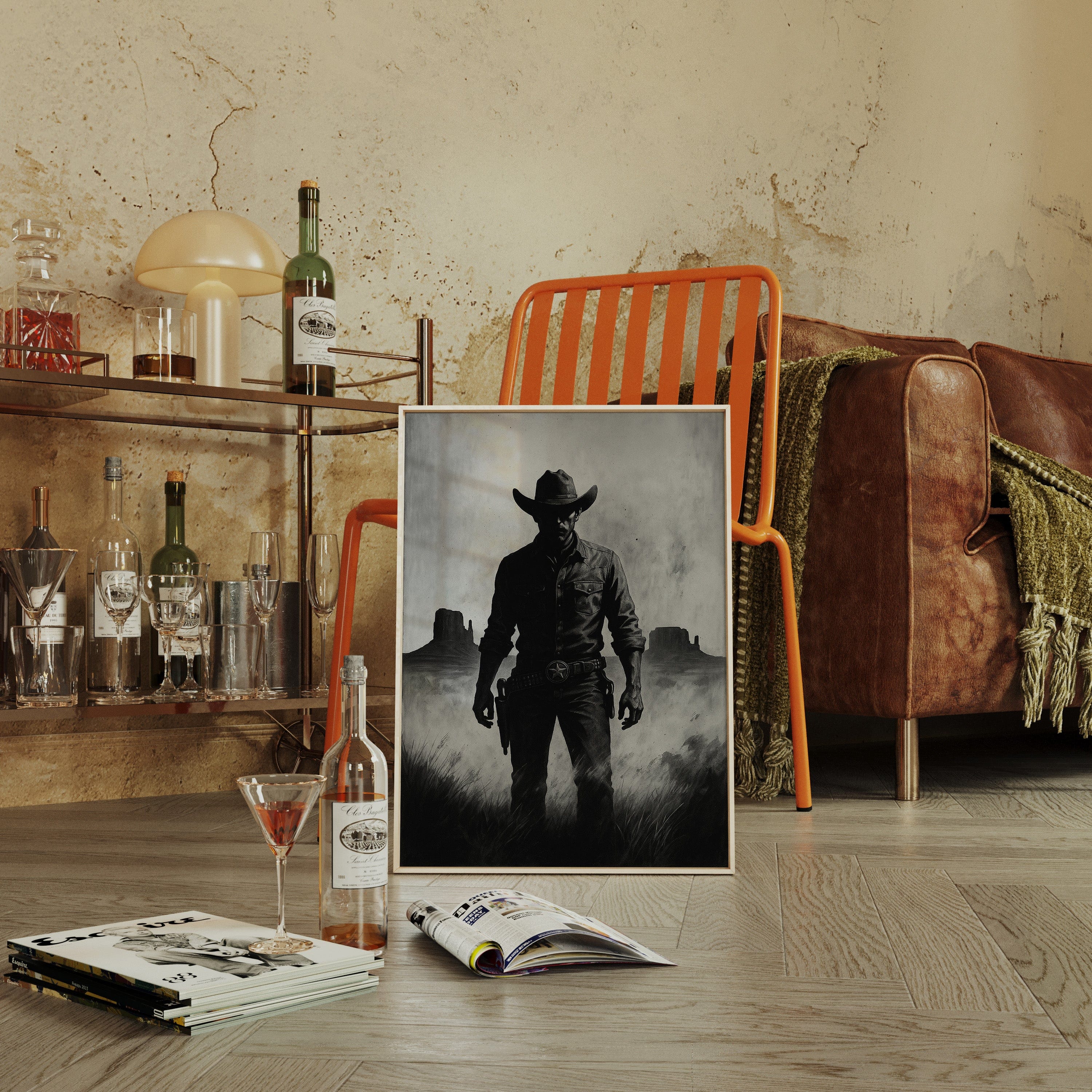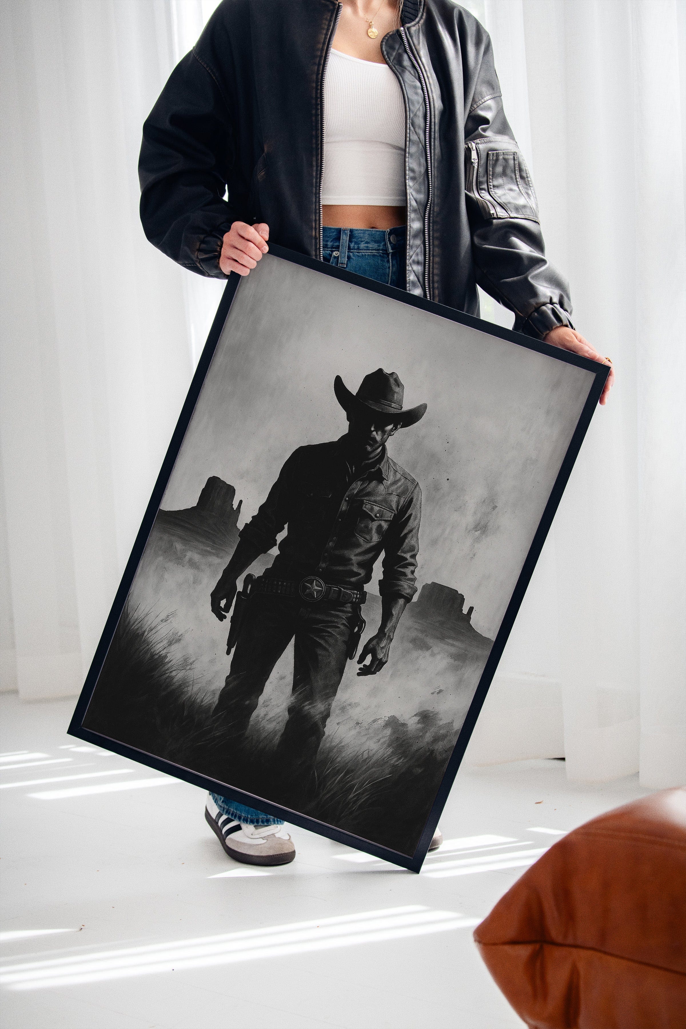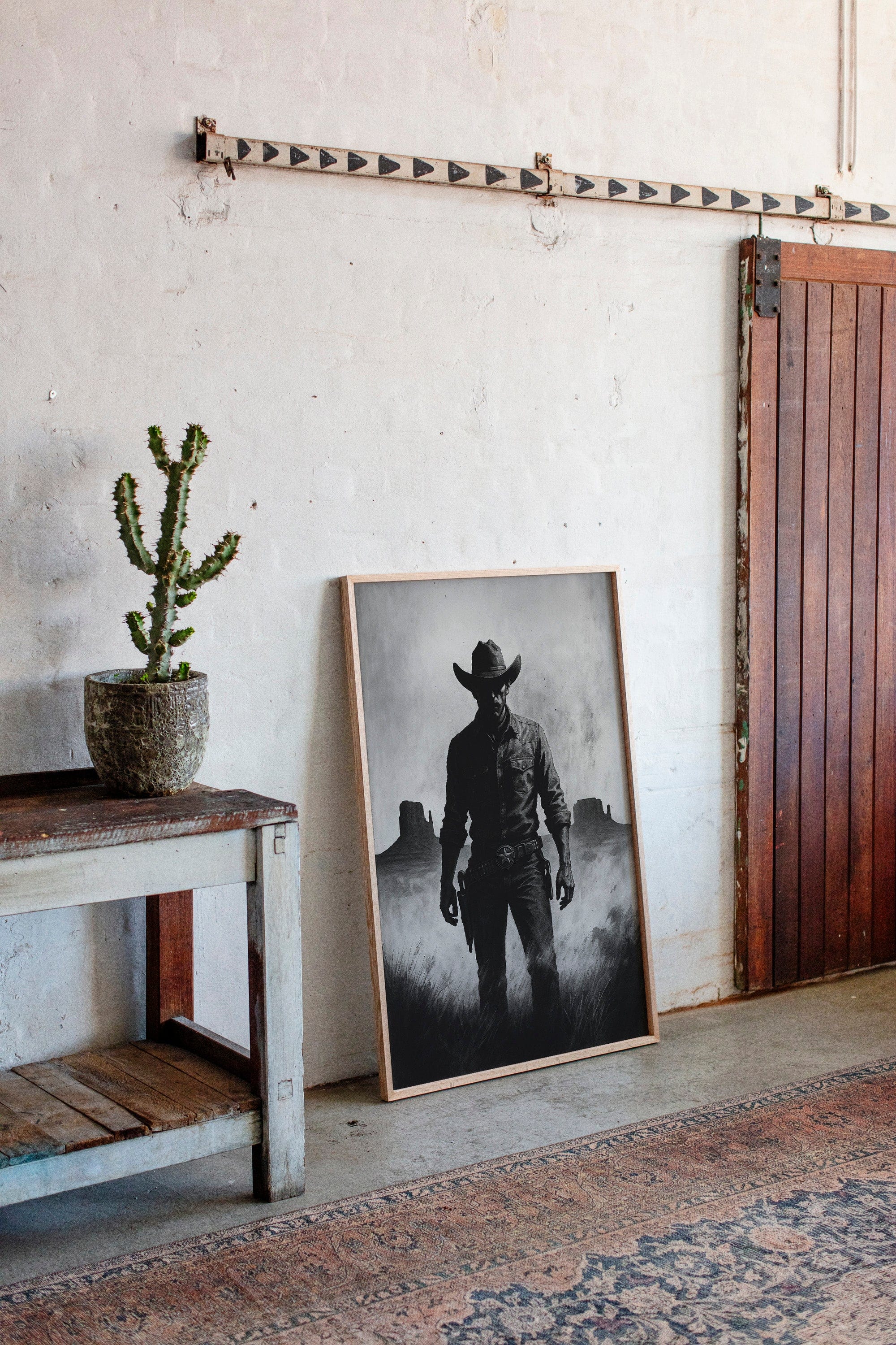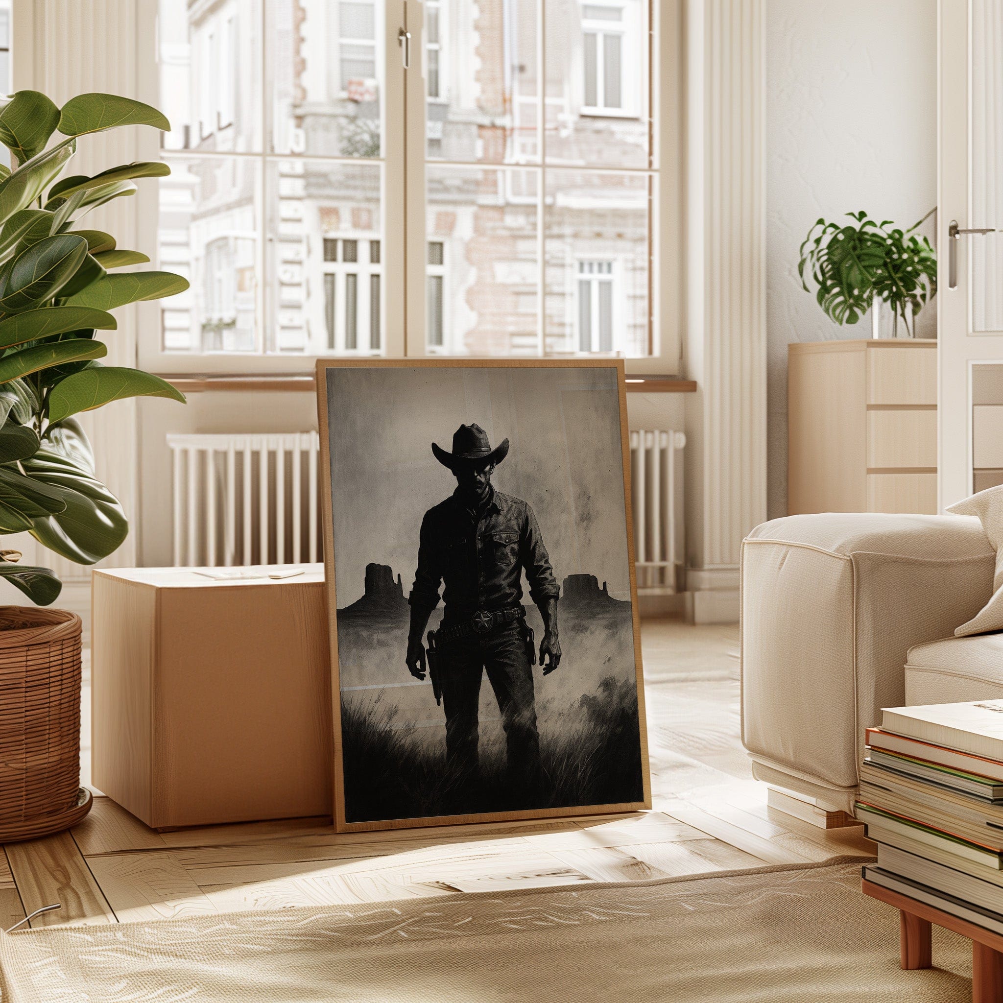 Stand your ground with Law of the Land, a bold black-and-white illustration capturing the formidable silhouette of a Western sheriff. With Monument Valley rising in the distance and a badge shining at his hip, this piece evokes authority, grit, and the dusty edge of justice in the Old West. A striking addition to noir Western décor or collectors of iconic cowboy imagery.