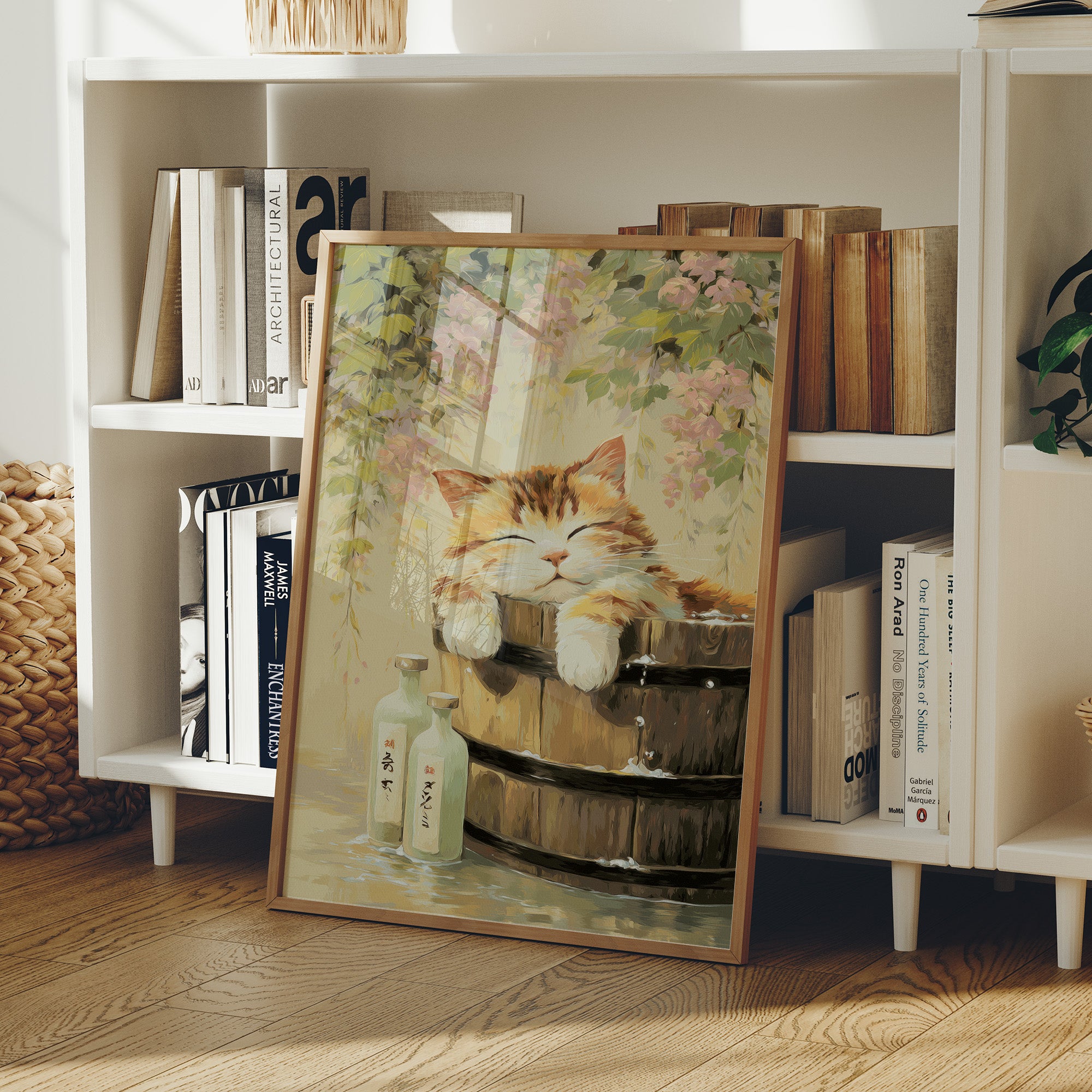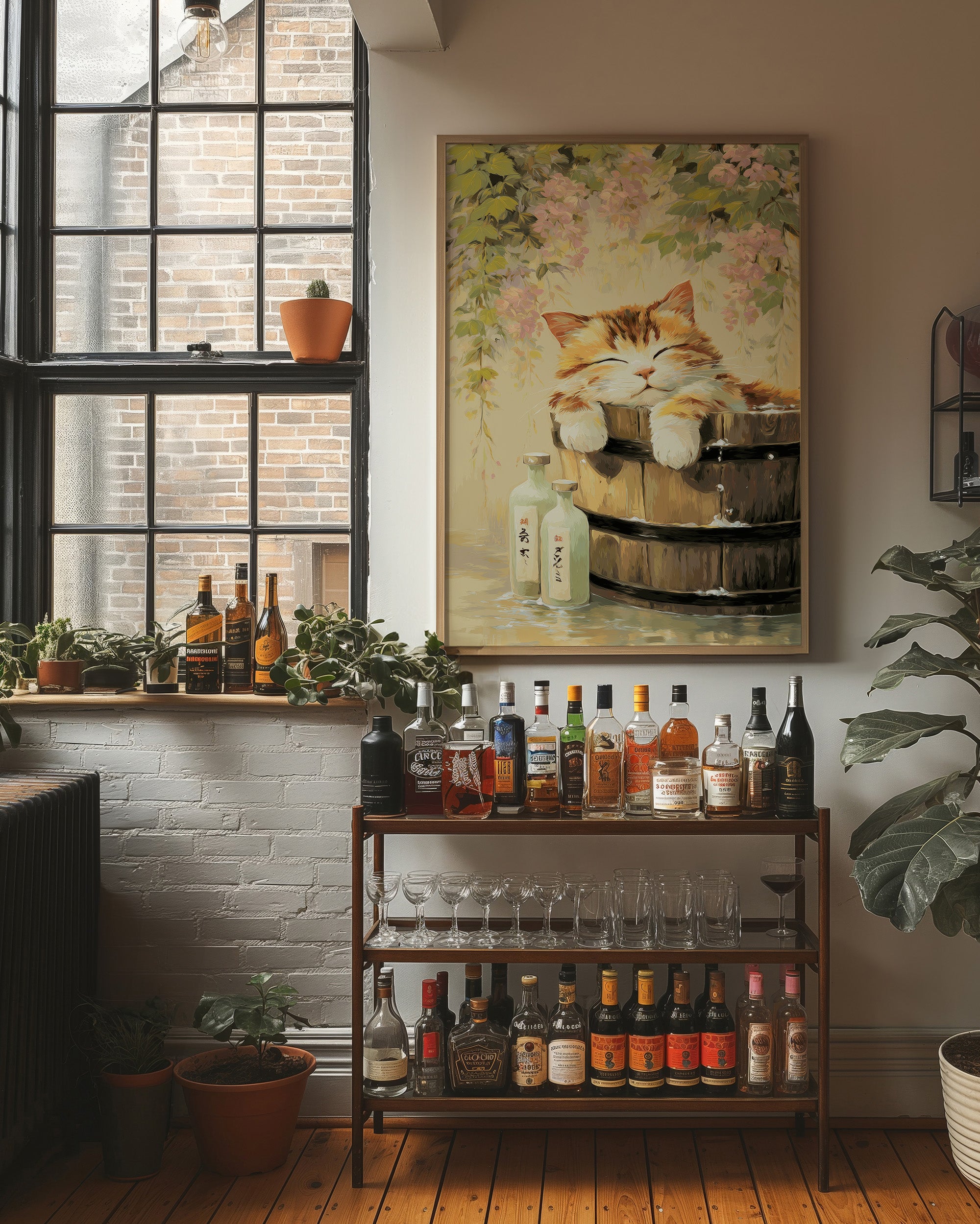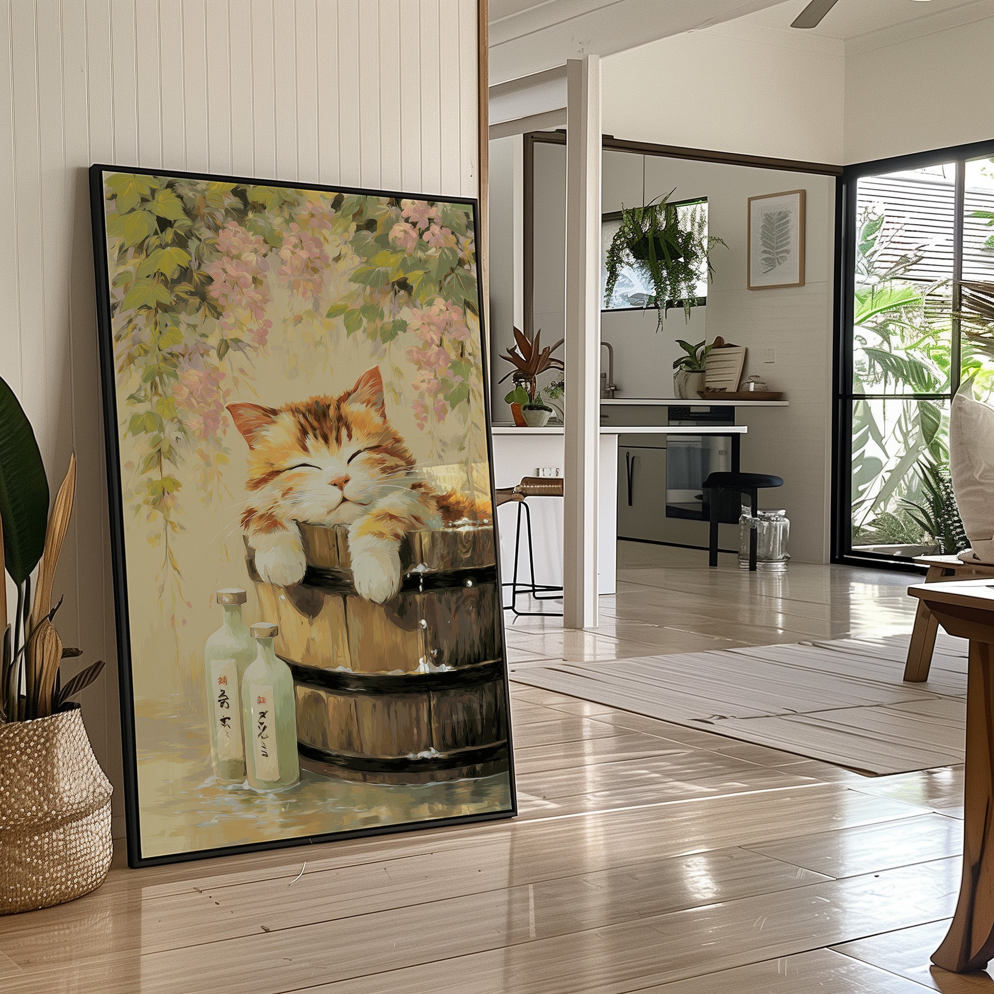 Sunlight filters through cherry blossoms, casting a gentle glow on a contented cat lounging atop wooden steps. The watercolor-style piece captures a moment of pure feline serenity, with soft pink petals dancing above and vintage bottles standing sentinel nearby. The warm earth tones and delicate brush strokes create a harmonious scene that feels both nostalgic and timelessly peaceful. This piece would bring a touch of tranquil charm to a reading nook, home office, or any cozy corner where quiet moments are cherished.