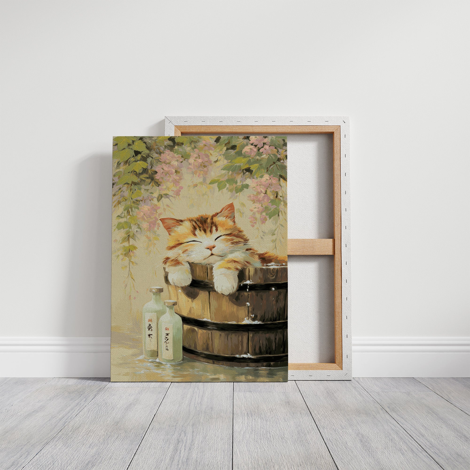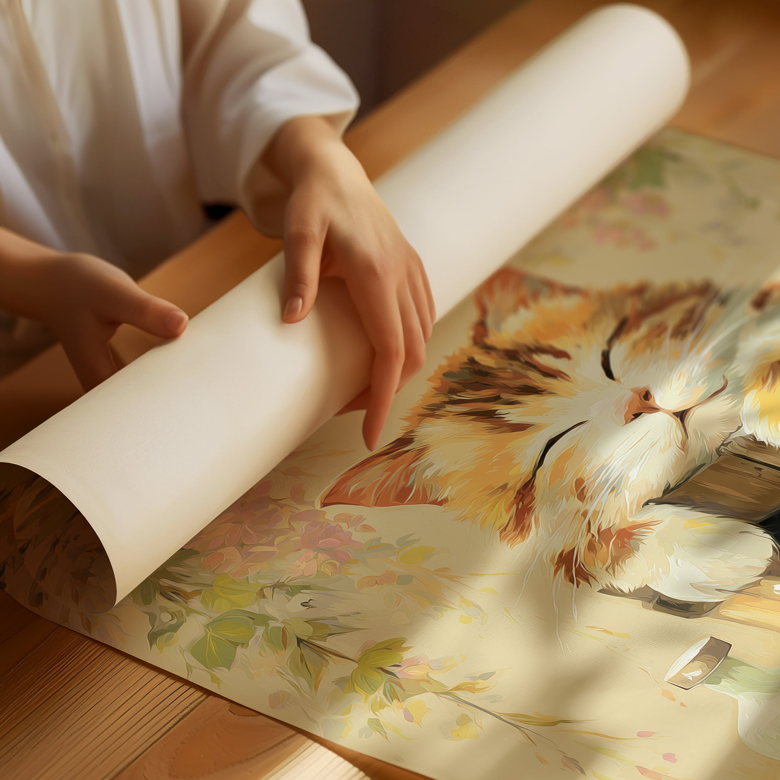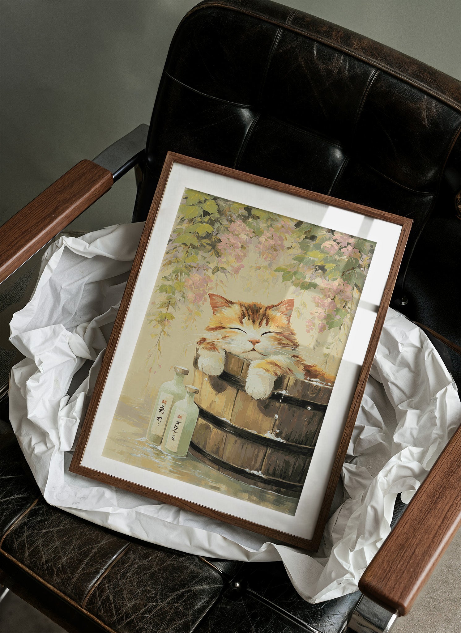 Sunlight filters through cherry blossoms, casting a gentle glow on a contented cat lounging atop wooden steps. The watercolor-style piece captures a moment of pure feline serenity, with soft pink petals dancing above and vintage bottles standing sentinel nearby. The warm earth tones and delicate brush strokes create a harmonious scene that feels both nostalgic and timelessly peaceful. This piece would bring a touch of tranquil charm to a reading nook, home office, or any cozy corner where quiet moments are cherished.