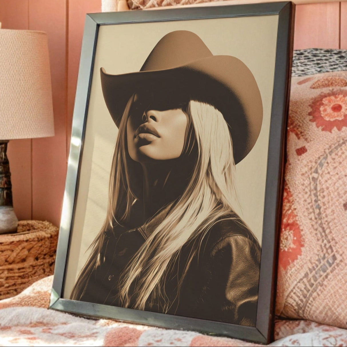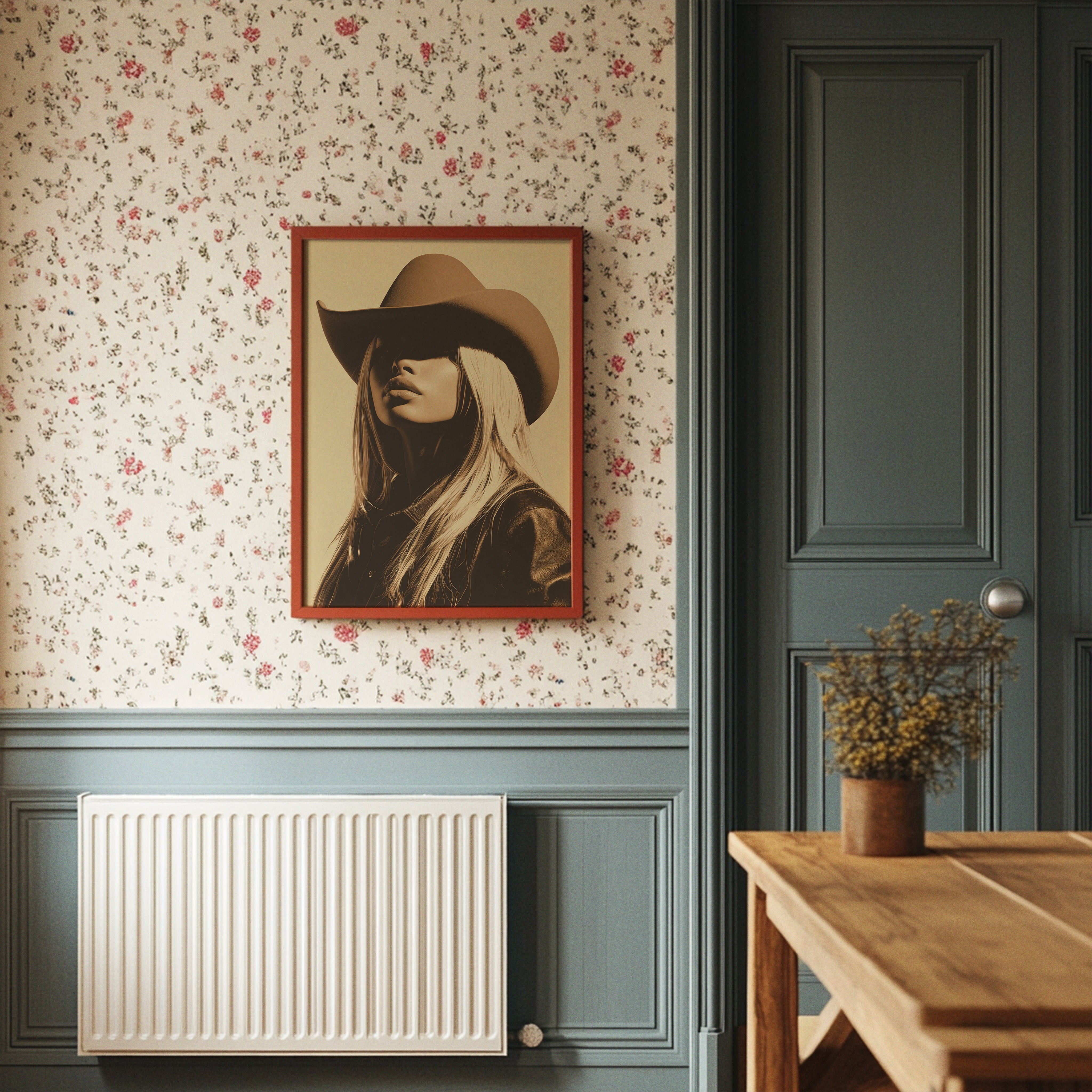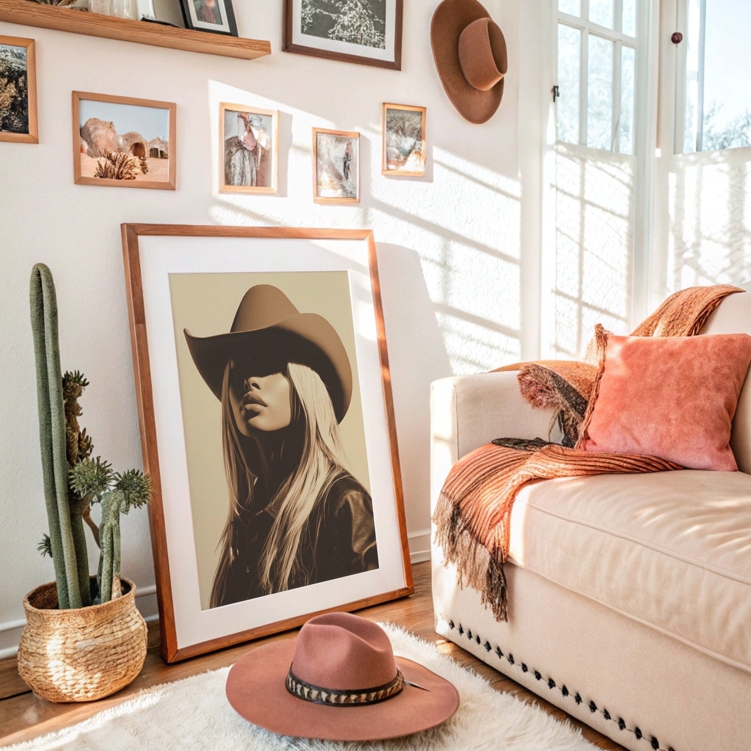 Warm light pools against weathered wood, creating an intimate southwestern sanctuary. A leather sofa anchors the space while a tall cactus stands sentinel, their earthy tones harmonizing with vintage-inspired pendant lights that cast a gentle glow. The rustic elegance extends through carefully curated details - a cowhide rug, woven accents, and the perfect placement of a classic cowboy hat. This space would elevate any modern ranch house, urban loft, or contemporary home seeking to blend western charm with sophisticated design.