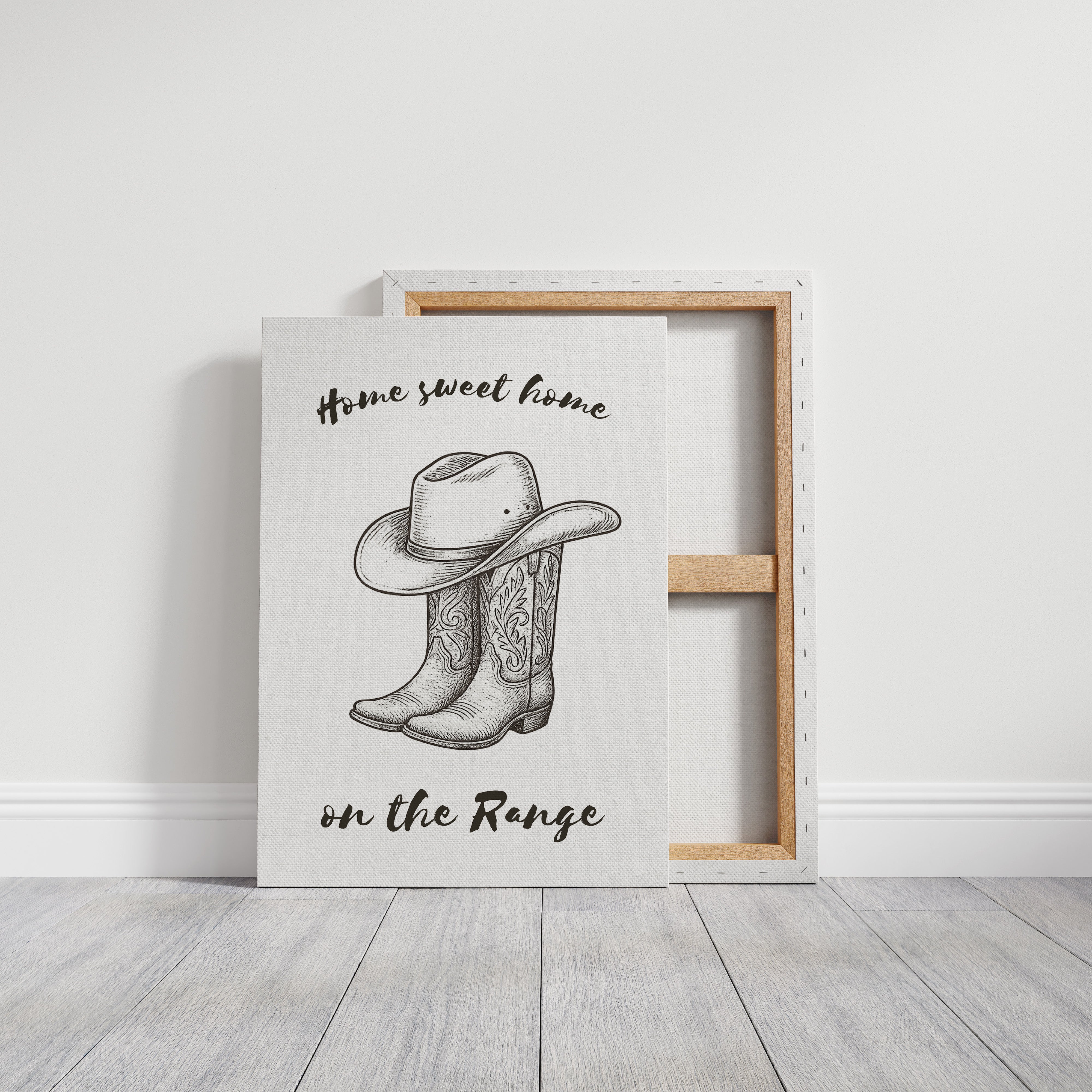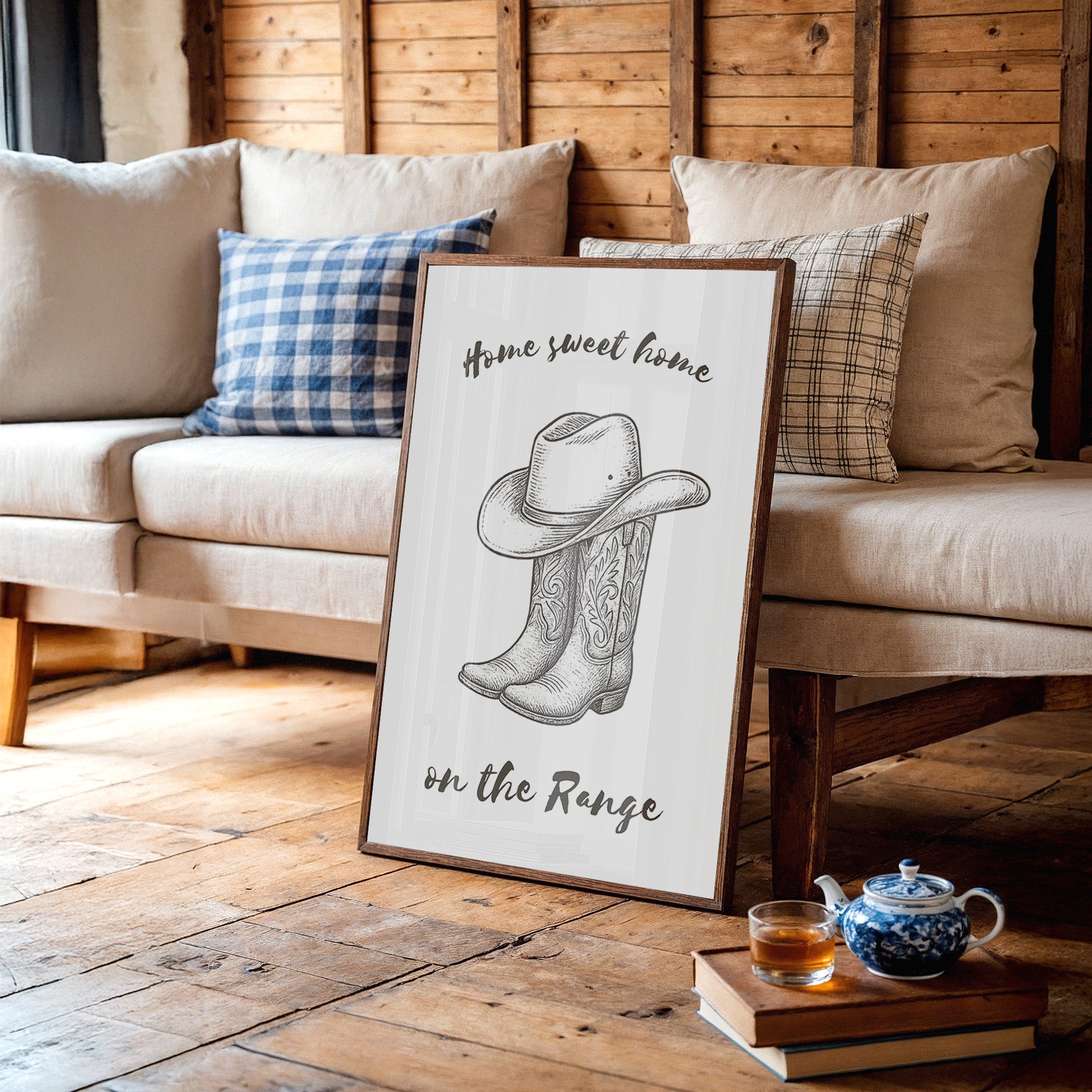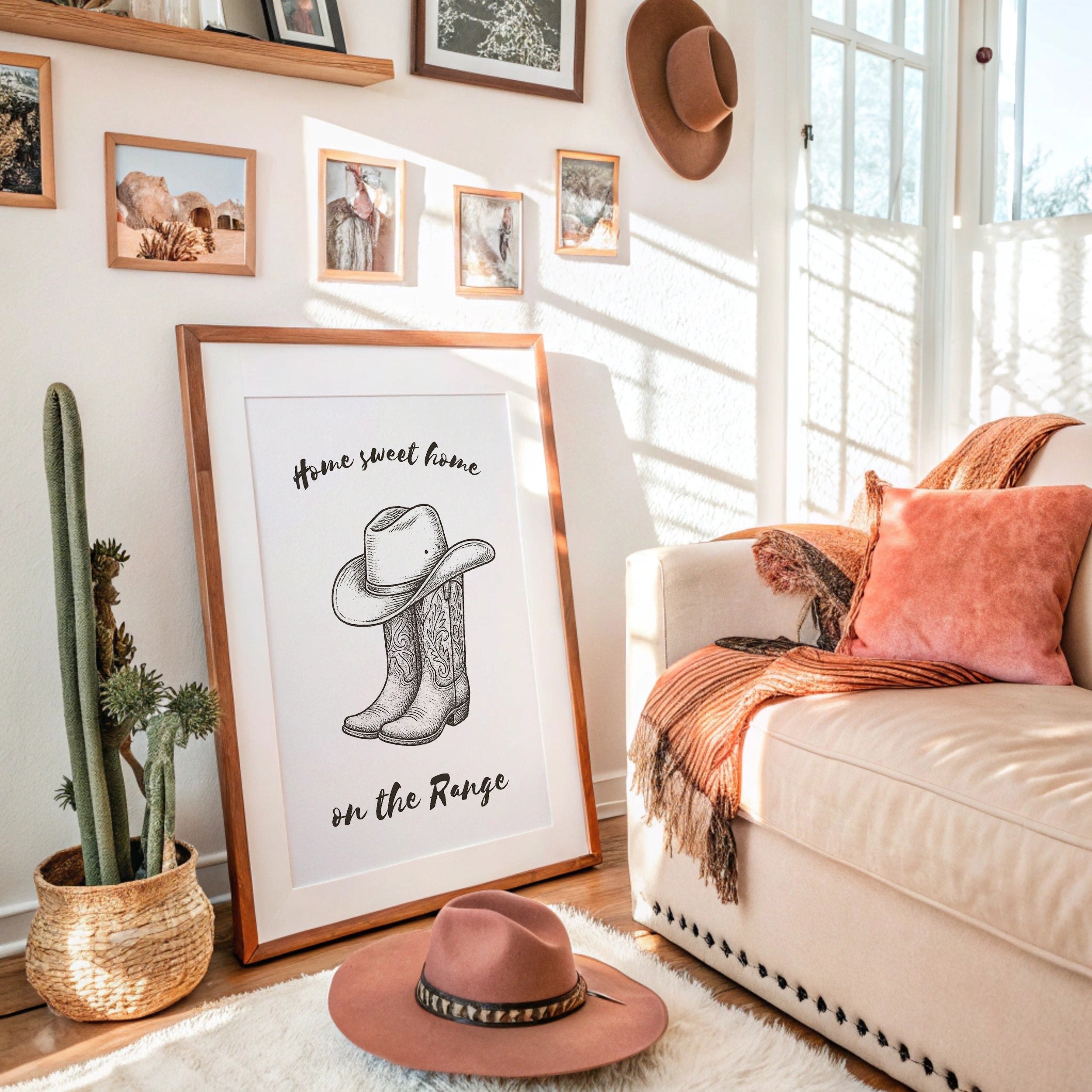 A pair of weathered cowboy boots stands sentinel beneath a well-worn hat, each stitch and scuff telling tales of dusty trails and open skies. The intricate tooled leather patterns dance across the boots like memories of wild sage and morning dew, while the hat's broad brim carries the wisdom of countless sunsets. These iconic symbols of western heritage are rendered in delicate pencil strokes, capturing both strength and subtle detail. Perfect for adding a touch of rustic charm to an entryway or bringing authentic ranch house character to a modern farmhouse kitchen.