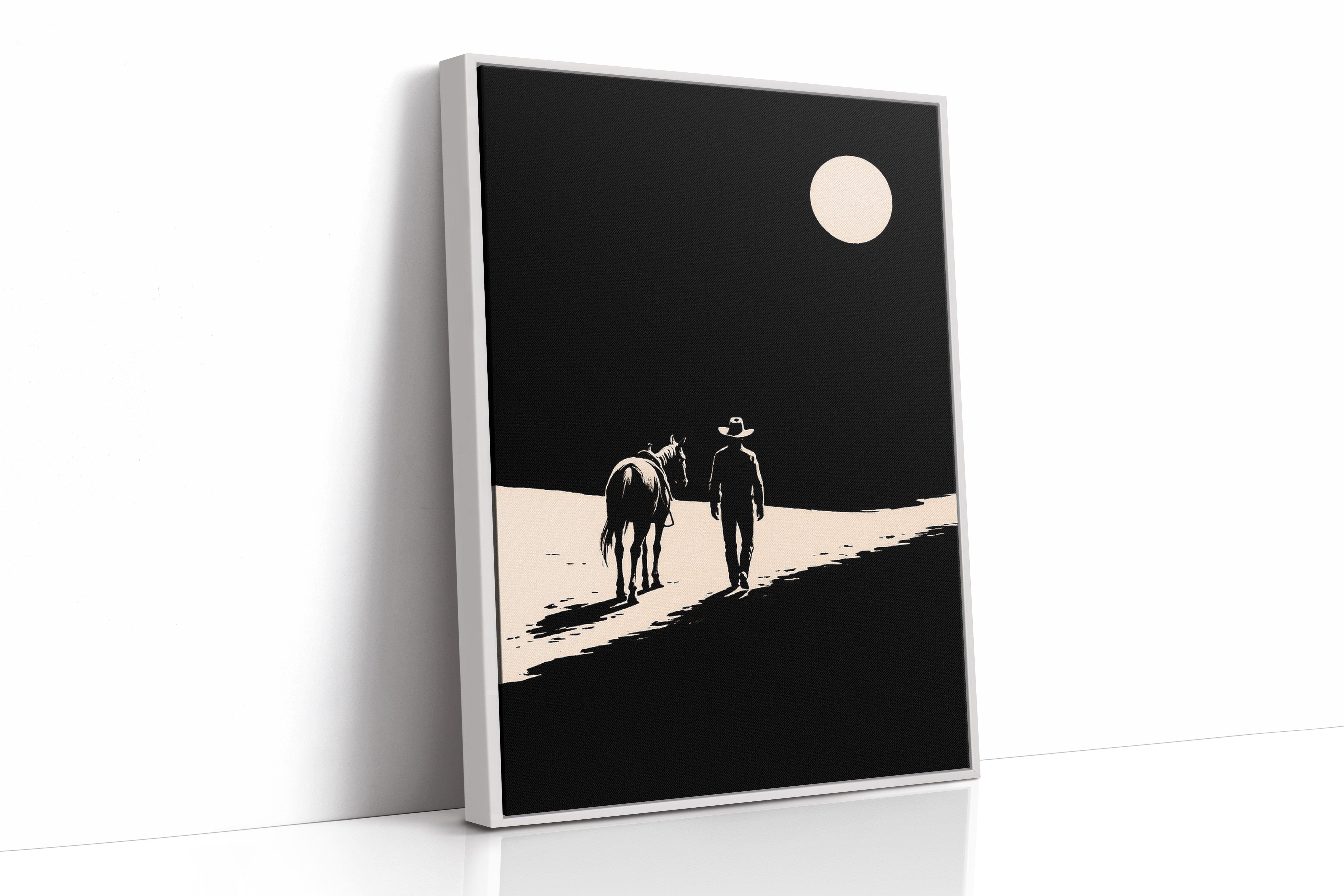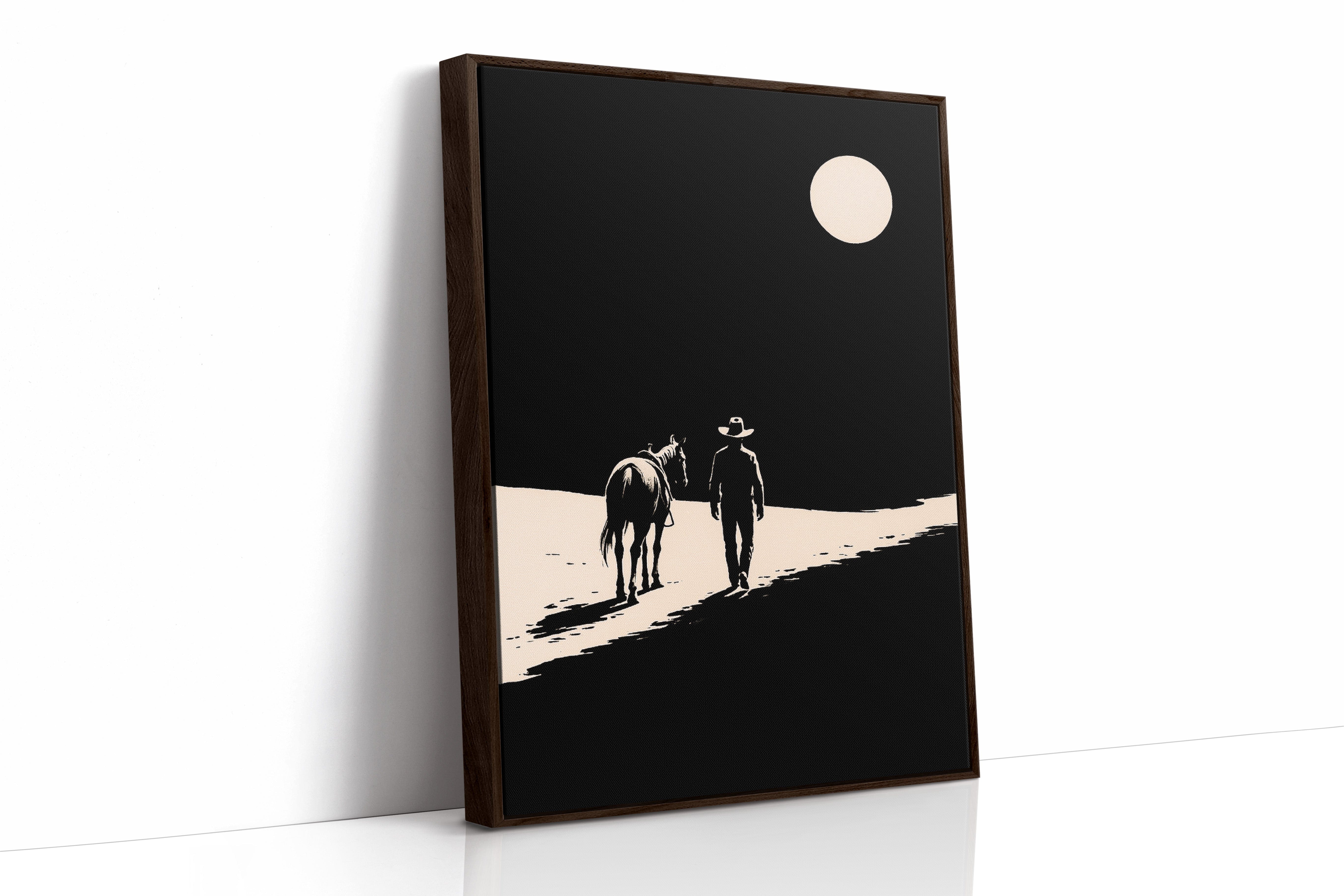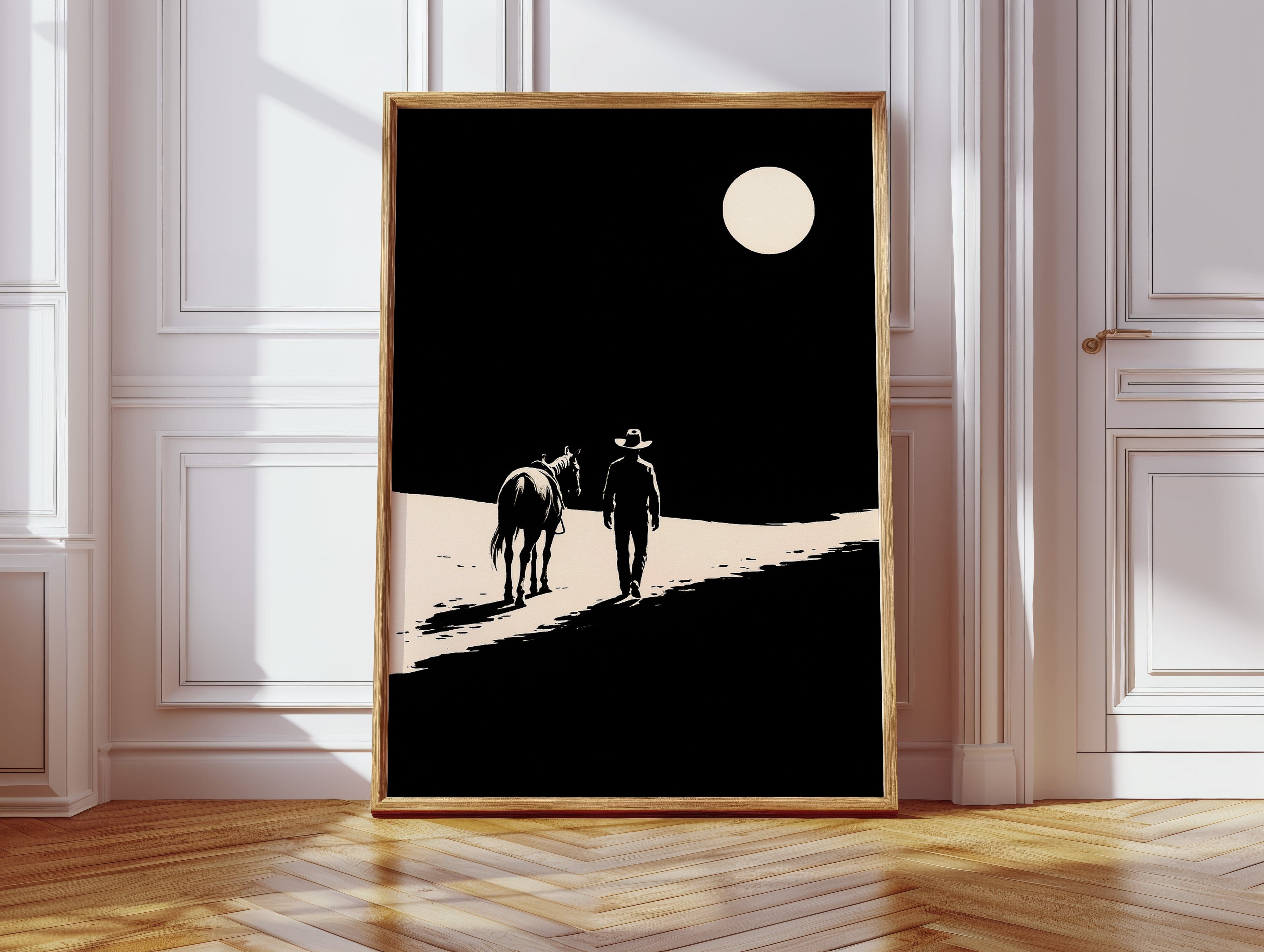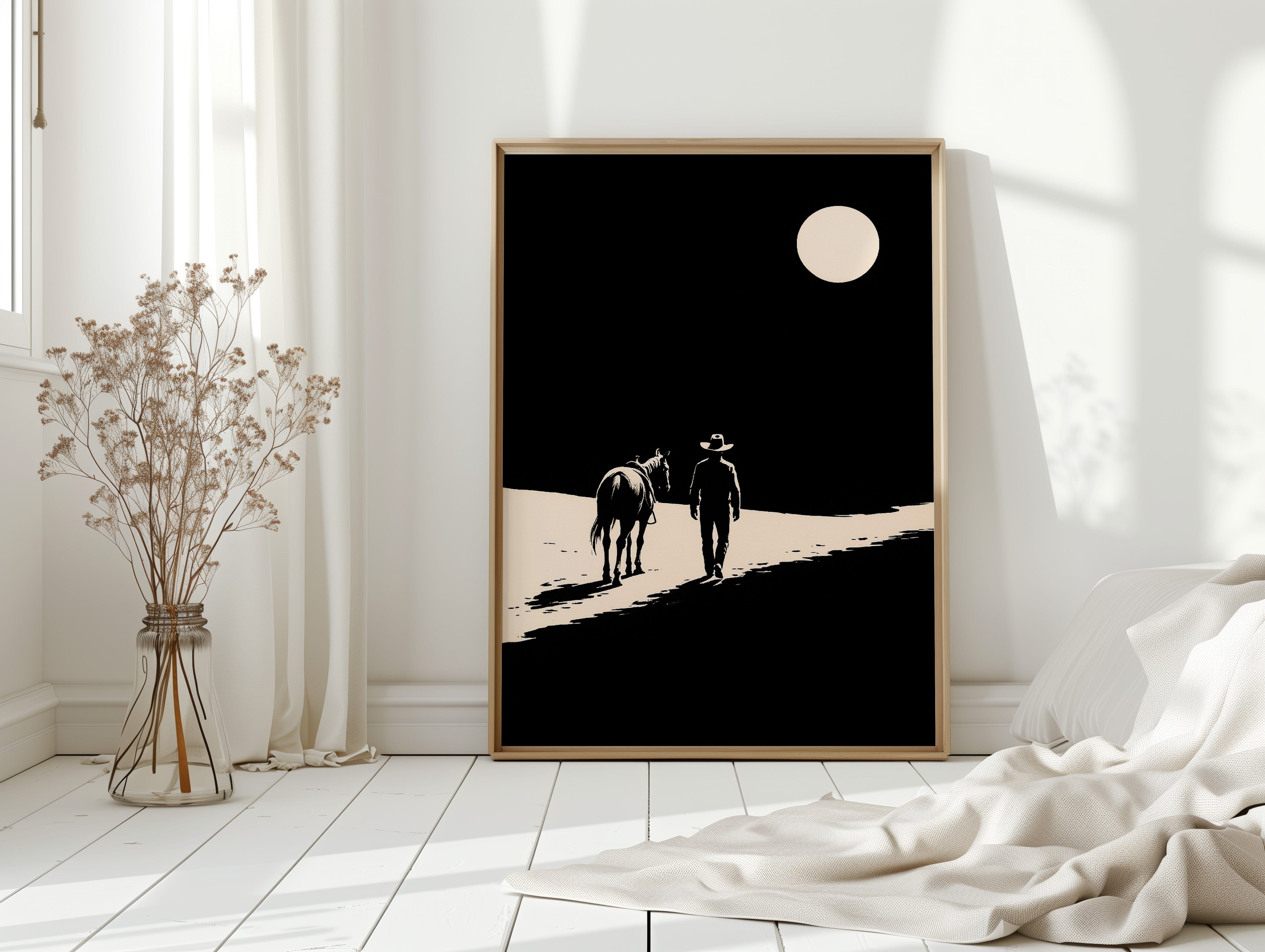 A minimalist Western silhouette of a lone cowboy and his horse under a full moon — a quiet ode to the long road home.