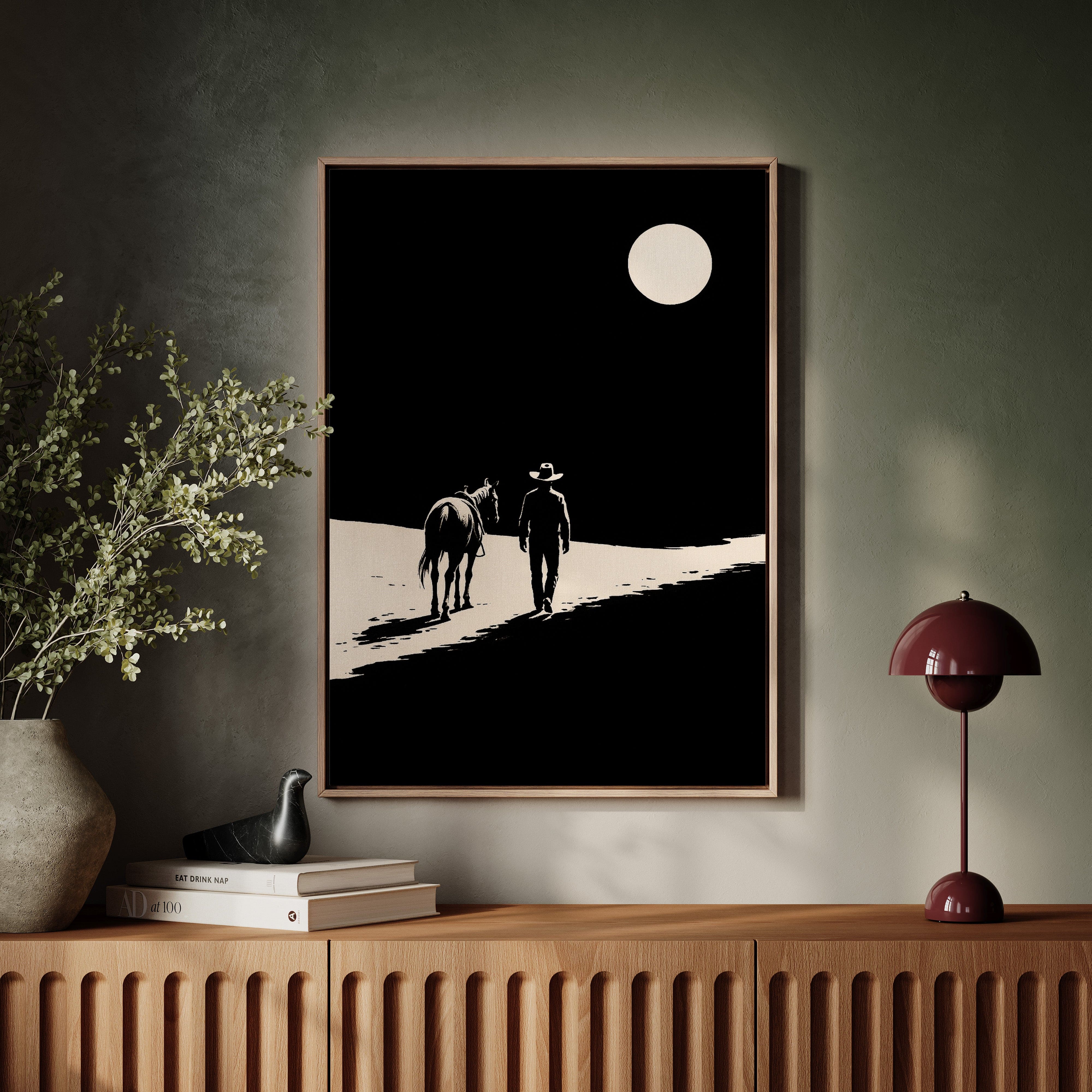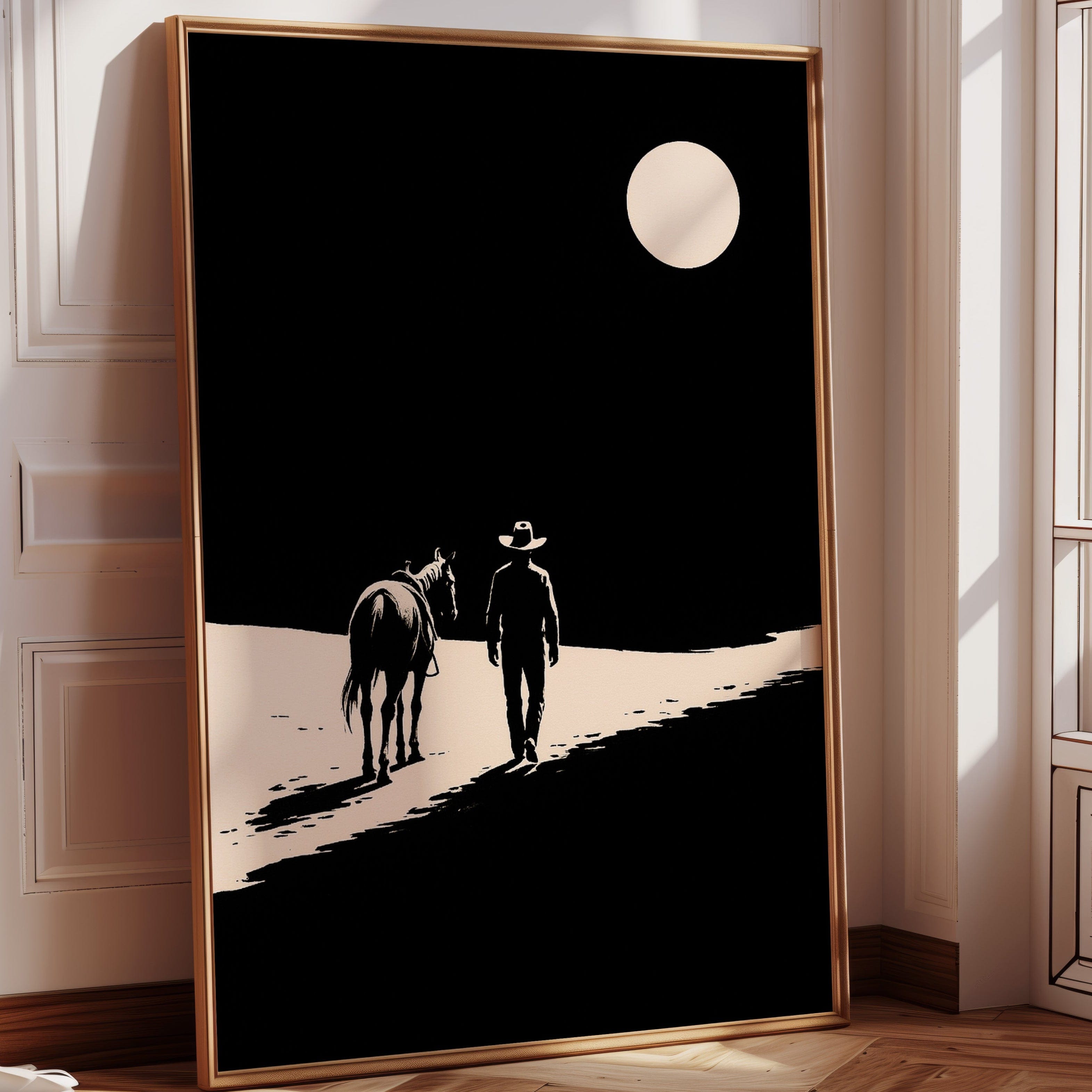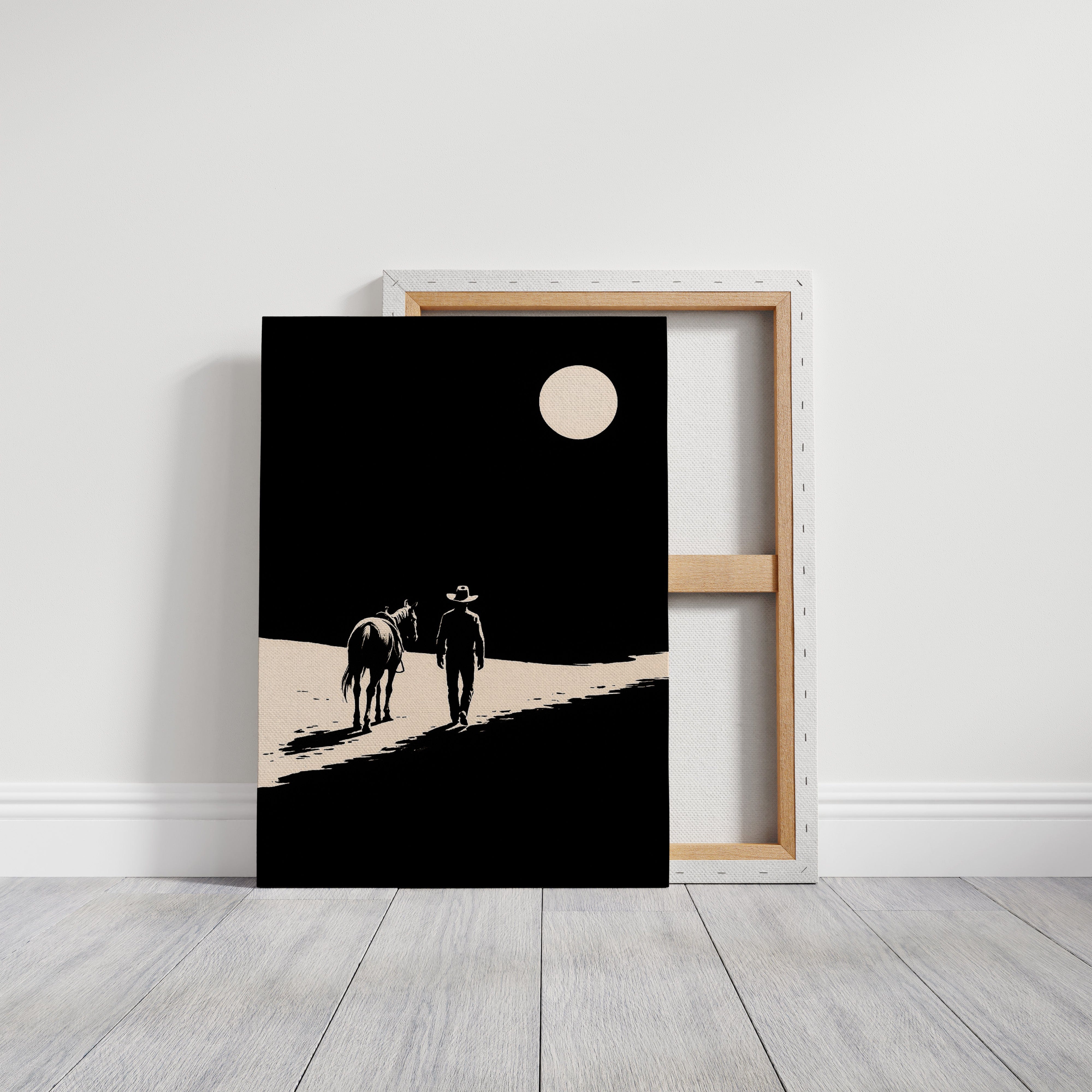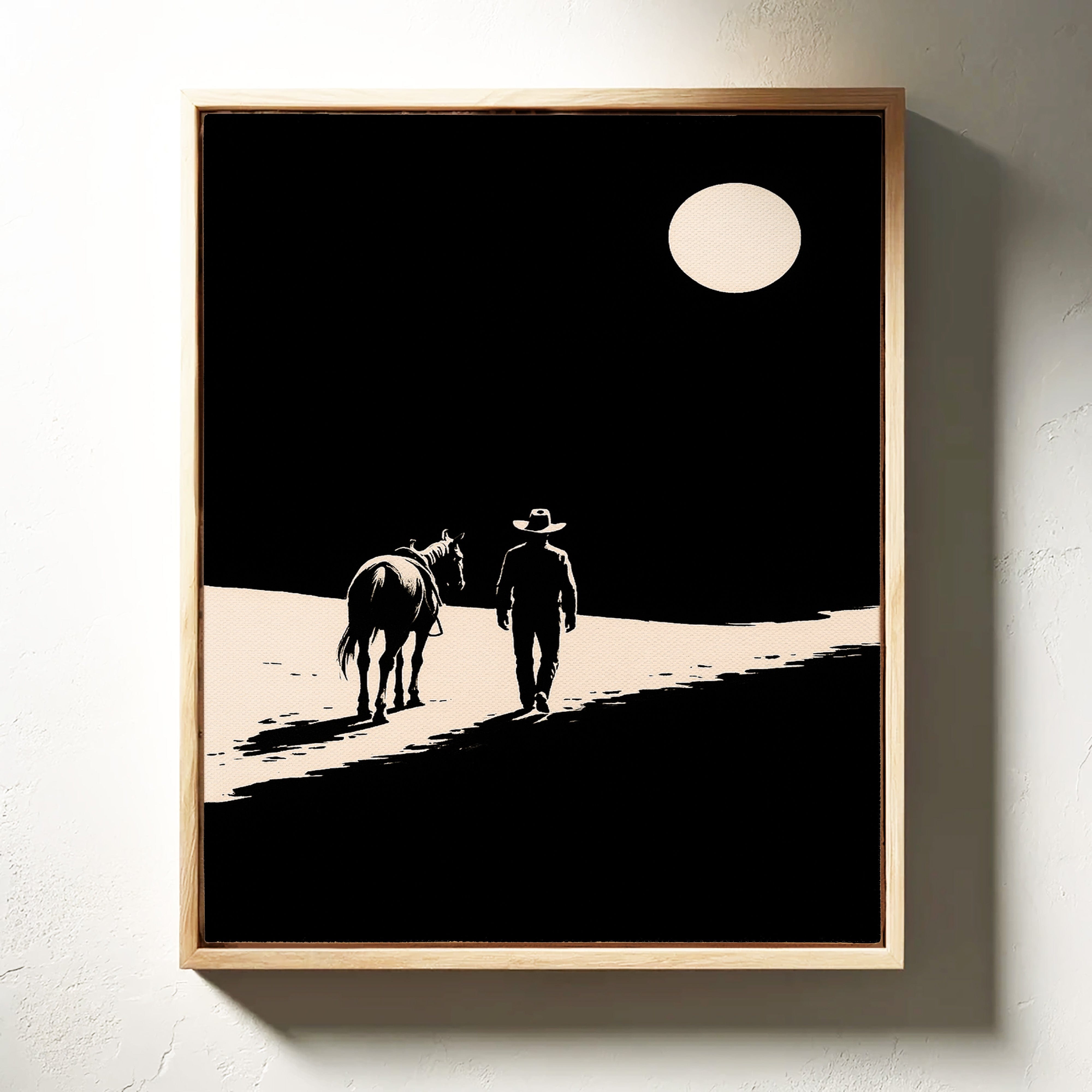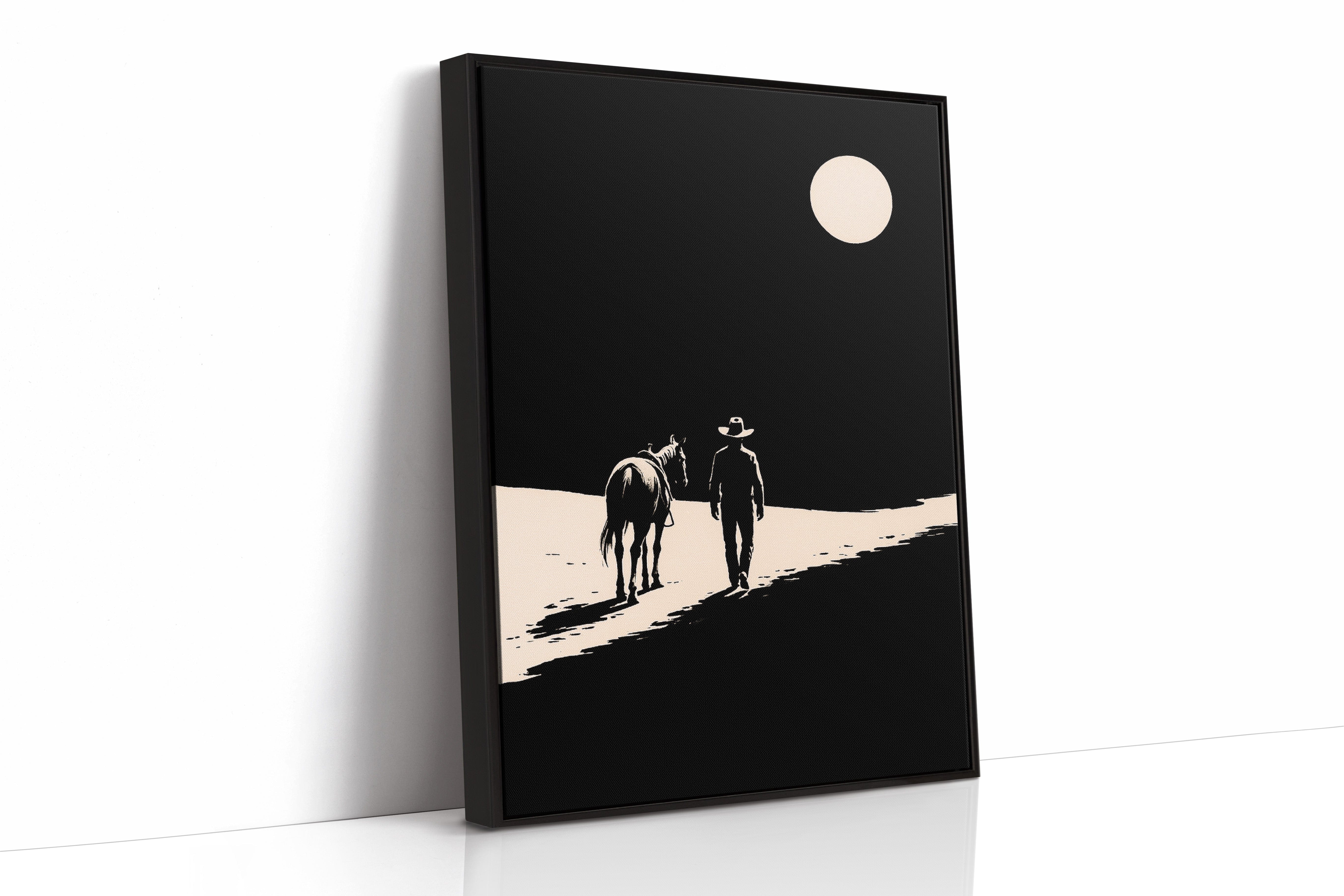 A minimalist Western silhouette of a lone cowboy and his horse under a full moon — a quiet ode to the long road home.