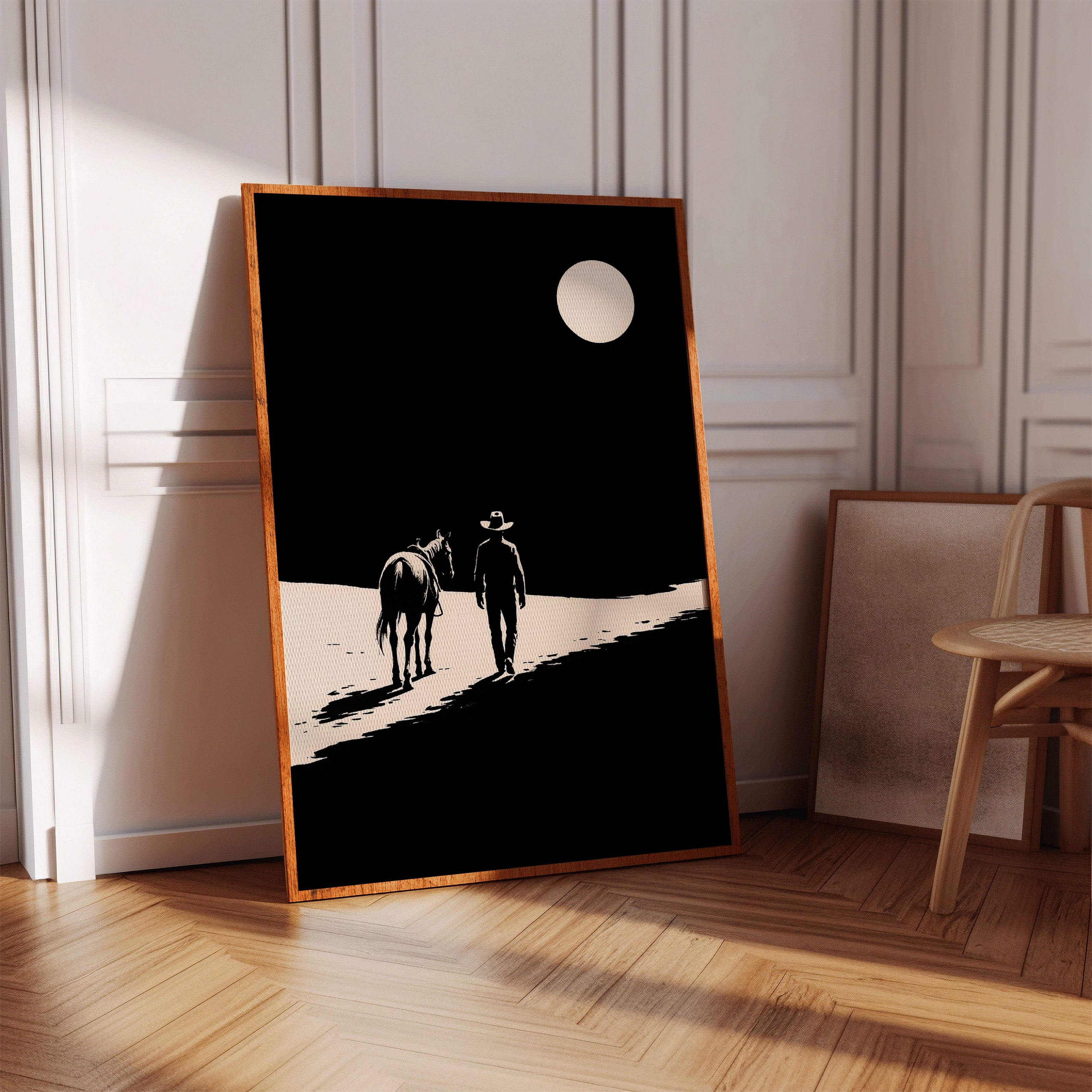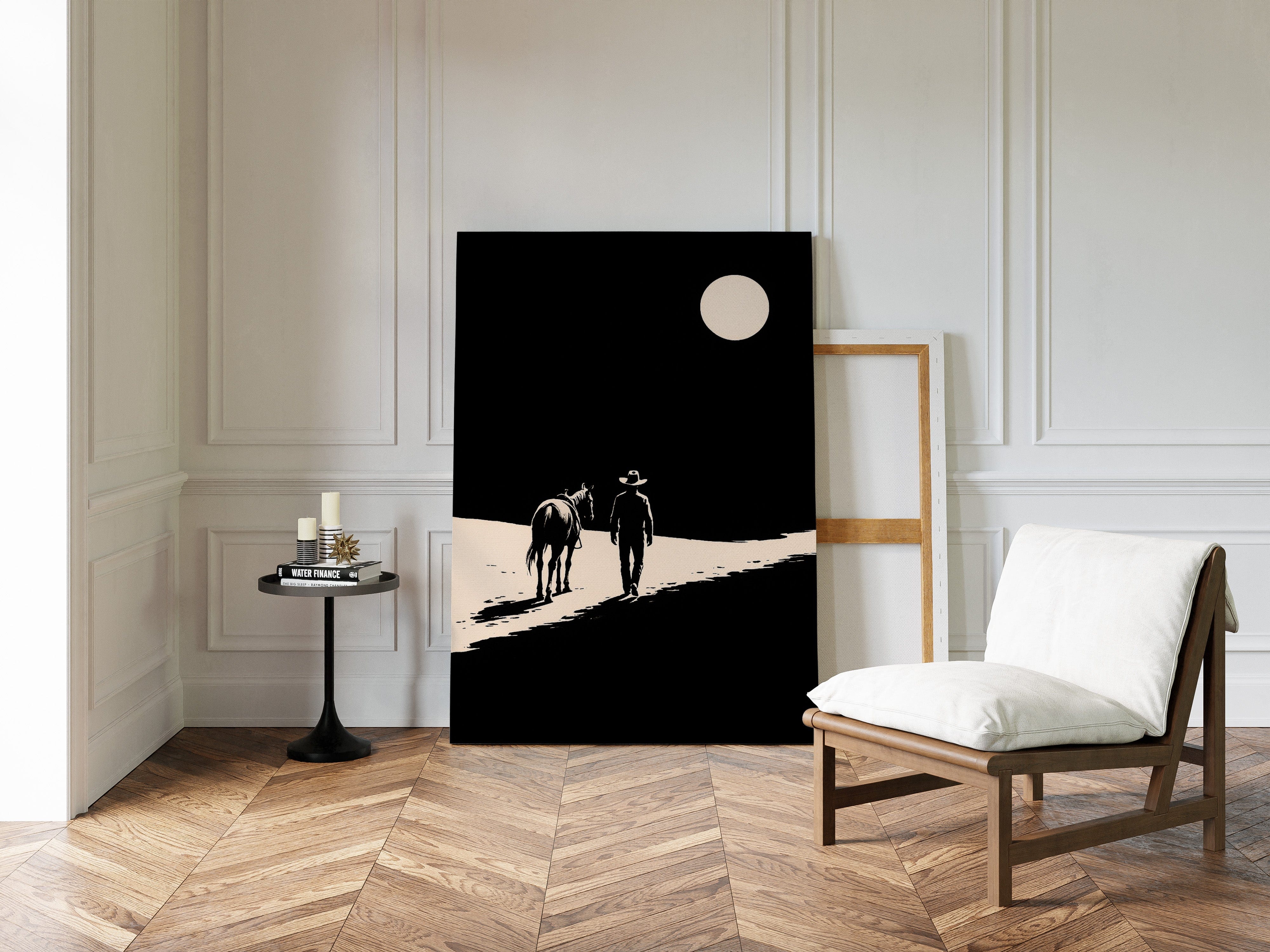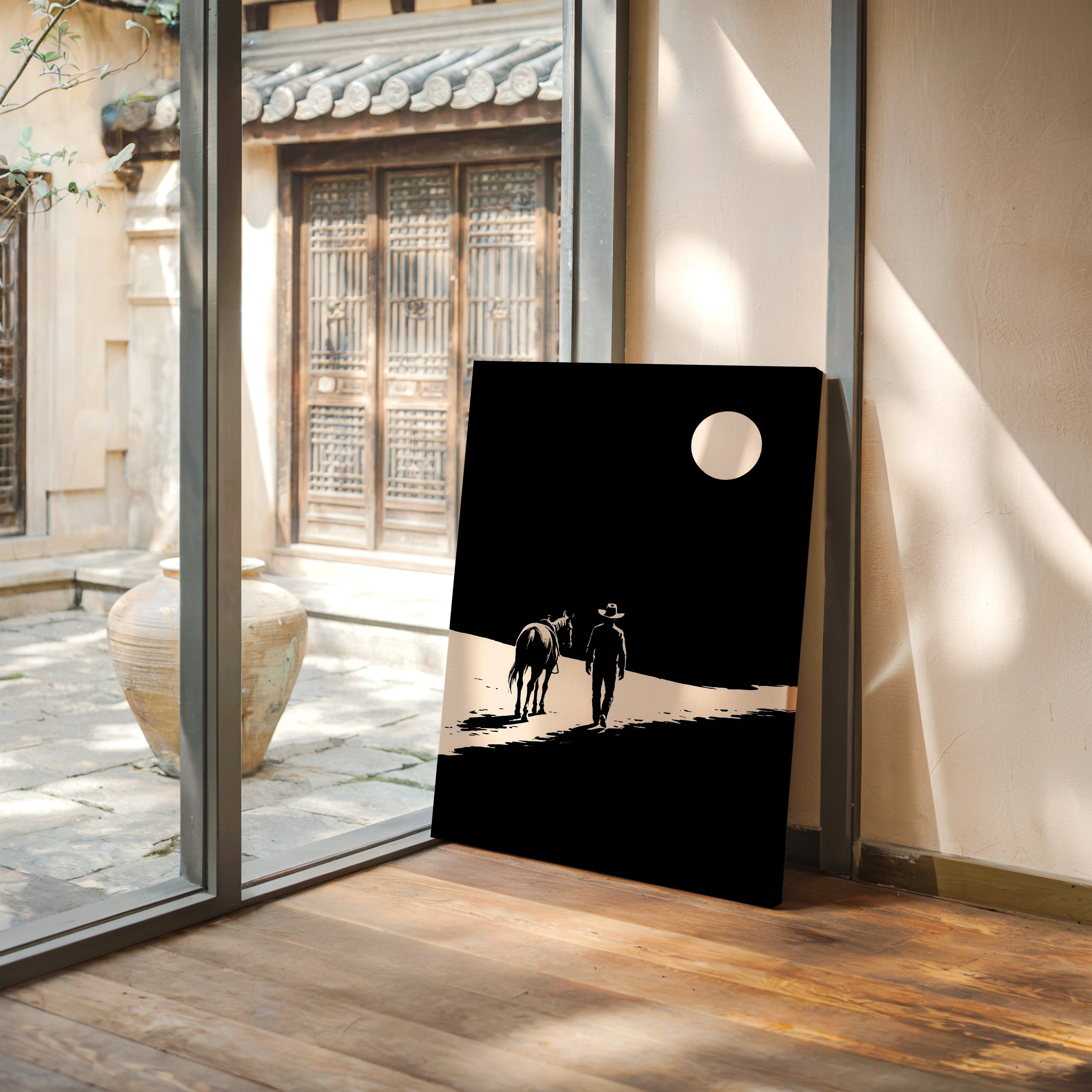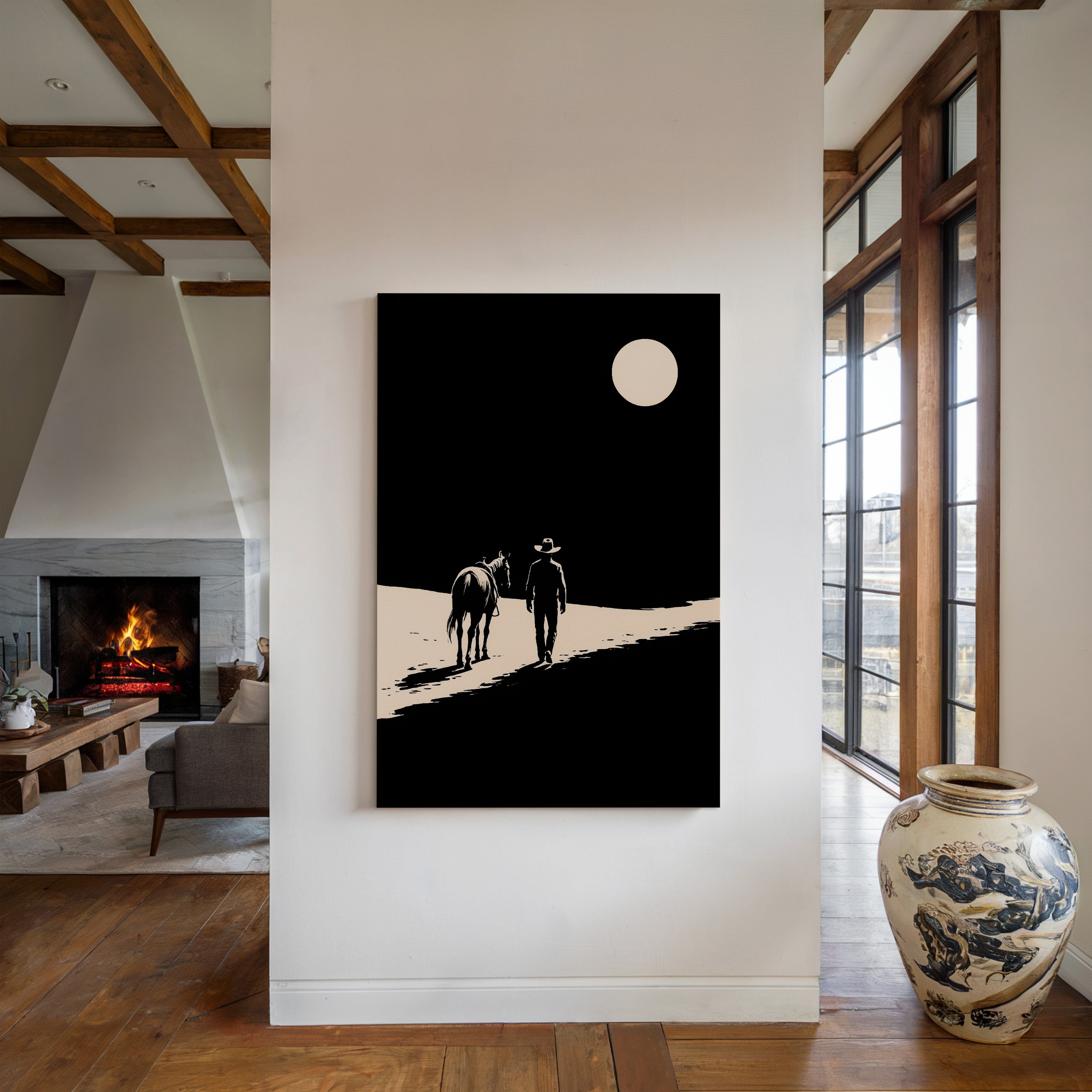 A minimalist Western silhouette of a lone cowboy and his horse under a full moon — a quiet ode to the long road home.